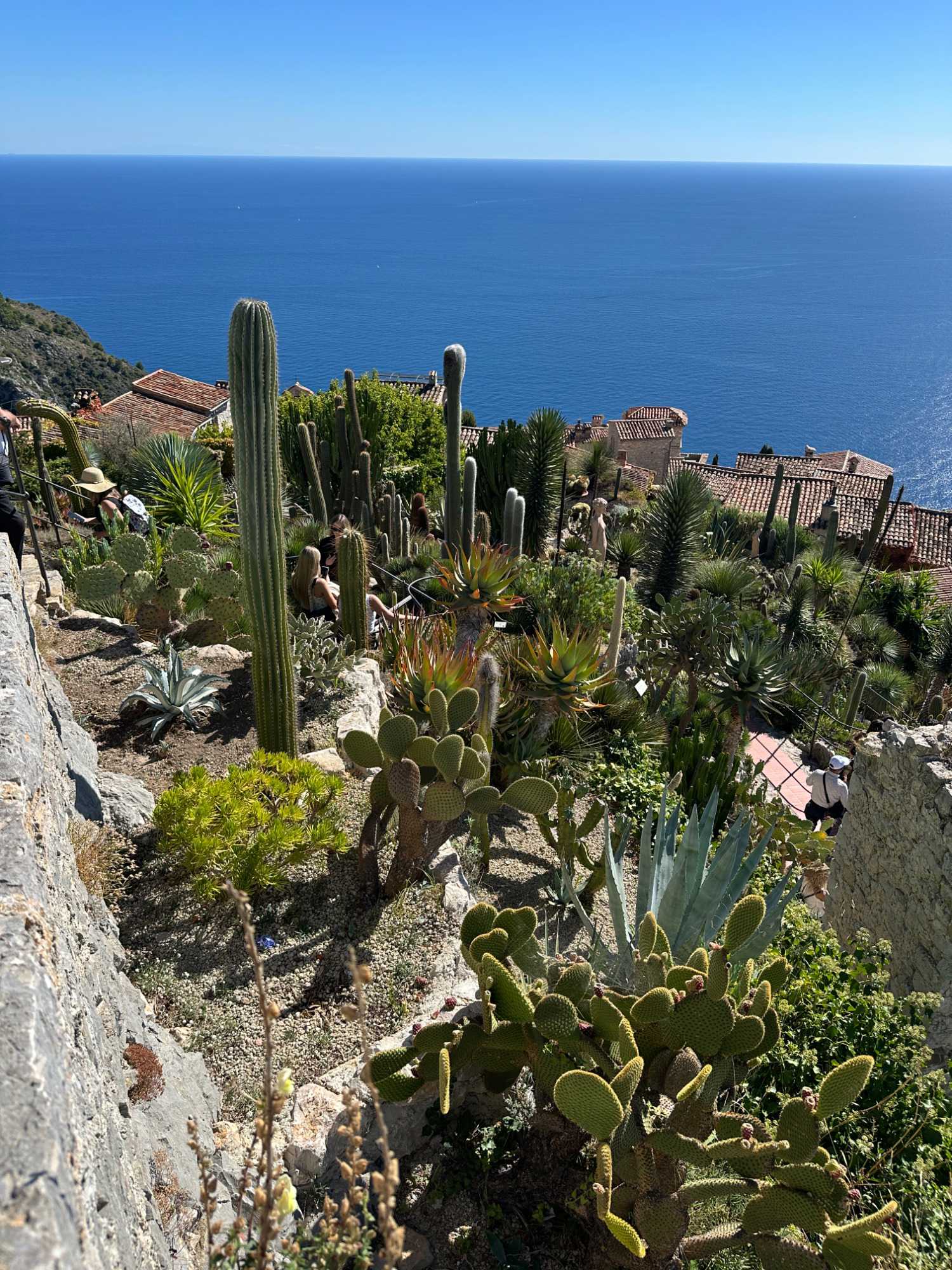 Èze est surtout un des villages les plus célèbres de la côte d’Azur par son esthétisme, son jardin exotique et surtout sa situation géographique! Y abondent des dédales de passages fleuris, des ruelles médiévales bordées d’ateliers d’artistes, de galeries d’art, de restaurants et de boutiques. On y pénètre par une double porte fortifiée au chemin de ronde datant du XIVe siècle. Èze est connu pour son jardin exotique, situé tout en haut du village, à l’emplacement des anciens remparts que quelques un d’entre nous avons pris le temps de visiter. Des vues imprenables s’offrent à nous depuis là-haut. Il offre des centaines de plantes grasses provenant, pour une large part, d’Amérique du sud et il est également agrémenté de figures féminines, sculptures de Jean-Philippe Richard. Une église datant de 1764, une chapelle de la confrérie des pénitents blancs voués aux malades fondée au XIVe siècle, un musée et le Château de la Chèvre d’Or (5 étoiles).