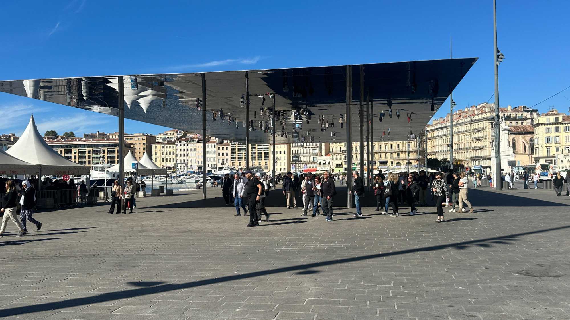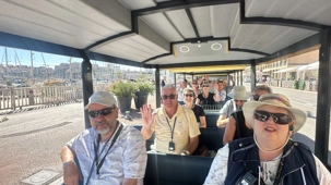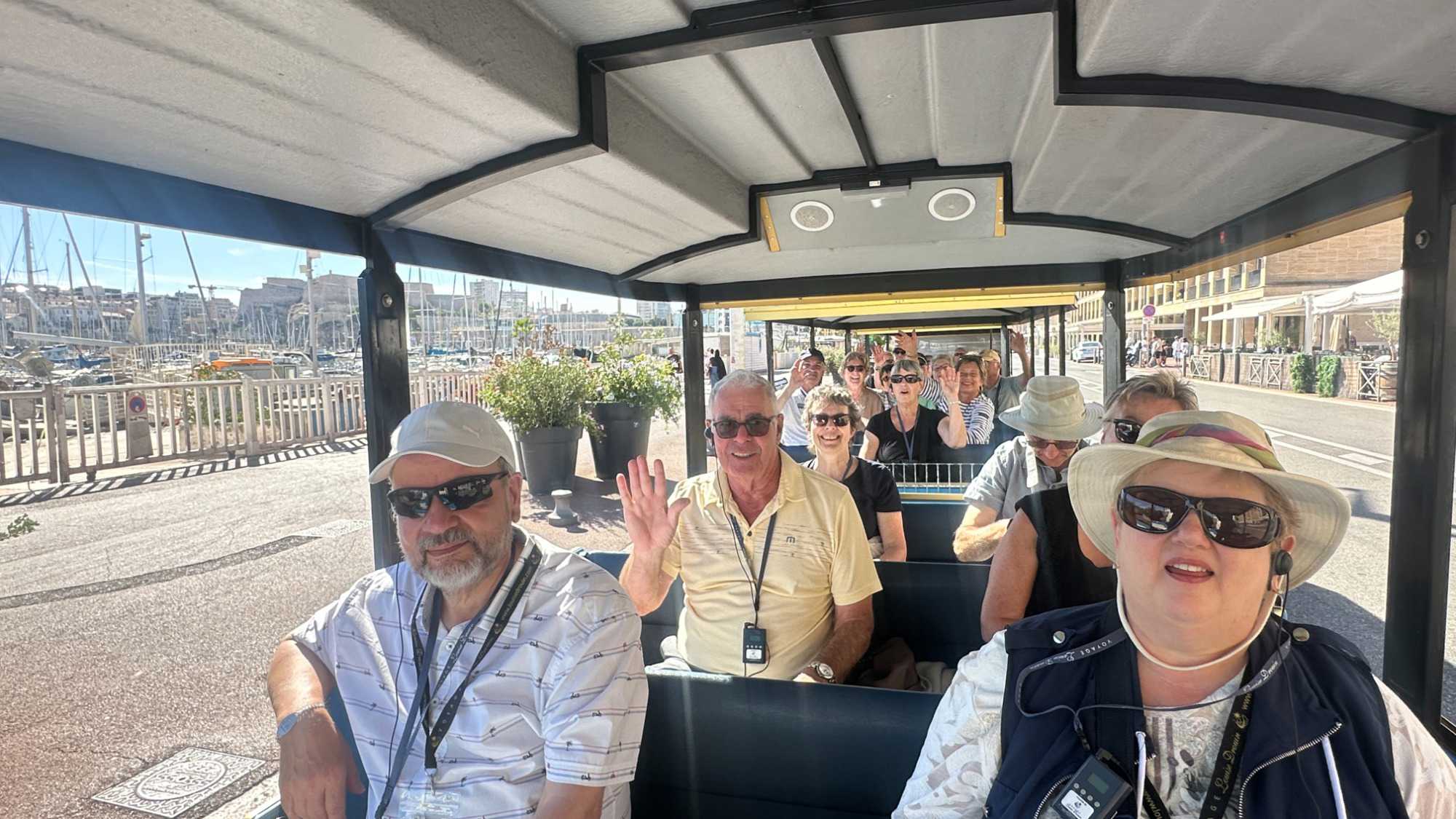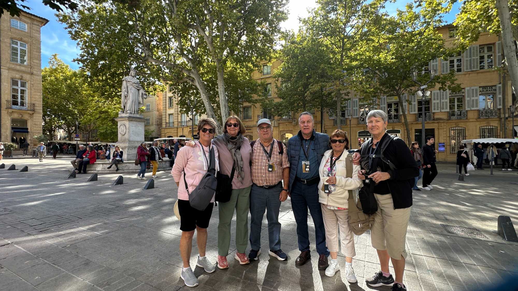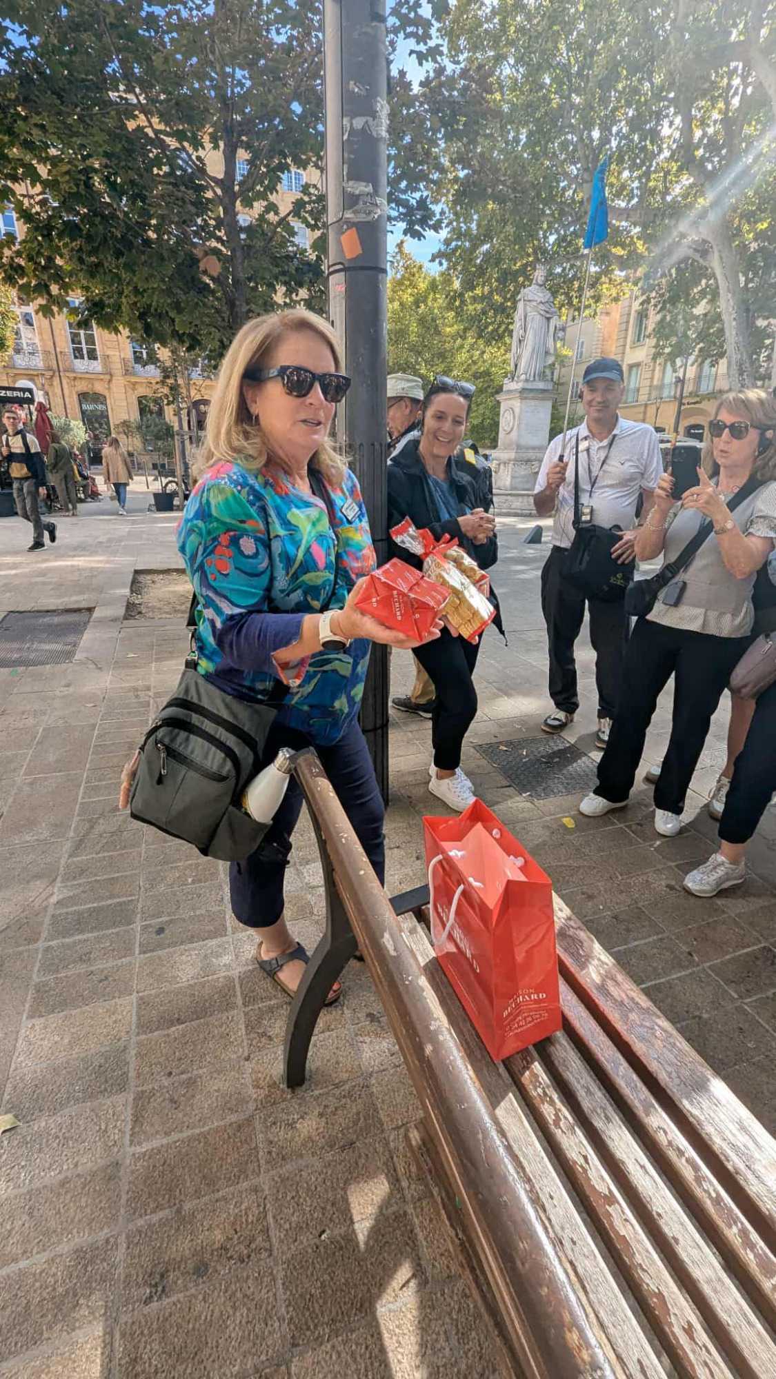 Aix-en-Provence, fut fondée en 122 av. J.-C. sous le nom de Sextiae par la garnison romaine de Sextius Caius Calvinus. Aix devient la capitale du comté de Provence. Très petite et compacte, elle nous présente hôtels et environnement d’influences des XVIIe et XVIIIe siècles. À Aix-en-Provence, c’est le cours Mirabeau bordé de platanes centenaires, sa monumentale fontaine et la pâtisserie et calissonnerie Béchard dont la renommée n’est plus à faire, qui nous a captivé. C’est en petit train touristique que nous sillonnons la ville aux 100 fontaines, à travers les rues étroites et disons-le, un peu raboteuses d’Aix, en observant les principaux monuments de la ville. Ce qui nous marque : presqu’au aucune voiture mais des mobilettes en quantité servent aux déplacements dans le quartier historique. Éric et moi ferons la belle surprise de faire une dégustation de calissons et de petits-fours de chez Béchard ! Wow ! miam, hum… c’est bon! Ça nous donne assez d’énergie pour arpenter les ruelles et l’immense marché en mode autonome. Après une belle heure de flanage agréable, c’est le regroupement au pied de la Statue du bon roi René et départ en direction de “la porte du monde”, Marseille.
