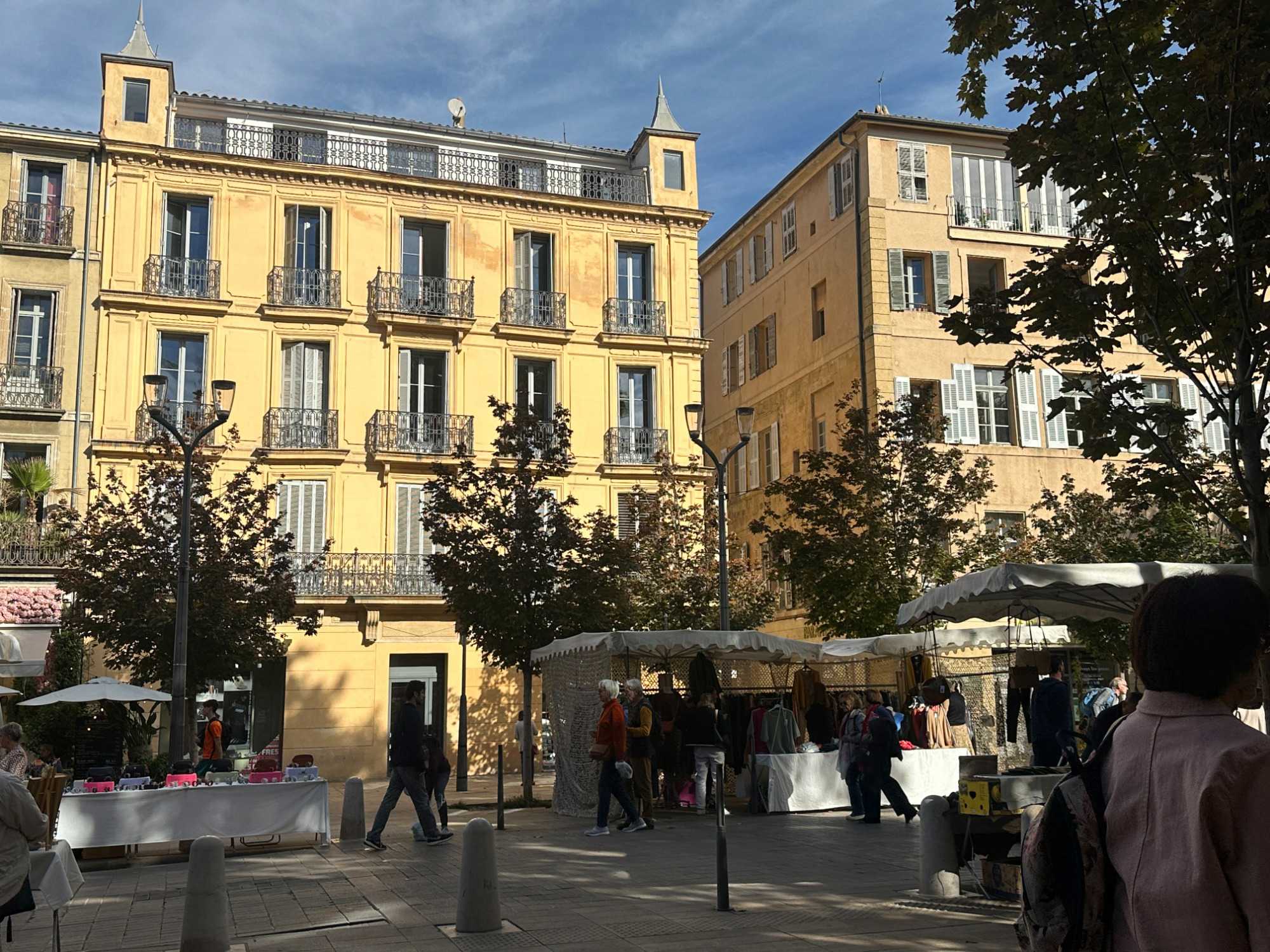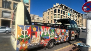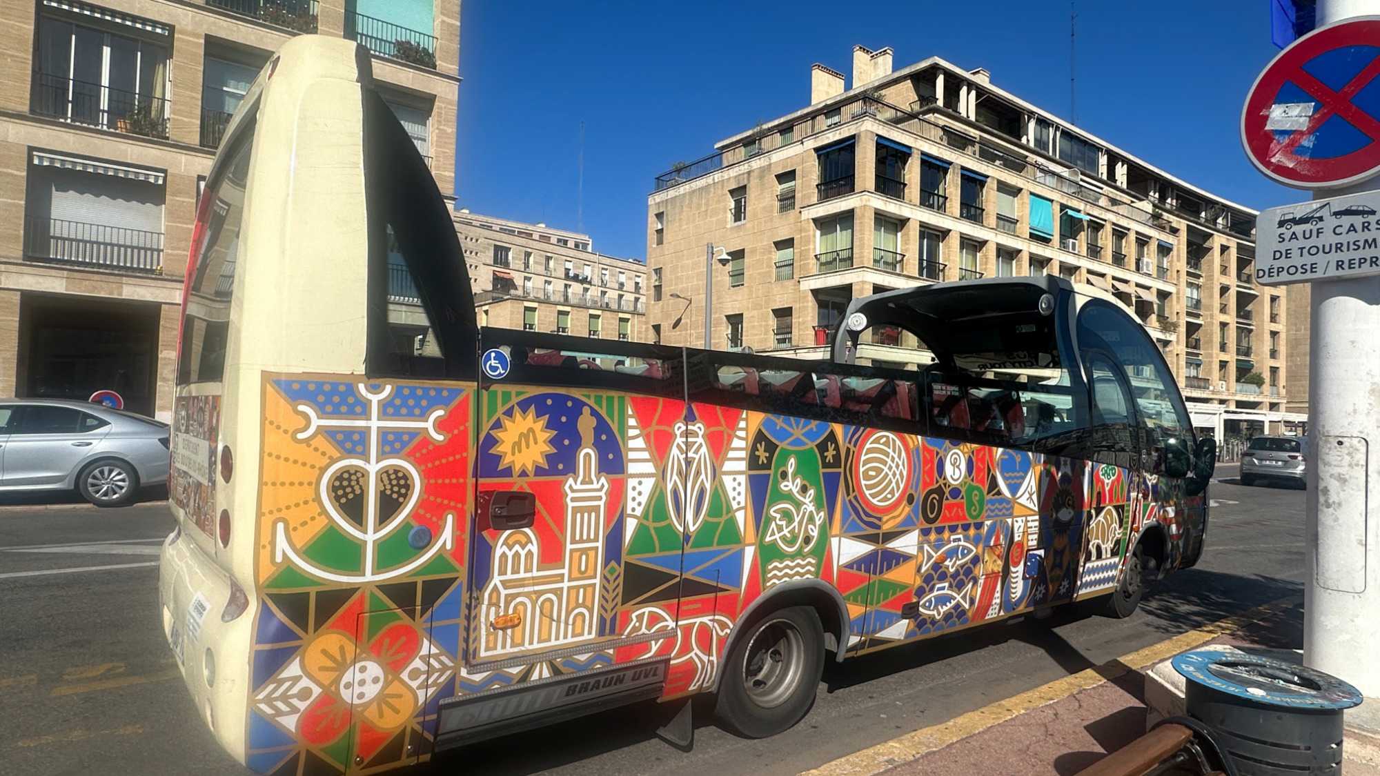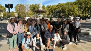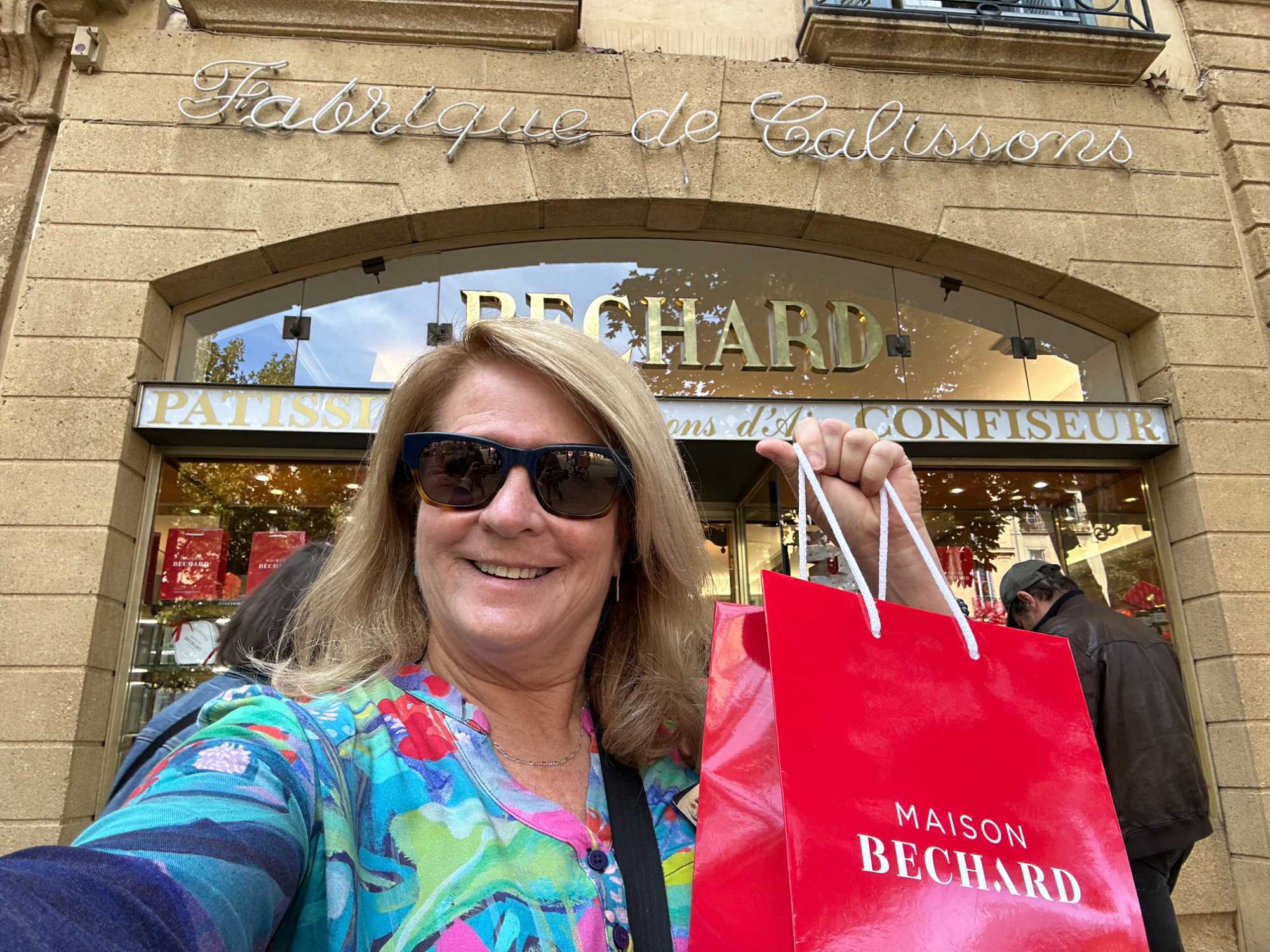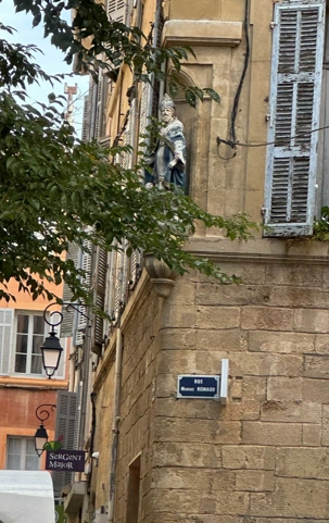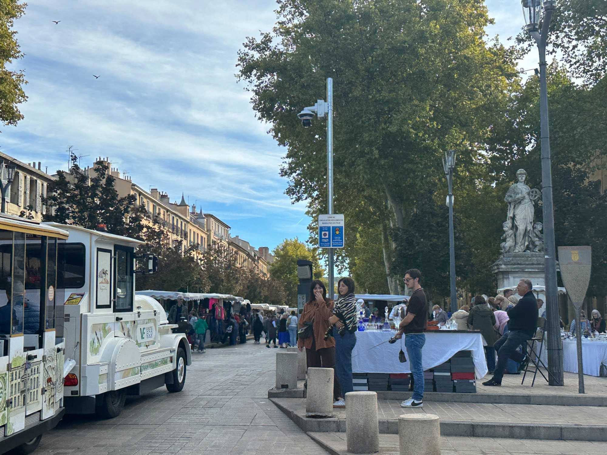 Aix-en-Provence, fut fondée en 122 av. J.-C. sous le nom de Sextiae par la garnison romaine de Sextius Caius Calvinus. Aix devient la capitale du comté de Provence. Très petite et compacte, elle nous présente hôtels et environnement d’influences des XVIIe et XVIIIe siècles. À Aix-en-Provence, c’est le cours Mirabeau bordé de platanes centenaires, sa monumentale fontaine et la pâtisserie et calissonnerie Béchard dont la renommée n’est plus à faire, qui nous a captivé. C’est en petit train touristique que nous sillonnons la ville aux 100 fontaines, à travers les rues étroites et disons-le, un peu raboteuses d’Aix, en observant les principaux monuments de la ville. Ce qui nous marque : presqu’au aucune voiture mais des mobilettes en quantité servent aux déplacements dans le quartier historique. Éric et moi ferons la belle surprise de faire une dégustation de calissons et de petits-fours de chez Béchard ! Wow ! miam, hum… c’est bon! Ça nous donne assez d’énergie pour arpenter les ruelles et l’immense marché en mode autonome. Après une belle heure de flanage agréable, c’est le regroupement au pied de la Statue du bon roi René et départ en direction de “la porte du monde”, Marseille.