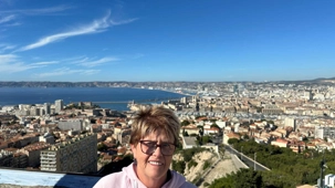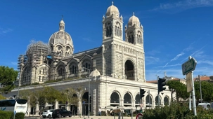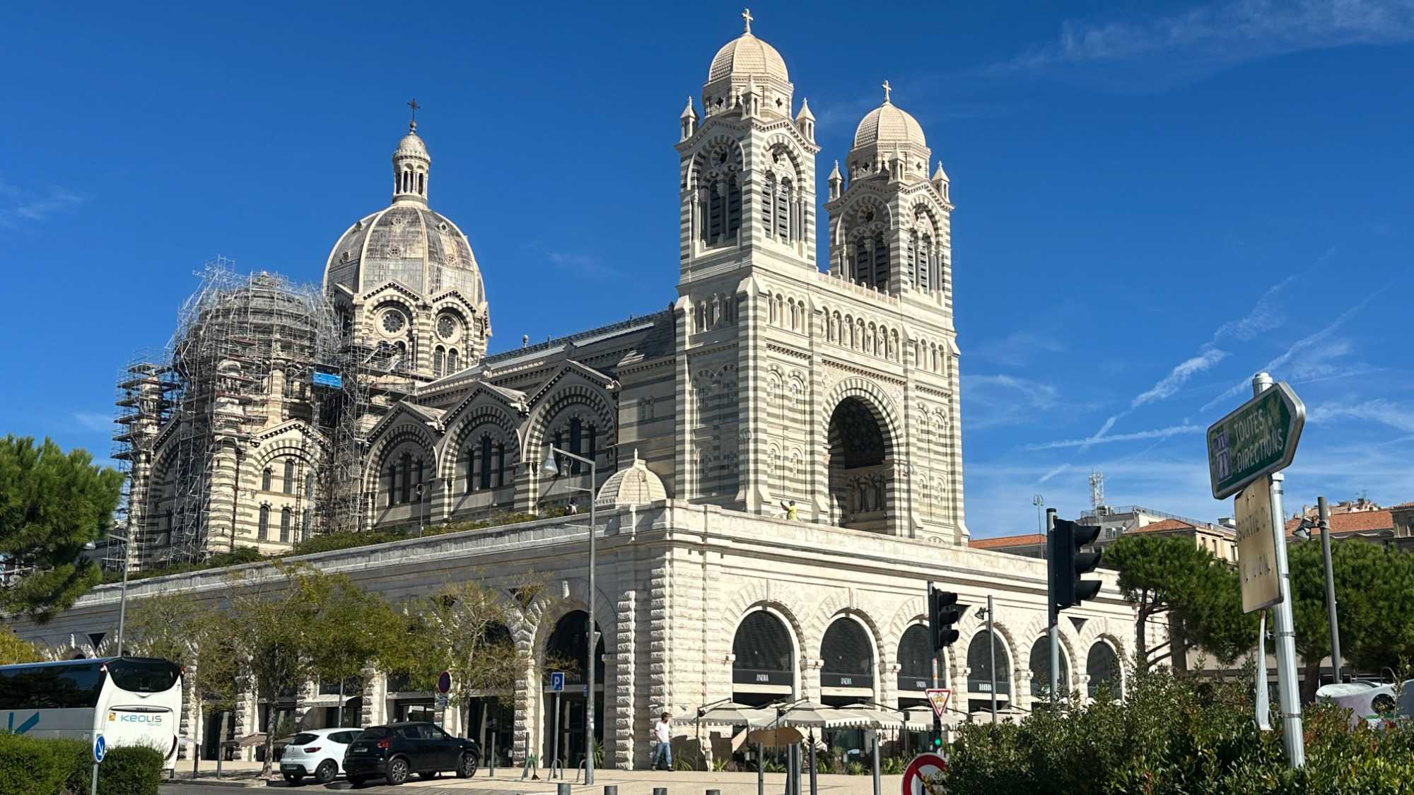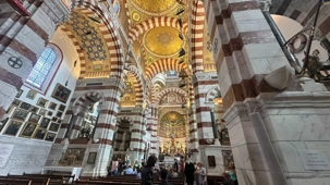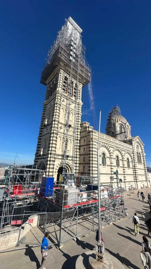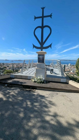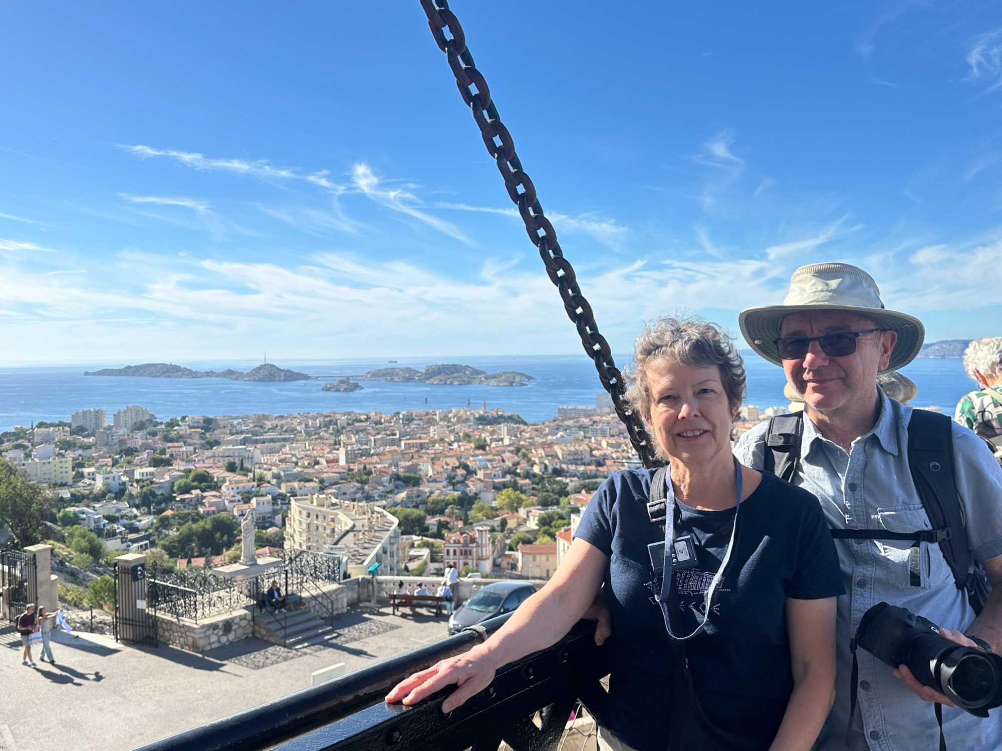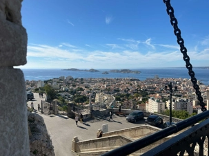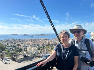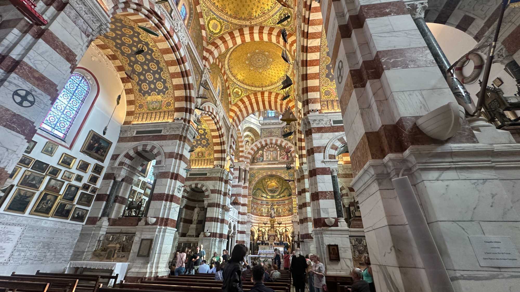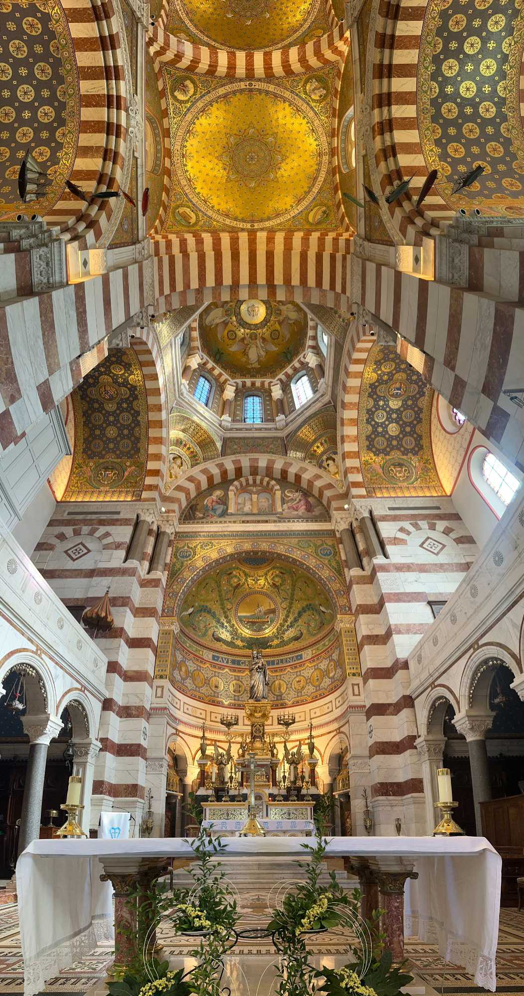 À Marseille, nous profitons d'une visite guidée à bord d’un autre charmant train touristique ! Nous aimons vraiment cette formule car elle nous permet d’en voir le plus possible à moindre effort! Surtout qu’on grimpe tout au haut de la colline pour aboutir à “la bonne mère”. Une courte visite à l’intérieur en vaut le détour, voyez les photos, ce lieu de pélerinage est d’une beauté sans nom. La bonne mère veille sur les marins, les pêchers et tous les marseillais. Du haut de ses 154m, c’est elle la mieux placée pour ce faire! Mais, elle se refait actuellement une beauté, il faudra revenir pour voir la vierge fraîchement redorée. Quelle vue à 360º Wow ! On aperçoit même le château d’If (que Bernard appelle en blaguant, le château d’ifférent !)