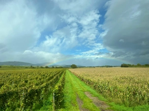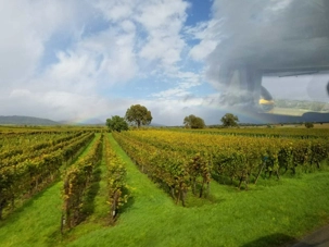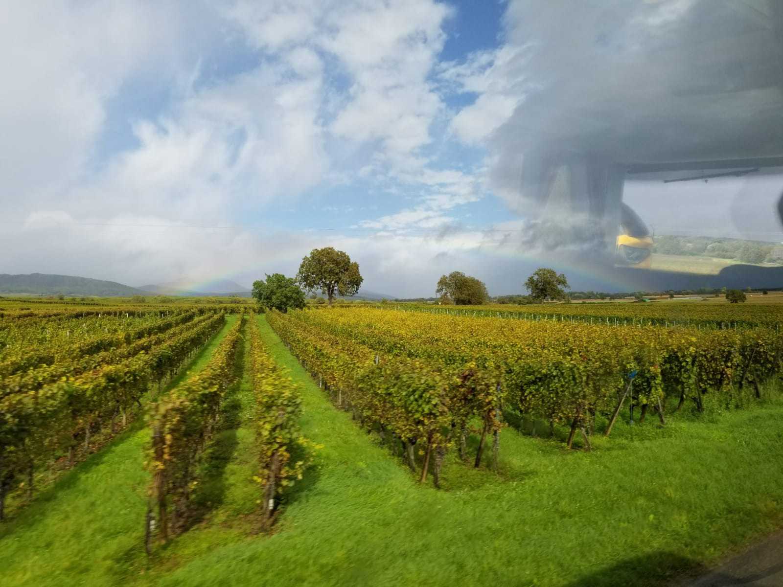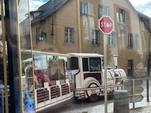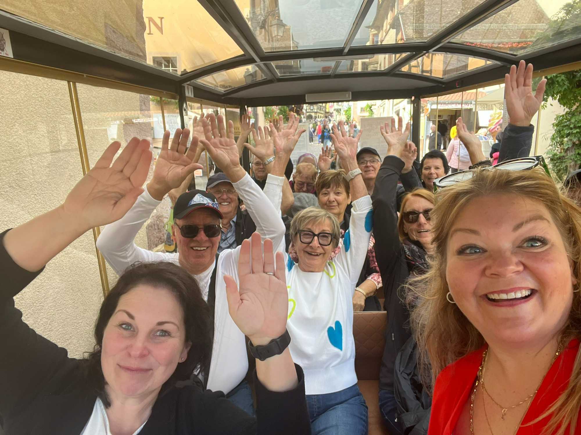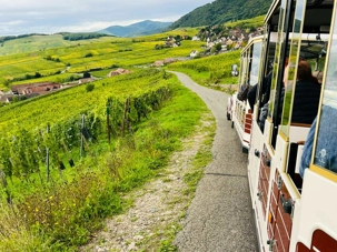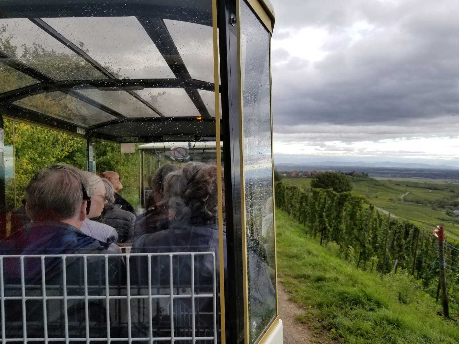 Nous poursuivons nos découvertes à bord d’un petit train touristique (que j’adore), qui démarre devant l’hôtel de ville. L’effet de l’alcool aidant, nous avons ri comme jamais et notre esprit d’équipe a établi un nouveau record. En chemin, nous découvrons les boutiques artisanales de vignerons, les îlots fleuris et l’ambiance animée du village. Le circuit nous fait d’abord serpenter dans les ruelles de la vieille ville avant de grimper à travers les vignobles. Au sommet, un point d’arrêt offre une vue imprenable sur Riquewihr, ses tours, ses remparts, ses vignes et la vallée environnante. Wow, quel beau décor pour immortaliser le moment d’une photo de groupe !