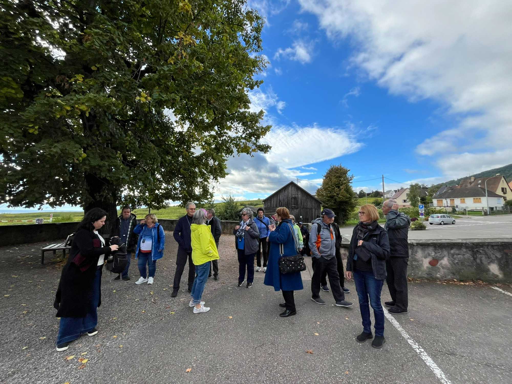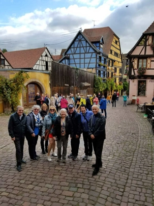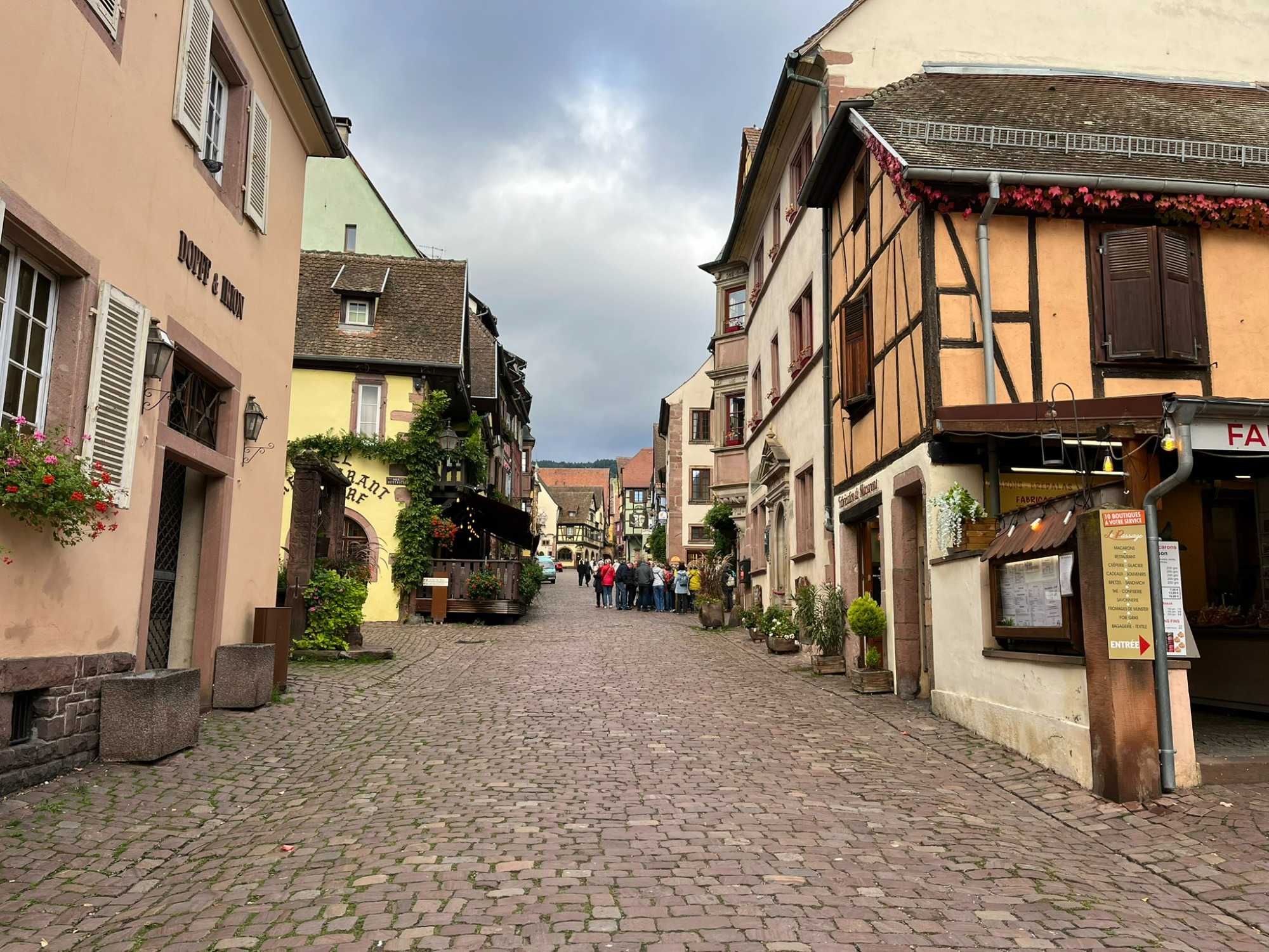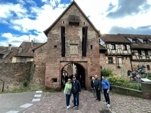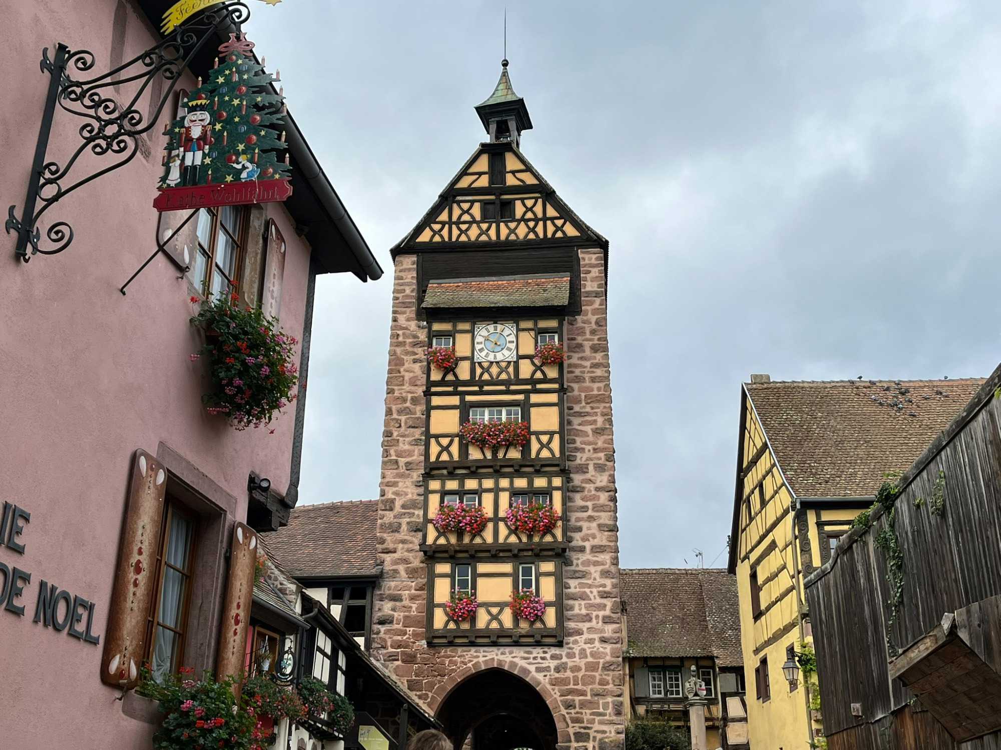 Ce matin, un ciel voilé qui a fait place au soleil en avant-midi nous a accompagné pour conclure en beauté ce premier volet de notre périple sur la route des vins d’Alsace. Nous avons mis le cap sur Riquewihr, un village niché au pied des collines, autrefois occupé par les Romains qui y introduisirent la culture de la vigne vers l’an 1000. Encore aujourd’hui, les producteurs locaux perpétuent cette tradition, valant à Riquewihr le surnom de « la perle du vignoble ». Classé parmi les plus beaux villages de France, il a miraculeusement échappé aux destructions de la Seconde Guerre mondiale, grâce à sa position en cul-de-sac, éloignée des grands axes, ce qui l’a préservé des combats. Claude, notre guide, n’a pas manqué de souligner la richesse de ce patrimoine intact, ce qui nous a fait apprécier d’autant plus l’architecture des bâtiments encore debout.