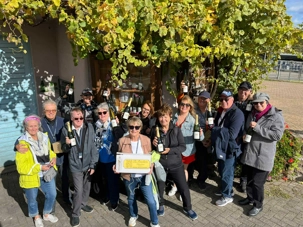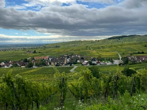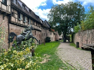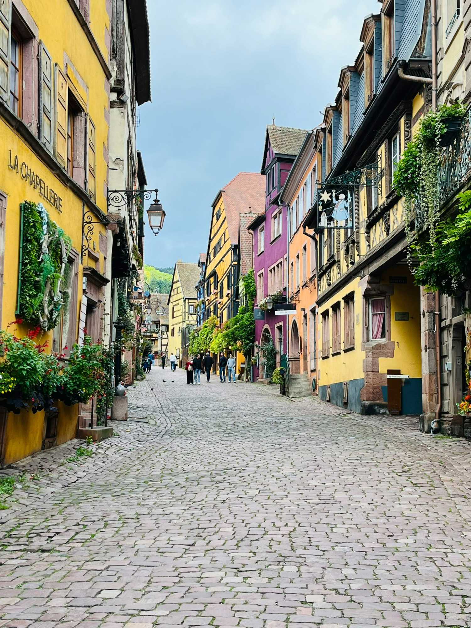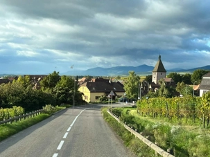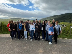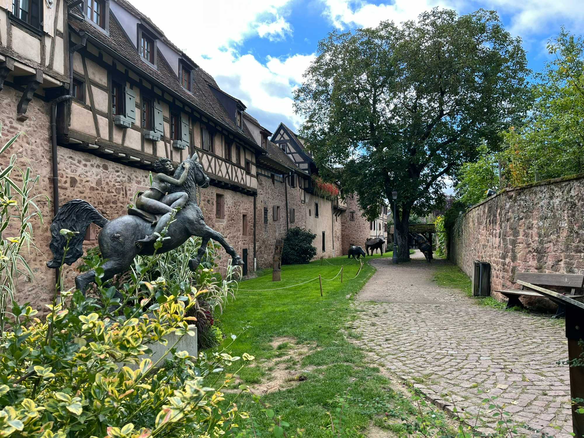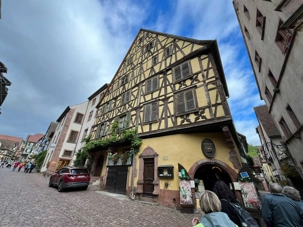 Ce matin, un ciel voilé qui a fait place au soleil en avant-midi nous a accompagné pour conclure en beauté ce premier volet de notre périple sur la route des vins d’Alsace. Nous avons mis le cap sur Riquewihr, un village niché au pied des collines, autrefois occupé par les Romains qui y introduisirent la culture de la vigne vers l’an 1000. Encore aujourd’hui, les producteurs locaux perpétuent cette tradition, valant à Riquewihr le surnom de « la perle du vignoble ». Classé parmi les plus beaux villages de France, il a miraculeusement échappé aux destructions de la Seconde Guerre mondiale, grâce à sa position en cul-de-sac, éloignée des grands axes, ce qui l’a préservé des combats. Claude, notre guide, n’a pas manqué de souligner la richesse de ce patrimoine intact, ce qui nous a fait apprécier d’autant plus l’architecture des bâtiments encore debout.
