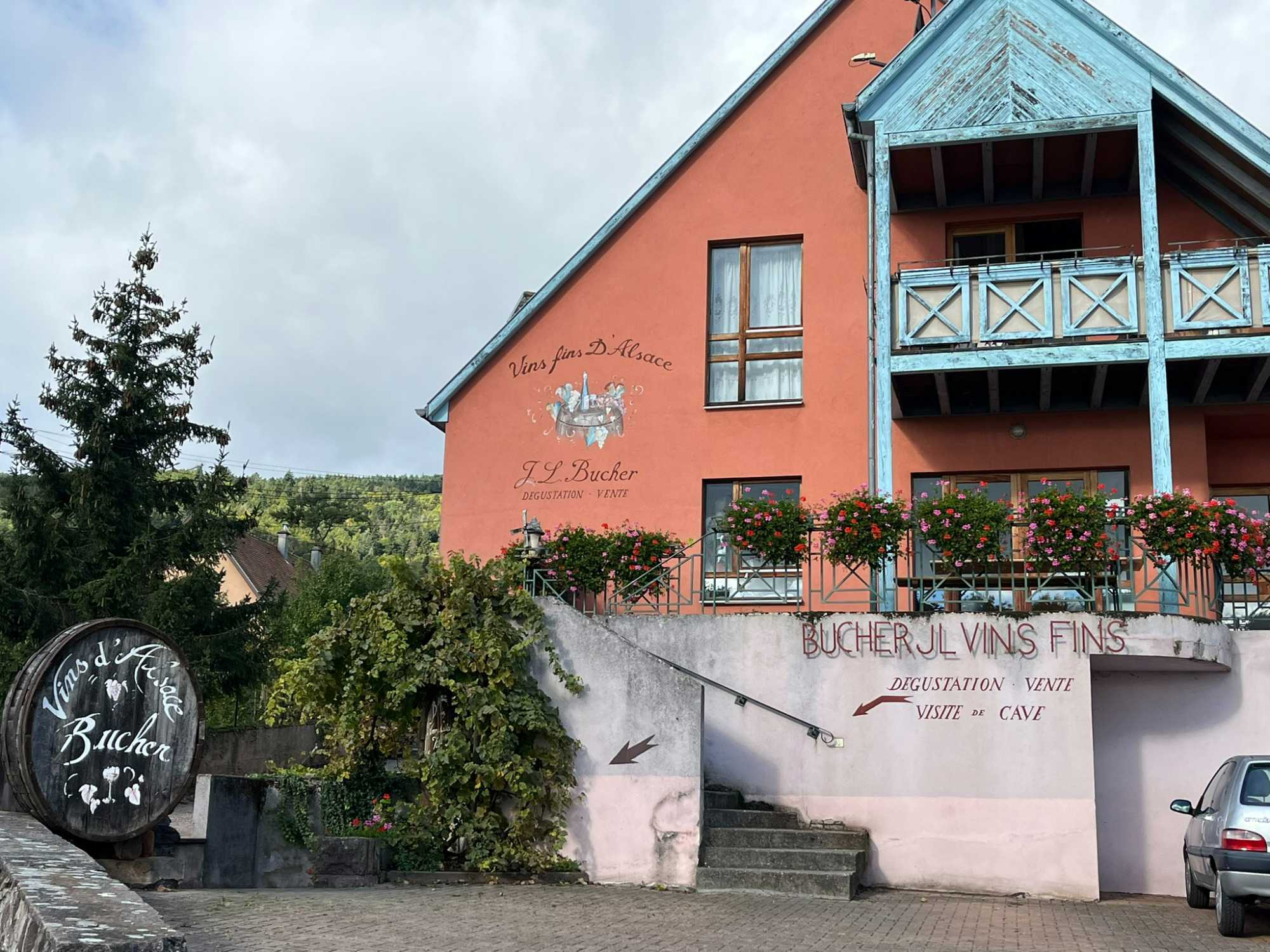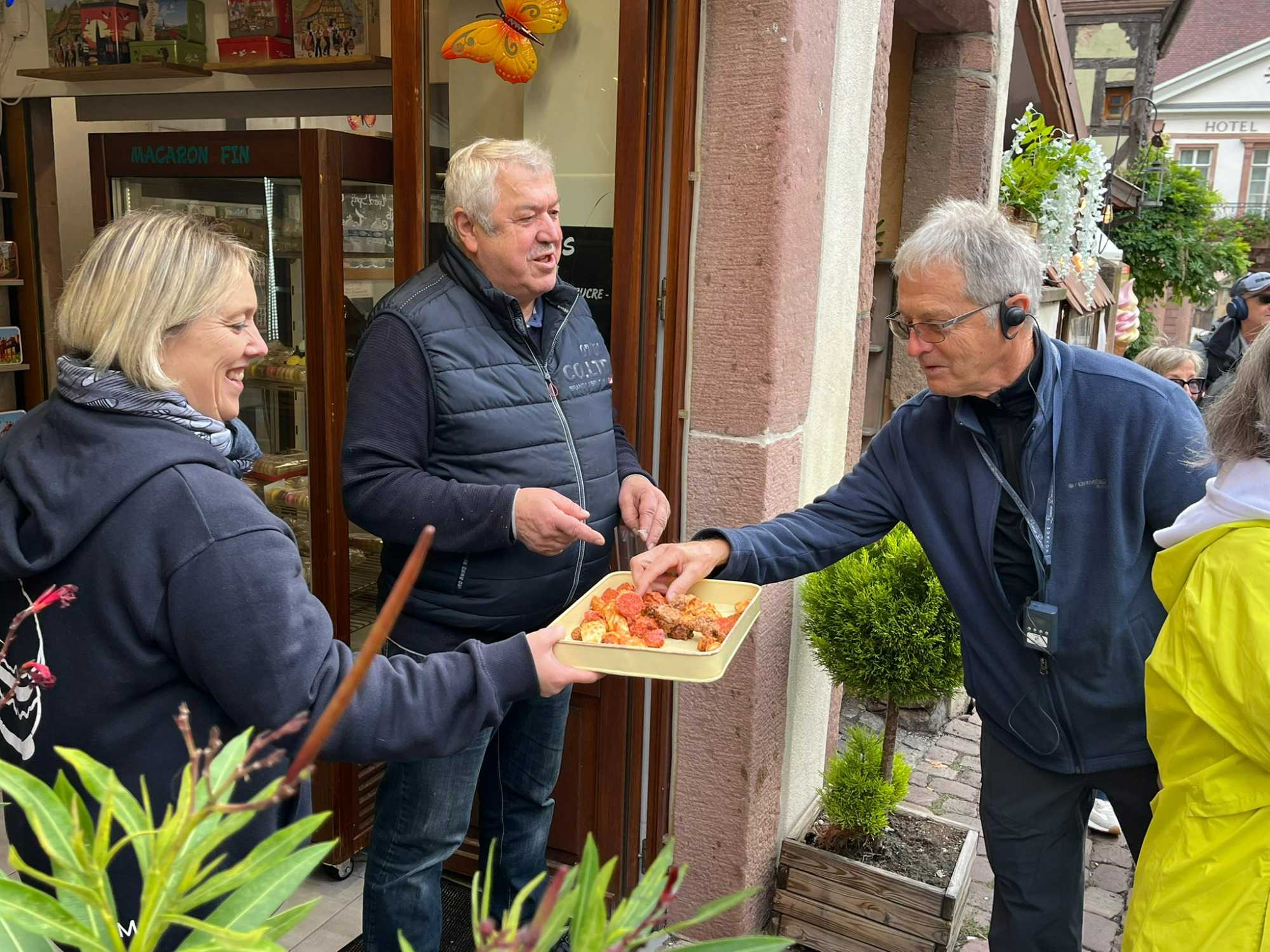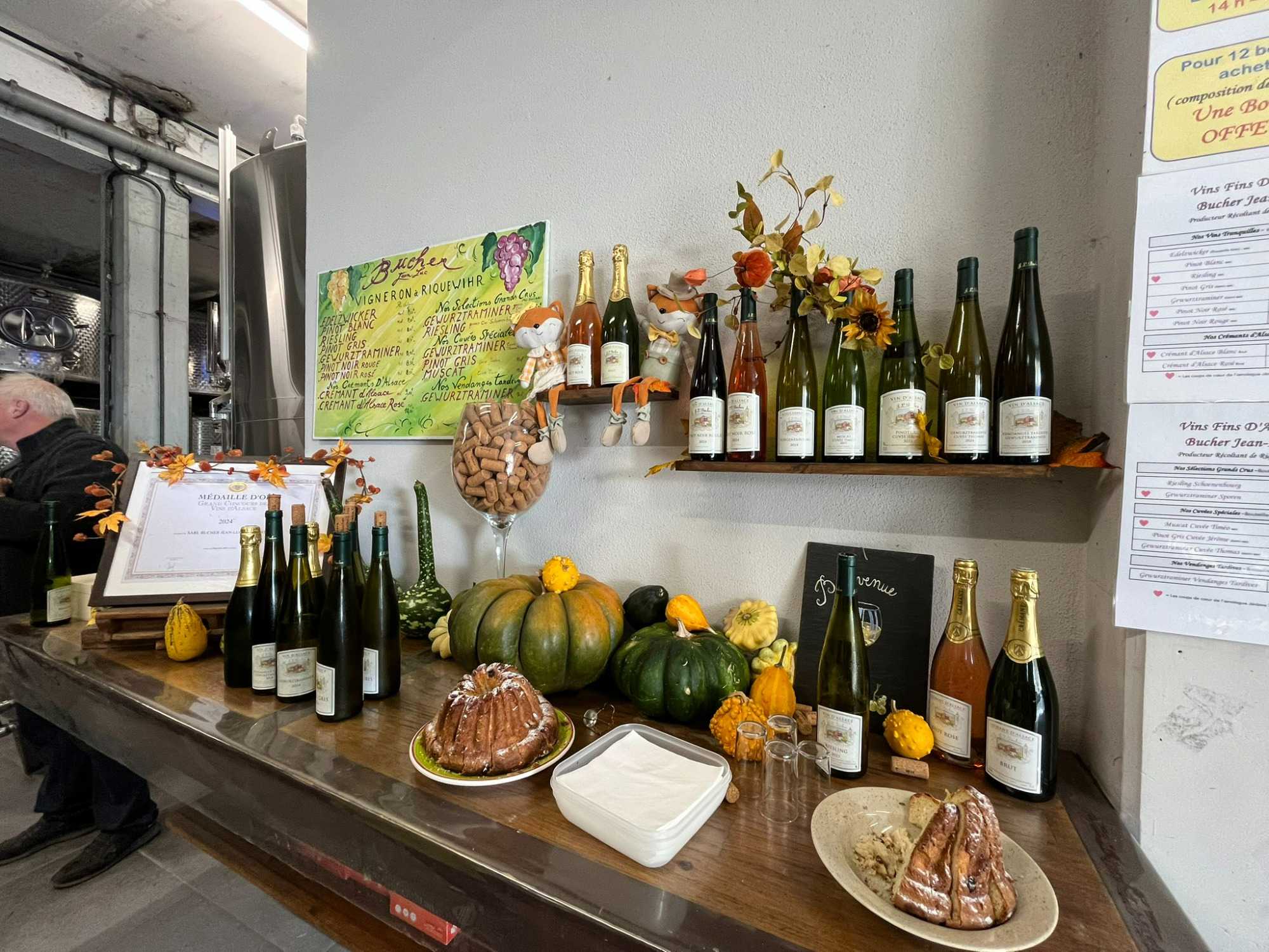 Nous faisons halte au vignoble de Jean-Luc et Anne-Catherine Bucher, une maison viticole fondée au début des années 80, réputée pour ses crémants (vins mousseux) et ses grands crus. Nous découvrons l’histoire du domaine, ses choix de cépages et ses secrets de vinification, avant de déguster quatre excellents vins : le Riesling, le Pinot gris du domaine familial, un Gewurztraminer, plus sucré, et un crémant blanc d’Alsace. L’atmosphère se réchauffe (il est à peine 10 h 30) et nous ricanons de plus en plus. Nous vivons très certainement l’ivresse d’une cave à vin !! En cours de dégustation, la maison nous sert un morceau de Kougelhopf, la fameuse brioche alsacienne à la forme cannelée et au cœur creux. Façonnée dans un moule traditionnel en terre cuite de Soufflenheim, elle est parfumée au rhum, garnie de raisins secs et décorée d’amandes entières.