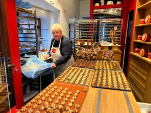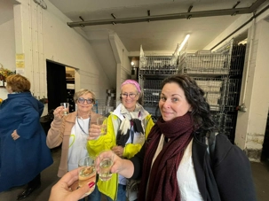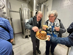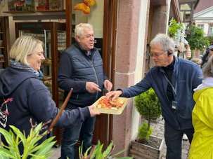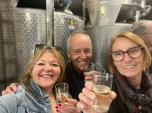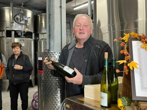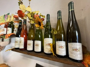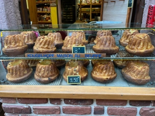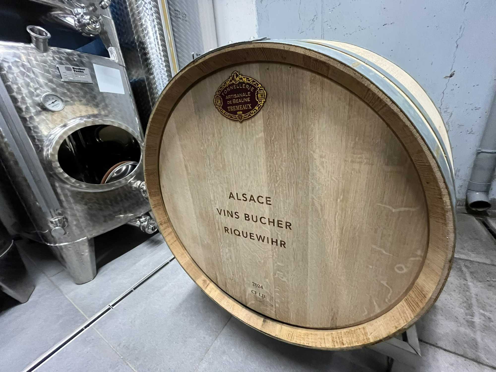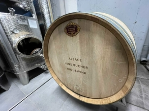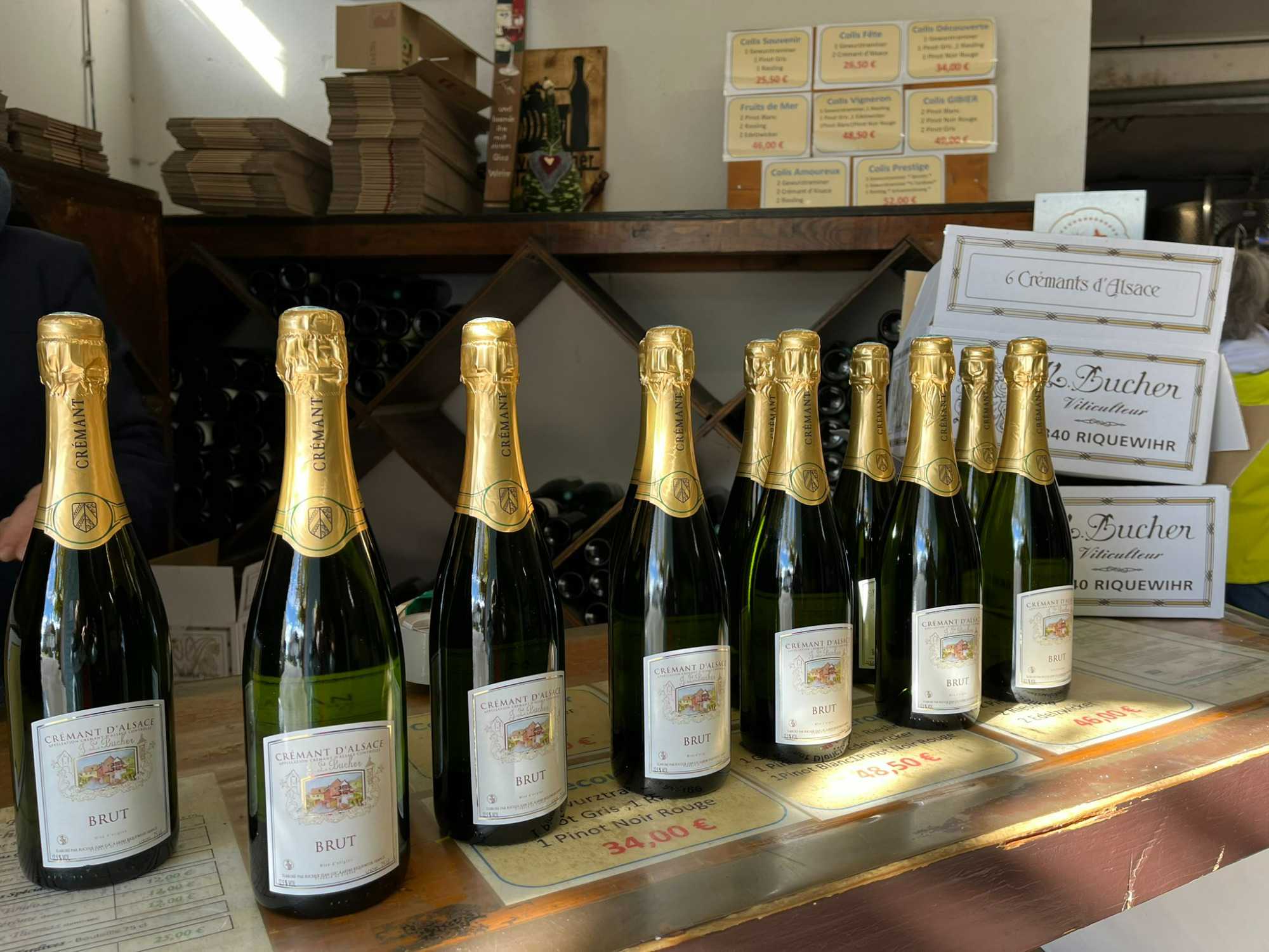 Nous faisons halte au vignoble de Jean-Luc et Anne-Catherine Bucher, une maison viticole fondée au début des années 80, réputée pour ses crémants (vins mousseux) et ses grands crus. Nous découvrons l’histoire du domaine, ses choix de cépages et ses secrets de vinification, avant de déguster quatre excellents vins : le Riesling, le Pinot gris du domaine familial, un Gewurztraminer, plus sucré, et un crémant blanc d’Alsace. L’atmosphère se réchauffe (il est à peine 10 h 30) et nous ricanons de plus en plus. Nous vivons très certainement l’ivresse d’une cave à vin !! En cours de dégustation, la maison nous sert un morceau de Kougelhopf, la fameuse brioche alsacienne à la forme cannelée et au cœur creux. Façonnée dans un moule traditionnel en terre cuite de Soufflenheim, elle est parfumée au rhum, garnie de raisins secs et décorée d’amandes entières.