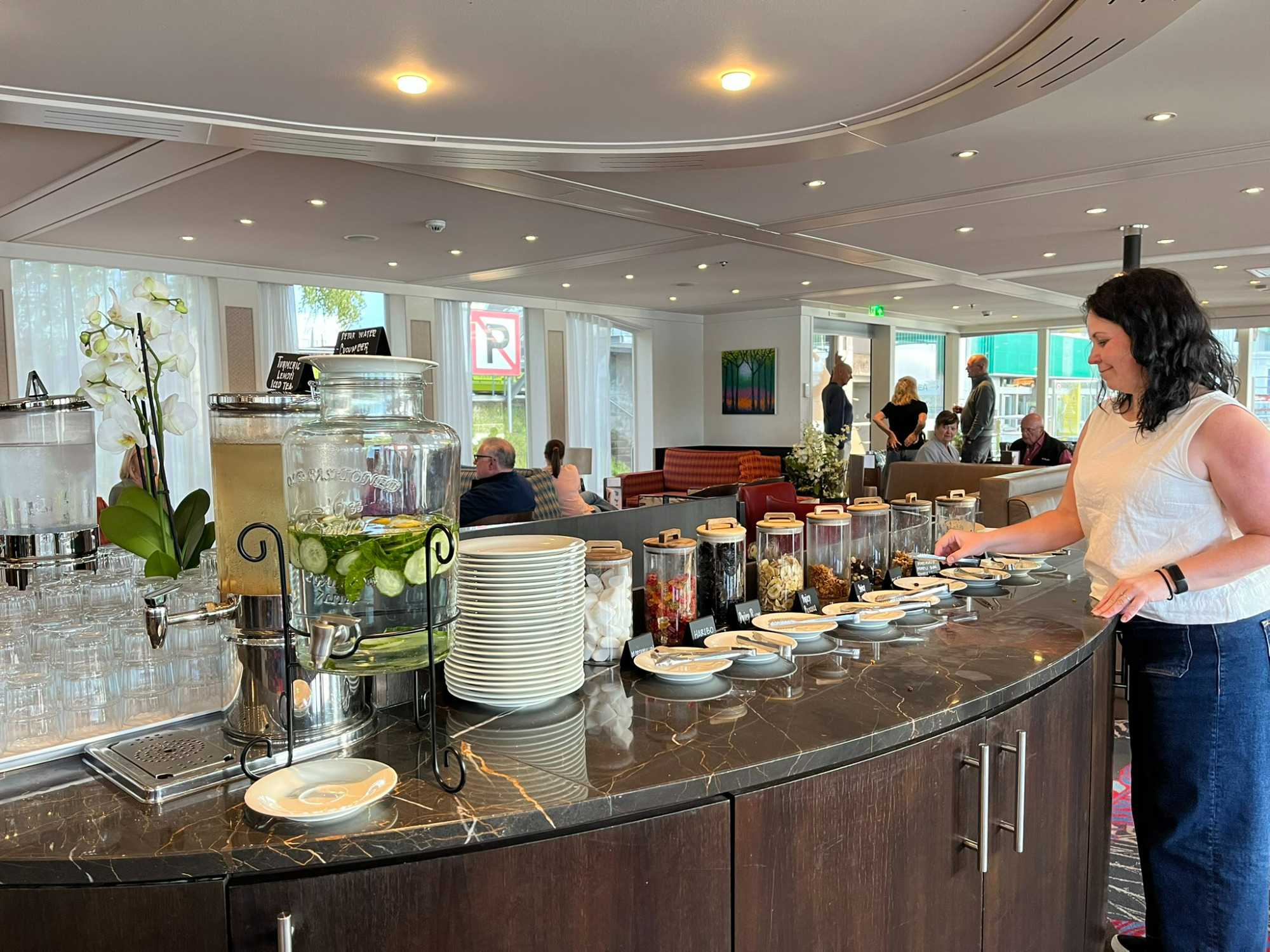 Nous voilà prêts à entamer le deuxième volet de notre voyage, qui nous mènera de Bâle à Amsterdam en longeant le Rhin, ses quarante châteaux, ses villes et ses villages de carte postale. Une fois installés dans nos cabines pour les sept prochaines nuits, quel bonheur de ranger nos valises et de ne plus y penser, nous voguons doucement sur notre hôtel flottant de 443 pieds, explorons les aires communes et trouvons nos repères sur les quatre ponts.