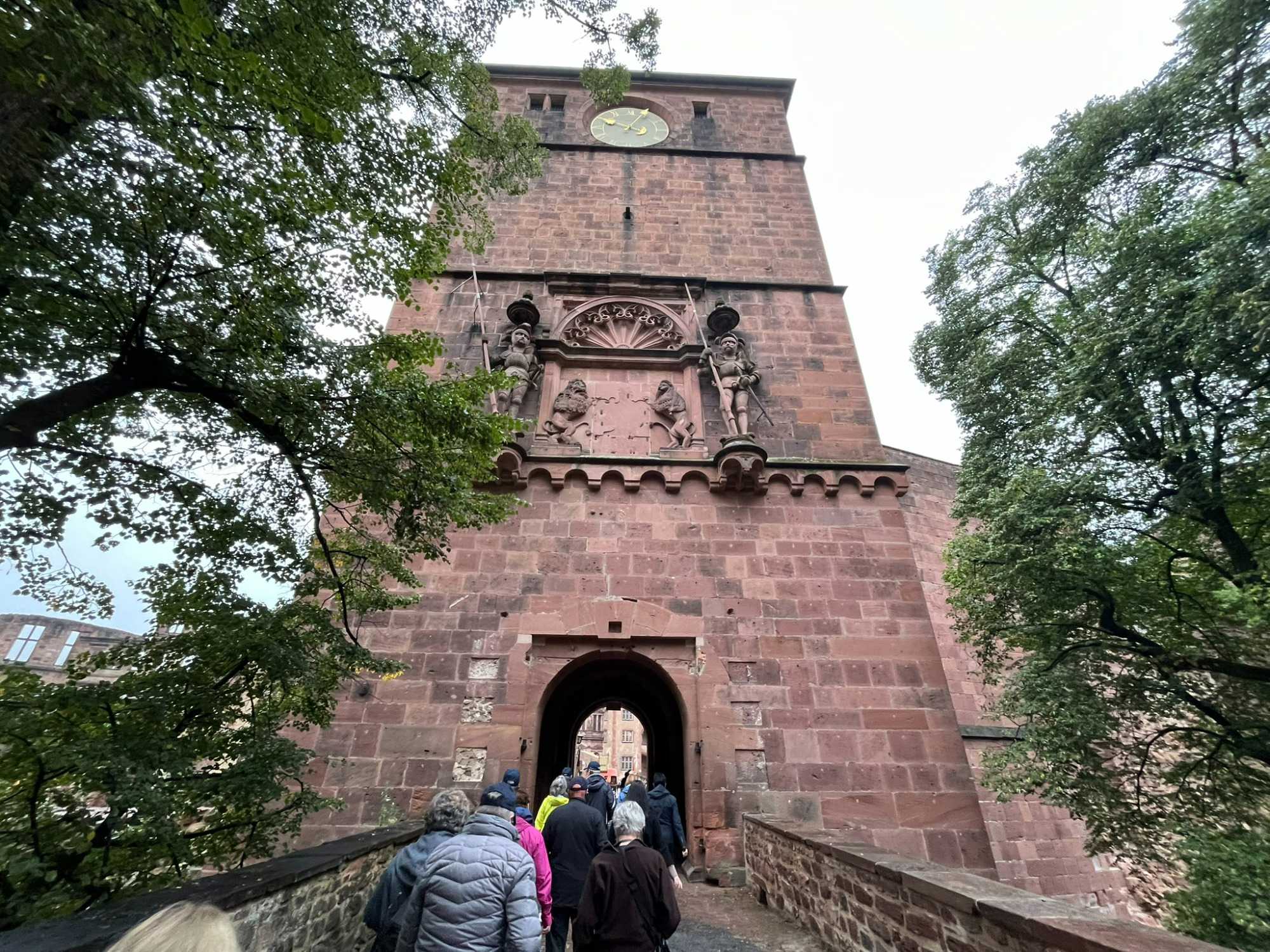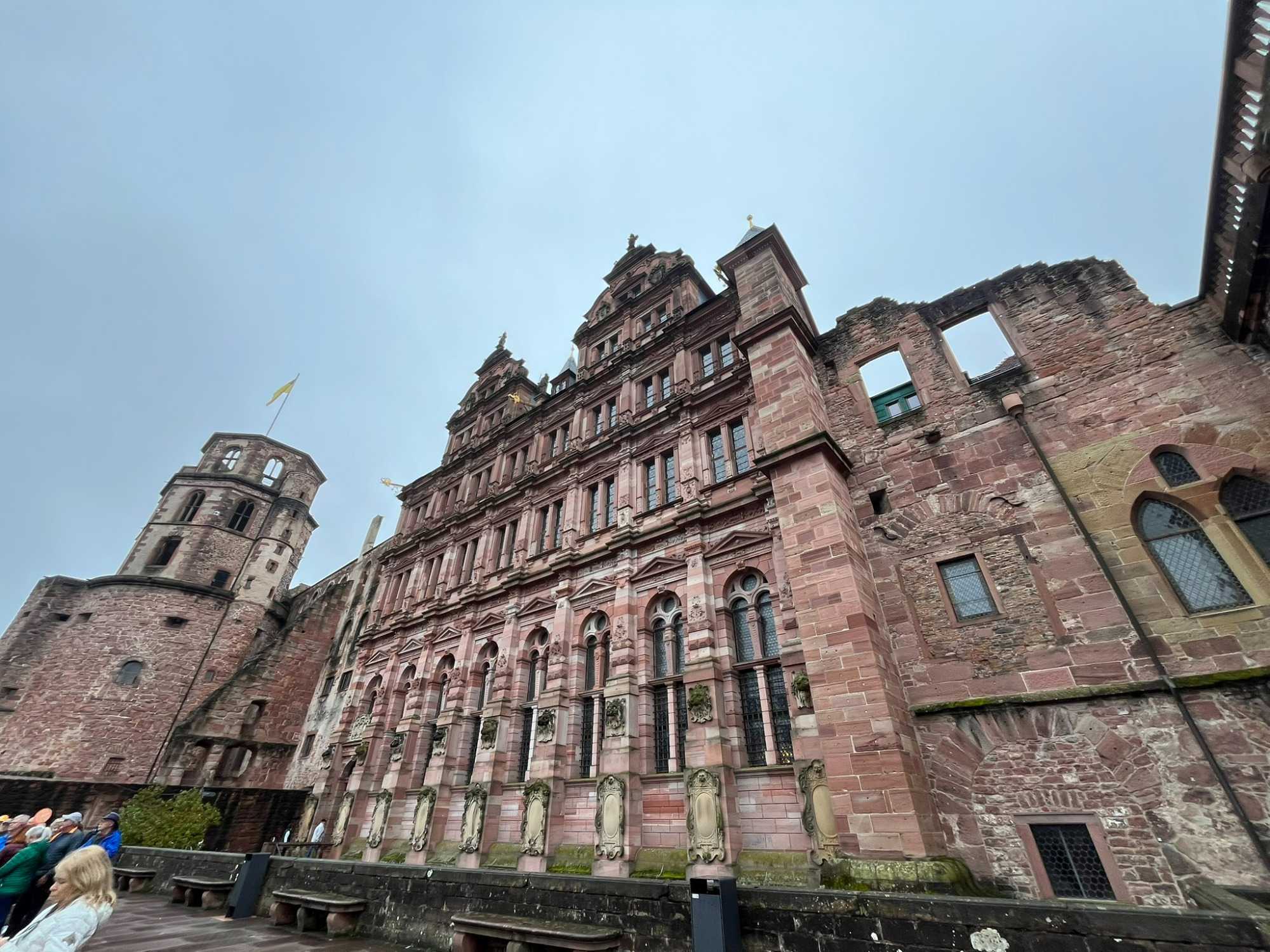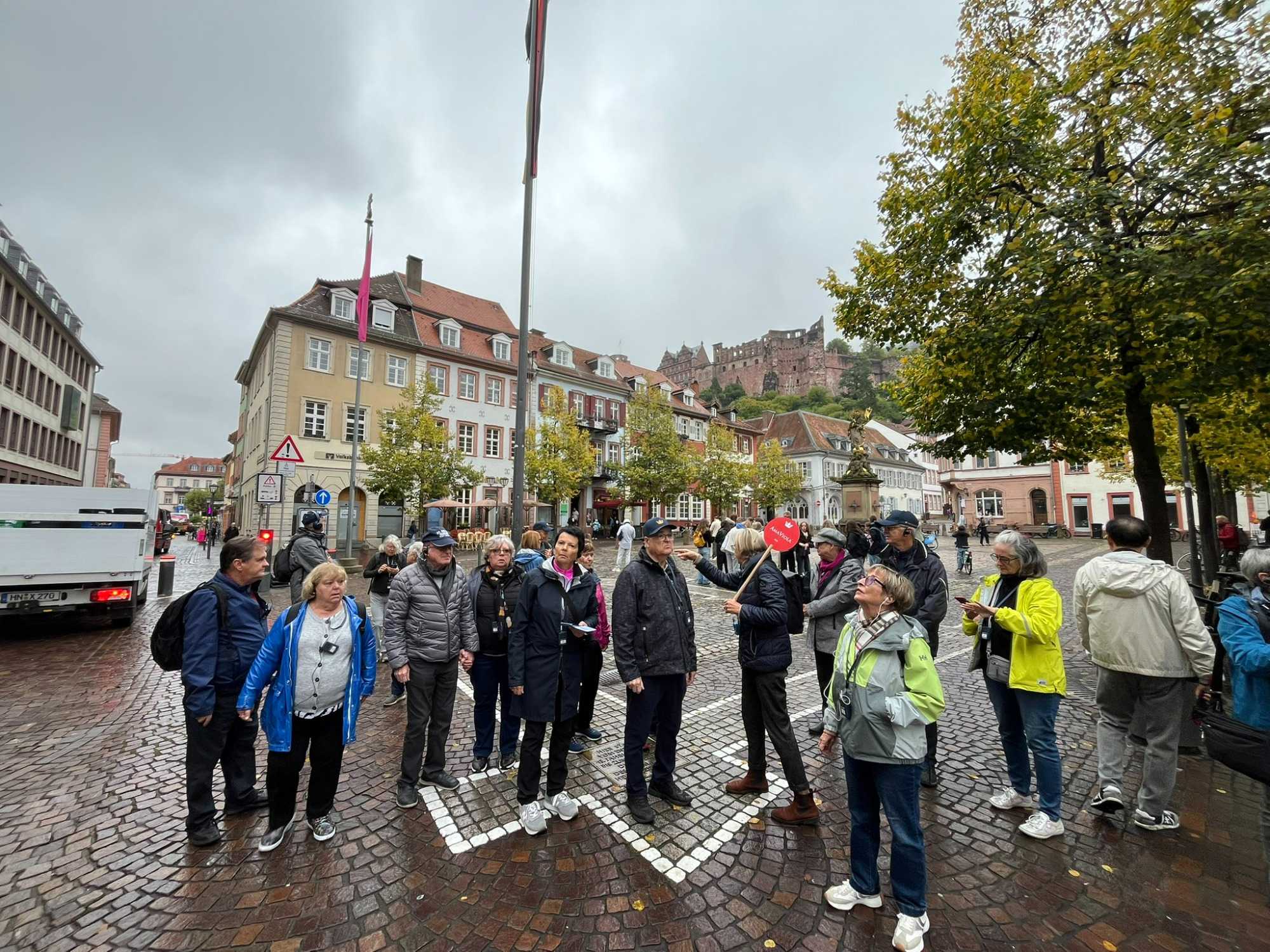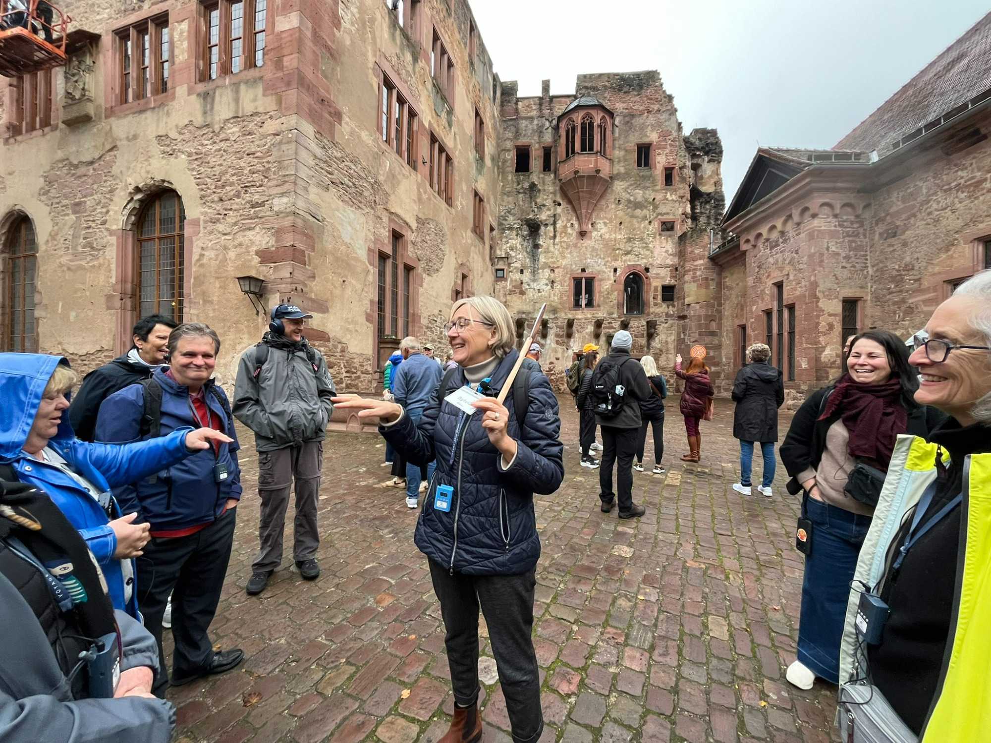 Notre première halte se fait au majestueux château de Heidelberg, avec Sylvia notre guide francophone attitrée pour une visite guidée. Perché au-dessus de la vallée du Neckar, le château séduit les visiteurs venus des quatre coins du monde. Il fut la résidence des comtes palatins et des électeurs de la maison de Wittelsbach, qui gouvernèrent le Palatinat rhénan pendant plus de 400 ans. À son apogée, le palais rivalisait avec les splendeurs des cours de Vienne et de Prague. On y comptait 24 chambres, un théâtre de 300 places où l’on jouait du Shakespeare, et des jardins considérés comme les plus beaux d’Europe au 17e siècle – à tel point qu’on les surnommait la huitième merveille du monde.