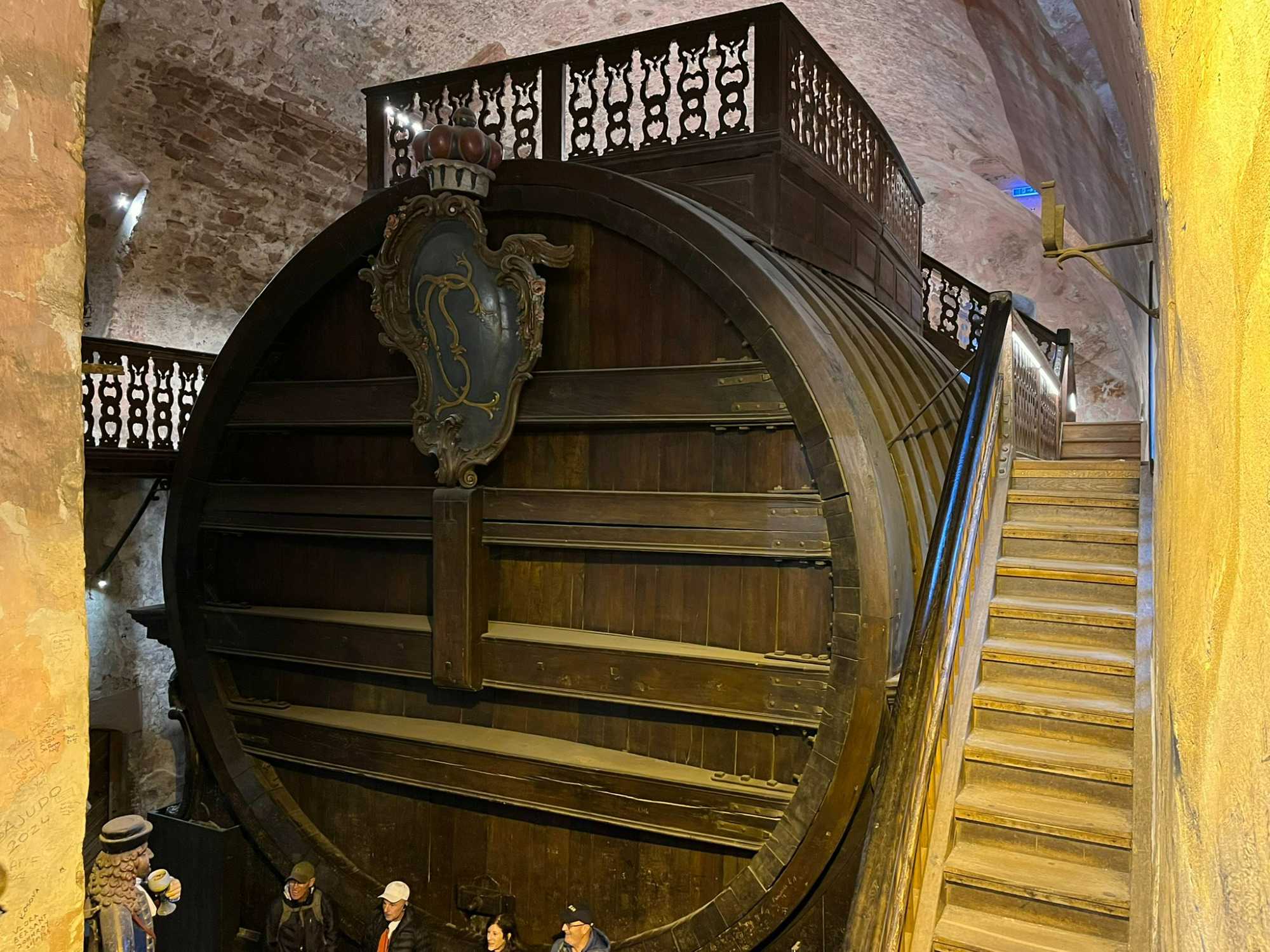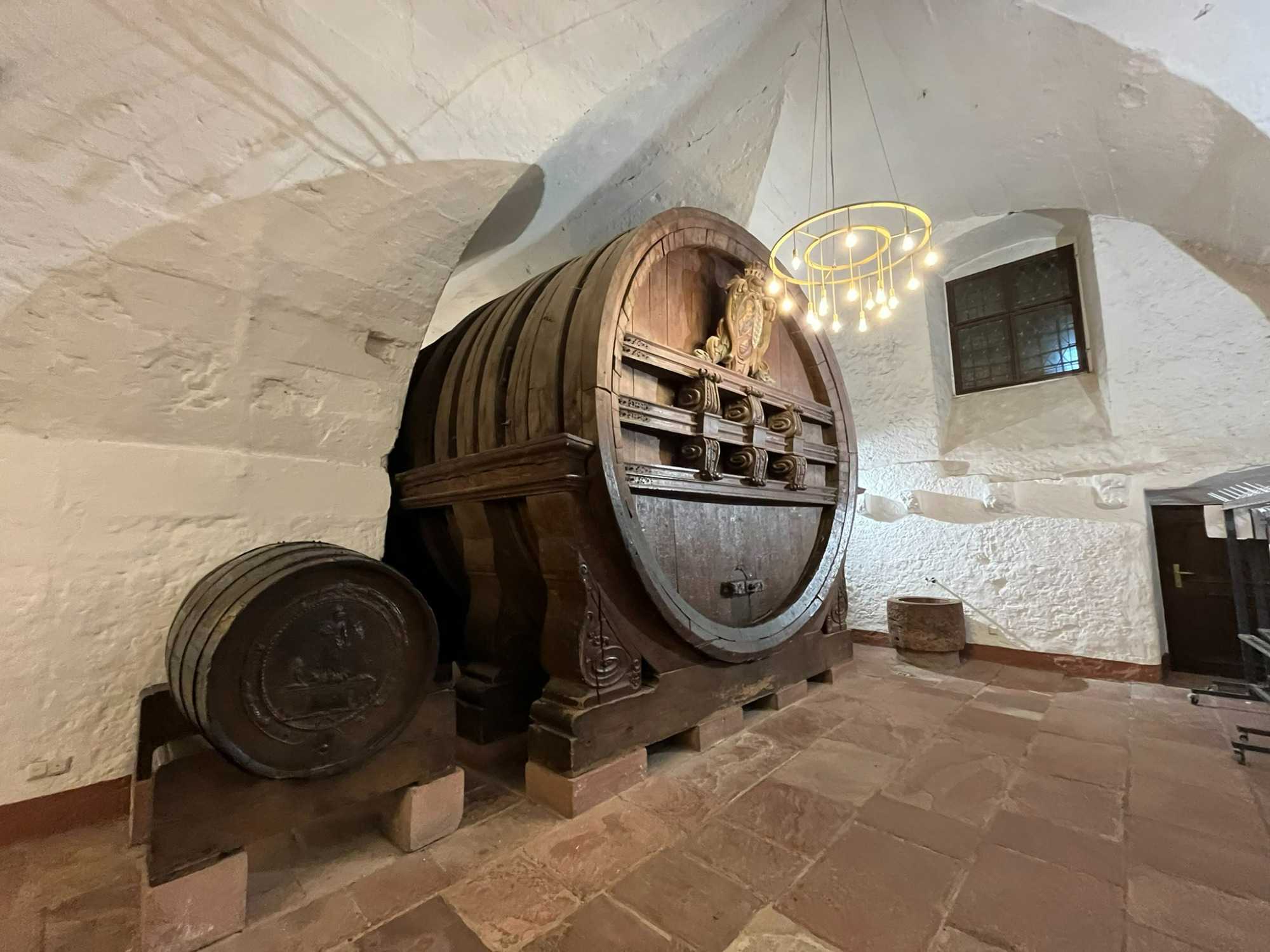 Les murs du château murmurent aussi les ravages de la fin du 17e siècle, son abandon au 18e, puis son renouveau au 19e siècle, porté par l’élan romantique. La visite guidée en vaut vraiment le coup pour bien comprendre l’histoire mouvementée de cet imposant édifice tout au long de ses 700 ans d’existence. Un moment marquant de notre visite fut sans doute la découverte de l’impressionnante cave à vin du château. Saviez-vous que la cave à vin princière abrite le plus grand tonneau du monde ? Ce dernier est construit à partir de 130 troncs de chêne et peut contenir un volume de 221 726 litres. À la grande époque, jusqu’à 2000 litres de vin étaient consommés par jour – on imagine sans peine les fêtes démesurées qui s’y tenaient !