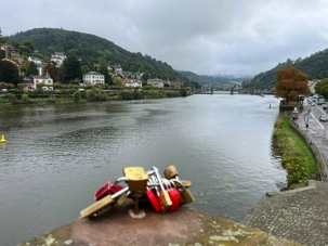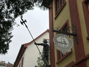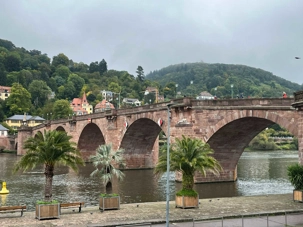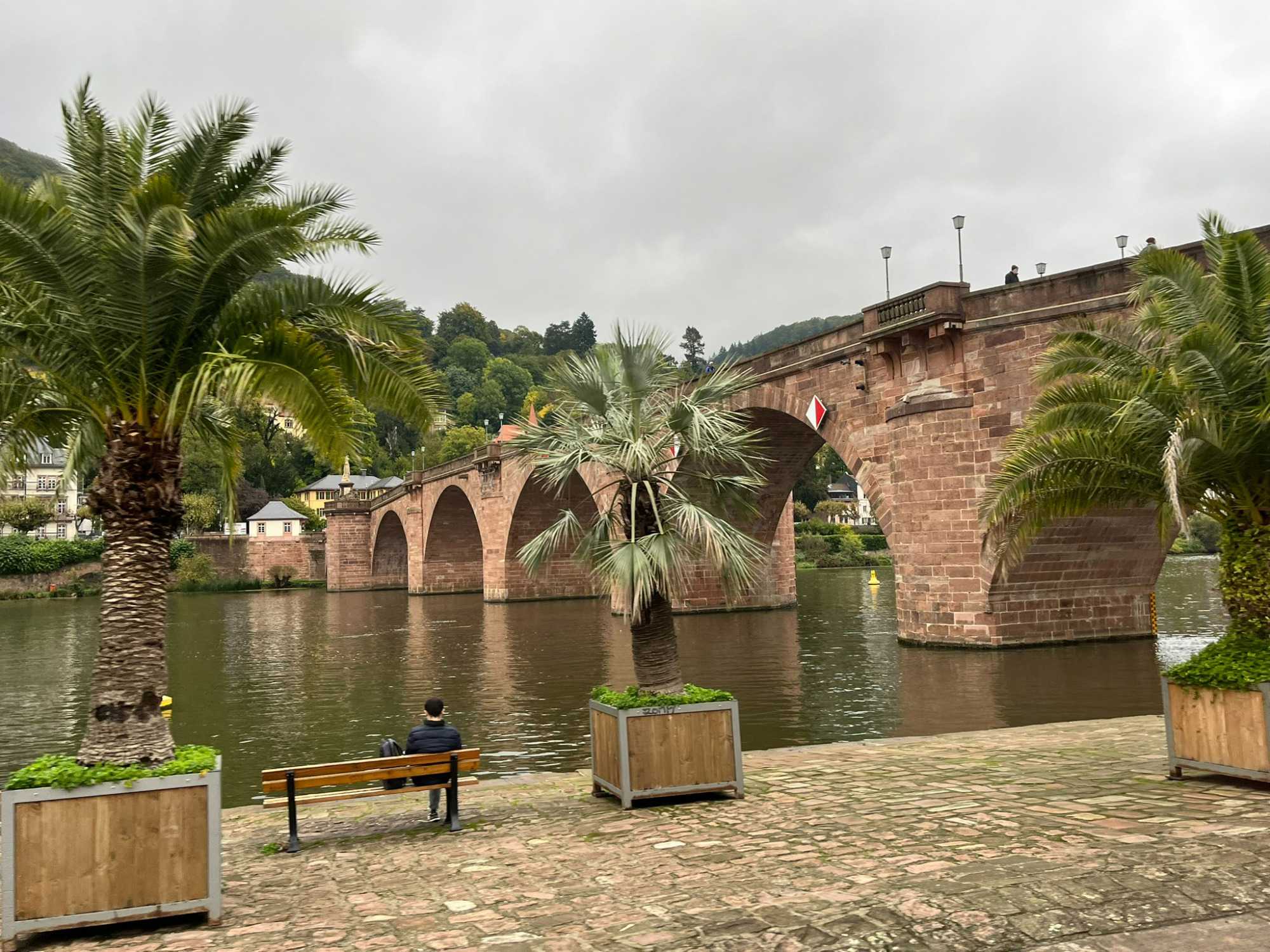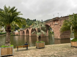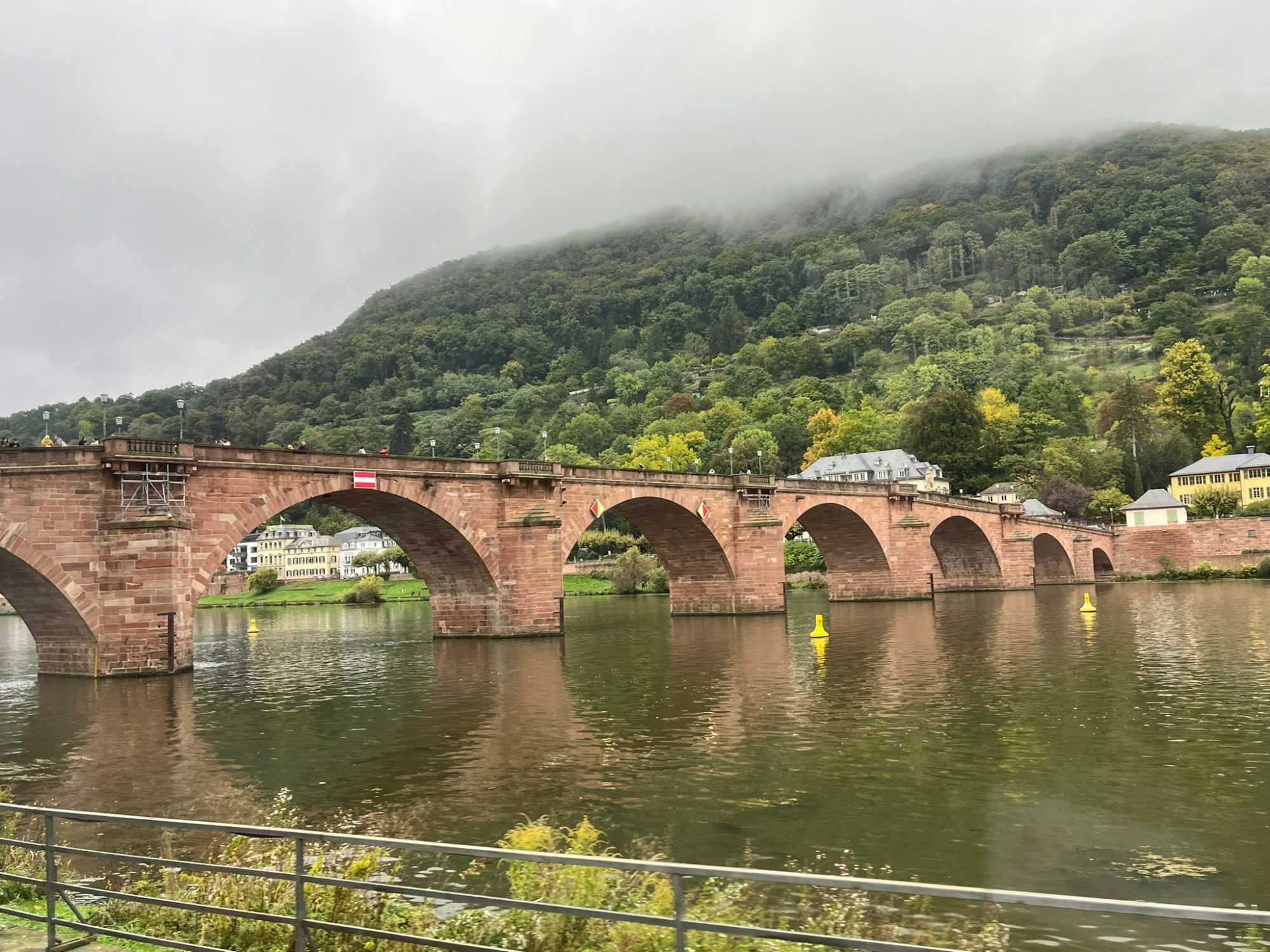 Tout en profitant des anecdotes et du sens de l’humour de notre guide, qui fut fort apprécié par tous les voyageurs d’ailleurs, la visite s’achève le long du vieux pont de Heidelberg, élégant ouvrage de grès rouge orné de neuf arches enjambant le Neckar. Construit en 1788 sous l’impulsion de l’électeur Karl Theodor, il succède à plusieurs ponts de bois balayés par les crues ou les guerres. L’histoire du site remonte à l’époque romaine ; le pont actuel est le neuvième à s’élever ici. À l’entrée, la statue baroque de Karl Theodor, bras levé, semble saluer la ville. Non loin, le célèbre singe de Heidelberg, en bronze, brandit un miroir, incitant chacun à se regarder avant de juger les autres.