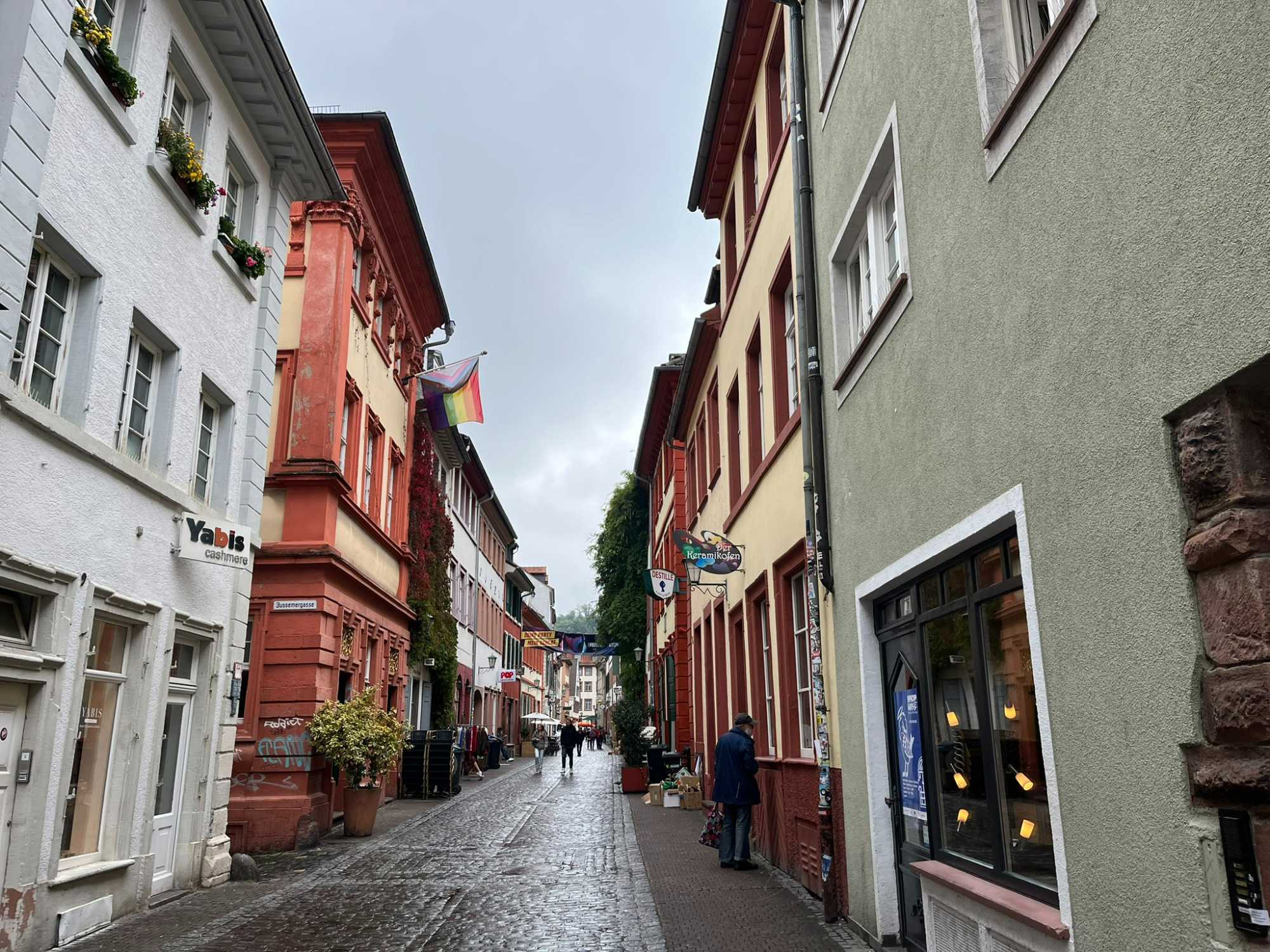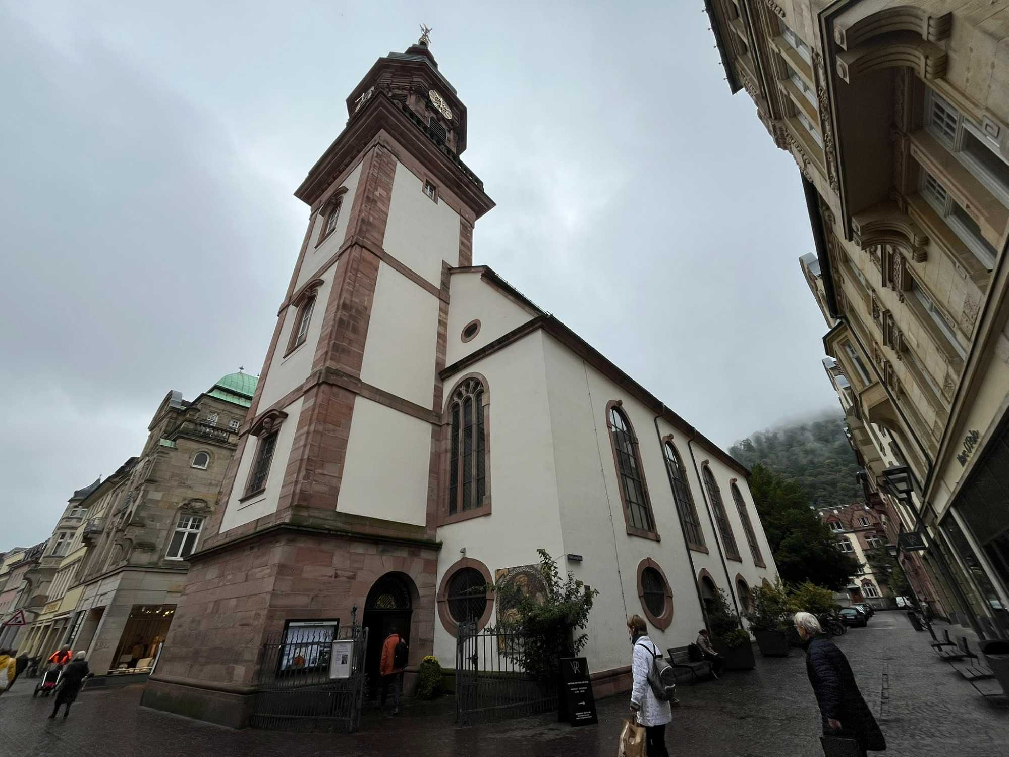 Nous empruntons la Hauptstraße, l’une des plus longues rues piétonnes d’Europe (1,6 km), autrefois traversée par un tramway. Elle est aujourd’hui bordée de plus de 500 commerces. En chemin, nous nous arrêtons devant l’église du Saint-Esprit, édifiée entre 1398 et 1441. Sépulture des princes-électeurs, elle a aussi accueilli jusqu’en 1623 la Bibliotheca Palatina, jadis l’une des bibliothèques les plus prestigieuses d’Allemagne. Conservée dans la galerie du chœur, elle fut saisie pendant la guerre de Trente Ans par la Ligue catholique, offerte au pape, puis transférée à Rome. Une partie repose encore aujourd’hui à la Bibliothèque vaticane.