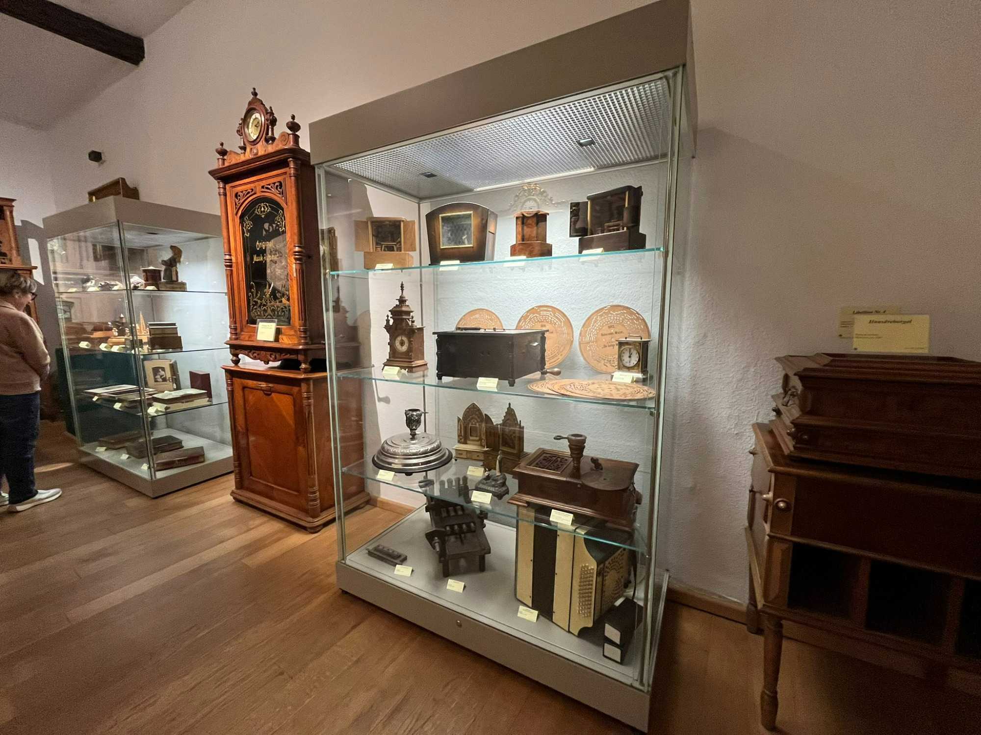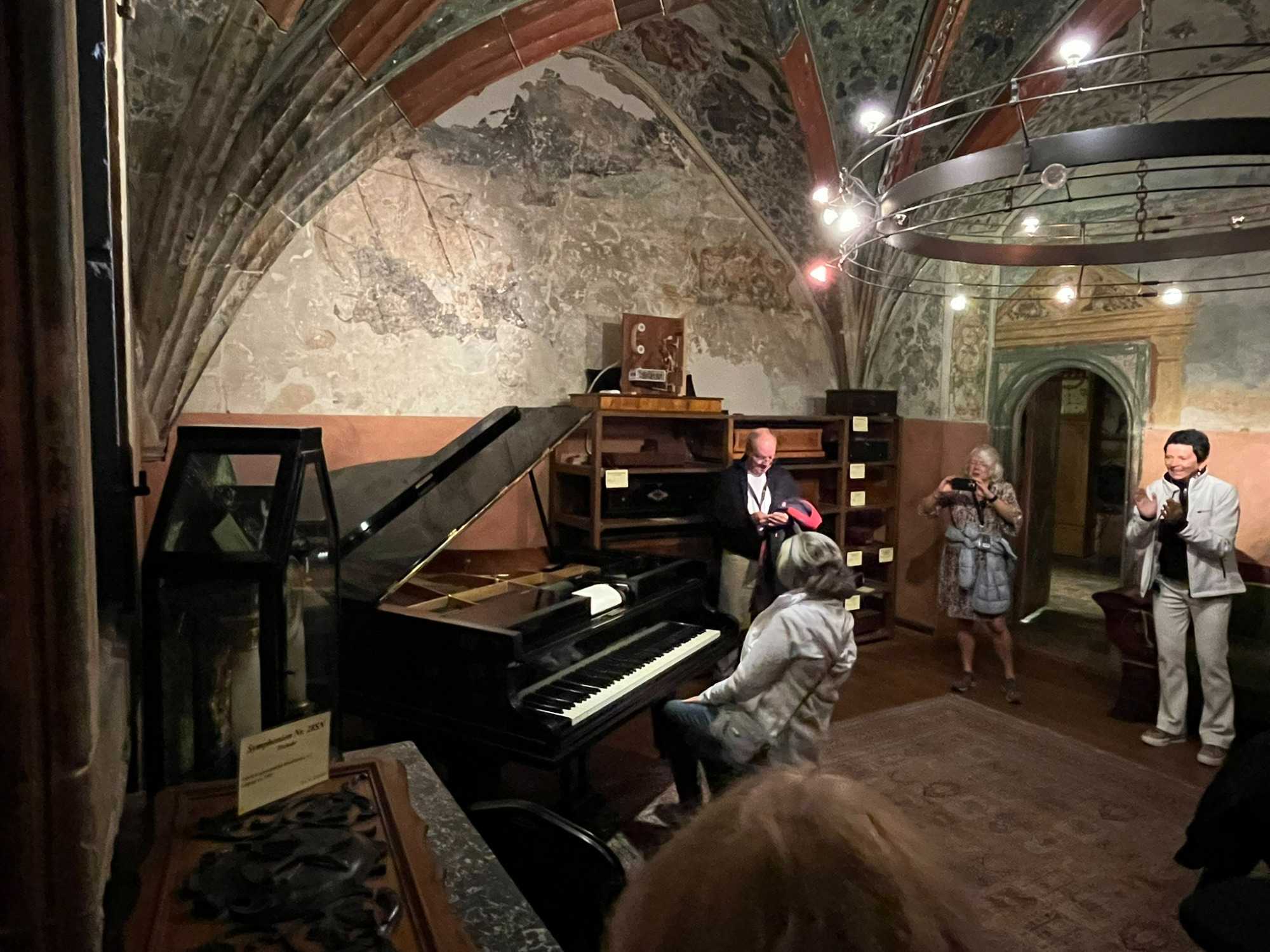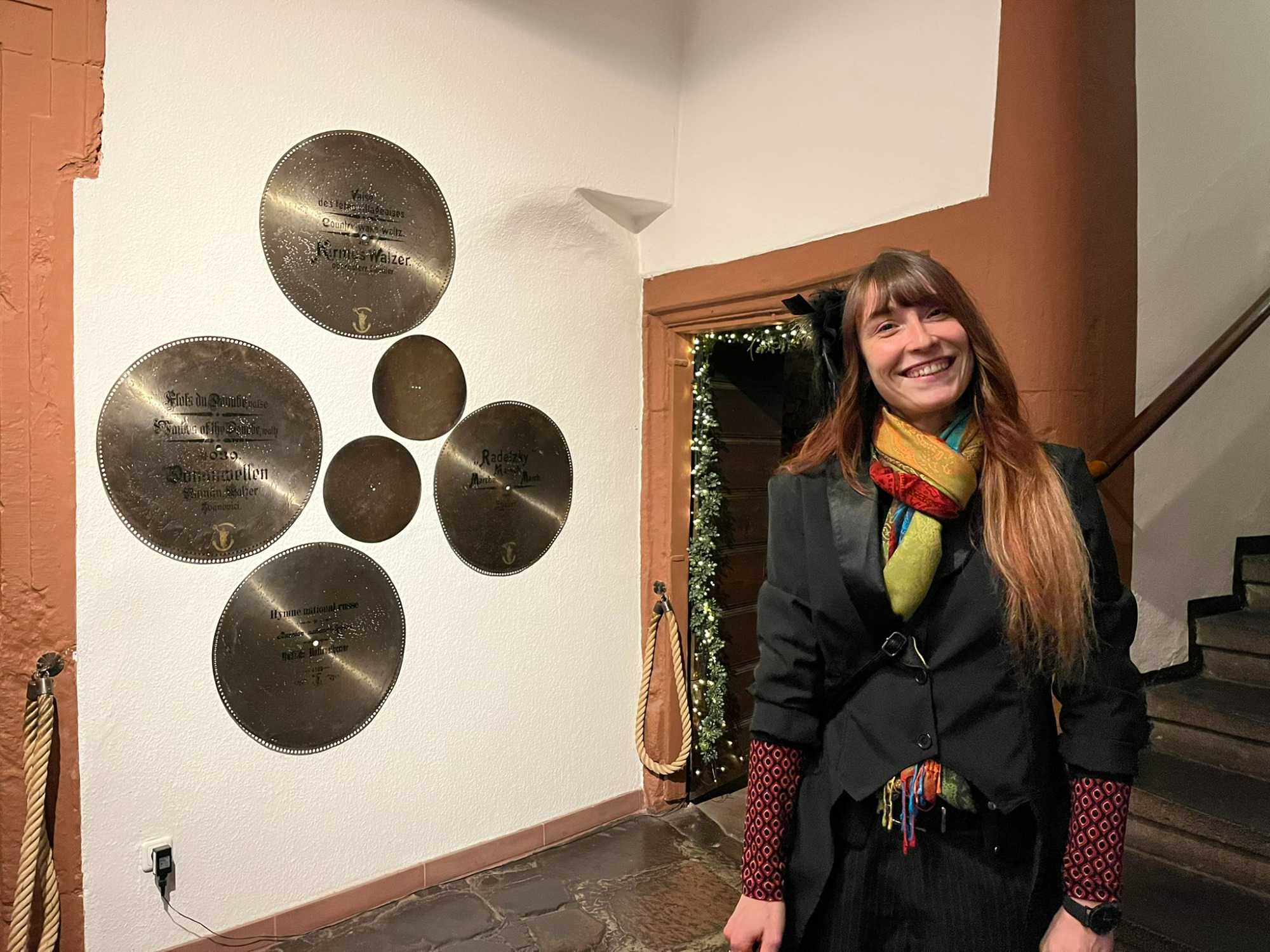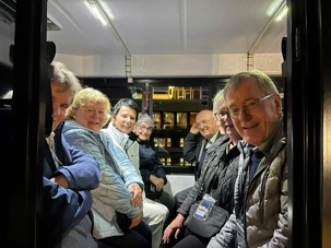 À destination, et à la suite d’un énième souper bien arrosé, nous montons à bord d’un petit train touristique qui nous conduit au Siegfried’s Mechanisches Musikkabinett, le tout premier musée allemand consacré aux instruments de musique mécaniques. Fidèles à nous-mêmes dans ces petits trains, nos wagons étaient les plus turbulents et ricaneurs. Logé dans le Brömserhof, une demeure du 15e siècle, il rassemble plus de 350 instruments automatiques : boîtes à musique, orchestrions, pianos mécaniques, gramophones et autres merveilles techniques. Un vrai bonheur des sens. Lucie et Sylvie ont actionné la manivelle d'un orchestrion et Christiane y est allée de quelques douces notes au piano. Nous avons également observé les outils servant à fabriquer cylindres d’orgue, rouleaux de notes et plaques musicales. Cette plongée sonore dans les savoir-faire d’autrefois fut un moment unique, apprécié de tous grâce à Sylvain, notre animateur dédié. On y découvre de véritables merveilles d’ingéniosité jusqu’aux boîtes musicales qui imitent à la perfection le chant de différentes espèces d’oiseaux. Patrice a terminé la visite en jouant l'air de Valderi Valdera alors que nous chantions tous en chœur. C'était beau à entendre. En sortie de visite, une autre surprise attendait le groupe: au nom de Louise Drouin, j'ai offert aux voyageurs une petite boîte à musique. Un geste fort apprécié qui permettra à chacun de conserver un souvenir mélodieux de cet endroit.