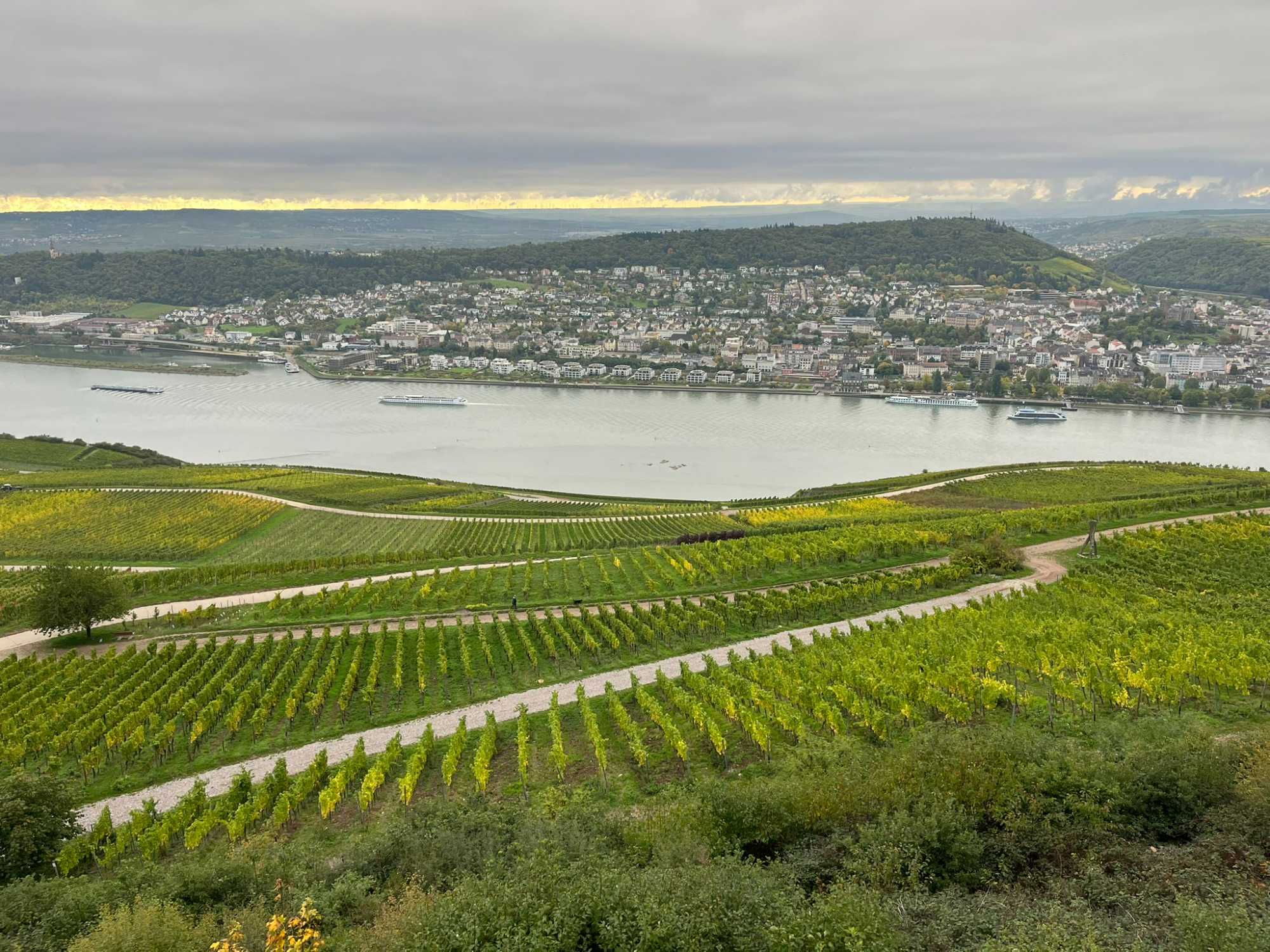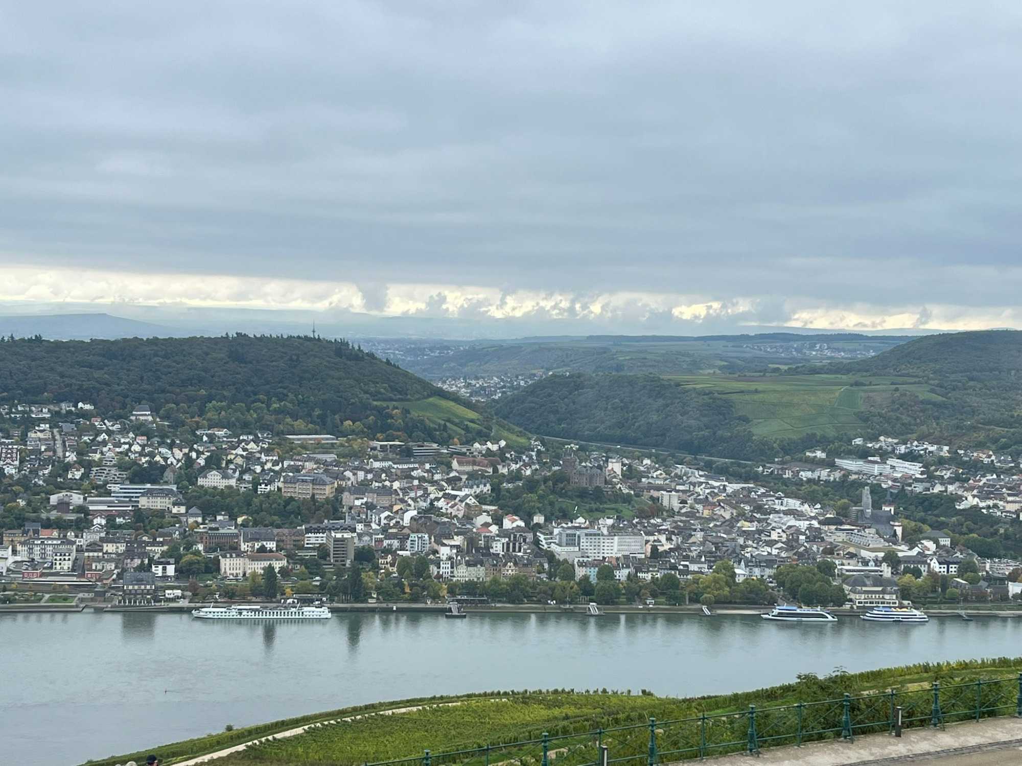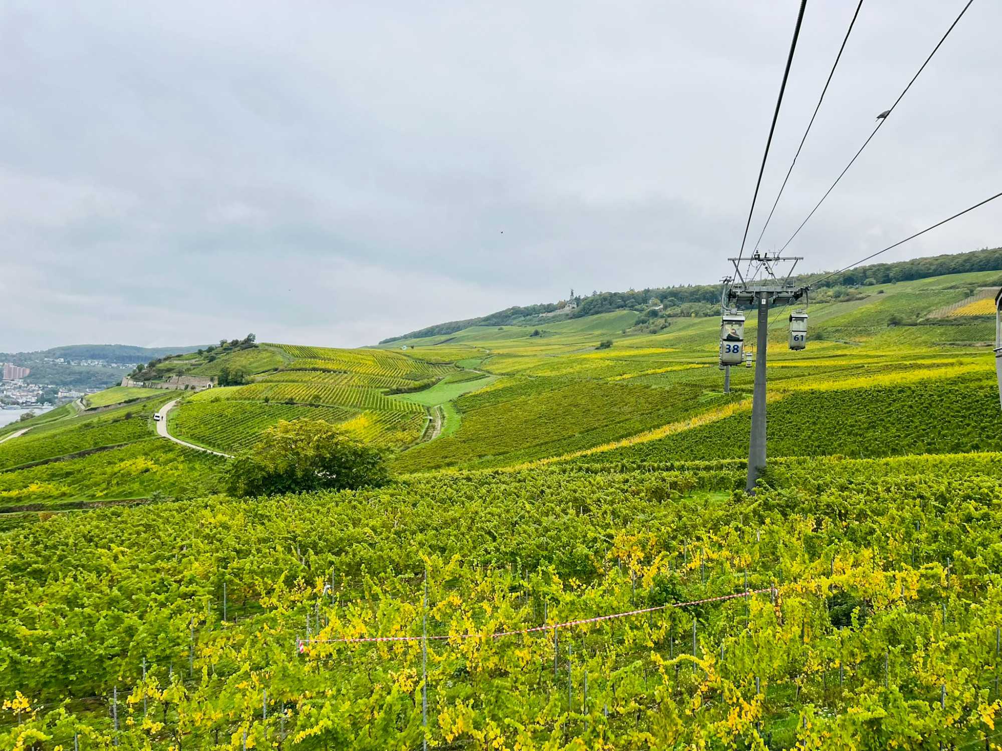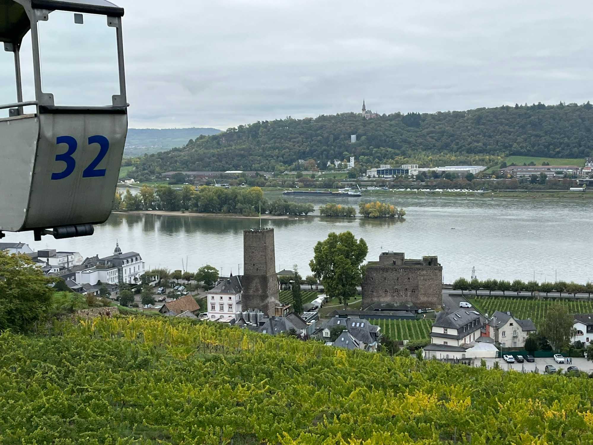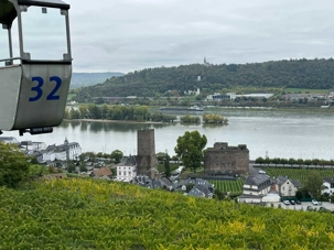 Cet avant-midi, nous avons la chance de poursuivre notre exploration de Rüdesheim d’une manière toute particulière, c’est-à-dire du haut des airs en compagnie de Marion, une Allemande d’origine qui a appris son français en Suisse. C’est à bord d’une gondole biplace que nous amorçons notre ascension d’une dizaine de minutes. Le téléphérique s’élève lentement au-dessus des vignobles en terrasses, offrant un panorama spectaculaire sur la vieille ville, le Rhin, ses îles et les collines environnantes. Au sommet, trône l’imposant Niederwalddenkmal.
