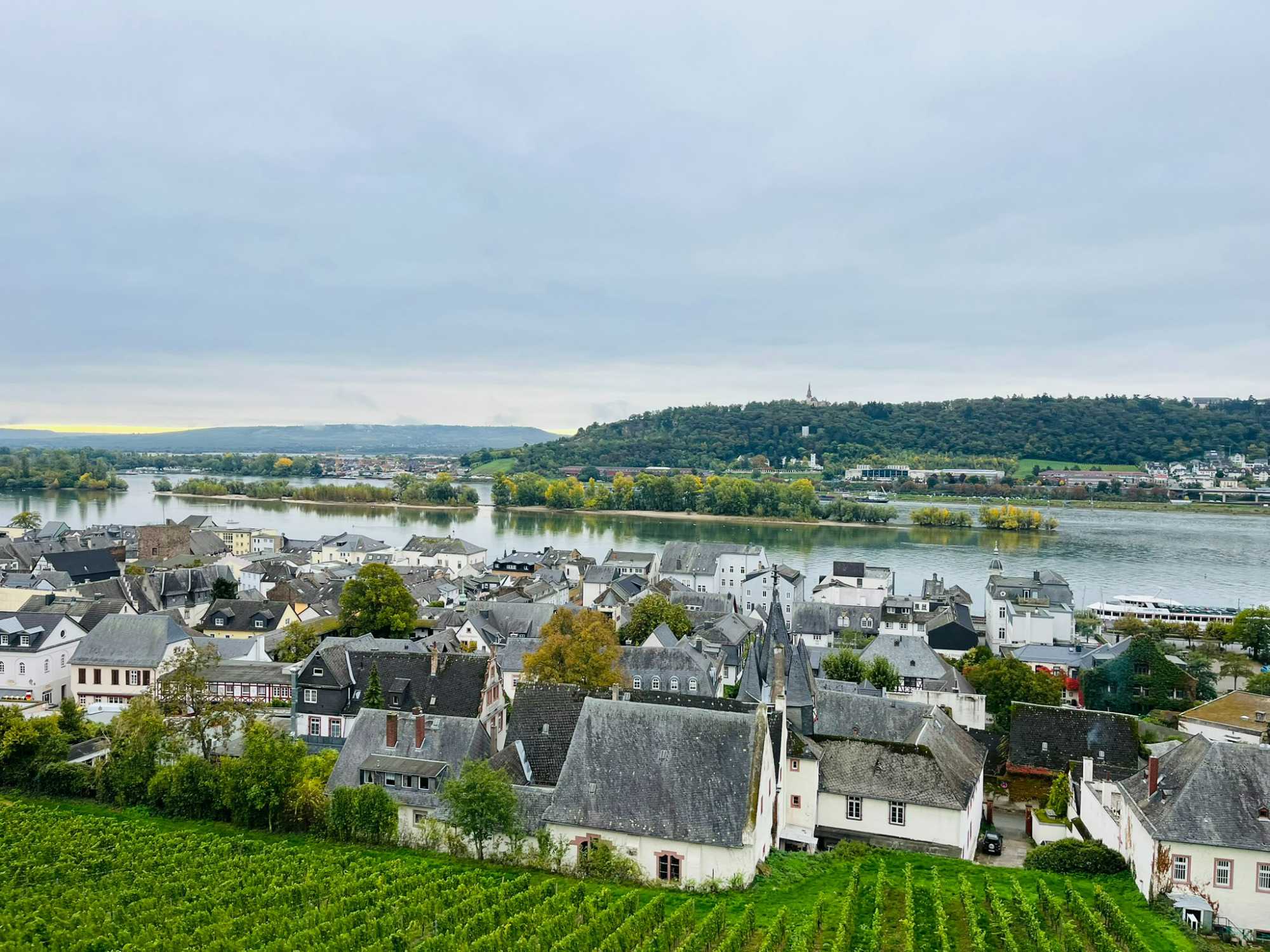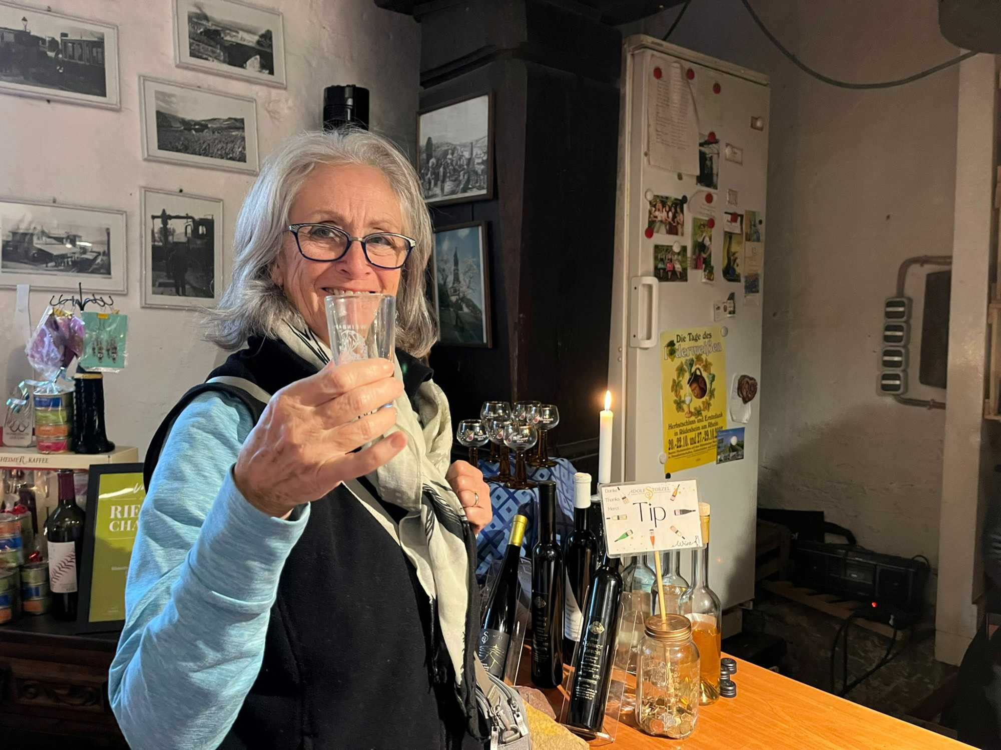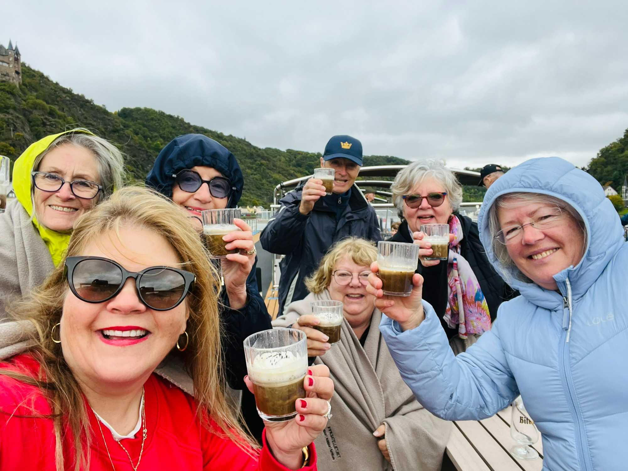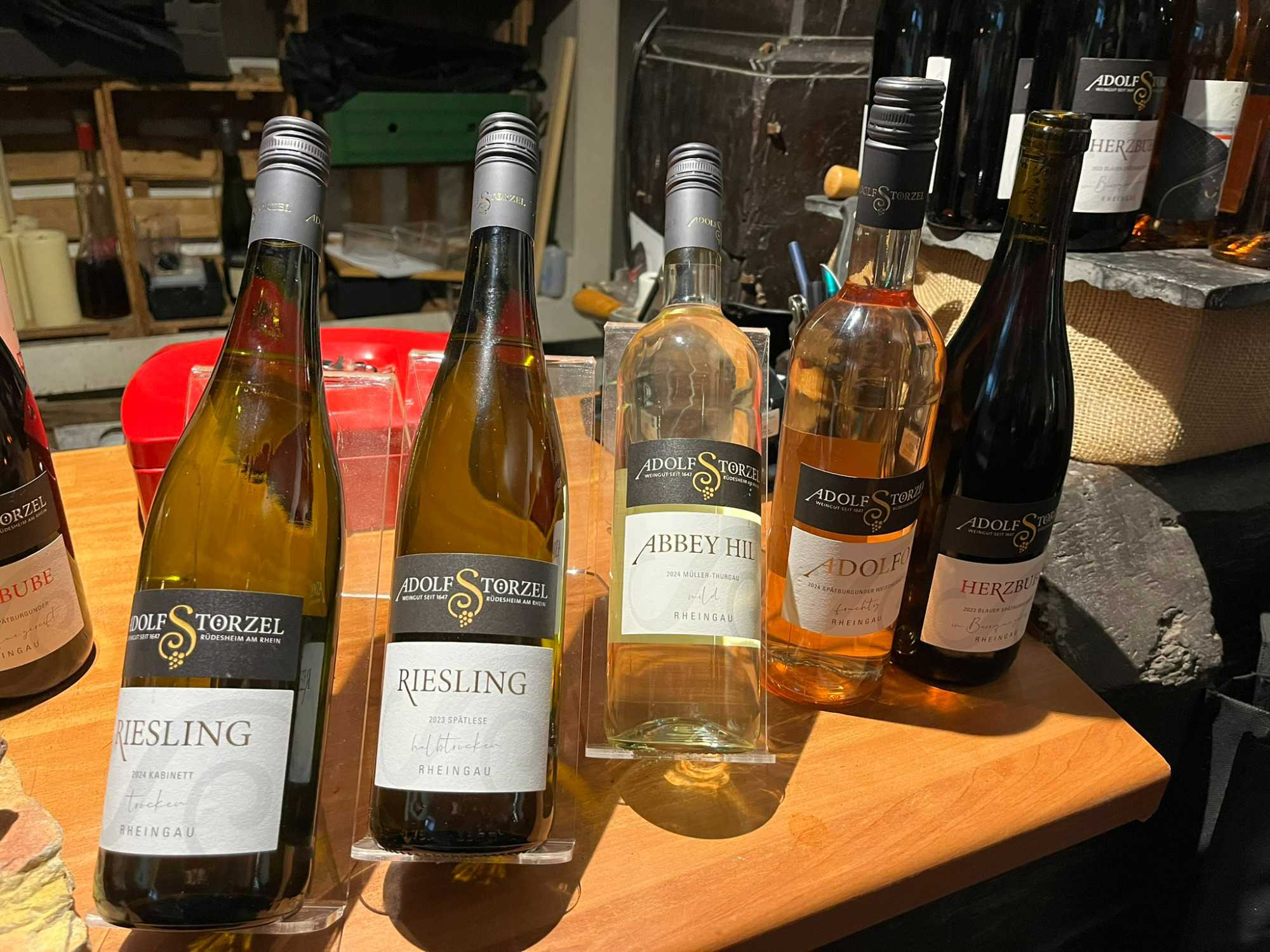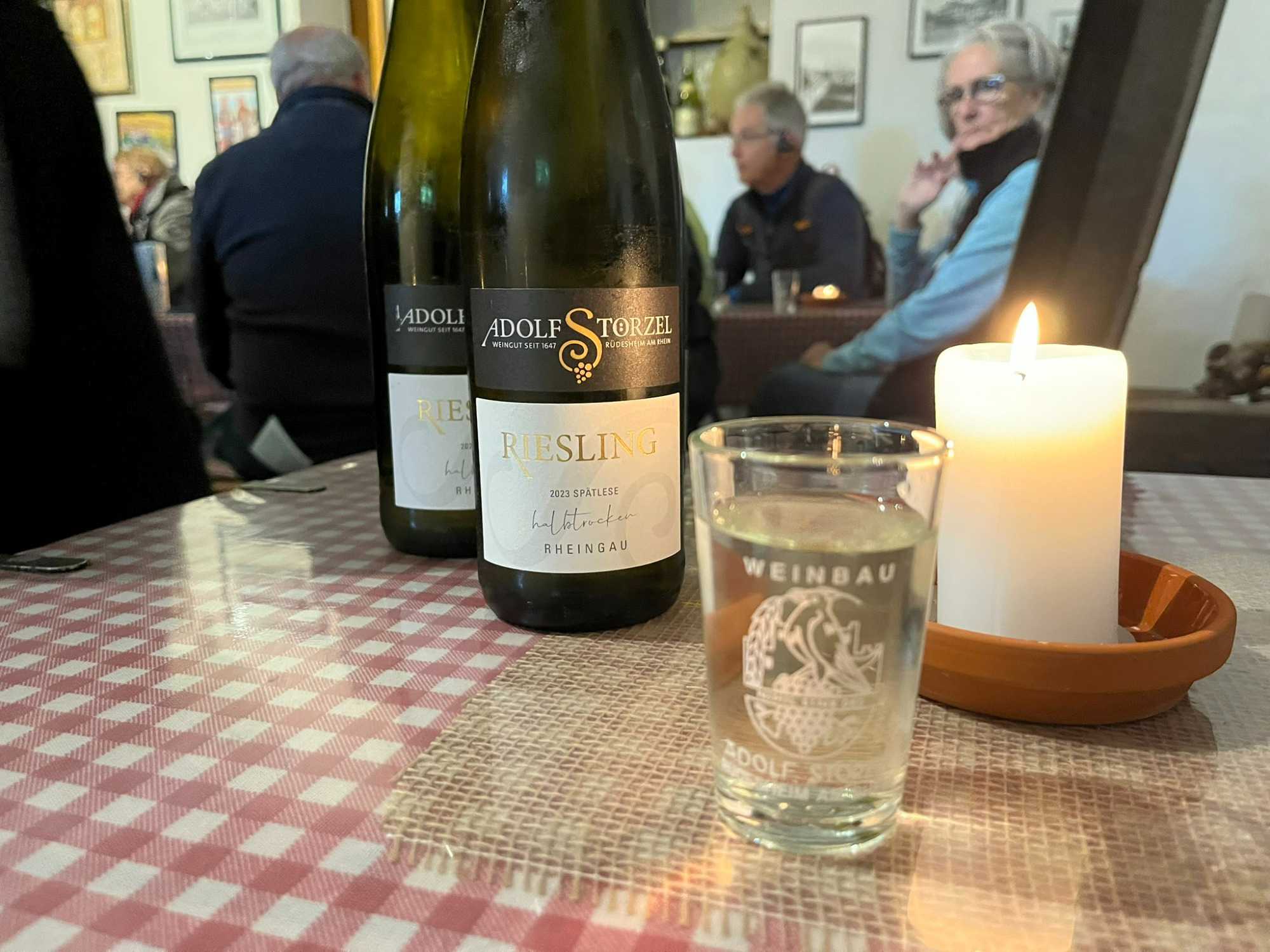 Sans conteste, cette vue imprenable sur des milliers de vignes nous a donné l’envie d’un petit boire. Après tout, il doit bien être 17 h à quelque part dans le monde, n’est-ce pas ? Nous nous offrons donc une dégustation de Riesling dans une demeure seigneuriale du 16e siècle, au vignoble Adolf Storzel, où nous savourons en compagnie de Mathilde, trois déclinaisons de ce cépage local. Le sec, le demi-sec et le Müller-Thurgau, la version plus sucrée des trois. Le Riesling de Rüdesheim est un vin blanc réputé pour sa fraîcheur, sa minéralité et ses arômes délicats de pomme et de pêche. Produit par des vignerons passionnés dans cette région de renom, il séduit par sa finesse, sa polyvalence et la rosée de nos pommettes un brin pompettes. Pas facile les dégustations matinales. De nouveau, que des rires et du beau plaisir !