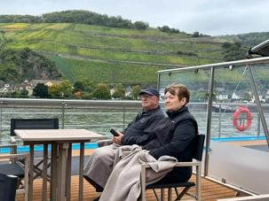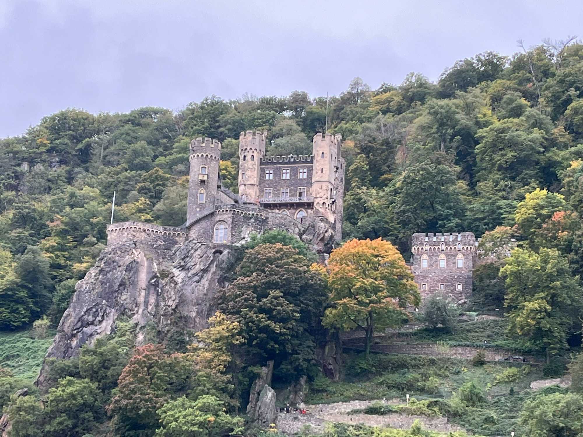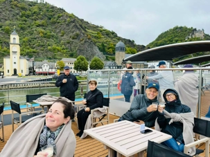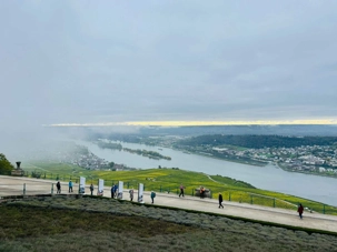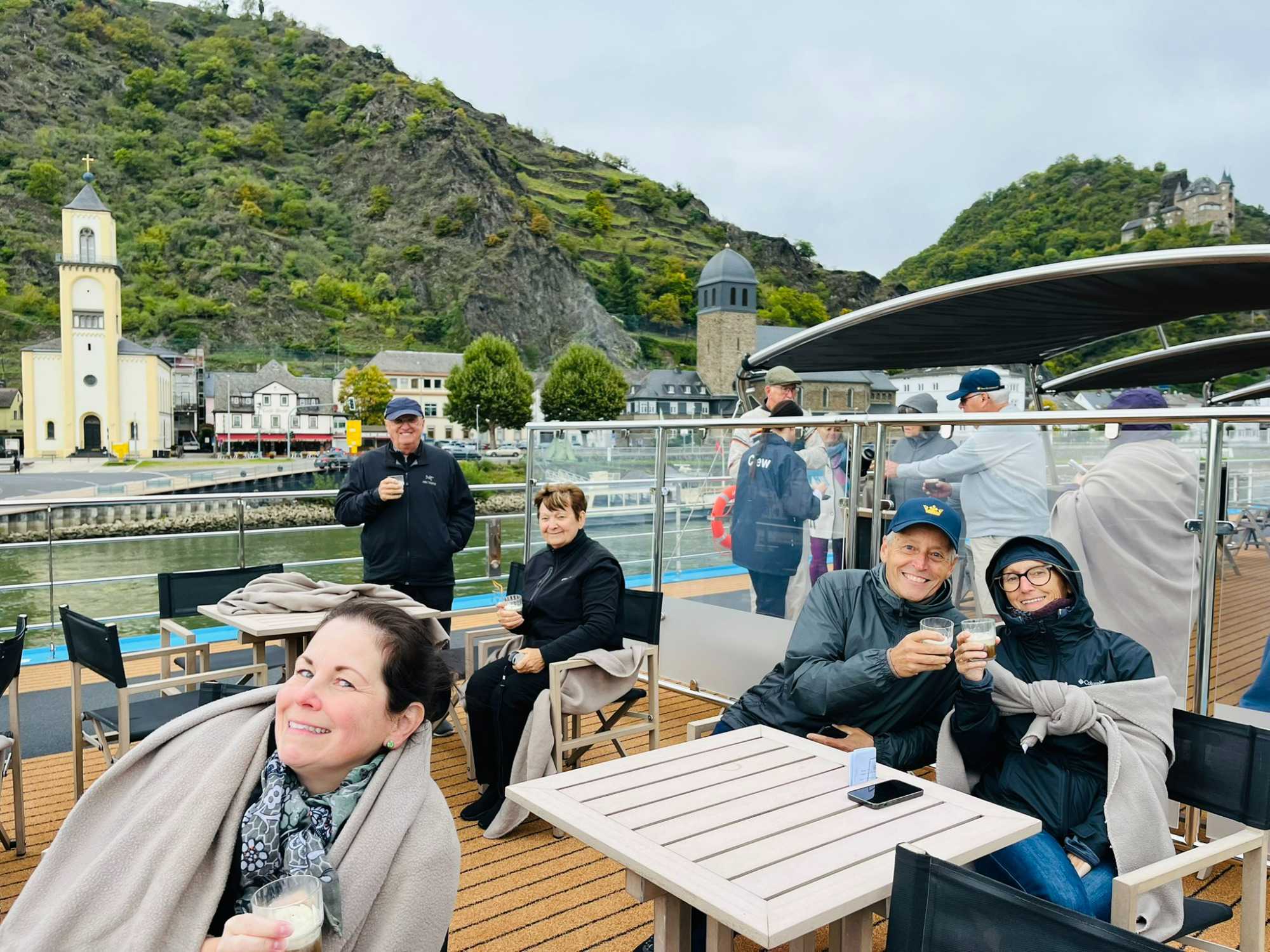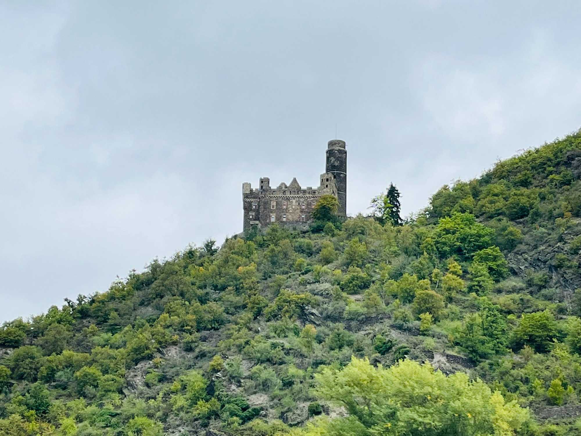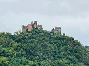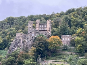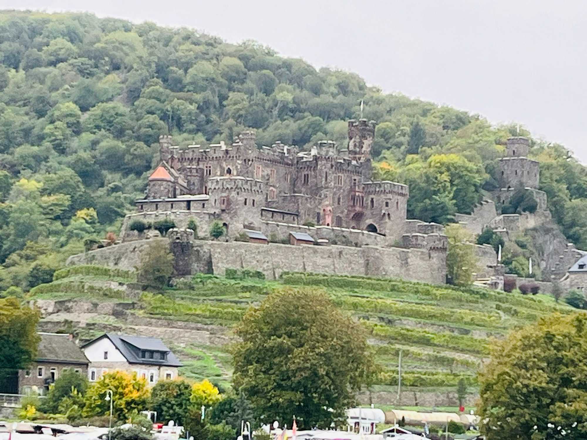 Majoritairement, nous nous installons sur le pont Soleil pour être aux premières loges de ce spectacle à grand déploiement. Ce tronçon du Rhin est sans doute l’un des plus remarquables d’Allemagne, tant pour ses paysages à couper le souffle que pour son héritage historique dans une ambiance empreinte de légendes et de romantisme. La chance nous sourit, aucune chance de pluie, mais avec une température, avoisinant les 13 degrés. Heureusement que nous étions tous bien emmitouflés sous nos couvertures et que l’équipage nous a offert un café Rudësheimer, typique et bien alcoolisé. Dès les premières minutes de navigation, le décor s’ouvre sur la statue de Guillaume Ier, vue sous tous les angles alors que nous franchissons le “coin allemand”. Armés d’une carte repérant les châteaux, nous scrutons les collines à la recherche de ces trésors médiévaux. Une narration diffusée par haut-parleur enrichit notre traversée, en détaillant les forteresses et les châteaux perchés que nous croisons. On en dénombre plus d’une quarantaine dans cette seule portion du fleuve !