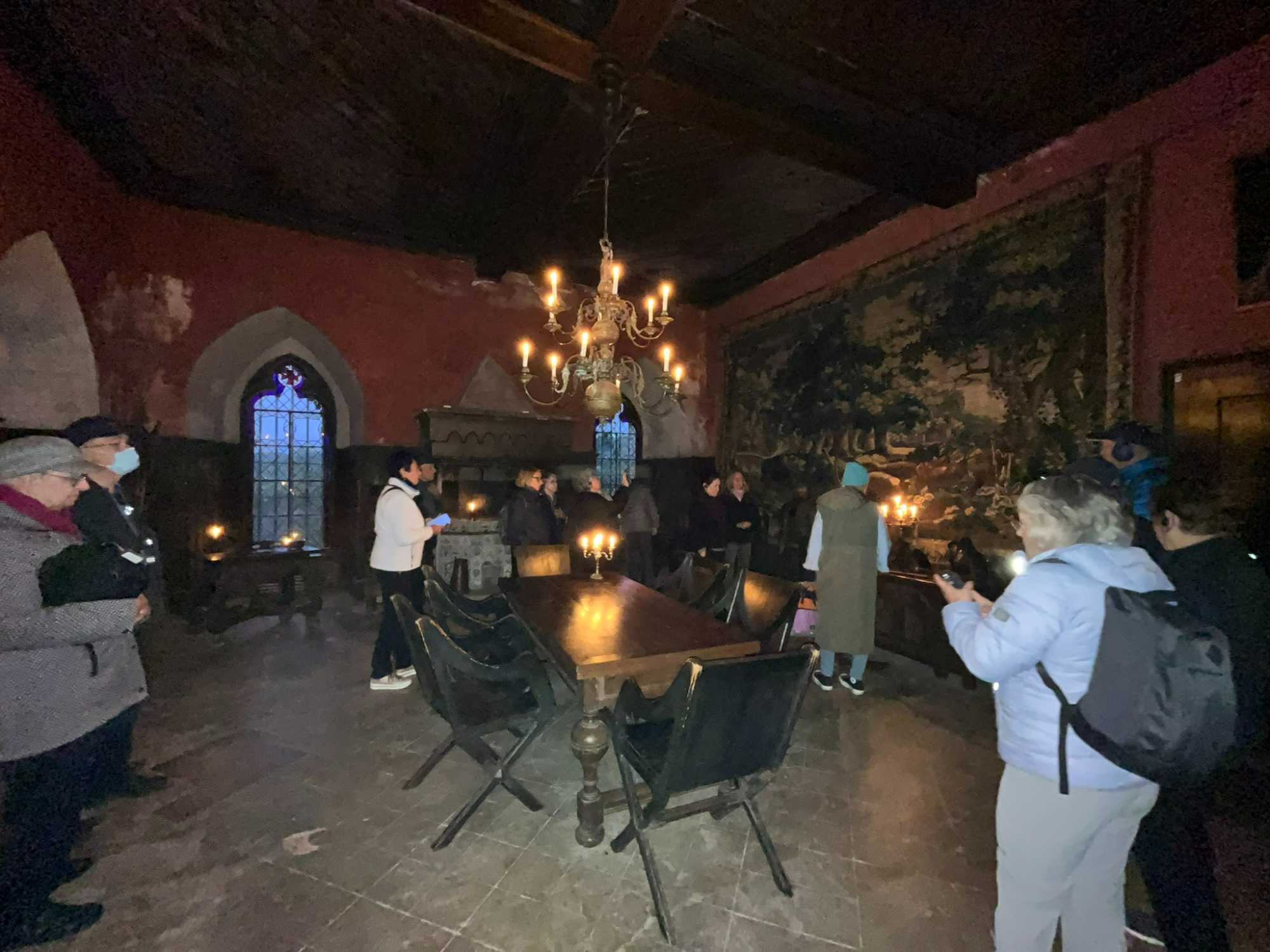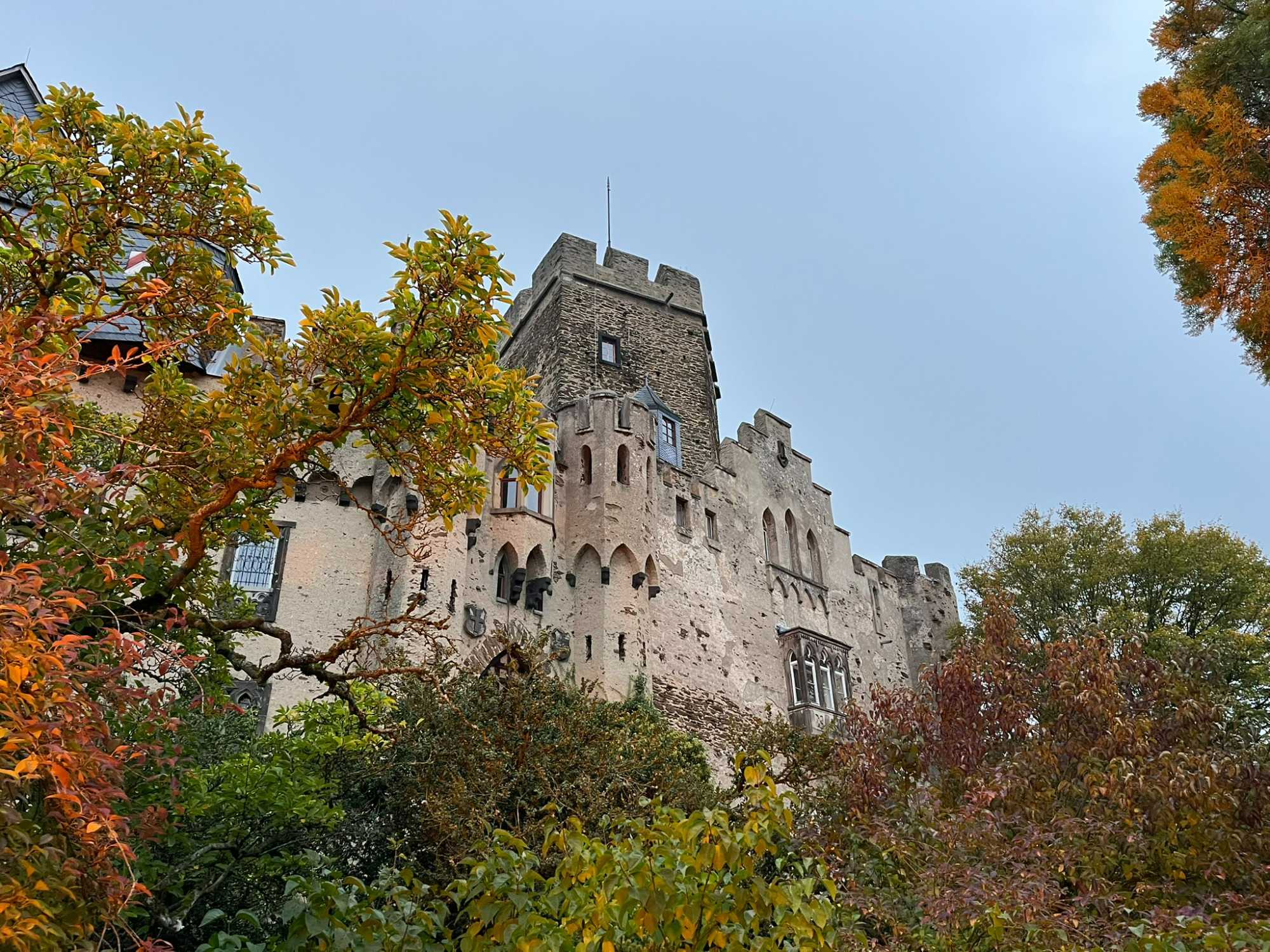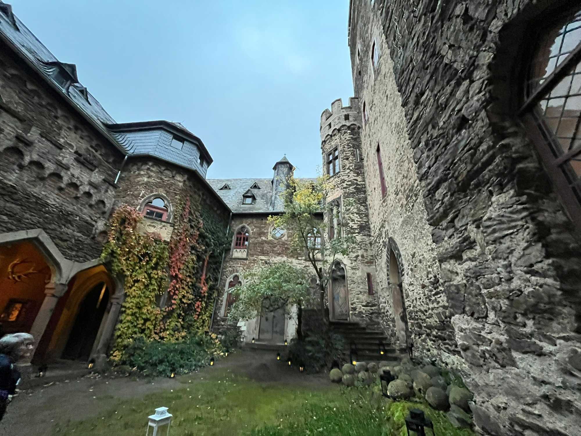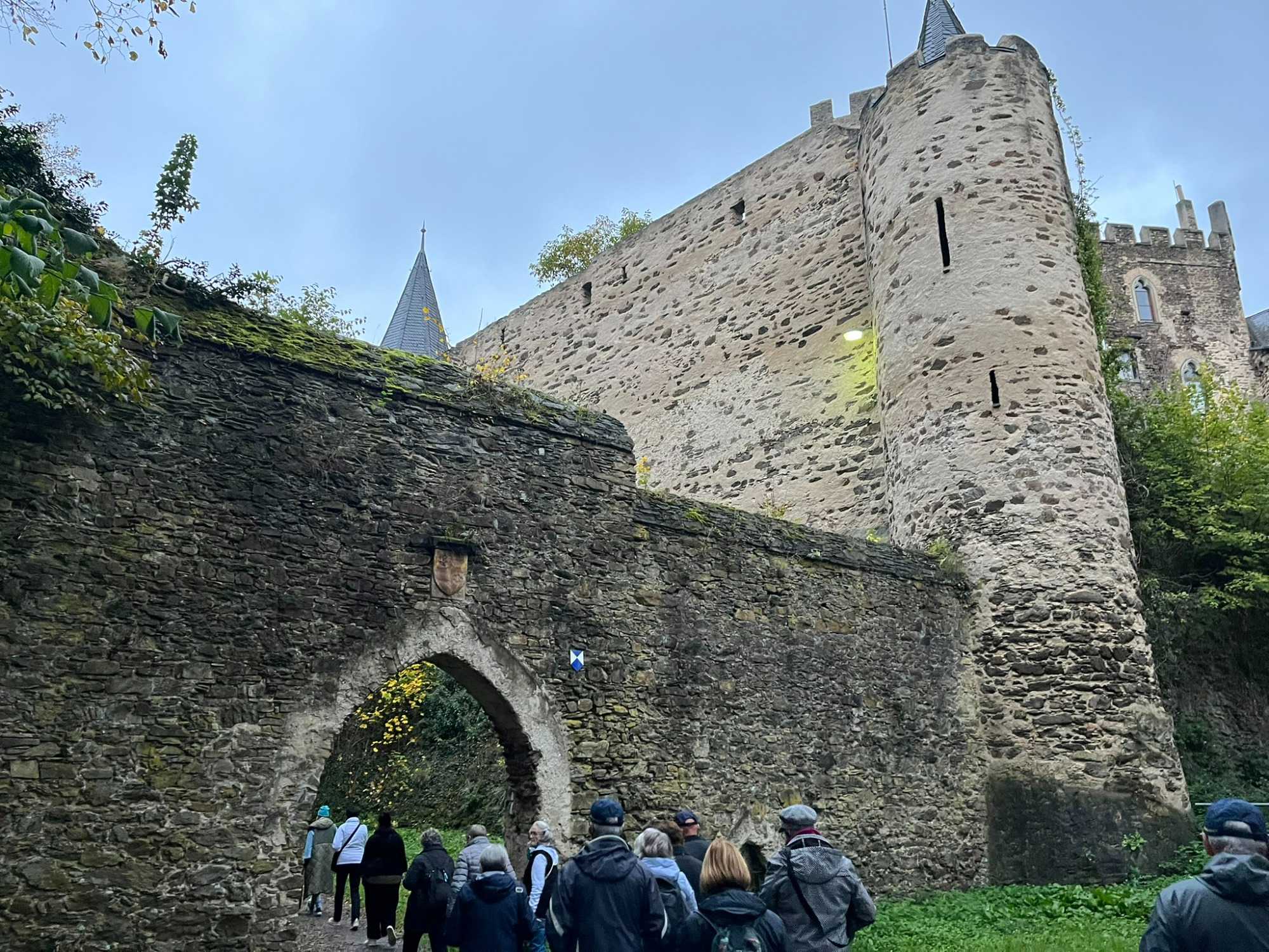 Aussitôt amarré au port de Lahnstein, nous prenons la route du château fort de Burg Lahneck, perché sur un promontoire rocheux, en compagnie de Claudia notre guide. Cette forteresse, construite en 1244 par l’archevêque de Mayence, visait à protéger la région et ses mines d’argent. Assiégée à de nombreuses reprises au 14e siècle, gravement endommagée durant la guerre de Trente Ans (1618-1648), elle est laissée en ruine en 1688 avant d’être restaurée dans un style néogothique anglais à partir de 1850. Depuis 1907, elle appartient à la famille Mischke. Notre visite guidée nous plonge dans l’histoire à travers mobilier d’époque, armes anciennes, armures et même une collection de maisons de poupées. La structure elle-même illustre magnifiquement l’architecture militaire médiévale avec son donjon, sa cour intérieure, ses escaliers en pierre et ses tours de guet. De profiter du tout éclairé à la chandelle, offre une tout autre perspective à contempler, bien que la qualité des photos, pour vous chers lecteurs en est quelque peu altérée.