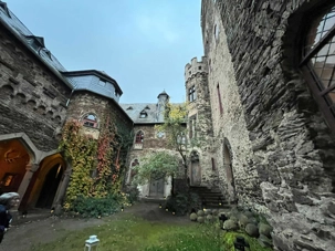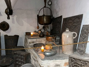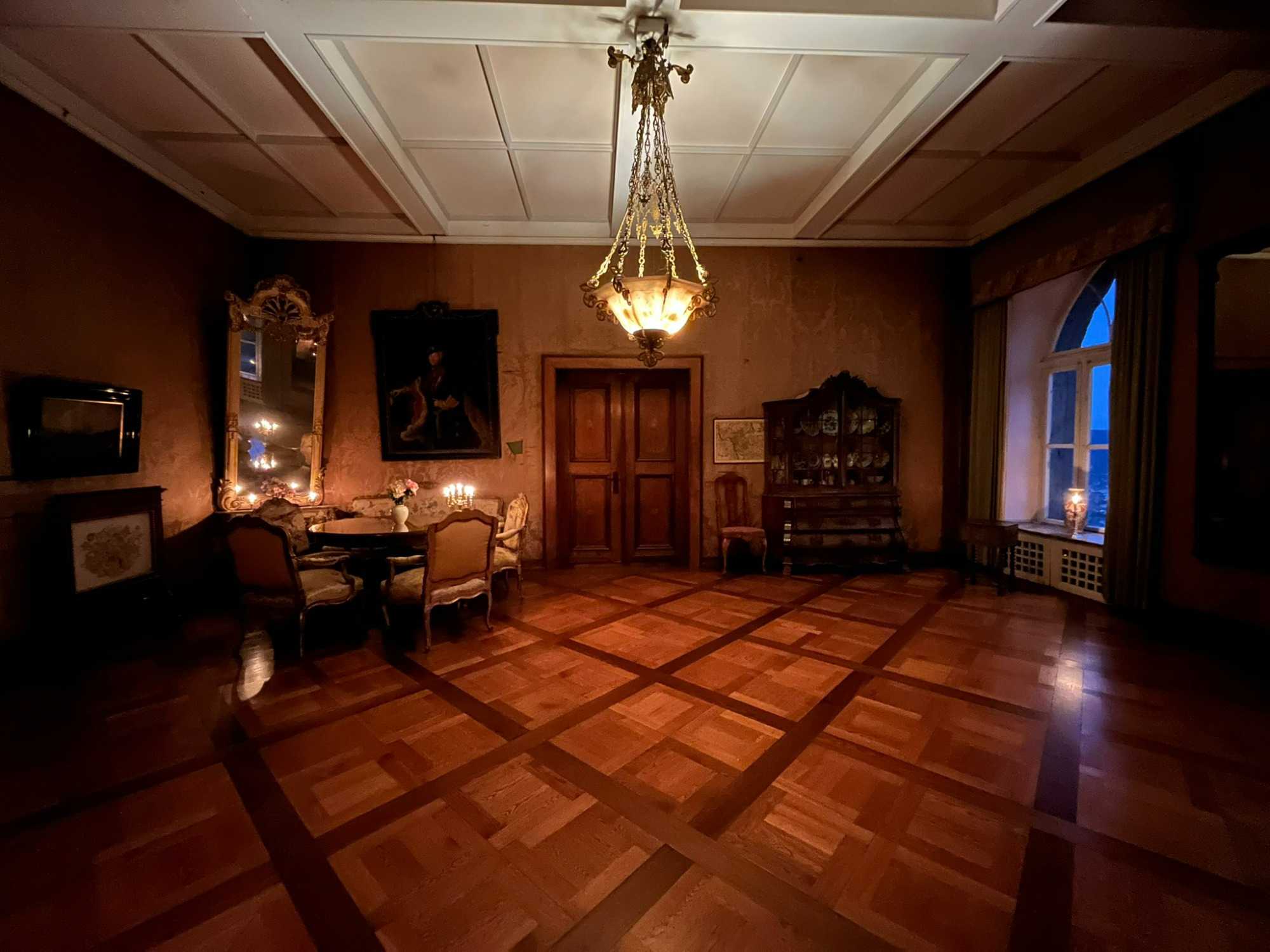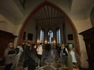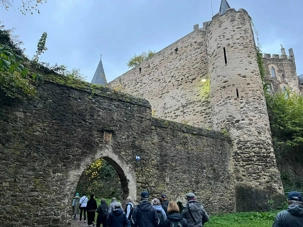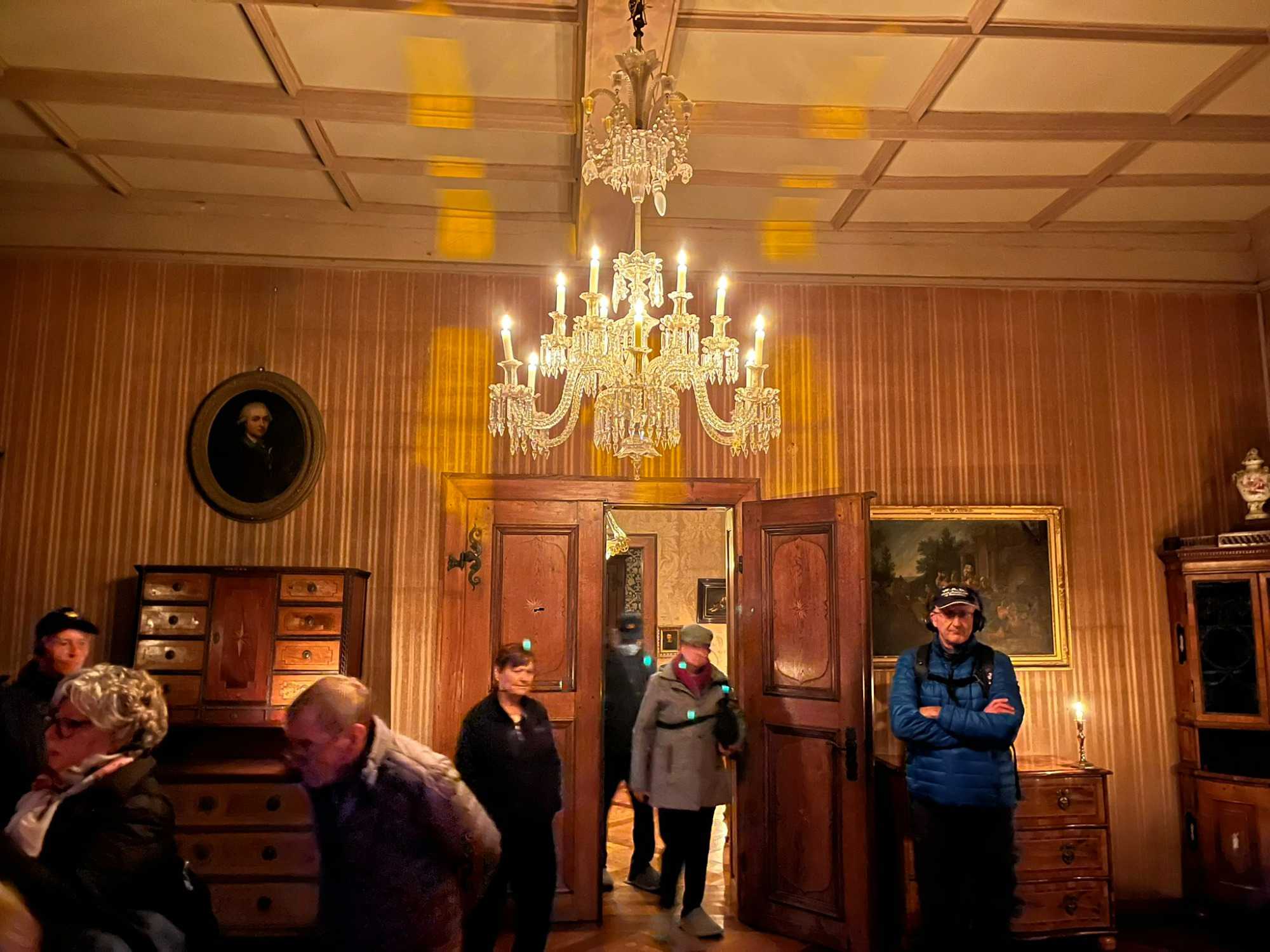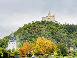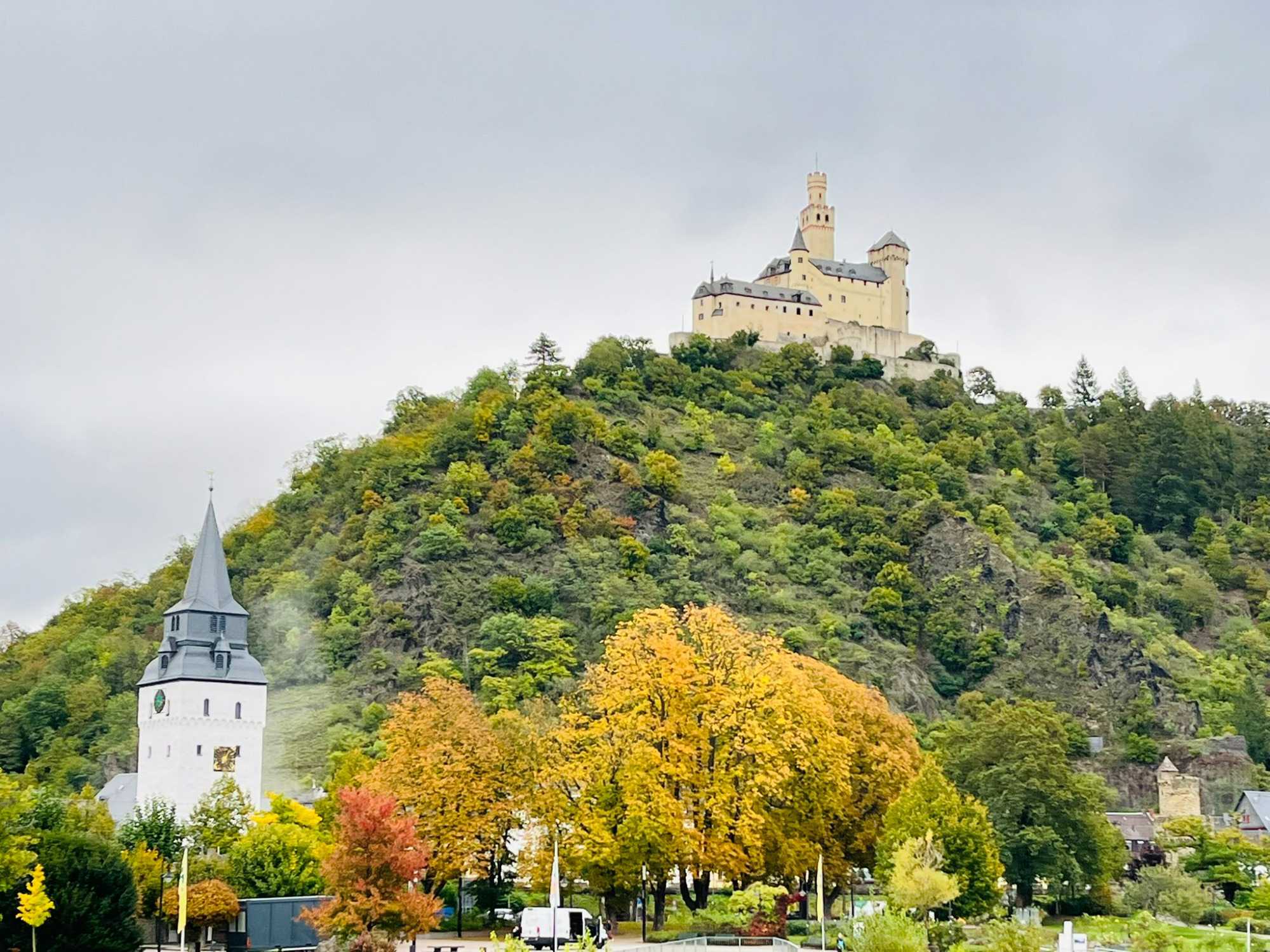 Aussitôt amarré au port de Lahnstein, nous prenons la route du château fort de Burg Lahneck, perché sur un promontoire rocheux, en compagnie de Claudia notre guide. Cette forteresse, construite en 1244 par l’archevêque de Mayence, visait à protéger la région et ses mines d’argent. Assiégée à de nombreuses reprises au 14e siècle, gravement endommagée durant la guerre de Trente Ans (1618-1648), elle est laissée en ruine en 1688 avant d’être restaurée dans un style néogothique anglais à partir de 1850. Depuis 1907, elle appartient à la famille Mischke. Notre visite guidée nous plonge dans l’histoire à travers mobilier d’époque, armes anciennes, armures et même une collection de maisons de poupées. La structure elle-même illustre magnifiquement l’architecture militaire médiévale avec son donjon, sa cour intérieure, ses escaliers en pierre et ses tours de guet. De profiter du tout éclairé à la chandelle, offre une tout autre perspective à contempler, bien que la qualité des photos, pour vous chers lecteurs en est quelque peu altérée.