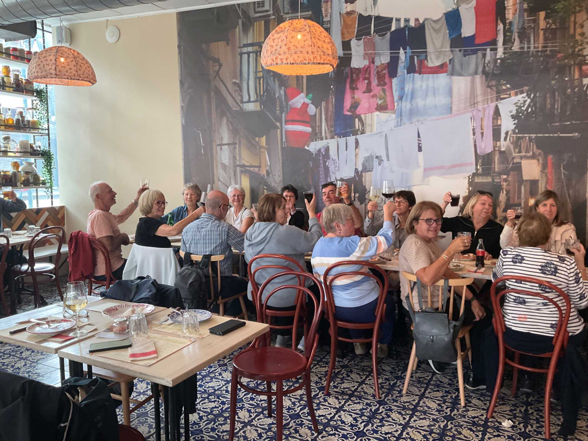 Ah, nos amis ont franchi la terre italienne à 10h05 comme prévu! Bien qu’il y ait eu le temps de passer la douane, de récupérer les valises, le guide et moi, fébriles, nous les attendions depuis plus d’une heure pour être certain de bien les accueillir.