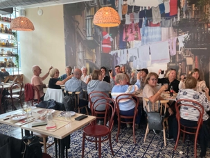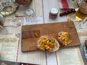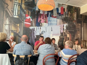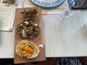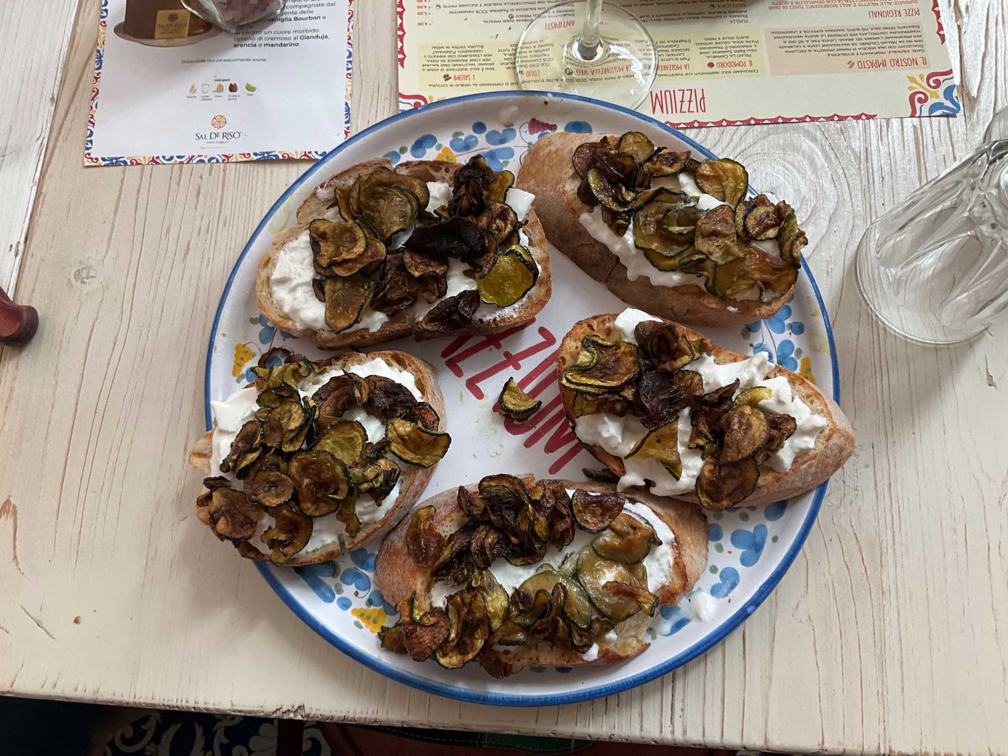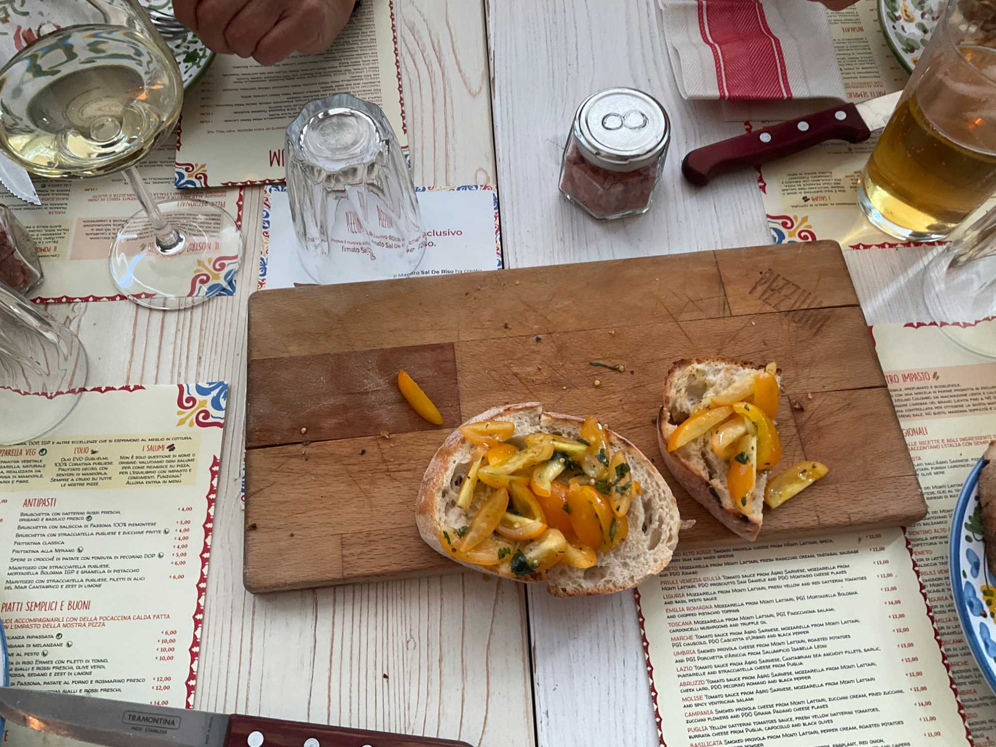 Le plat ou plutôt les plats: deux sortes de bruschetta différentes: aux courgettes puis une deuxième aux tomates jaunes, ça goutait le ciel…italien. Déjà, ces entrées nous rassasiaient, mait attention, ce n’est pas fini, venait juste après la pizza et ces italiens gourmets n’ont qu’un format pour tous…grand. On choisissait une pizza et son nom correspondait à la spécialité d’une région en Italie, plus d’une vingtaine nous étaient proposées. Hum, la vraie cuisine méditerranéenne. On tirera profit de certaines recettes du pays et même des régions pour enrichir nos menus italiens une fois de retourn à la maison. J’allais oublié le dessert et non le moindre, typique de l’Italie…un tiramisu, vous savez le dessert chocolaté et avec un parfum de café?