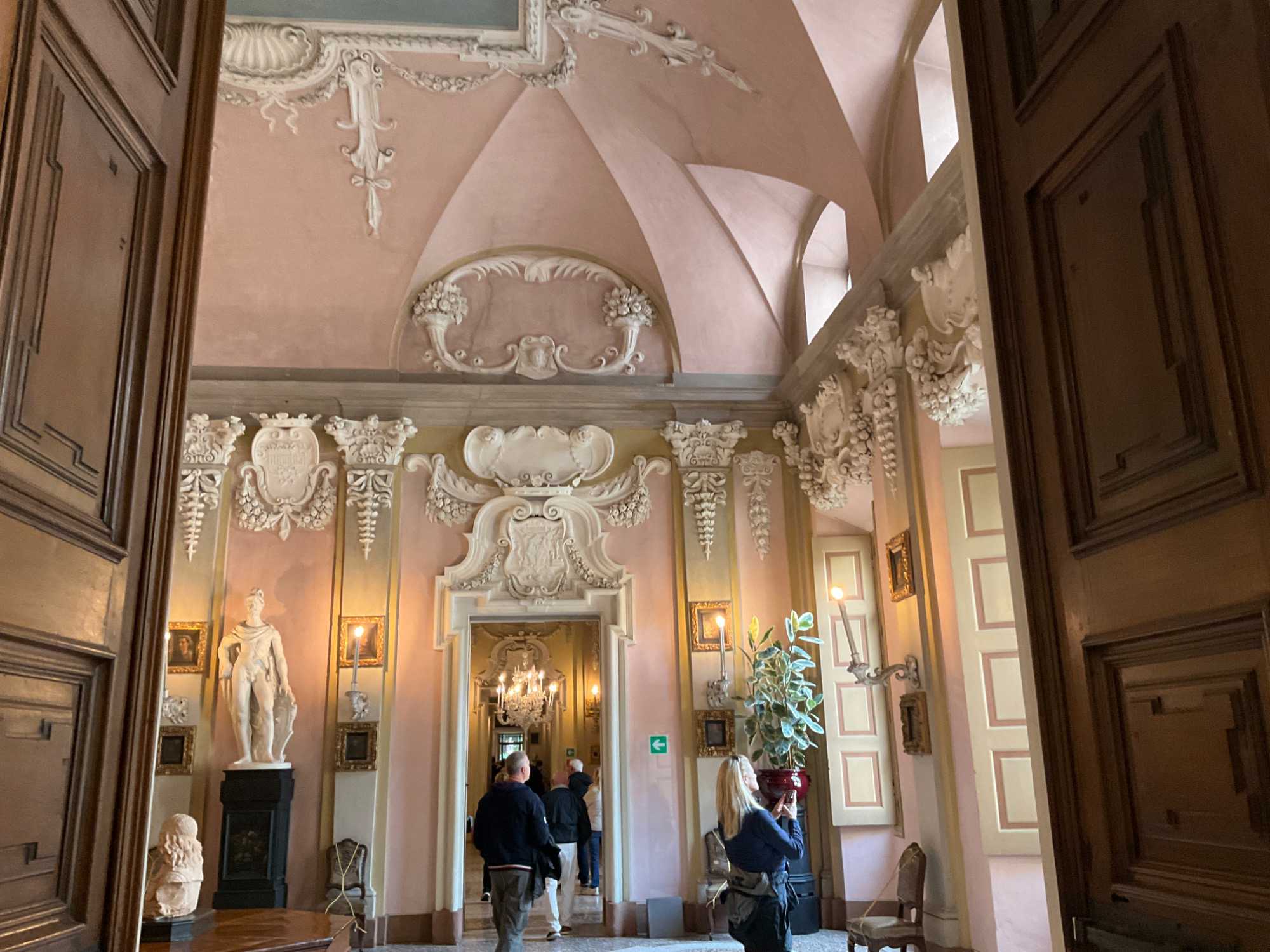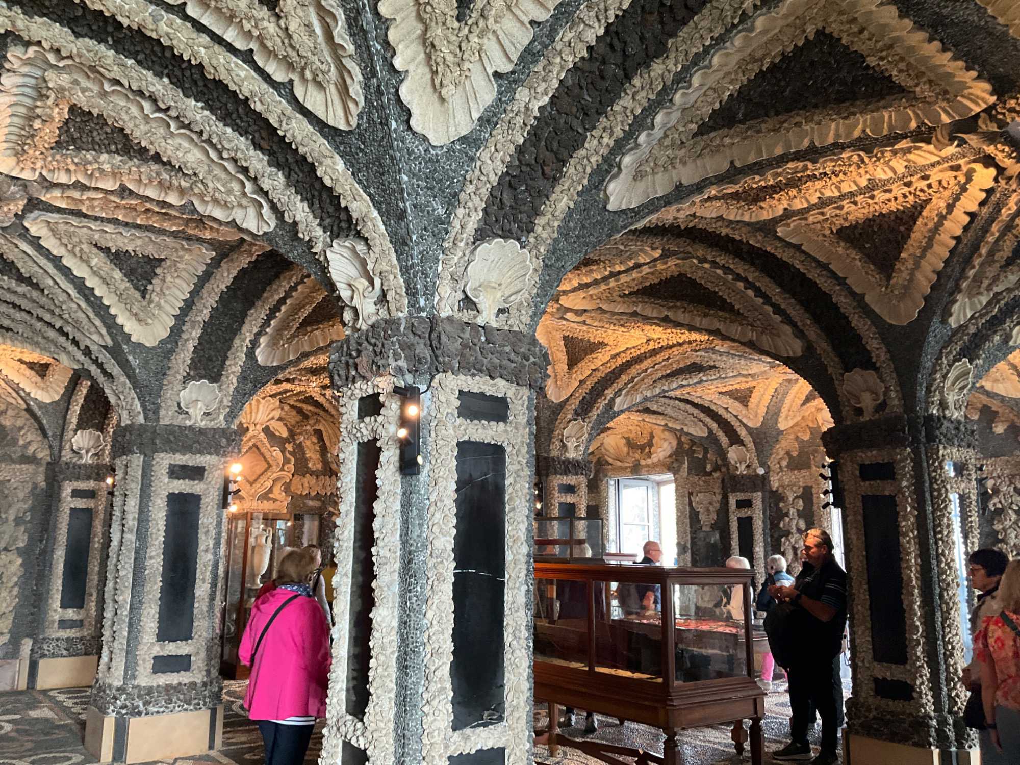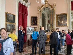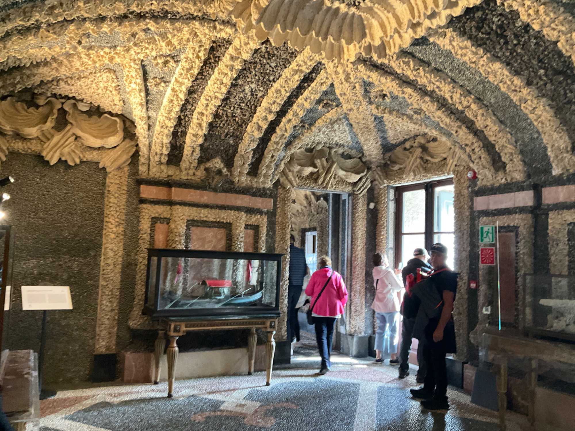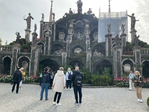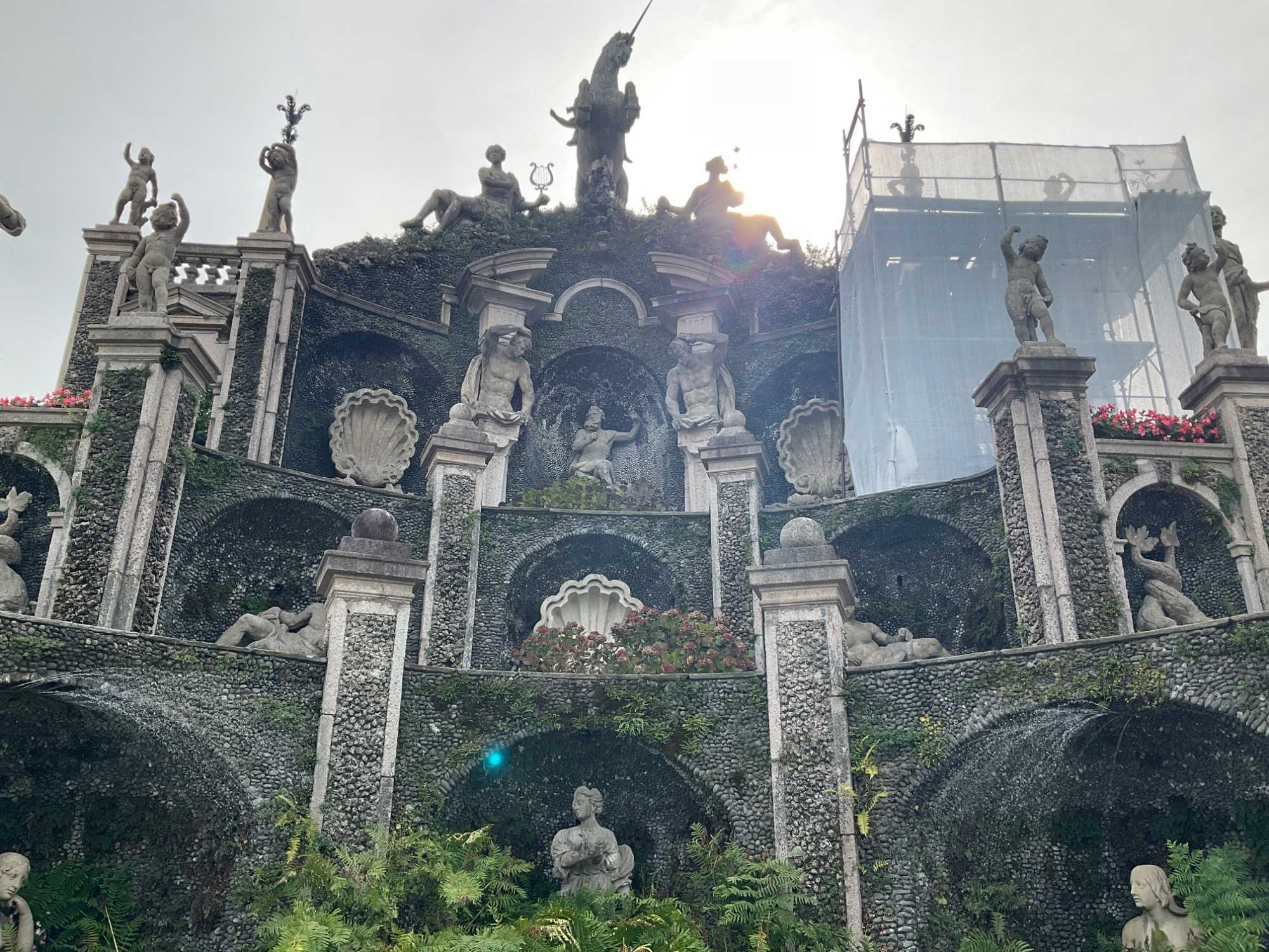 On débute par l’Île Bella située à seulement 400 mètres de Stresa et mesure …320 m de longueur sur 180 m de largeur. Nous avons droit à une visite guidée du château qu’on appelle ici "petit Versailles". Le guide du château est sympathique, bien informé et pince sans rire. L’île doit son nom à une femme bien sûr, celle du comte Carlo III de la Maison Borromeo, la bella Isabella (XVIIe siècle). Isola Bella était auparavant connue sous le nom d’isola inferiore ou isola di sotto (île inférieure ou île du bas) jusqu’en 1632. Comme sa voisine, on y trouvait un petit village de pêcheurs. Cette année-là, le comte Charles III Borromée (Carlo III Borromeo) commença la construction d’un palais baroque en l’honneur de sa femme Isabella d’Adda, la chanceuse! Les travaux, interrompus par une épidémie de peste, à chaque siècle sa pandémie, furent achevés par les fils de Charles vers 1652. On a visité de spacieuses salles ornées de belles peintures murales et de tableaux de maîtres, des dizaines et des dizaines de tableaux pour chacune des salles.On a vu des caves décorées de galets, la salle de Napoléon, les grottes et ses jardins avec la terrasse dites en amphithéâtre ou si vous préférez organisée sous une forme pyramidale en dix terrasses successives,37 m de hauteur, inaugurées en 1671.