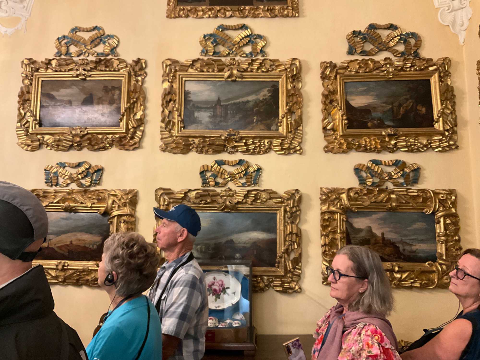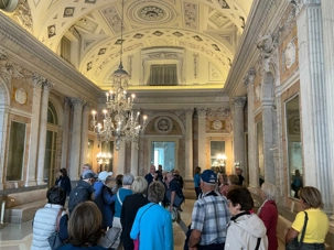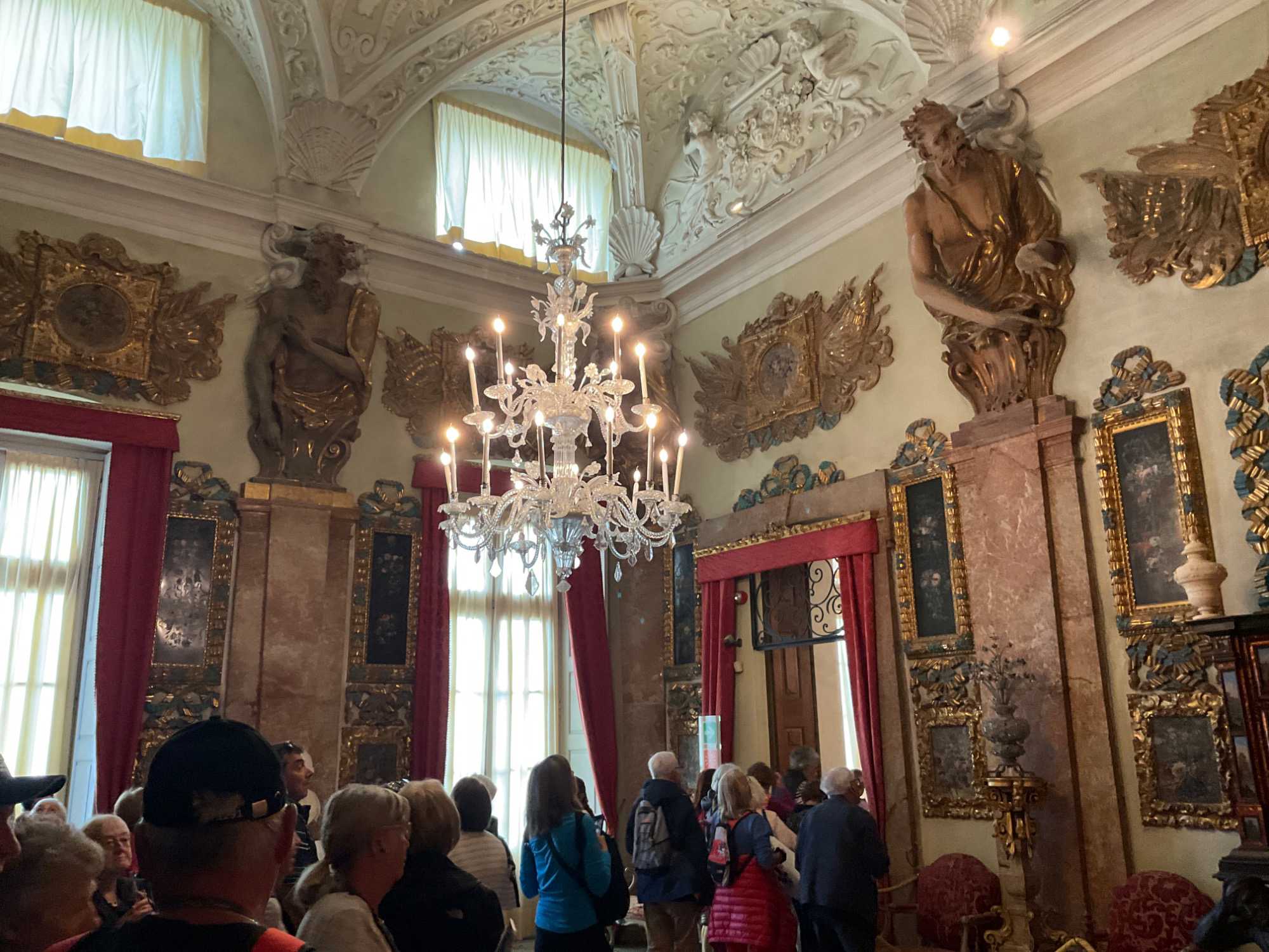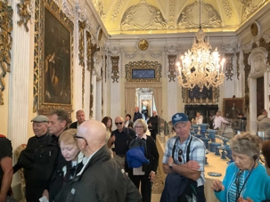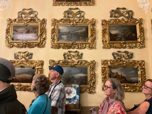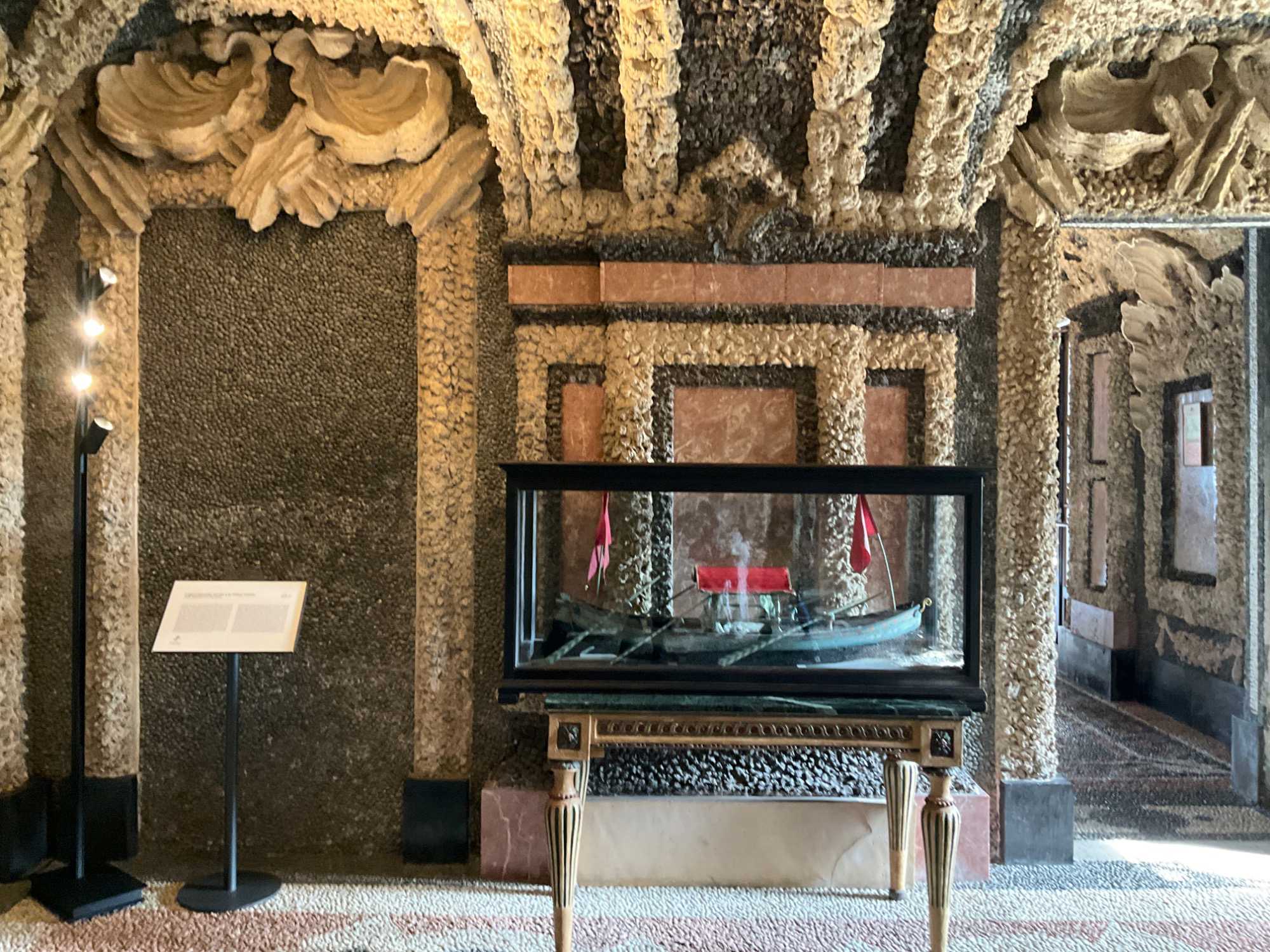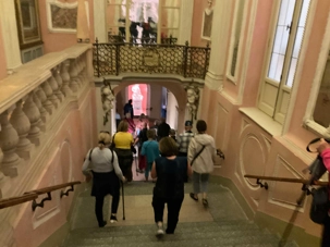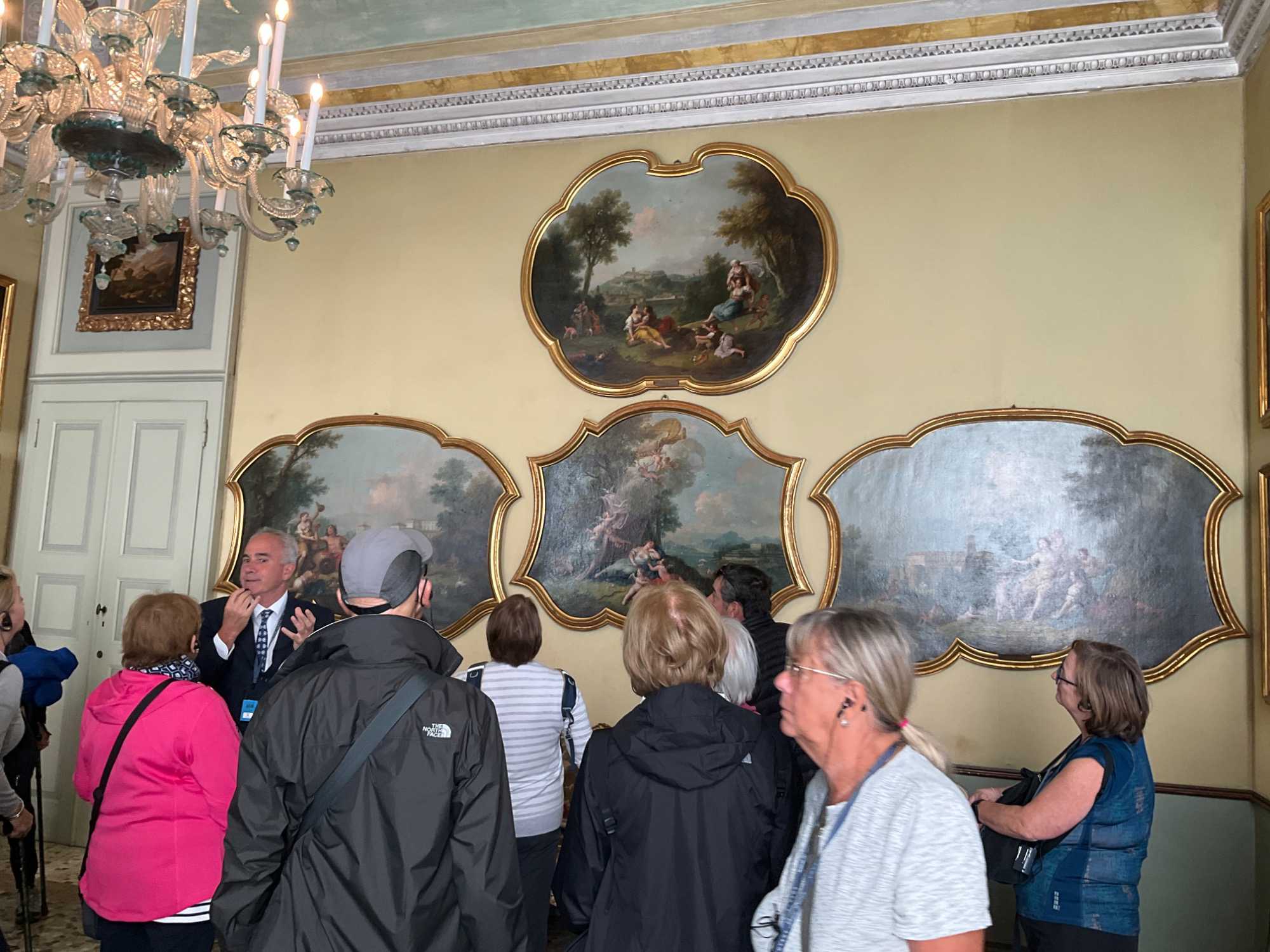 On débute par l’Île Bella située à seulement 400 mètres de Stresa et mesure …320 m de longueur sur 180 m de largeur. Nous avons droit à une visite guidée du château qu’on appelle ici "petit Versailles". Le guide du château est sympathique, bien informé et pince sans rire. L’île doit son nom à une femme bien sûr, celle du comte Carlo III de la Maison Borromeo, la bella Isabella (XVIIe siècle). Isola Bella était auparavant connue sous le nom d’isola inferiore ou isola di sotto (île inférieure ou île du bas) jusqu’en 1632. Comme sa voisine, on y trouvait un petit village de pêcheurs. Cette année-là, le comte Charles III Borromée (Carlo III Borromeo) commença la construction d’un palais baroque en l’honneur de sa femme Isabella d’Adda, la chanceuse! Les travaux, interrompus par une épidémie de peste, à chaque siècle sa pandémie, furent achevés par les fils de Charles vers 1652. On a visité de spacieuses salles ornées de belles peintures murales et de tableaux de maîtres, des dizaines et des dizaines de tableaux pour chacune des salles.On a vu des caves décorées de galets, la salle de Napoléon, les grottes et ses jardins avec la terrasse dites en amphithéâtre ou si vous préférez organisée sous une forme pyramidale en dix terrasses successives,37 m de hauteur, inaugurées en 1671.