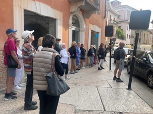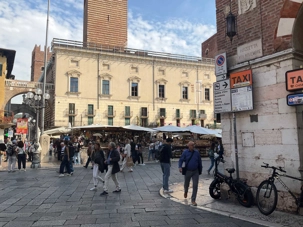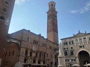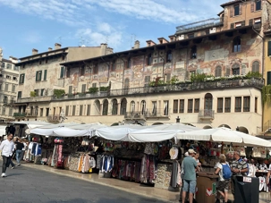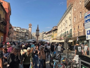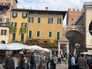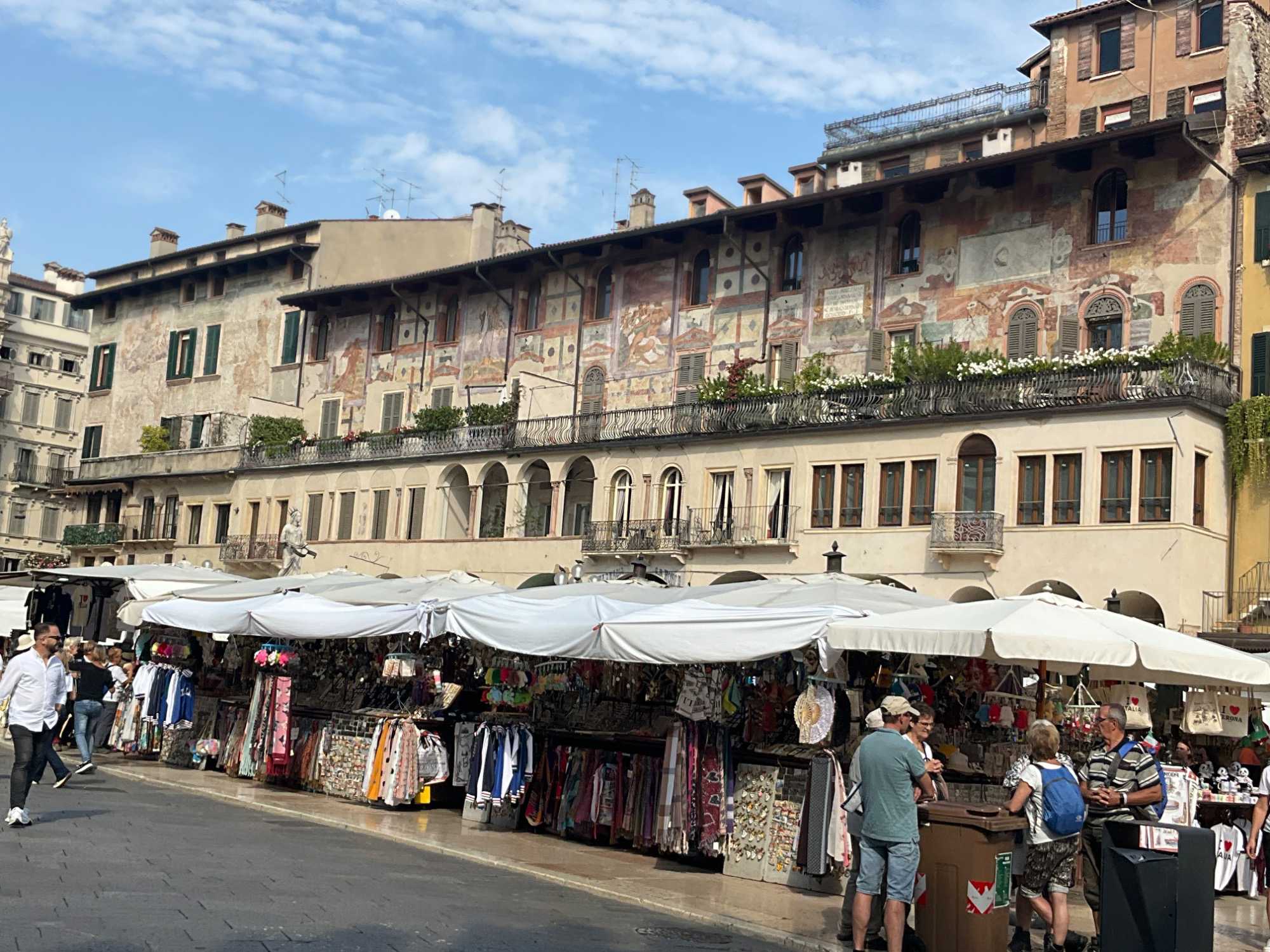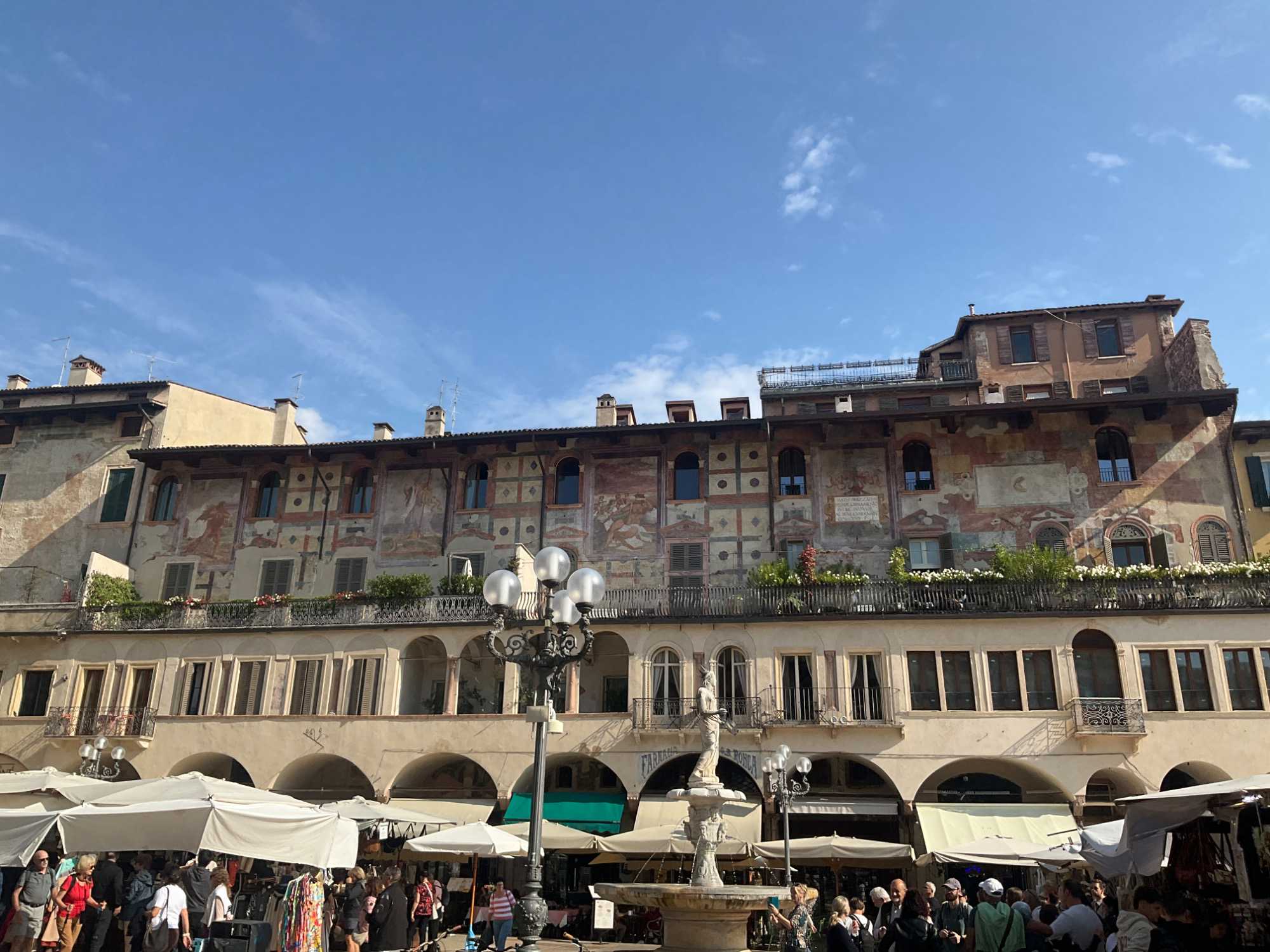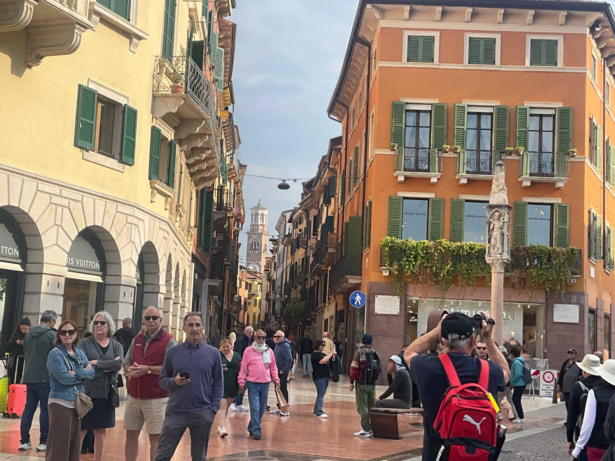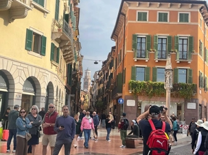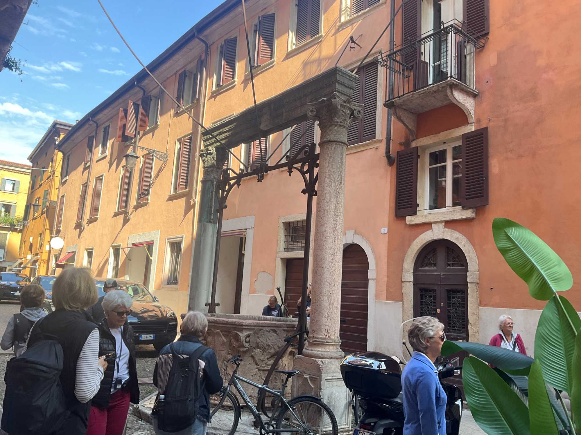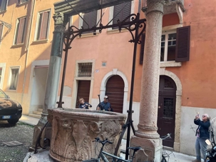 Et on a poursuivi notre « chasse romantique », à la magnifique Piazza Erbe, entourée de bâtiments médiévaux, qui abrite encore aujourd'hui un marché animé dont les voyageurs ont fouiné les kiosques. Au centre de la place romantique se trouvait… le Puits d'Amour, où dit-on, vos souhaits amoureux se réaliseront. J’ai cru apercevoir discrètement certains voyageurs exprimer des souhaits avec soin et détermination !