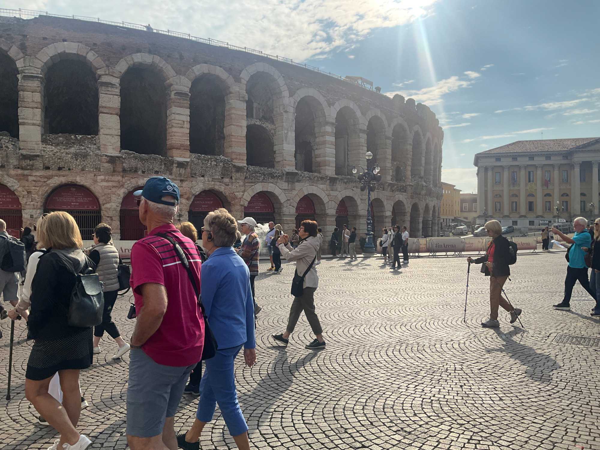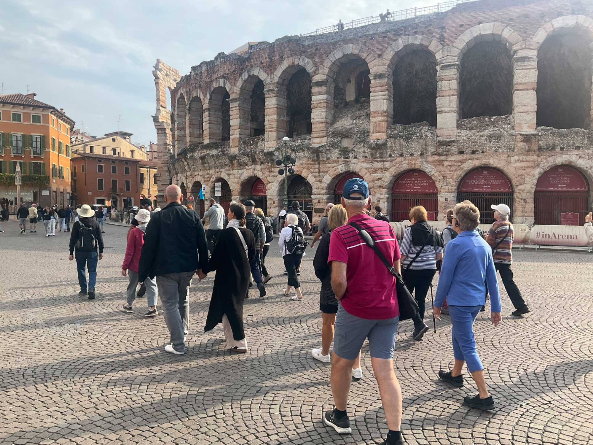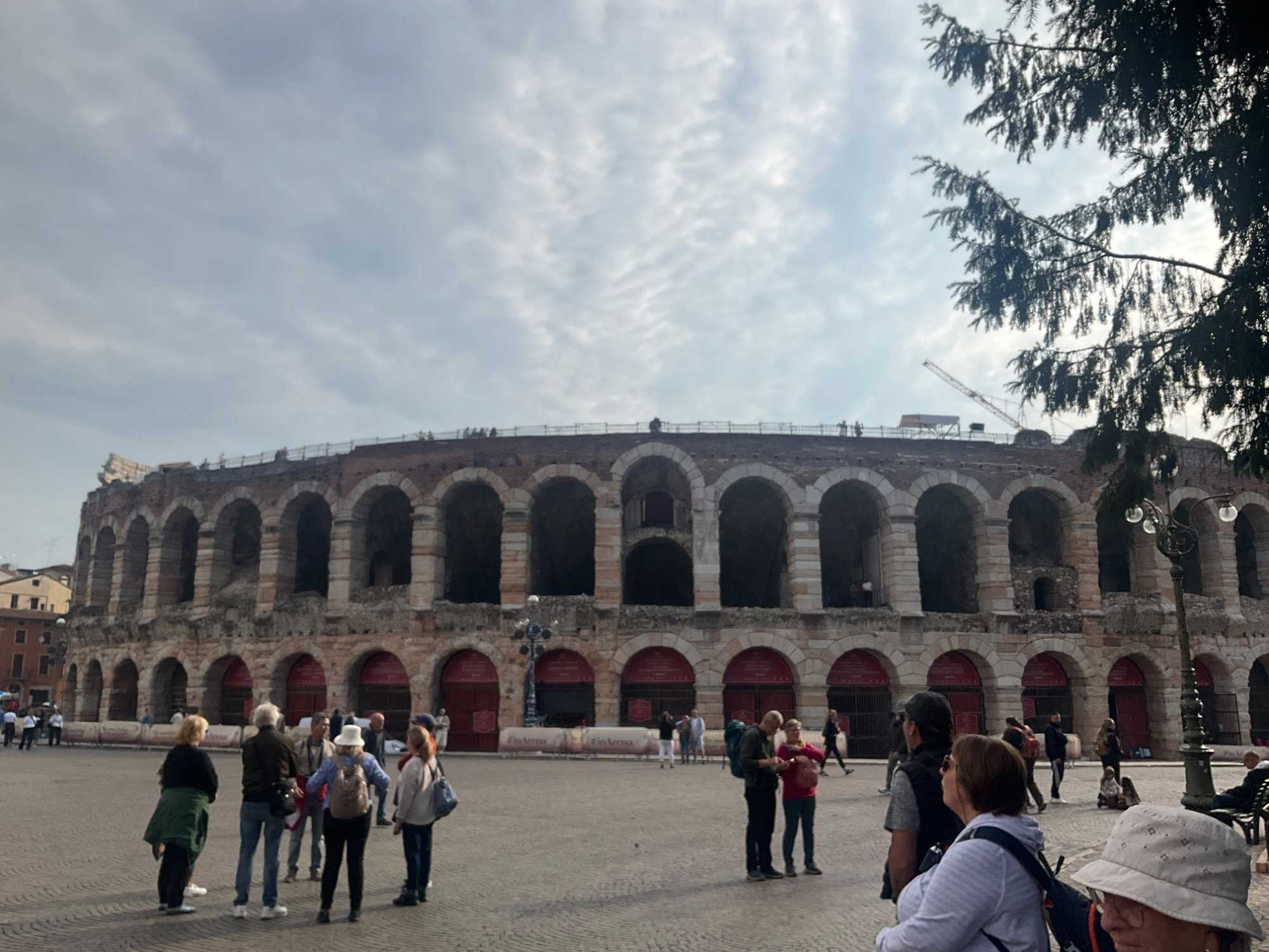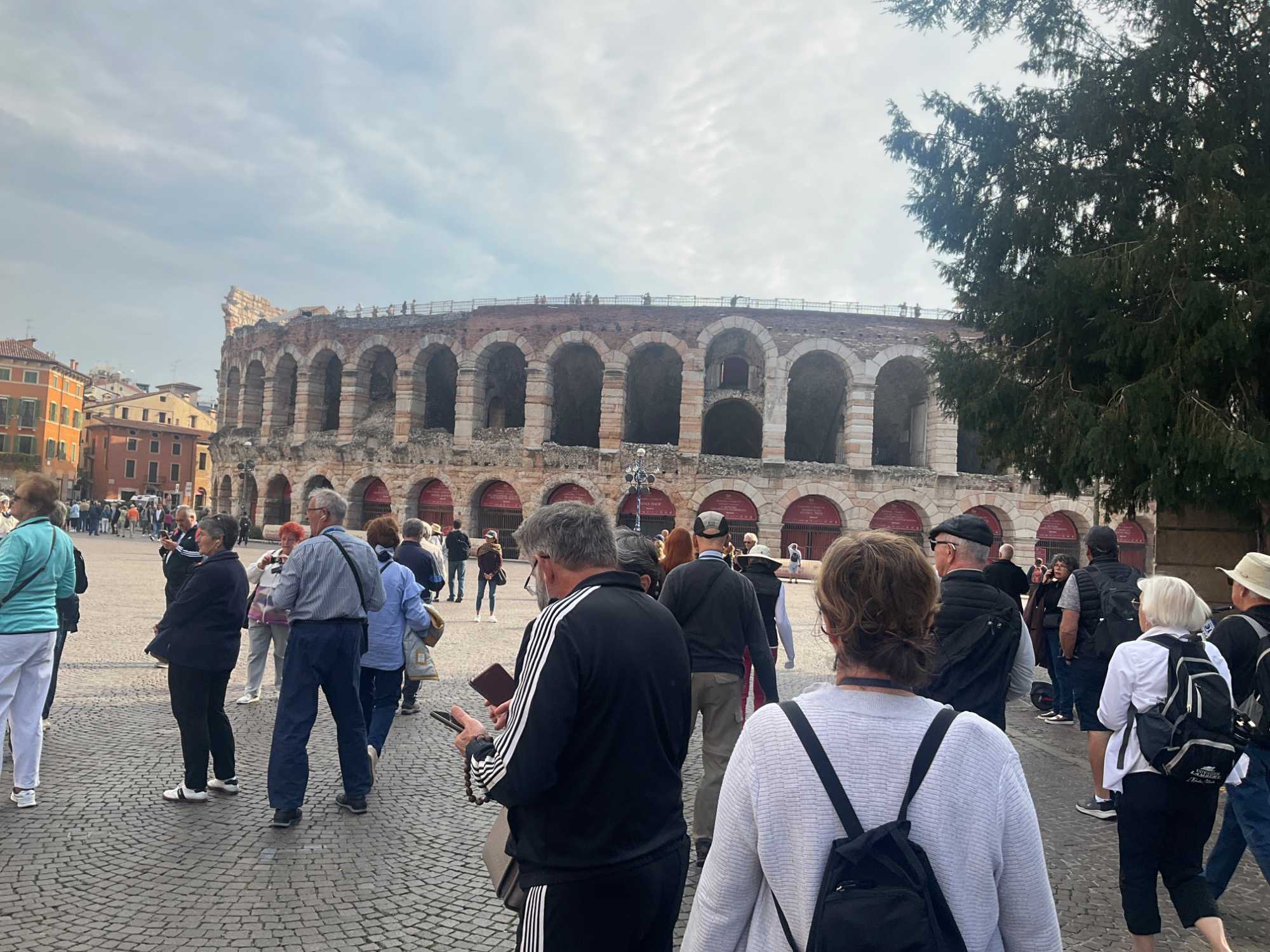 En poursuivant notre marche éducative, on distingue rapidement une structure nous rappelant le Colisée de Rome…de format légèrement plus petit: L'Arena, ou les arènes, de Verona, là en plein centre-ville. Cet amphithéâtre romain conservé intact depuis le 1er siècle avant JC, on y célèbre chaque année l'opéra universel : Puccini, Verdi, Rossini, Mascagni et bien d'autres grands compositeurs italiens dans le cadre du Festival de Vérone. Il y a quelques jours, le 30 septembre dernier, les arènes ont vibrés au son des plus grandes voix de l’opéra mondial à l’occasion d’un concert hommage exceptionnel célébrant les 90 ans de la naissance de Luciano Pavarotti décédé en 2007. Quelle ambiance cela devait être dans ce décor exceptionnel. Construites à une hauteur de 32 mètres, considéré comme le troisième amphithéâtre romain par ses dimensions (après Colisée de Rome et l’amphithéâtre de Capoue), il pouvait accueillir environ 30 000 spectateurs et est sûrement l'un des mieux conservés. Encore aujourd’hui, presque tous les soirs de avril à octobre environ, des spectacles ont lieu et ont pour thème les anciens combats de gladiateurs et, chaque année se déroulent les Wind Music Awards, un spectacle musical rediffusé en direct à la télévision avec des chanteurs italiens contemporains. L’arène se mettra « sur son 36 » pour accueillir la cérémonie de clôture des Jeux olympiques d'hiver et la cérémonie d'ouverture des Jeux paralympiques d'hiver de Milan-Cortina d'Ampezzo 2026. Vous penserez à nous lors de cet événement, nous, on sera fixé sur nos écrans en pensant « on était là »! Juste à côté, la Piazza Brà, la grande place de Vérone, réunit bon nombre de véronais et en fin de journée nous avons pu nous reposer dans ses jardins à l'italienne avec sa fontaine rafraîchissante et délicate.