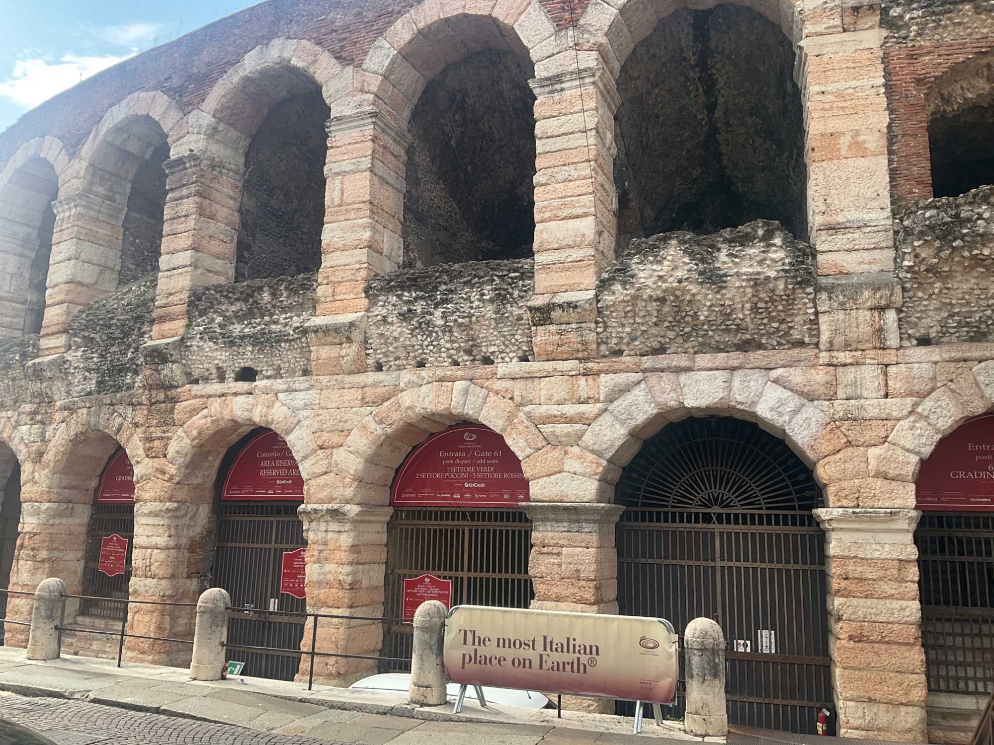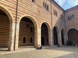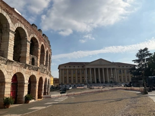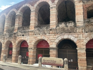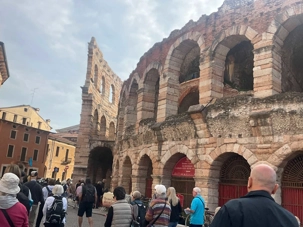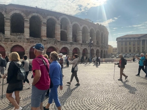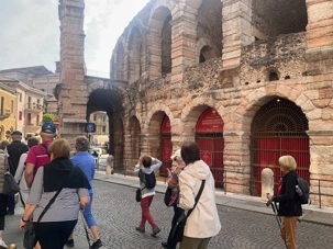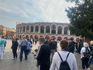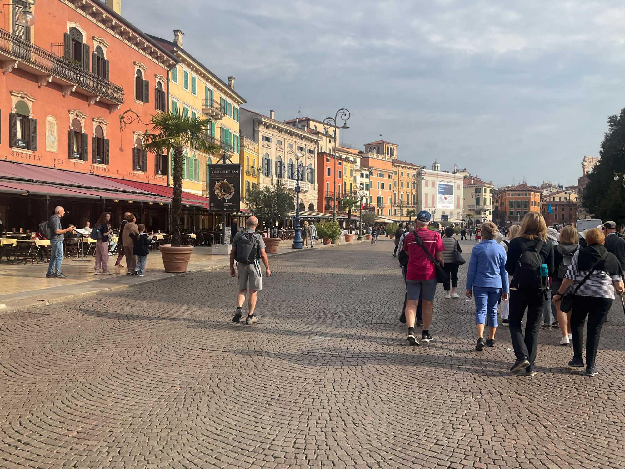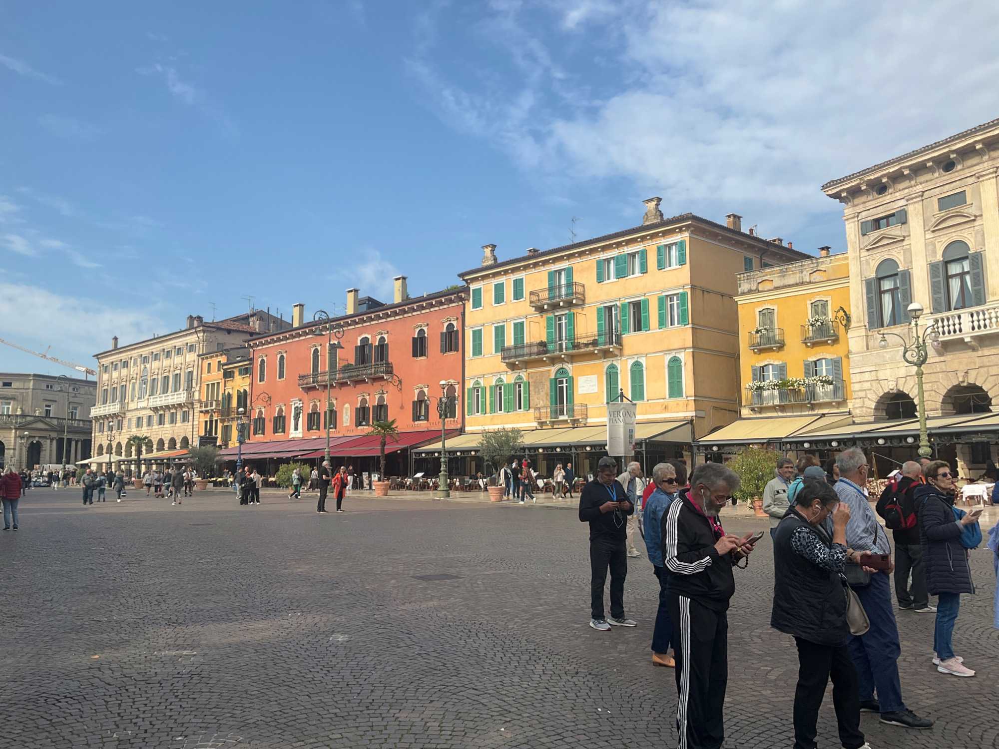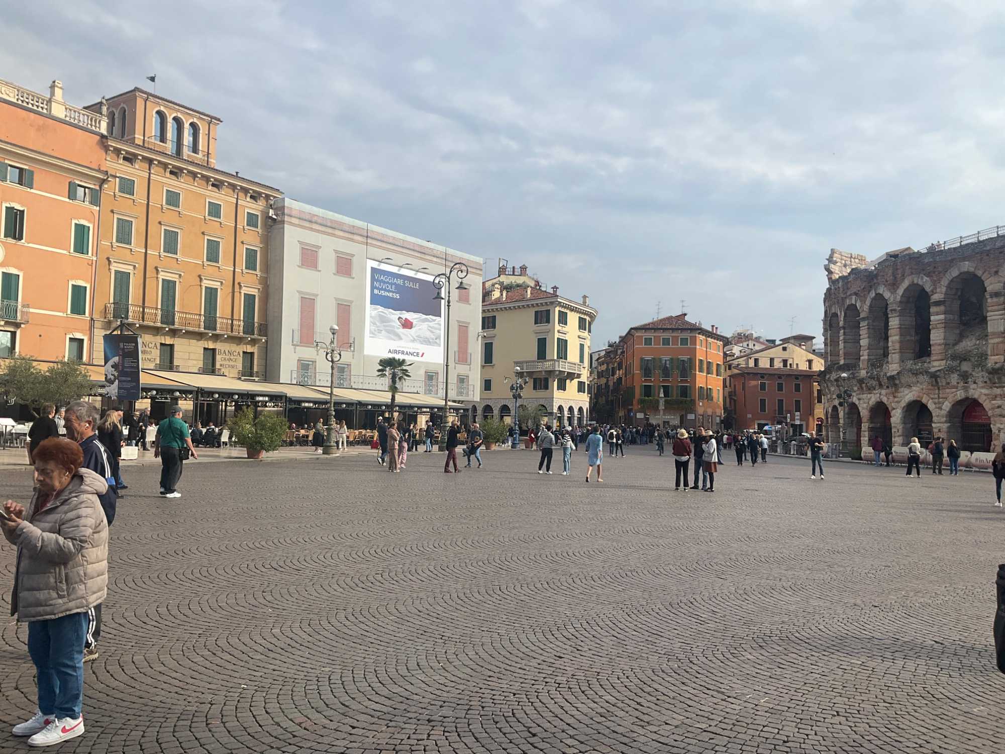 En poursuivant notre marche éducative, on distingue rapidement une structure nous rappelant le Colisée de Rome…de format légèrement plus petit: L'Arena, ou les arènes, de Verona, là en plein centre-ville. Cet amphithéâtre romain conservé intact depuis le 1er siècle avant JC, on y célèbre chaque année l'opéra universel : Puccini, Verdi, Rossini, Mascagni et bien d'autres grands compositeurs italiens dans le cadre du Festival de Vérone. Il y a quelques jours, le 30 septembre dernier, les arènes ont vibrés au son des plus grandes voix de l’opéra mondial à l’occasion d’un concert hommage exceptionnel célébrant les 90 ans de la naissance de Luciano Pavarotti décédé en 2007. Quelle ambiance cela devait être dans ce décor exceptionnel. Construites à une hauteur de 32 mètres, considéré comme le troisième amphithéâtre romain par ses dimensions (après Colisée de Rome et l’amphithéâtre de Capoue), il pouvait accueillir environ 30 000 spectateurs et est sûrement l'un des mieux conservés. Encore aujourd’hui, presque tous les soirs de avril à octobre environ, des spectacles ont lieu et ont pour thème les anciens combats de gladiateurs et, chaque année se déroulent les Wind Music Awards, un spectacle musical rediffusé en direct à la télévision avec des chanteurs italiens contemporains. L’arène se mettra « sur son 36 » pour accueillir la cérémonie de clôture des Jeux olympiques d'hiver et la cérémonie d'ouverture des Jeux paralympiques d'hiver de Milan-Cortina d'Ampezzo 2026. Vous penserez à nous lors de cet événement, nous, on sera fixé sur nos écrans en pensant « on était là »! Juste à côté, la Piazza Brà, la grande place de Vérone, réunit bon nombre de véronais et en fin de journée nous avons pu nous reposer dans ses jardins à l'italienne avec sa fontaine rafraîchissante et délicate.