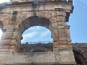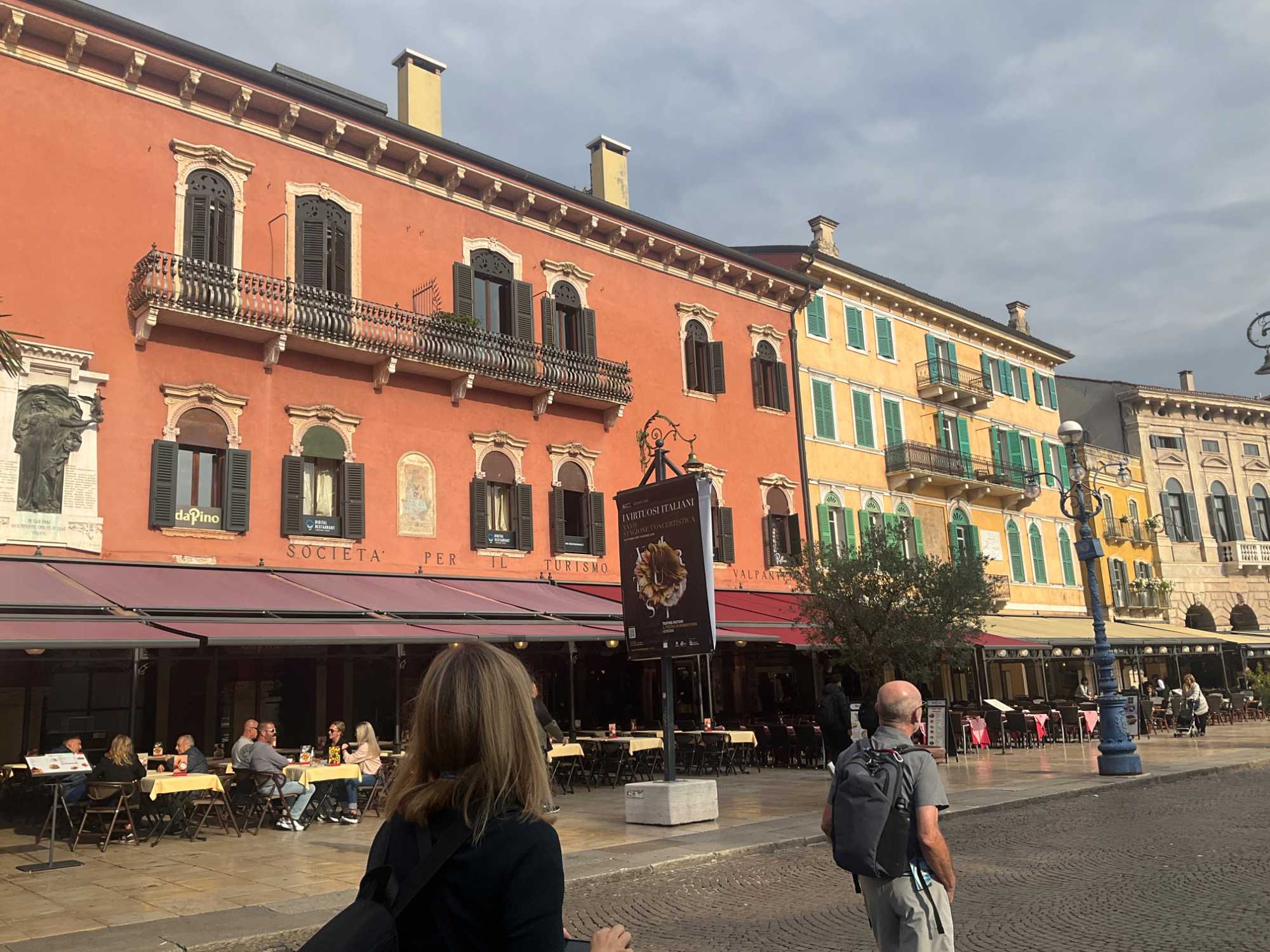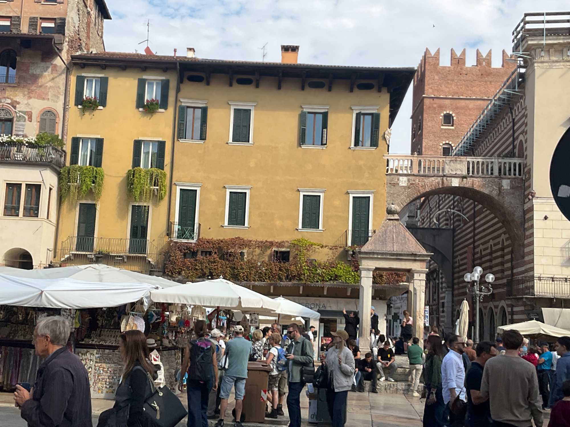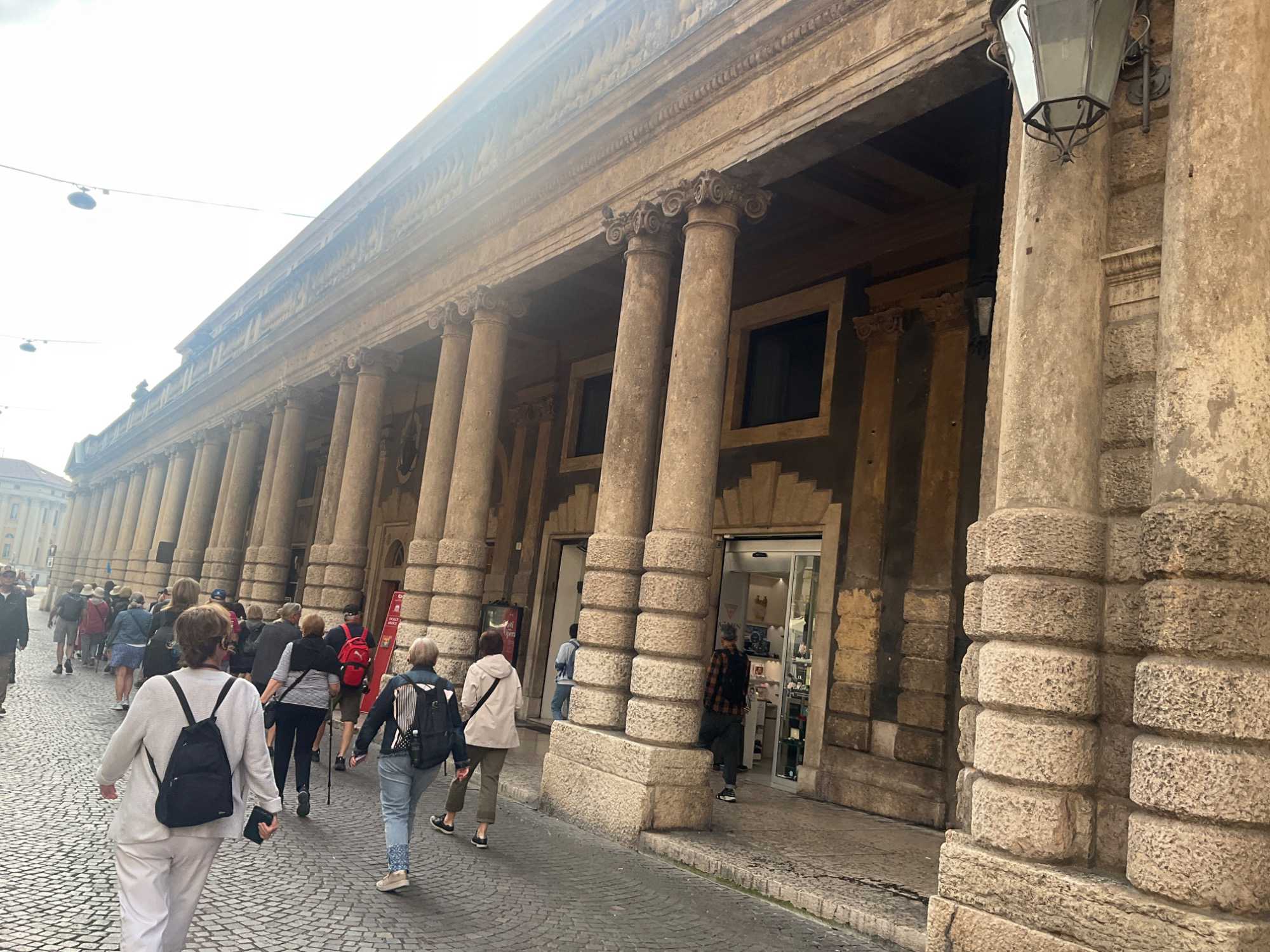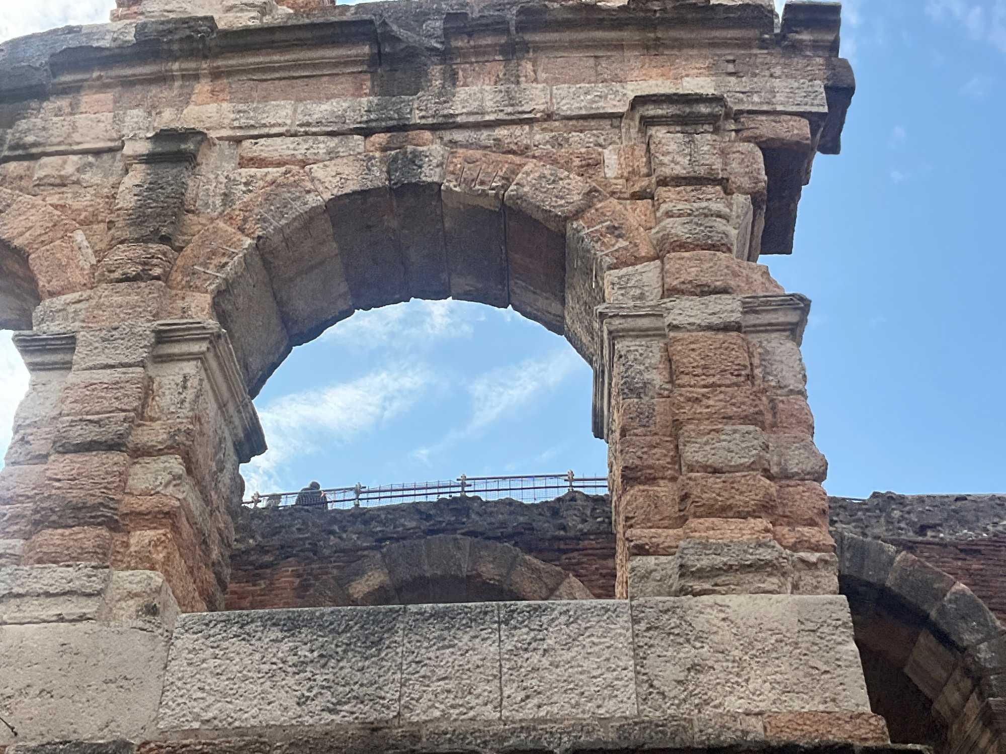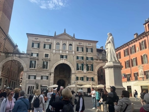 En poursuivant notre marche éducative, on distingue rapidement une structure nous rappelant le Colisée de Rome…de format légèrement plus petit: L'Arena, ou les arènes, de Verona, là en plein centre-ville. Cet amphithéâtre romain conservé intact depuis le 1er siècle avant JC, on y célèbre chaque année l'opéra universel : Puccini, Verdi, Rossini, Mascagni et bien d'autres grands compositeurs italiens dans le cadre du Festival de Vérone. Il y a quelques jours, le 30 septembre dernier, les arènes ont vibrés au son des plus grandes voix de l’opéra mondial à l’occasion d’un concert hommage exceptionnel célébrant les 90 ans de la naissance de Luciano Pavarotti décédé en 2007. Quelle ambiance cela devait être dans ce décor exceptionnel. Construites à une hauteur de 32 mètres, considéré comme le troisième amphithéâtre romain par ses dimensions (après Colisée de Rome et l’amphithéâtre de Capoue), il pouvait accueillir environ 30 000 spectateurs et est sûrement l'un des mieux conservés. Encore aujourd’hui, presque tous les soirs de avril à octobre environ, des spectacles ont lieu et ont pour thème les anciens combats de gladiateurs et, chaque année se déroulent les Wind Music Awards, un spectacle musical rediffusé en direct à la télévision avec des chanteurs italiens contemporains. L’arène se mettra « sur son 36 » pour accueillir la cérémonie de clôture des Jeux olympiques d'hiver et la cérémonie d'ouverture des Jeux paralympiques d'hiver de Milan-Cortina d'Ampezzo 2026. Vous penserez à nous lors de cet événement, nous, on sera fixé sur nos écrans en pensant « on était là »! Juste à côté, la Piazza Brà, la grande place de Vérone, réunit bon nombre de véronais et en fin de journée nous avons pu nous reposer dans ses jardins à l'italienne avec sa fontaine rafraîchissante et délicate.