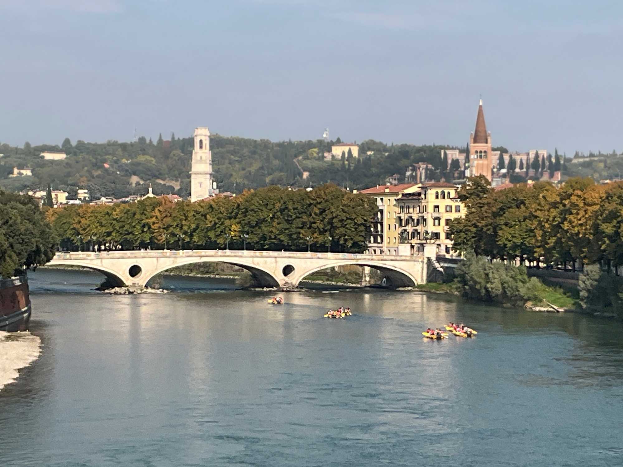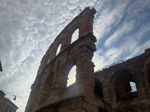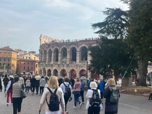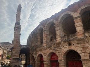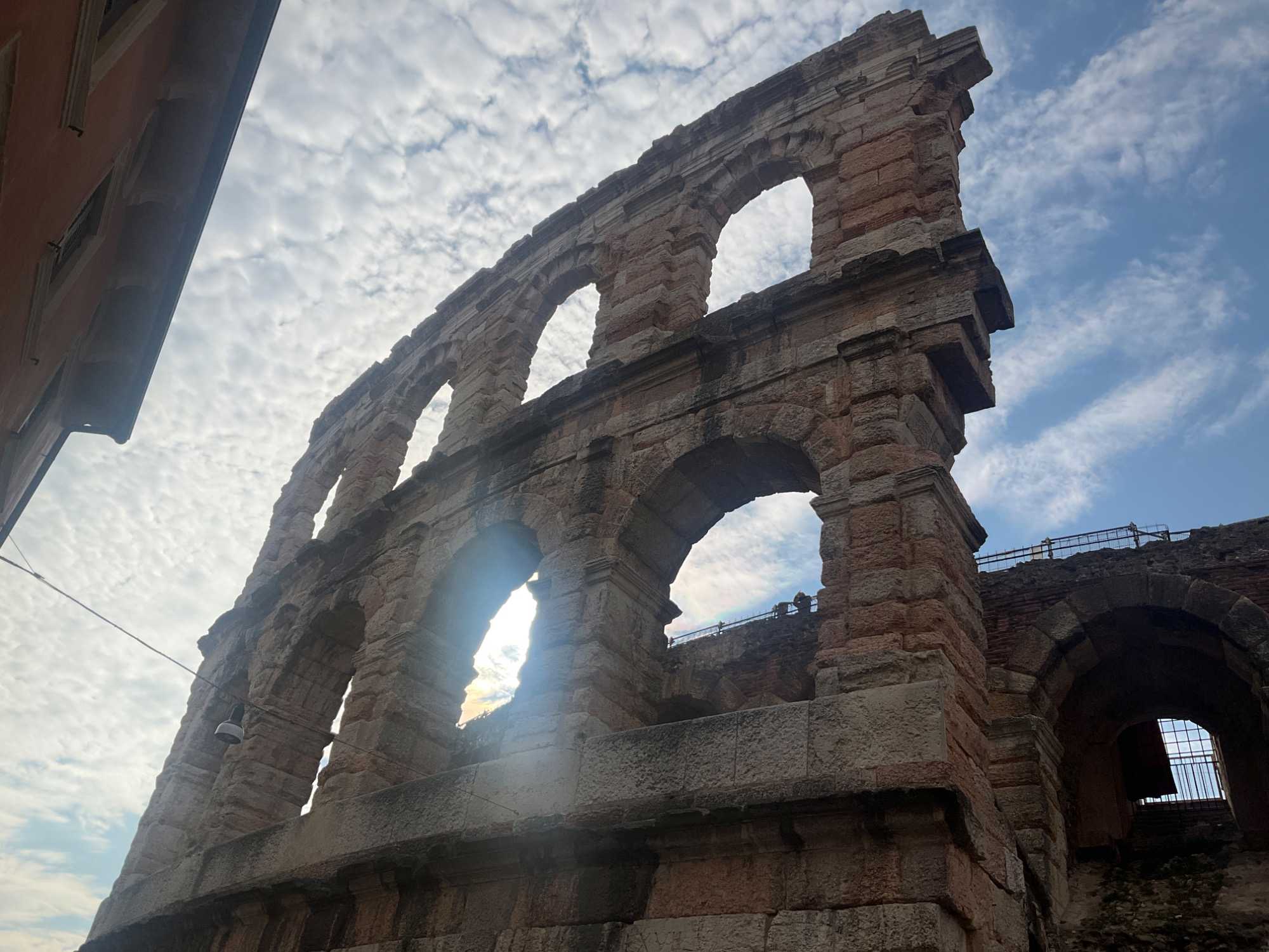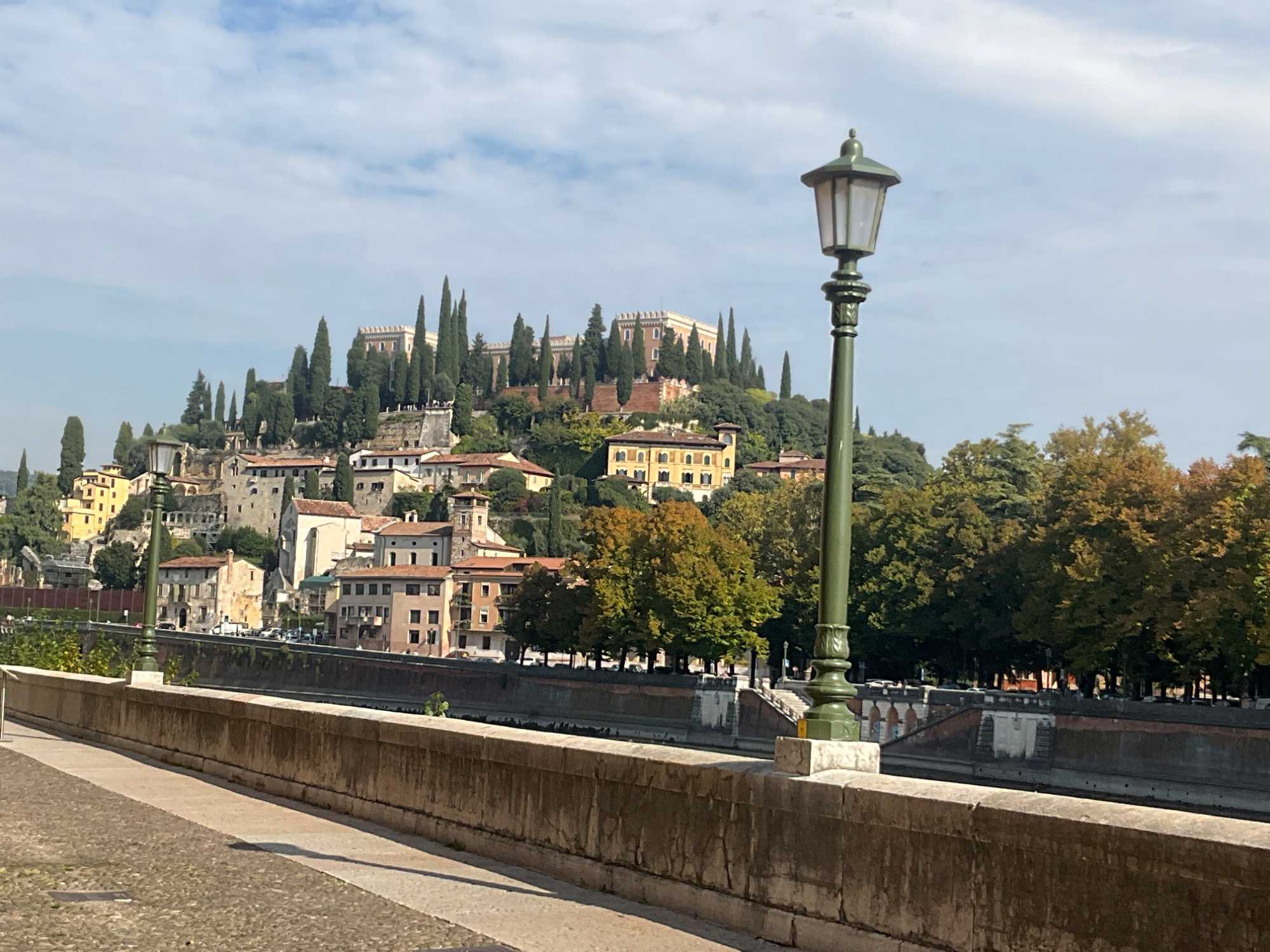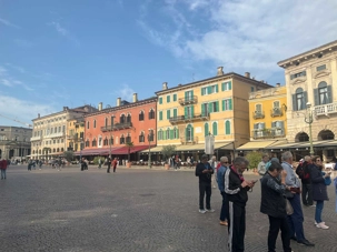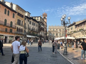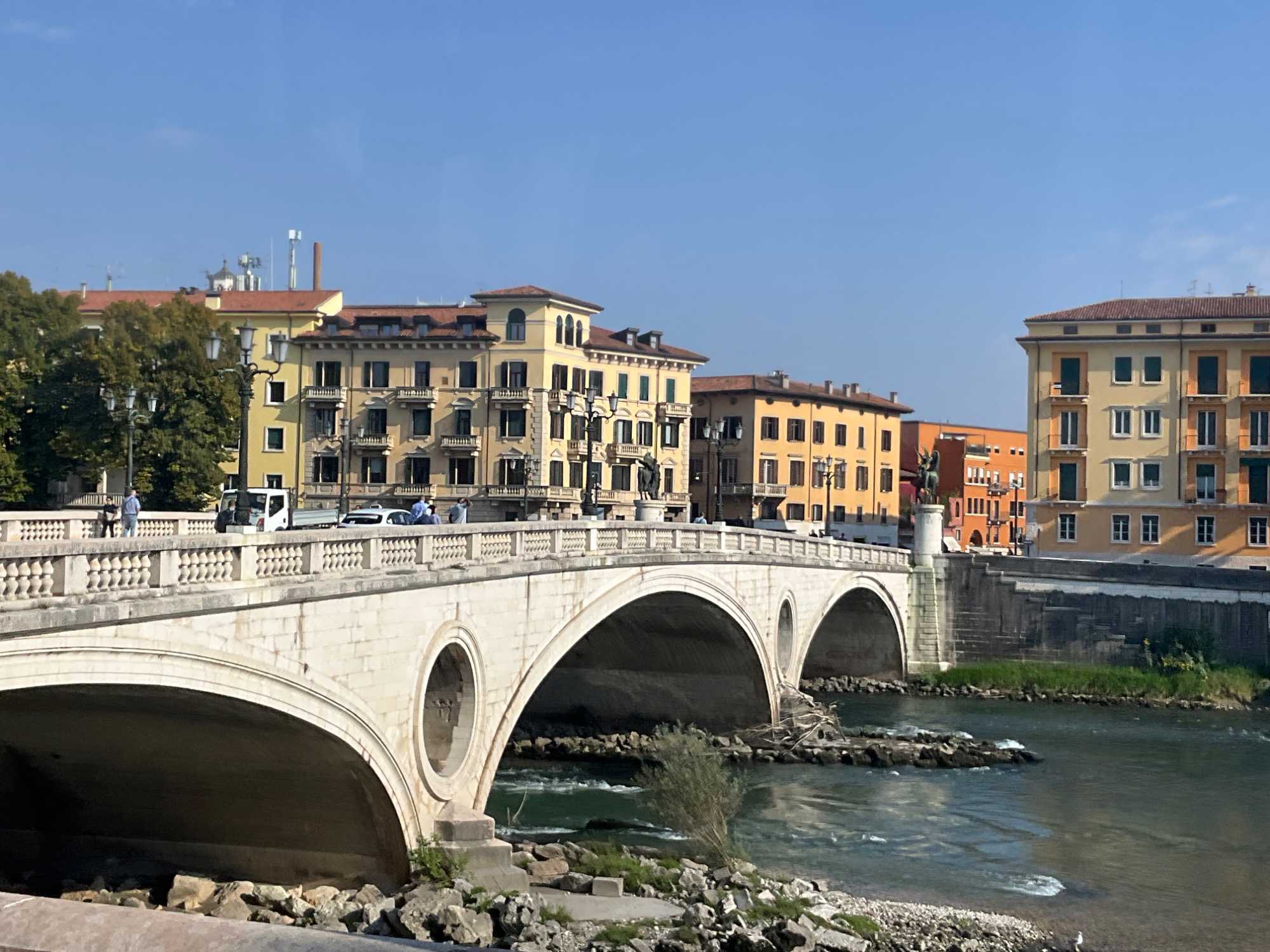 En poursuivant notre marche éducative, on distingue rapidement une structure nous rappelant le Colisée de Rome…de format légèrement plus petit: L'Arena, ou les arènes, de Verona, là en plein centre-ville. Cet amphithéâtre romain conservé intact depuis le 1er siècle avant JC, on y célèbre chaque année l'opéra universel : Puccini, Verdi, Rossini, Mascagni et bien d'autres grands compositeurs italiens dans le cadre du Festival de Vérone. Il y a quelques jours, le 30 septembre dernier, les arènes ont vibrés au son des plus grandes voix de l’opéra mondial à l’occasion d’un concert hommage exceptionnel célébrant les 90 ans de la naissance de Luciano Pavarotti décédé en 2007. Quelle ambiance cela devait être dans ce décor exceptionnel. Construites à une hauteur de 32 mètres, considéré comme le troisième amphithéâtre romain par ses dimensions (après Colisée de Rome et l’amphithéâtre de Capoue), il pouvait accueillir environ 30 000 spectateurs et est sûrement l'un des mieux conservés. Encore aujourd’hui, presque tous les soirs de avril à octobre environ, des spectacles ont lieu et ont pour thème les anciens combats de gladiateurs et, chaque année se déroulent les Wind Music Awards, un spectacle musical rediffusé en direct à la télévision avec des chanteurs italiens contemporains. L’arène se mettra « sur son 36 » pour accueillir la cérémonie de clôture des Jeux olympiques d'hiver et la cérémonie d'ouverture des Jeux paralympiques d'hiver de Milan-Cortina d'Ampezzo 2026. Vous penserez à nous lors de cet événement, nous, on sera fixé sur nos écrans en pensant « on était là »! Juste à côté, la Piazza Brà, la grande place de Vérone, réunit bon nombre de véronais et en fin de journée nous avons pu nous reposer dans ses jardins à l'italienne avec sa fontaine rafraîchissante et délicate.