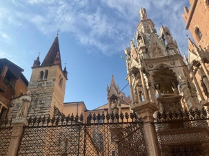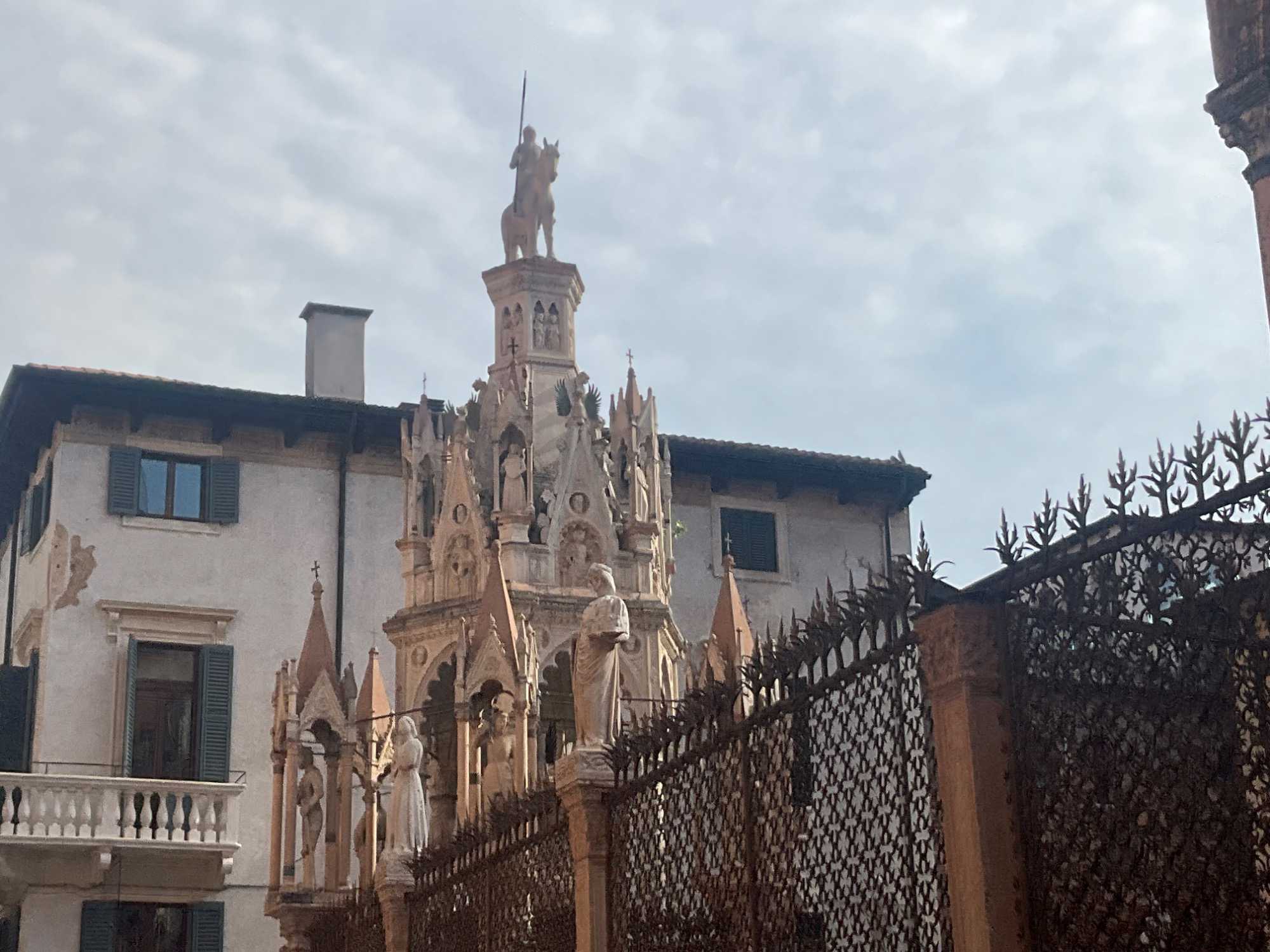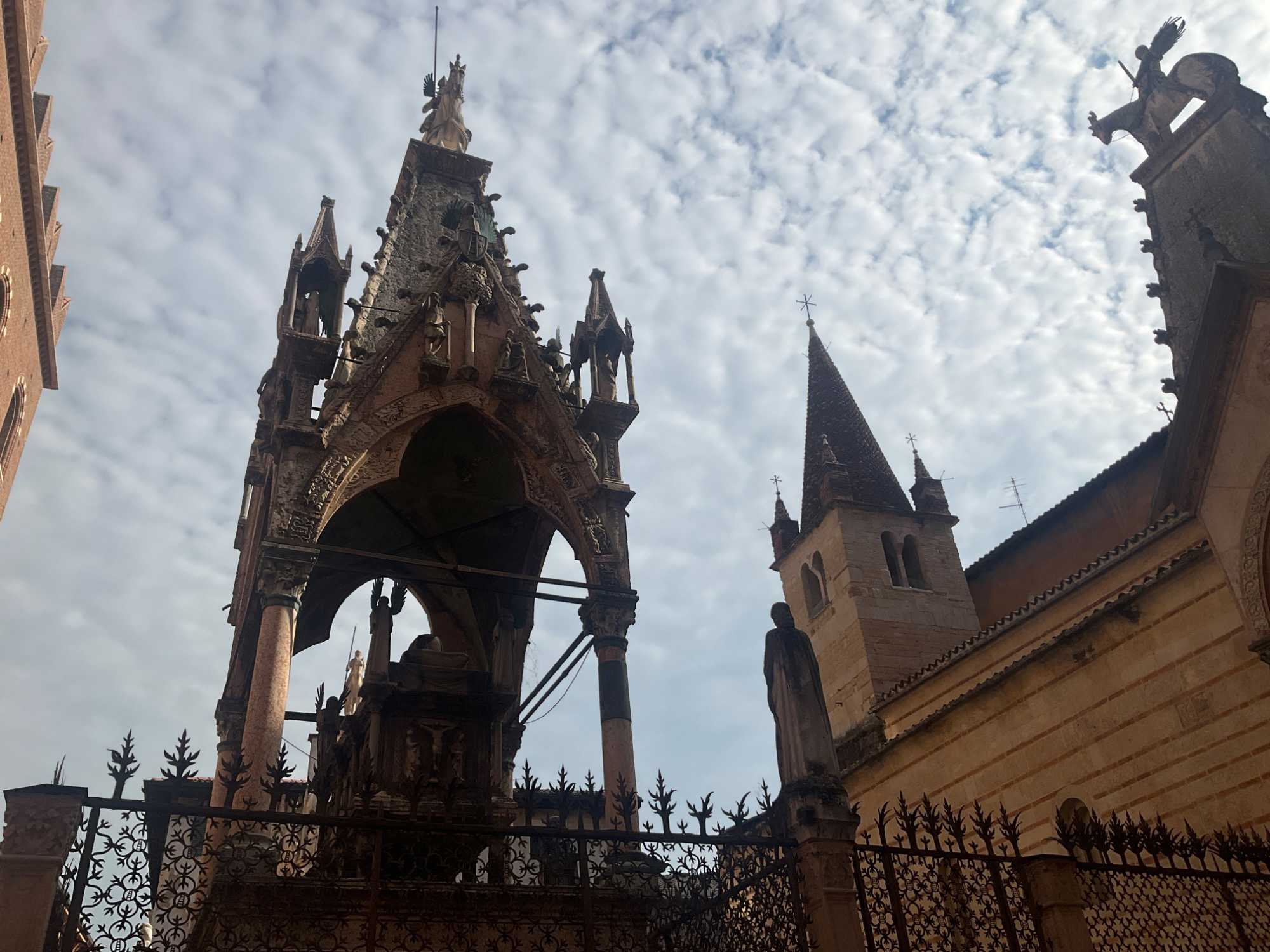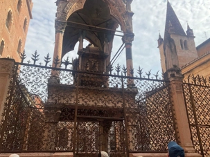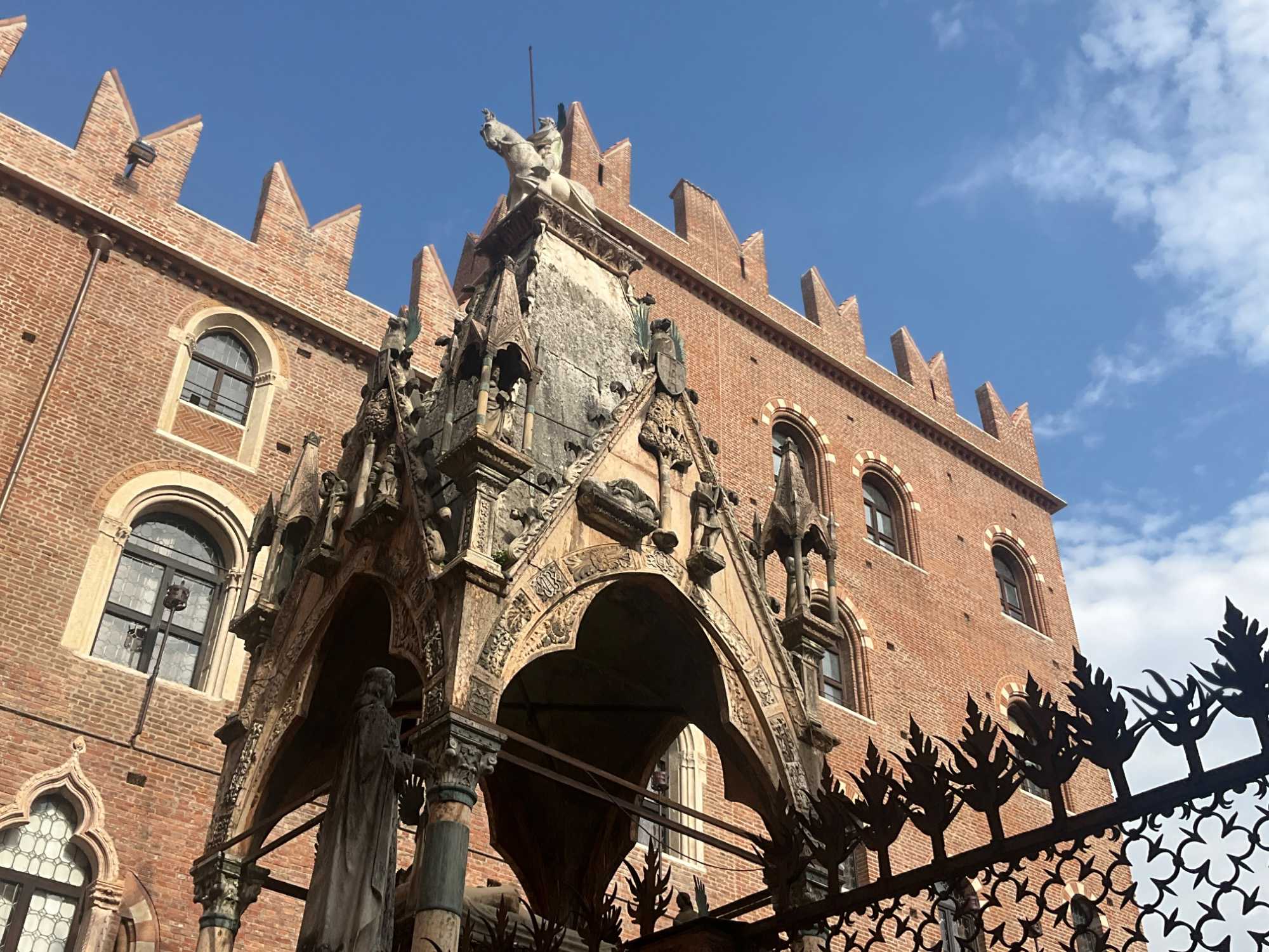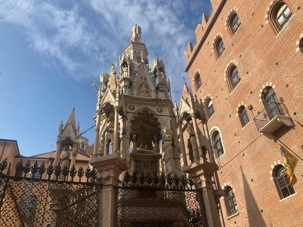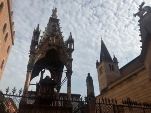 Poursuivant notre balade véronaise, Sarah nous a identifié Les Arches Scaliger, ces tombeaux monumentaux qui ont été élevés en l’honneur de la famille Scaligeri, les seigneurs de Vérone. Ils consistent en une série de cinq monuments funéraires gothiques trouvés à l'extérieur de l'église Santa Maria Antica de Vérone. Ils datent du 14ème siècle. Leur décoration élaborée nous a impressionnés mais surtout le positionnement de ces tombesux à plusieurs mètres du sol.