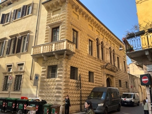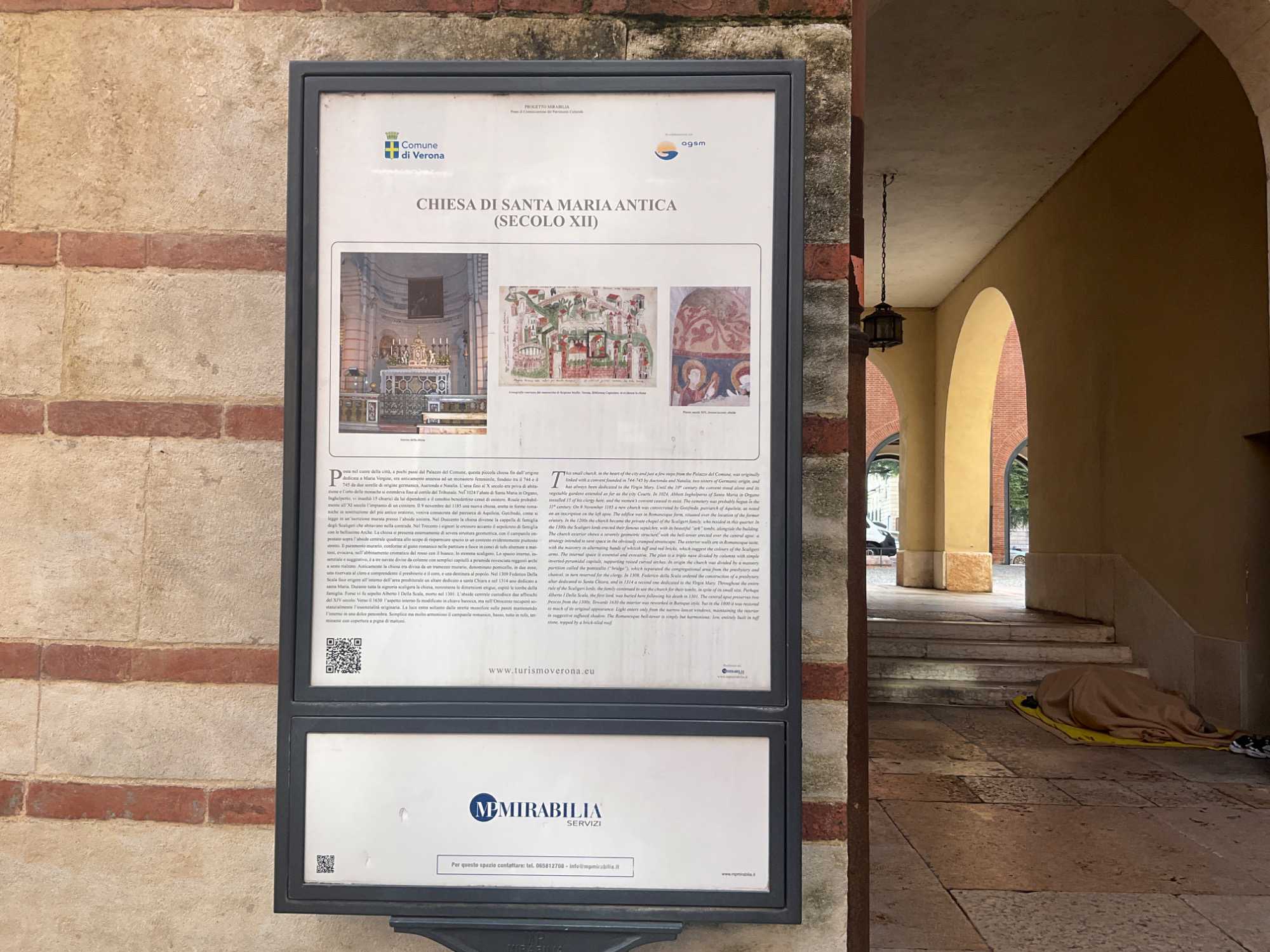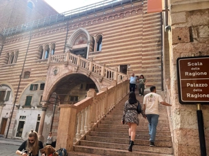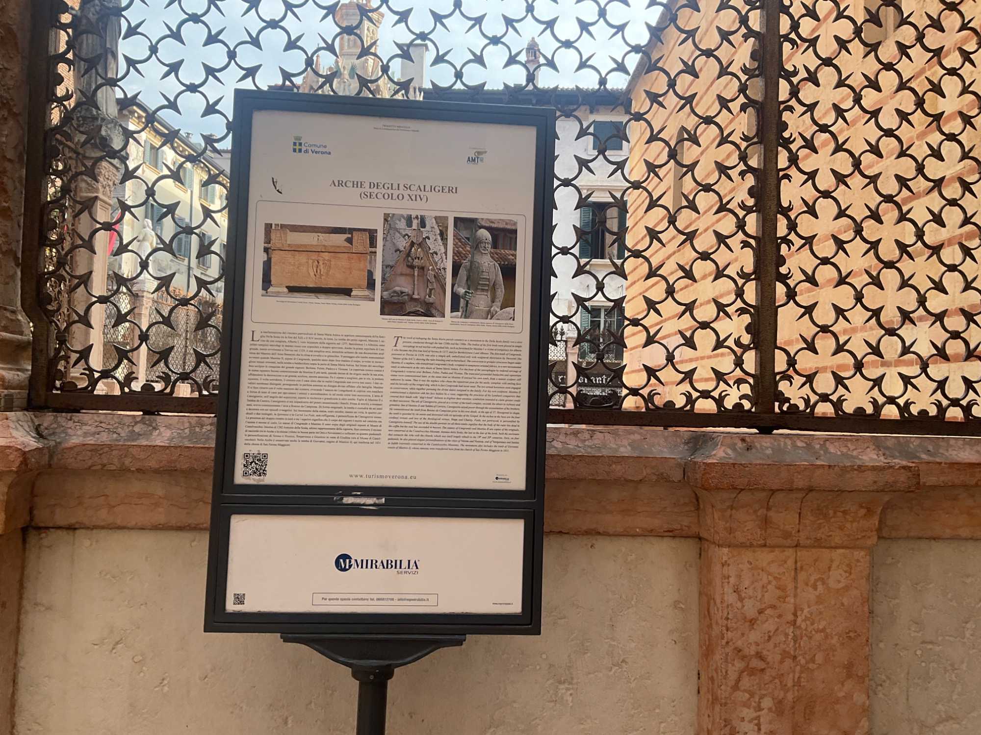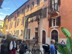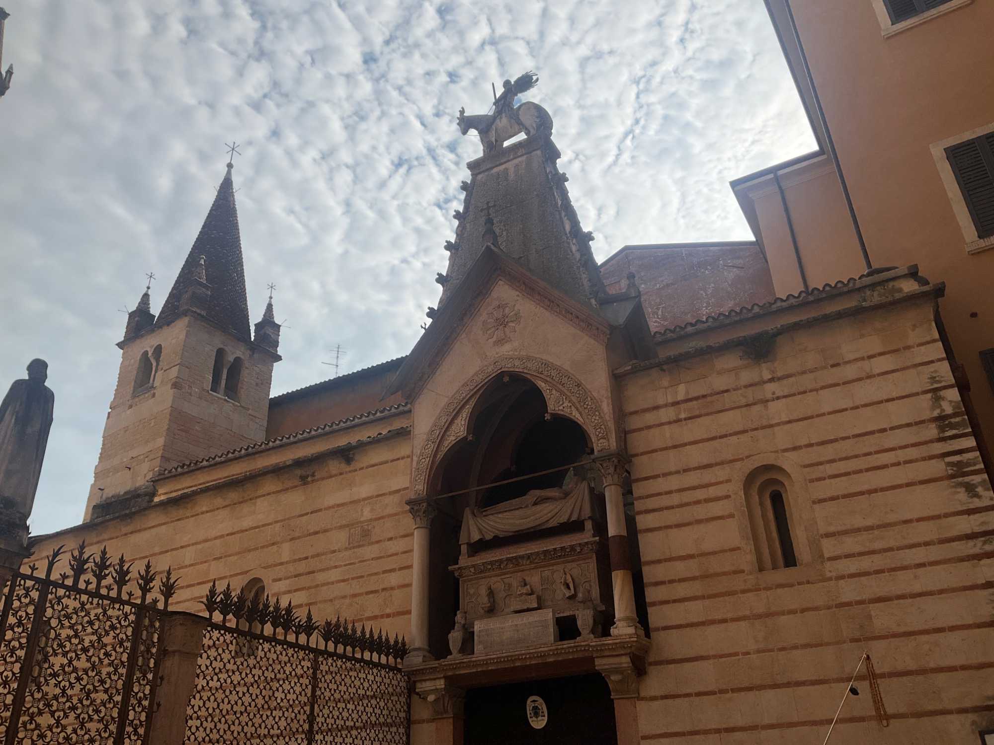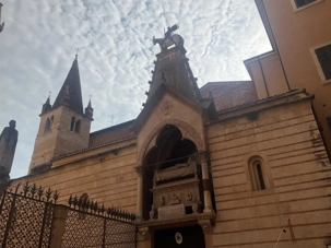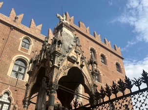 Poursuivant notre balade véronaise, Sarah nous a identifié Les Arches Scaliger, ces tombeaux monumentaux qui ont été élevés en l’honneur de la famille Scaligeri, les seigneurs de Vérone. Ils consistent en une série de cinq monuments funéraires gothiques trouvés à l'extérieur de l'église Santa Maria Antica de Vérone. Ils datent du 14ème siècle. Leur décoration élaborée nous a impressionnés mais surtout le positionnement de ces tombesux à plusieurs mètres du sol.