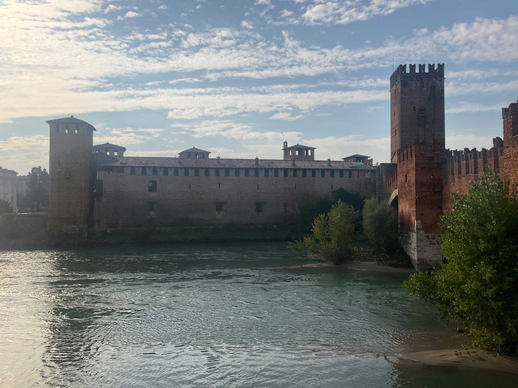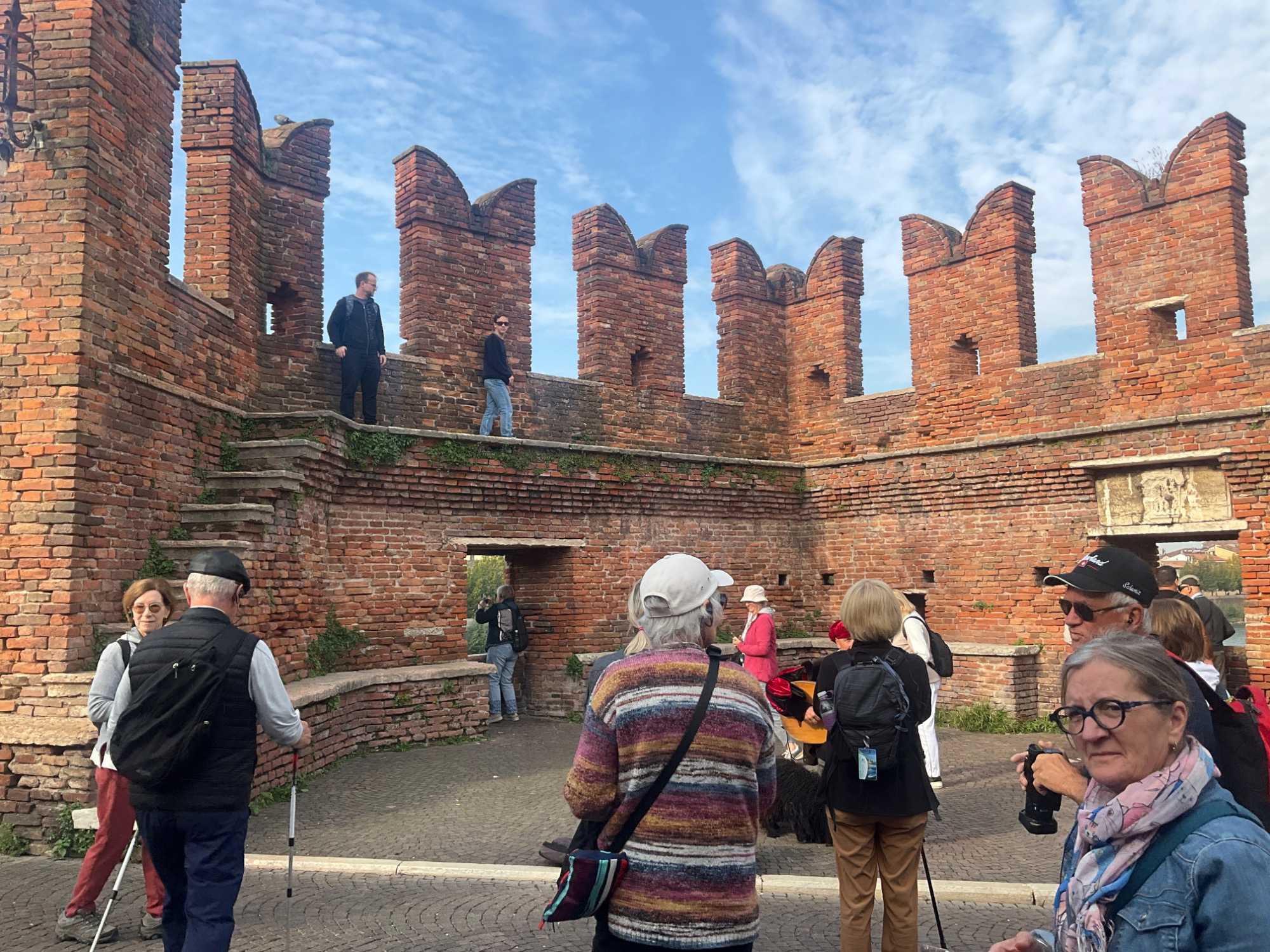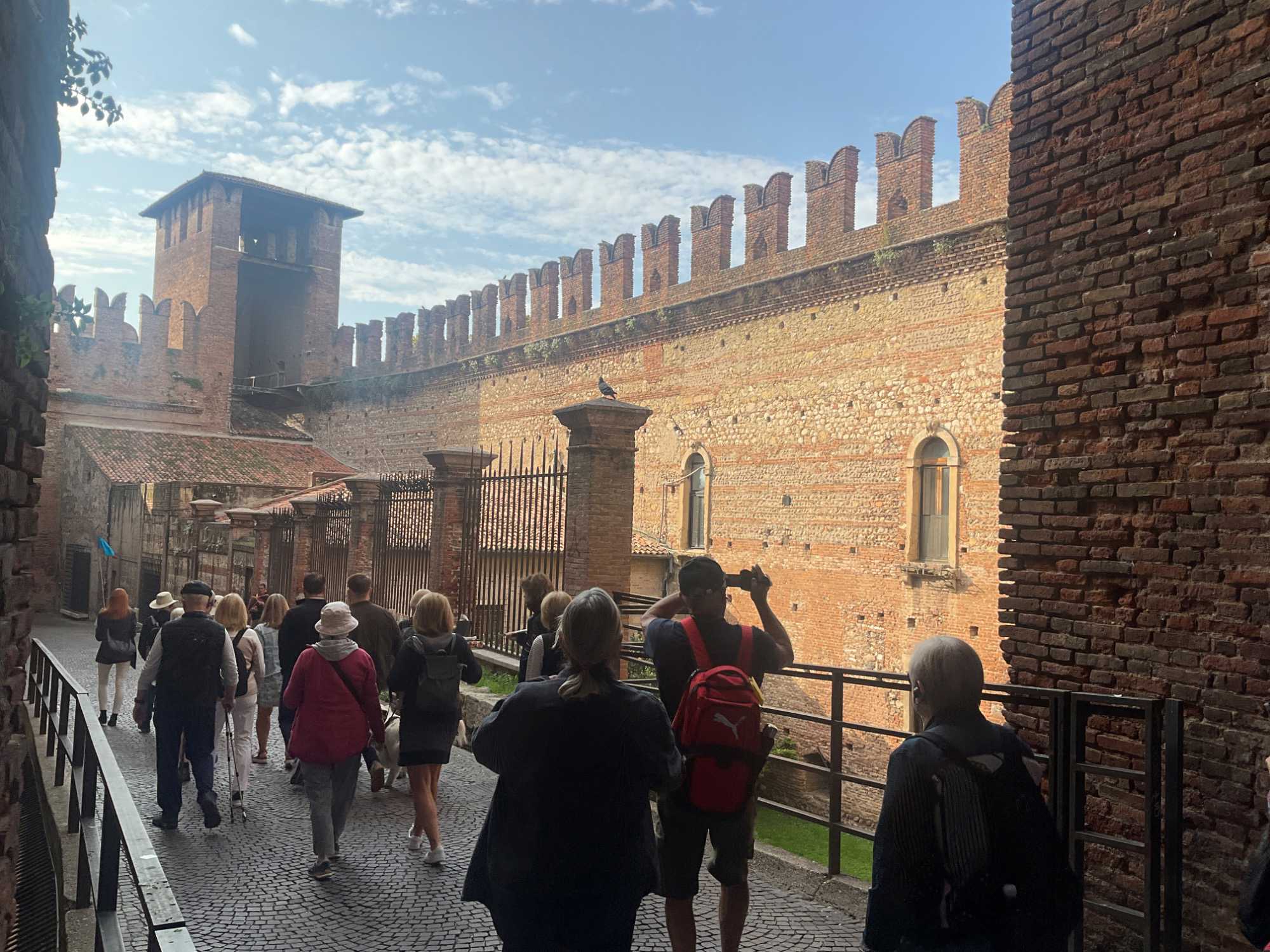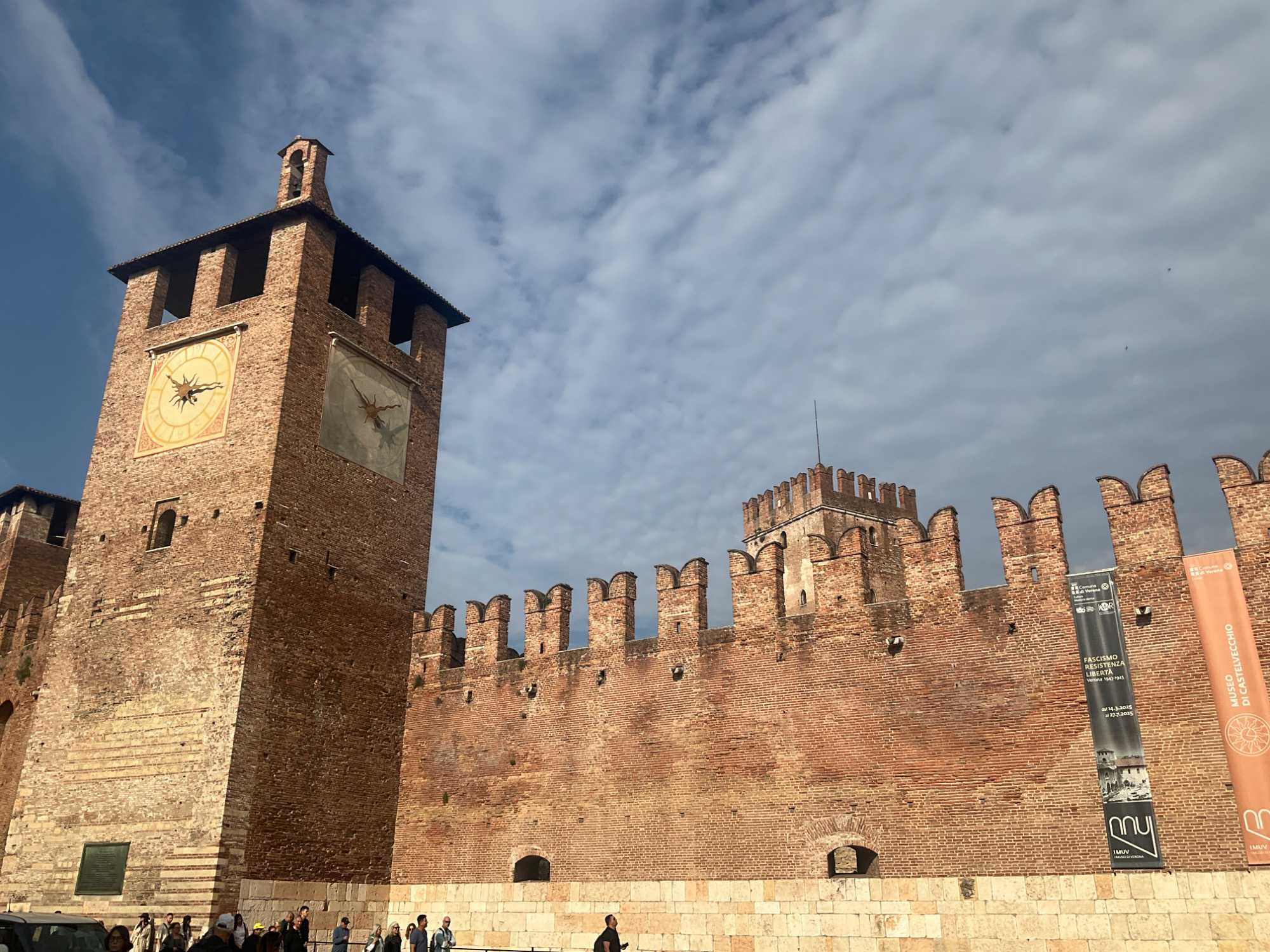 En traversant la passerelle, on entre dans le Castelvecchio (Vieux Château) qui a été édifié pour défendre la ville des invasions de l'extérieur et des révoltes intérieures venant du peuple. Il fut construit entre 1354 et 1356 pour la famille des Scaligeri par Cangrande II. À la fois résidence des seigneurs et forteresse, il fut utilisé ensuite comme caserne, puis comme prison. La forteresse a été établie à un point stratégique. Le pont, utilisé exclusivement par les familles nobles, pouvait être traversé à l'abri des attaques et permettait de sortir rapidement de la ville. Les différents points de vue nous ont permis de le prendre en photos « sous toutes ses coutures » et même d’immortaliser un musicien qui jouait d’un instrument ancien, également bien vêtus des costumes de l’époque
