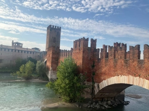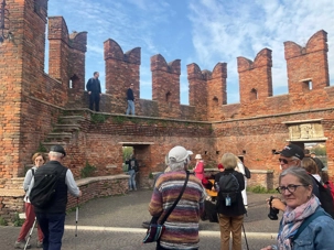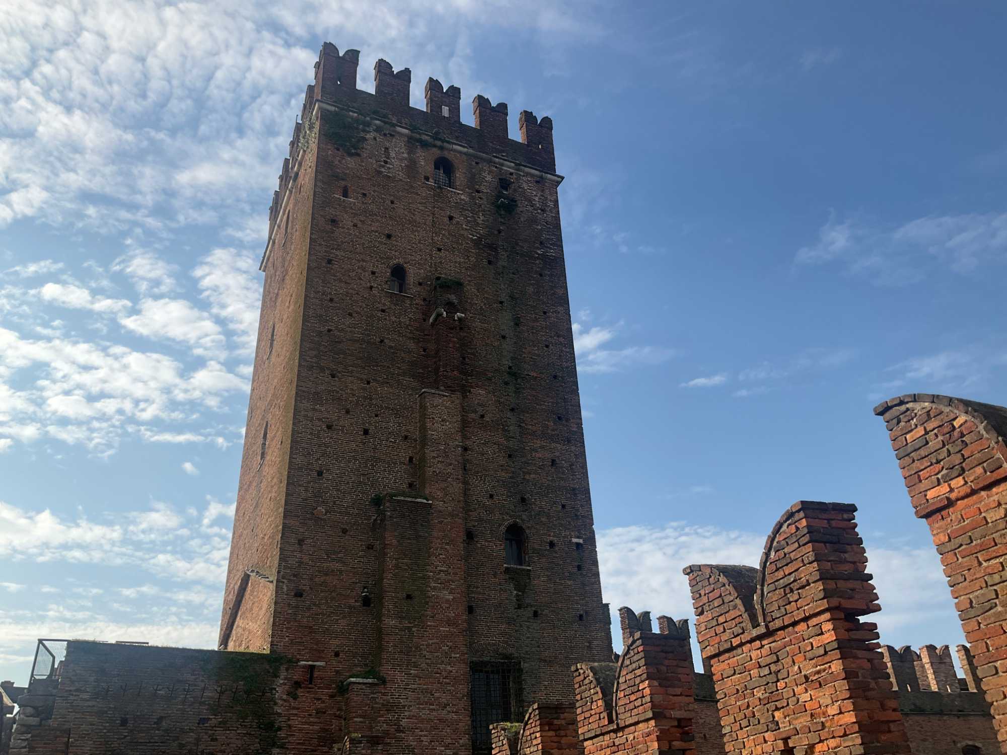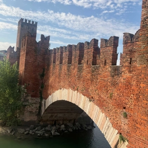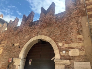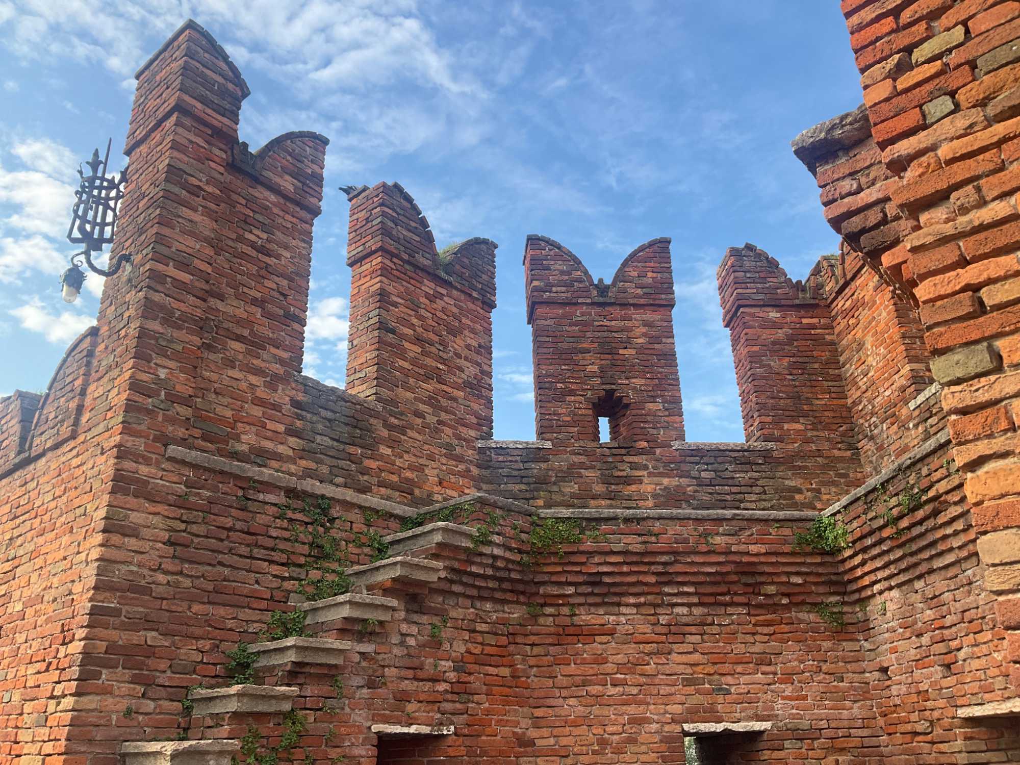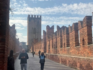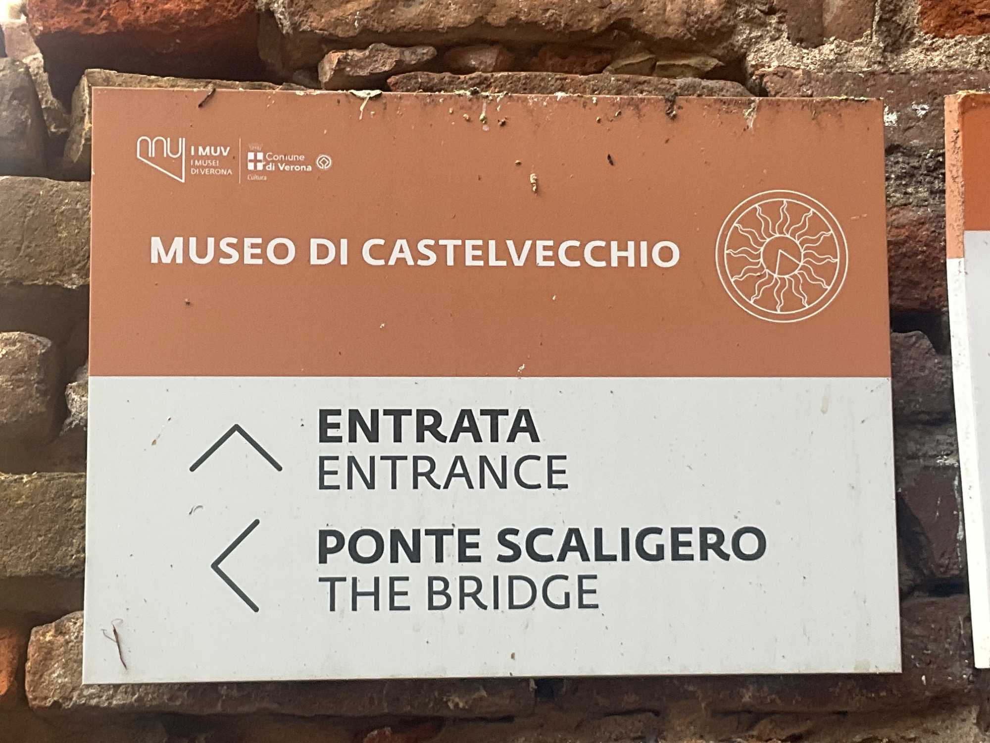 En traversant la passerelle, on entre dans le Castelvecchio (Vieux Château) qui a été édifié pour défendre la ville des invasions de l'extérieur et des révoltes intérieures venant du peuple. Il fut construit entre 1354 et 1356 pour la famille des Scaligeri par Cangrande II. À la fois résidence des seigneurs et forteresse, il fut utilisé ensuite comme caserne, puis comme prison. La forteresse a été établie à un point stratégique. Le pont, utilisé exclusivement par les familles nobles, pouvait être traversé à l'abri des attaques et permettait de sortir rapidement de la ville. Les différents points de vue nous ont permis de le prendre en photos « sous toutes ses coutures » et même d’immortaliser un musicien qui jouait d’un instrument ancien, également bien vêtus des costumes de l’époque
