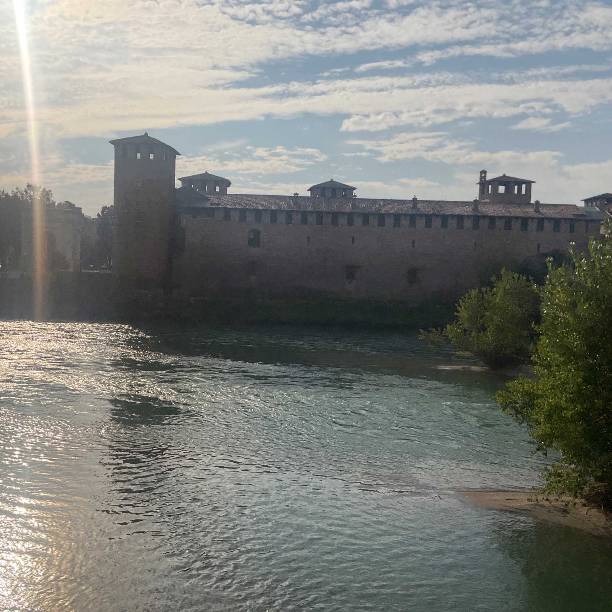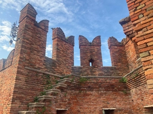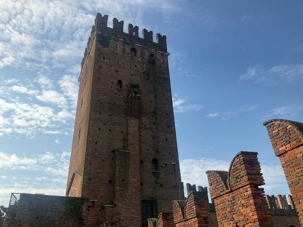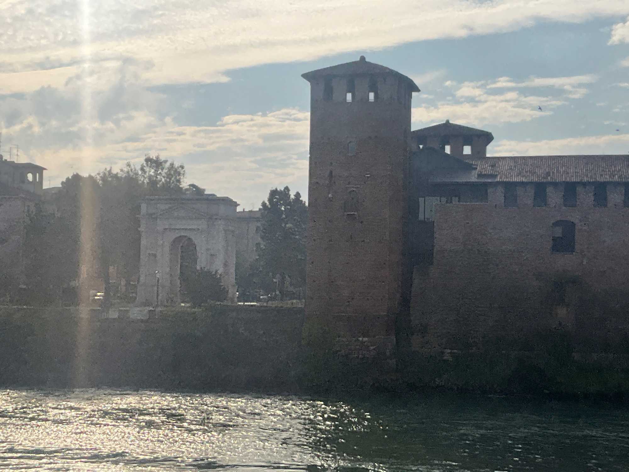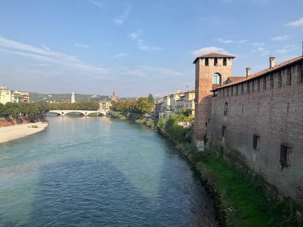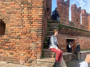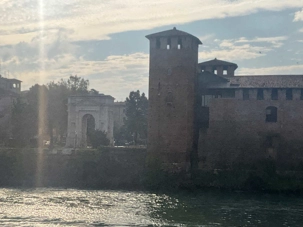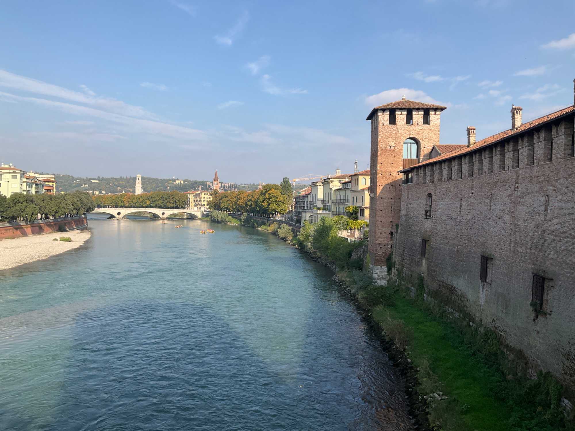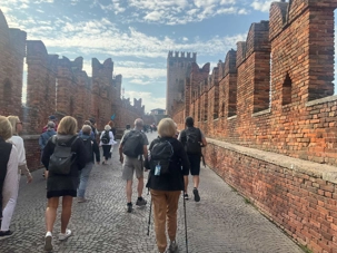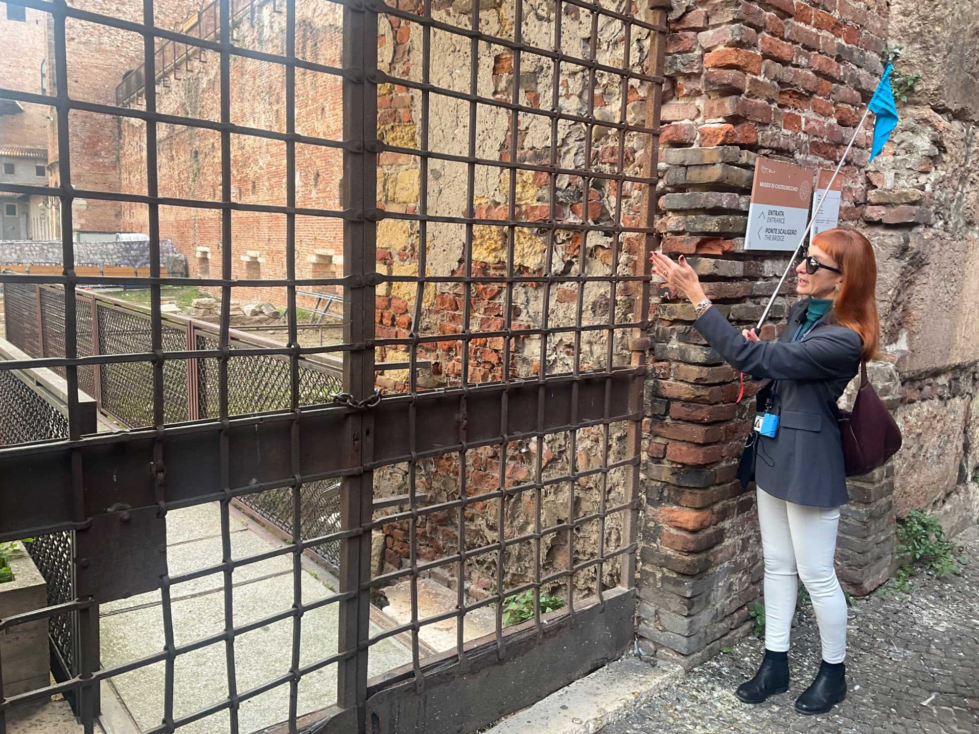 En traversant la passerelle, on entre dans le Castelvecchio (Vieux Château) qui a été édifié pour défendre la ville des invasions de l'extérieur et des révoltes intérieures venant du peuple. Il fut construit entre 1354 et 1356 pour la famille des Scaligeri par Cangrande II. À la fois résidence des seigneurs et forteresse, il fut utilisé ensuite comme caserne, puis comme prison. La forteresse a été établie à un point stratégique. Le pont, utilisé exclusivement par les familles nobles, pouvait être traversé à l'abri des attaques et permettait de sortir rapidement de la ville. Les différents points de vue nous ont permis de le prendre en photos « sous toutes ses coutures » et même d’immortaliser un musicien qui jouait d’un instrument ancien, également bien vêtus des costumes de l’époque