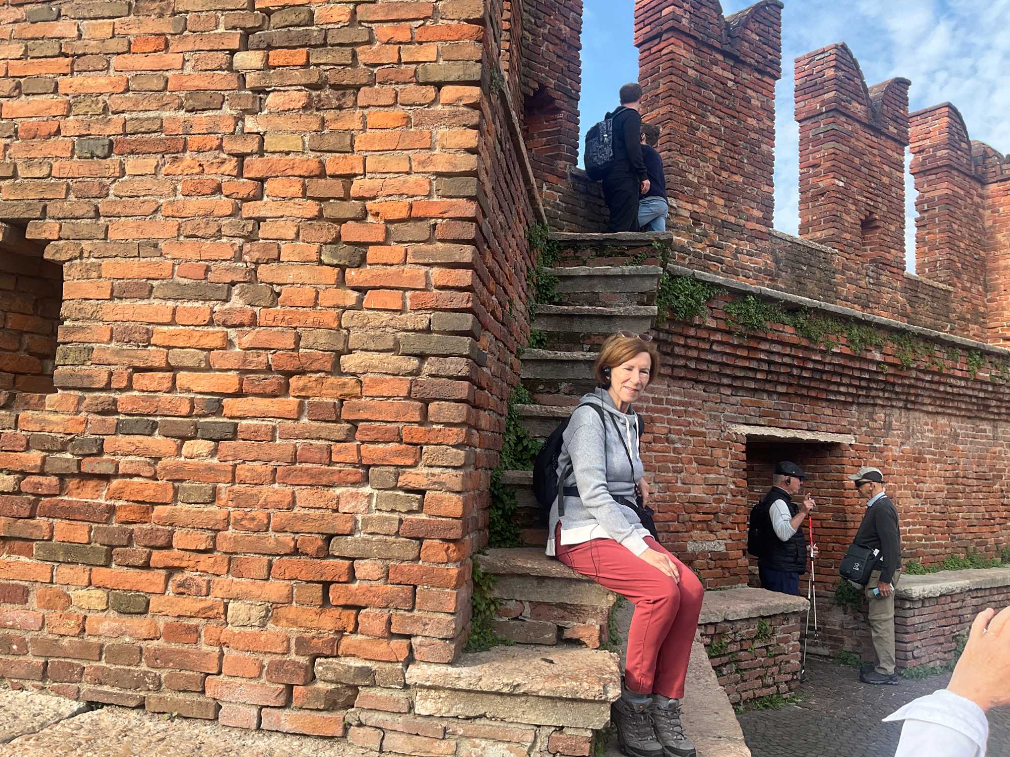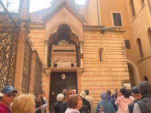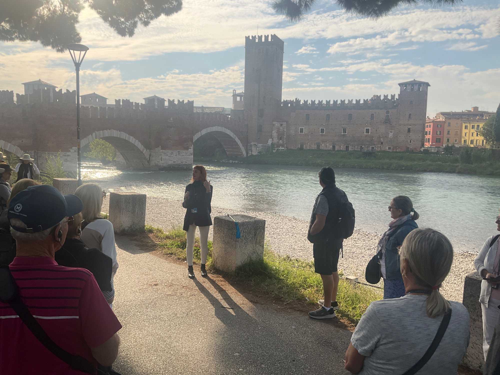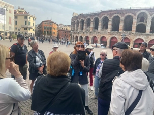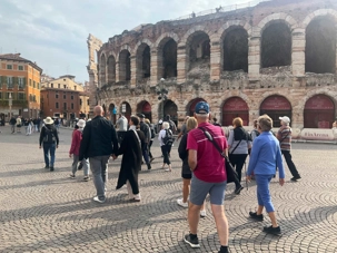 Un petit 60 kilomètres nous a permis de se rendre dans la ville notoire de Vérone, l’une desplus belles villes d’Italie. Chemin faisant, Alex, notre guide de parcours nous enseigne quelques mots et expressions en italien comme « Mama mia » qui est utilisée un peu « à toutes les sauces ». On apprend aussi la différence entre le célèbre gâteau milanais le « panettone » et son cousin de Vérone le « pandoro » qui opte pour la forme pyramidale étoilé de huits pointes…comme l’étoile de Charlevoix brodée sur les catalognes particulièrement. Sitôt arrivé, on rencontre notre guide locale qui se prénomme Sara, une italienne originaire de Milan.