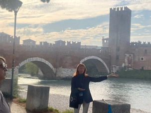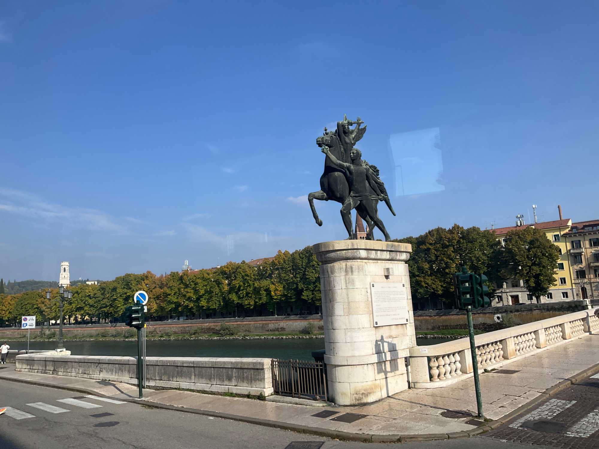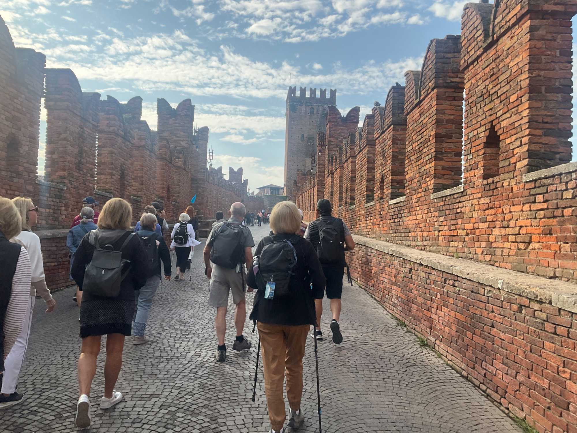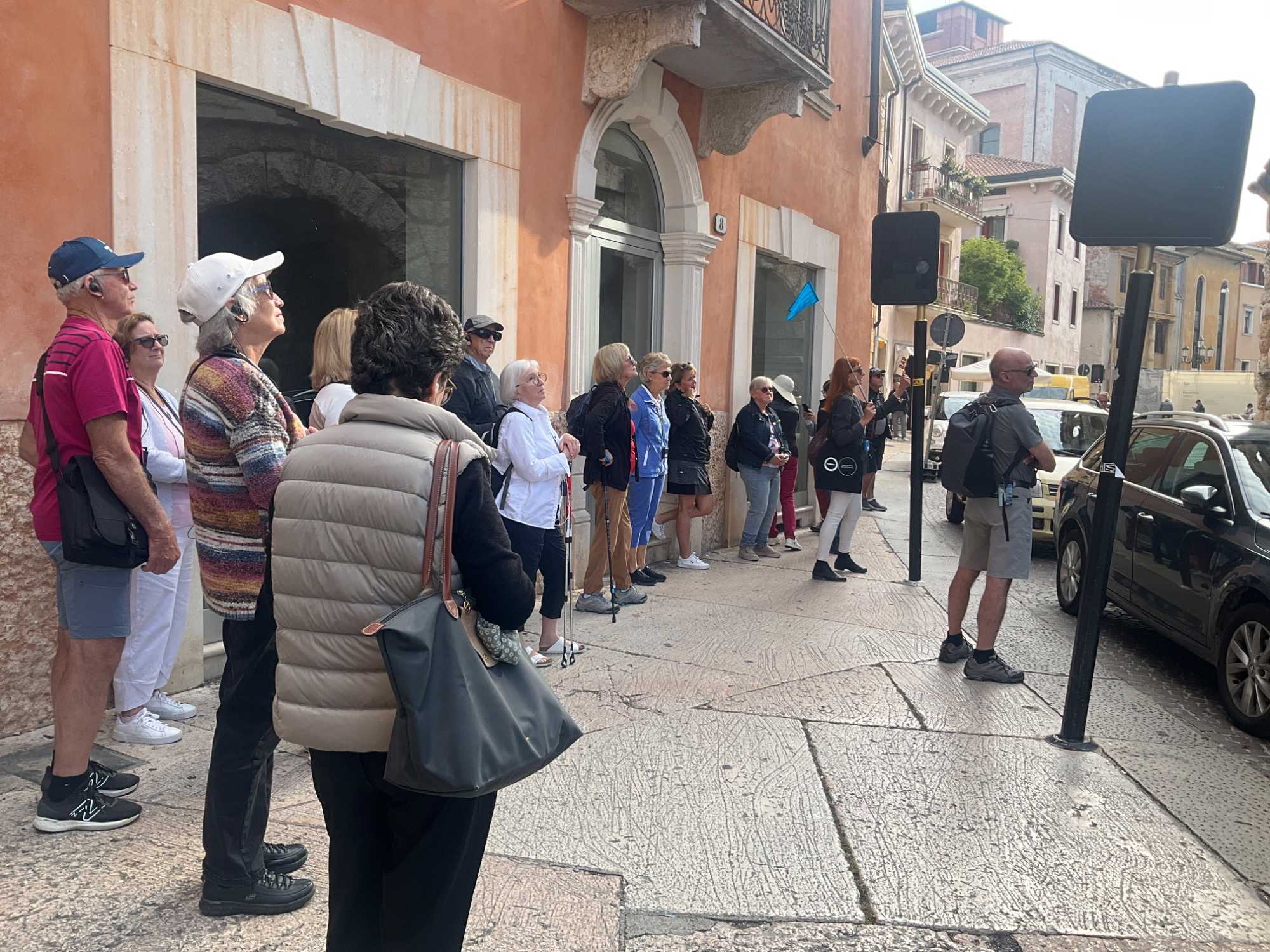Un petit 60 kilomètres nous a permis de se rendre dans la ville notoire de Vérone, l’une desplus belles villes d’Italie. Chemin faisant, Alex, notre guide de parcours nous enseigne quelques mots et expressions en italien comme « Mama mia » qui est utilisée un peu « à toutes les sauces ». On apprend aussi la différence entre le célèbre gâteau milanais le « panettone » et son cousin de Vérone le « pandoro » qui opte pour la forme pyramidale étoilé de huits pointes…comme l’étoile de Charlevoix brodée sur les catalognes particulièrement. Sitôt arrivé, on rencontre notre guide locale qui se prénomme Sara, une italienne originaire de Milan.