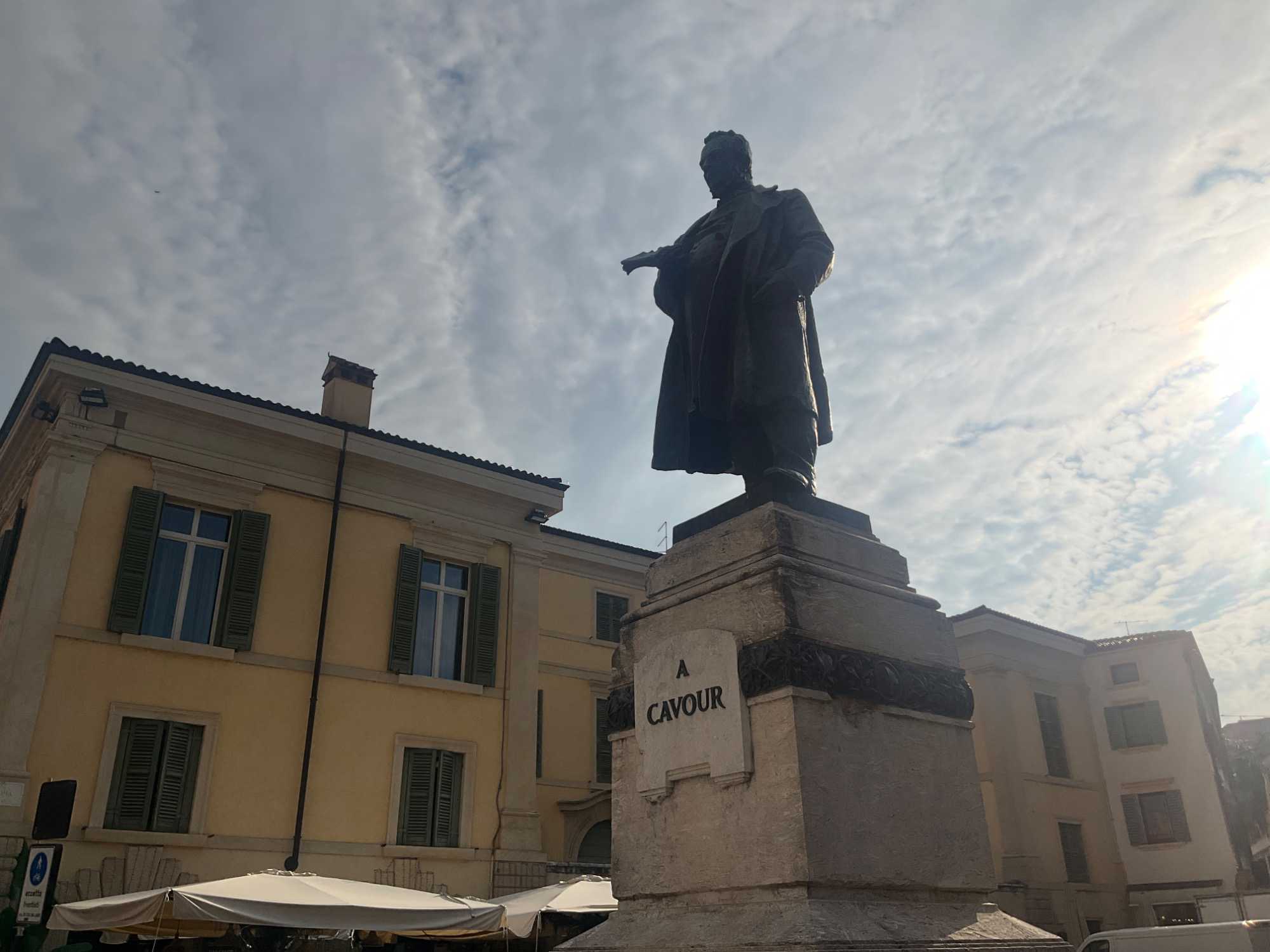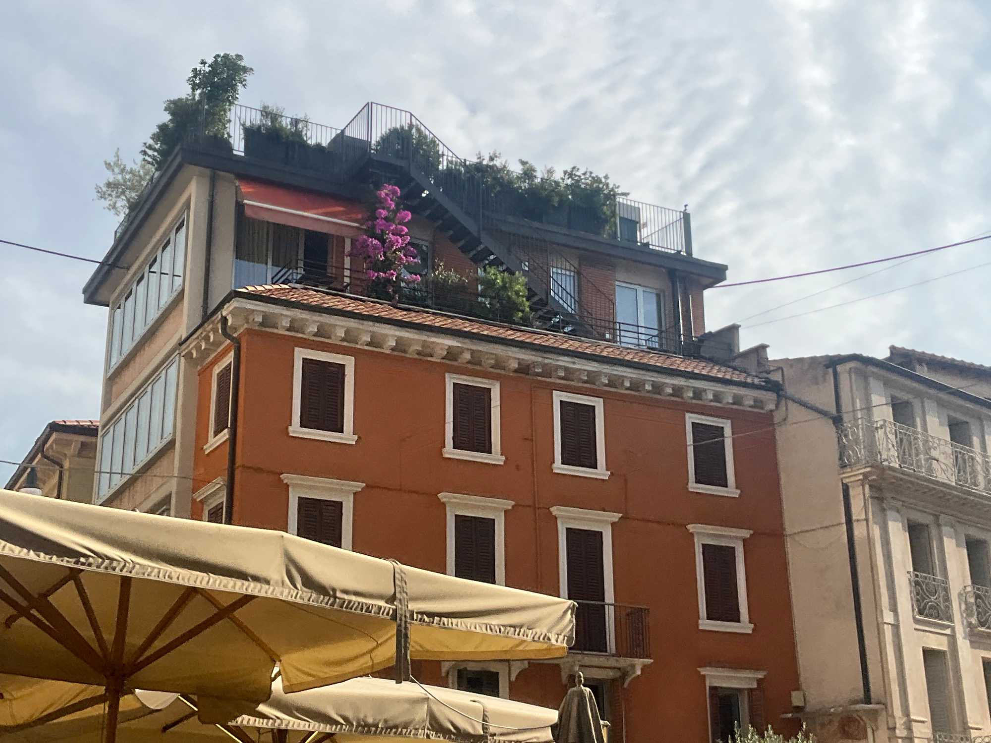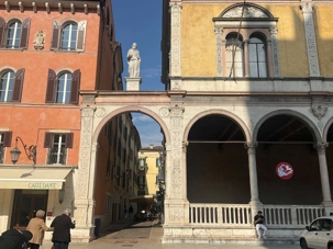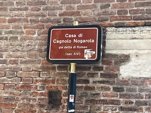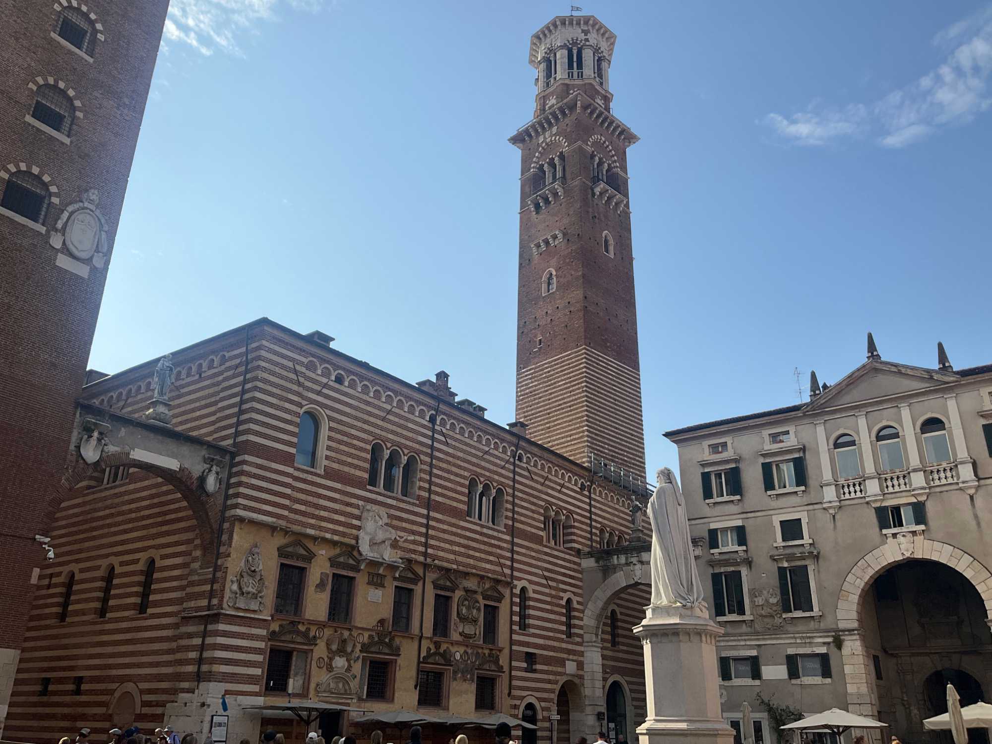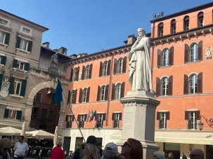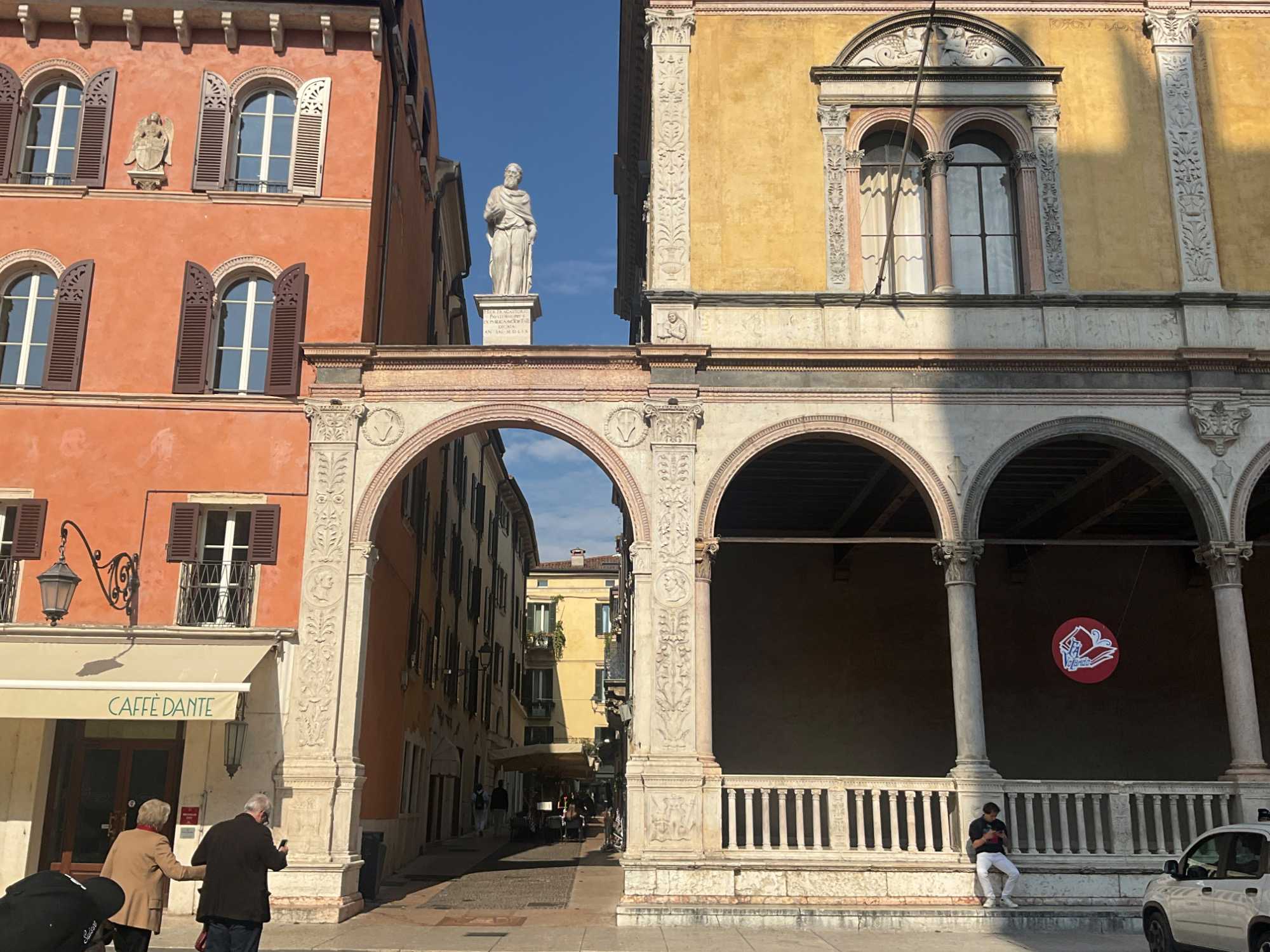 On raconte qu’à la Piazza dei Signori (place des Seigneurs XIIe siècle) nommée ci haut, on retrouverait là, la maison de Roméo, l'amant malheureux de Juliette. On y observe également, le monument (1865) de Dante Alighieri en marbre de Carrare, rien de trop beau pour monsieur Dante, auteur de la Divine comédie, l'un des chefs-d'œuvre de la littérature mondiale et, le célèbre « père » de la langue italienne, érigée pour célébrer le septième centenaire de la naissance du poète. Il se retrouve là, au centre de la Piazza dei Signori ou piazza Dante, entouré de beaux bâtiments dans un large éventail de styles architecturaux. De nombreux palais d'importance historique et artistique donnent sur la place. À notre avis, il est normal que ce grand intellect se tienne sur une place calme et attrayante, pas de cafés et de vendeurs. Place vraiment charmante.