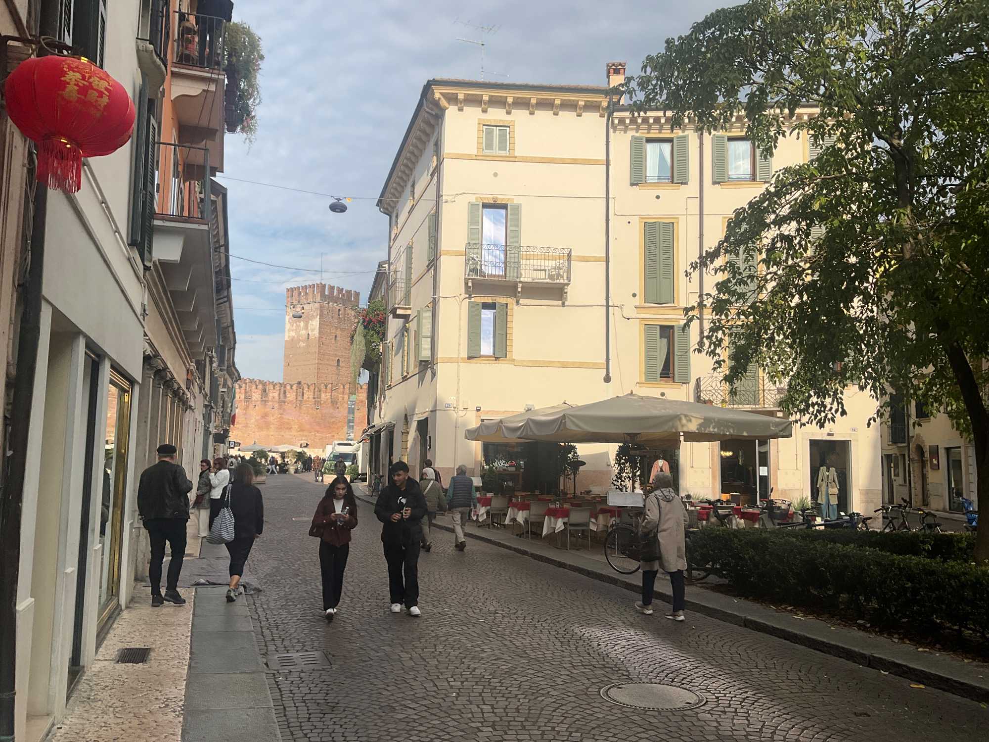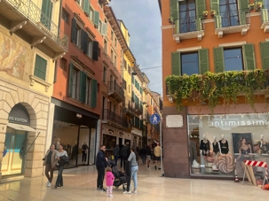 Puis après le repas certains ont exploré la principale rue commerçante de Vérone du nom de Via Mazzani. Bordé de magasins vendant les dernières tendances et de cafés chics où l’on a pu s’y asseoir, où d’autres ont pris leur le lunch à cet endroit et en ont profité pour regarder les gens autour d'un cappuccino crémeux. La rue relie certains des principaux sites touristiques de la ville. Elle fut créée au Moyen Âge lors de la construction des palais scaliger, et assume depuis le rôle de centre politique et administrative de la cité. Elle est bordée par quelques édifices monumentaux.