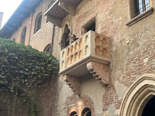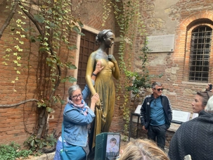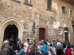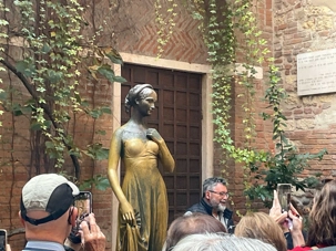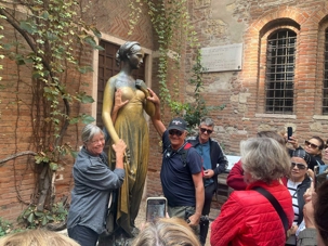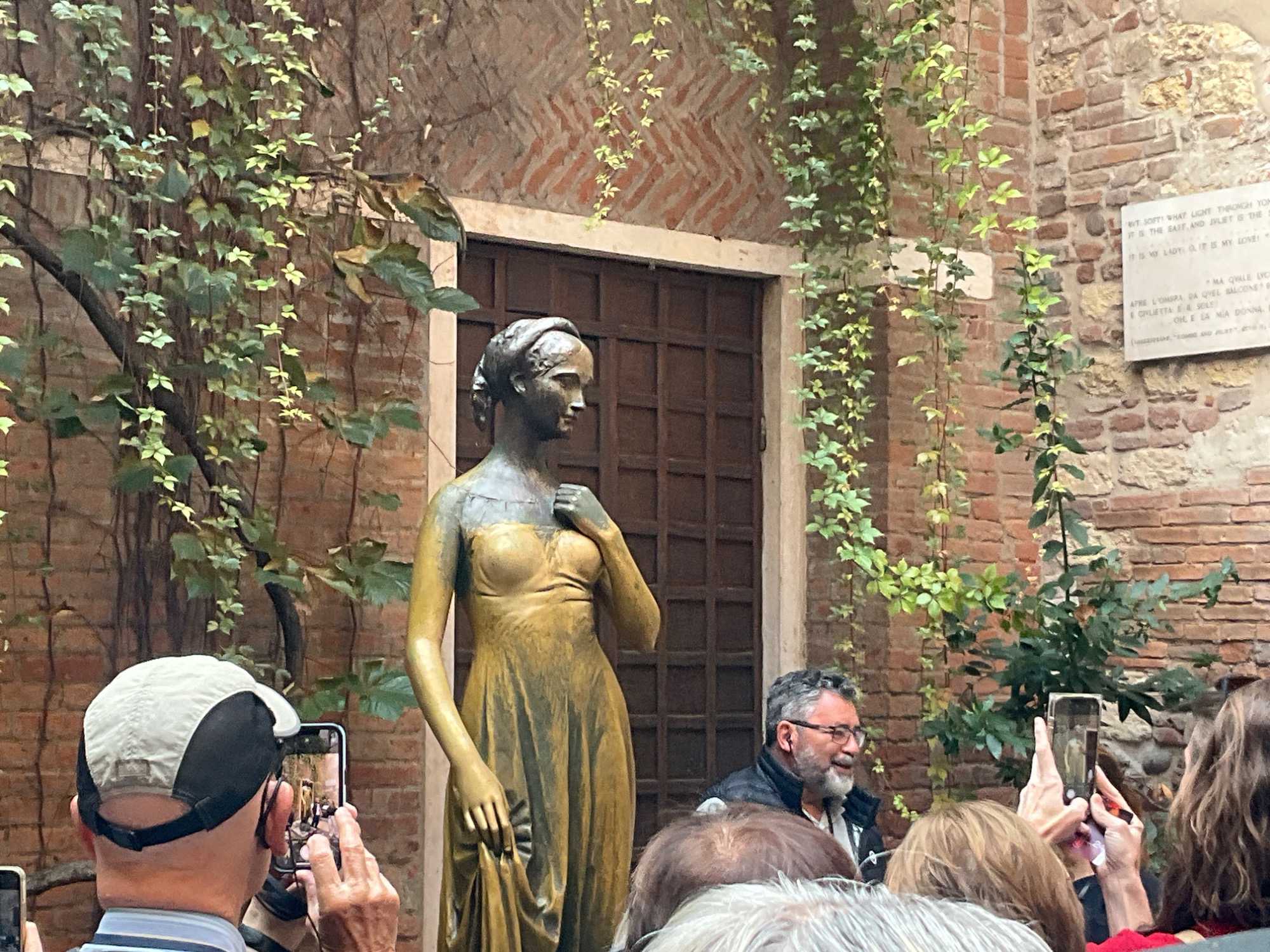 Mais nous, ce qui nous intéresse, c’est son célèbre balcon reconstitué. Ce dernier mot est important, c’est une reconstitution d’une pièce de théâtre, on s’entend que ce n’est pas une histoire vraie mais… possiblement que la pièce de théâtre est basée sur certains faits véridiques, du moins on aime y croire. On s’entend que le balcon n’a rien d’extraordinaire mais la sculpture en dessous, à côté, et attire les foules. On a fait la file comme tout bon touriste pour apprendre une fois rendue à la sculpture que les femmes doivent par tradition superstitieuse, toucher le sein droit …de la statue de bronze de Juliette afin de leur apporter bonheur, amour éternel, et fertilité. On a cru comprendre que les hommes aussi sont superstitieux hihi! La statue est censée porter bonheur aux célibataires qui cherchent l'amour. Comme tous mes voyageurs sont en couple depuis pour la plupart des dizaines années, ils ont considéré « cet amour éternel » comme acquis et quelques-uns sont revenus sans nécessairement toucher … « ce sein que je ne saurais voir » comme dans la pièce de Tartuffe, mais lui plus pudique parlait plutôt de « couvrir ce sein » HIHI! D’autres, ont joué le jeu d’une caresse furtive!
