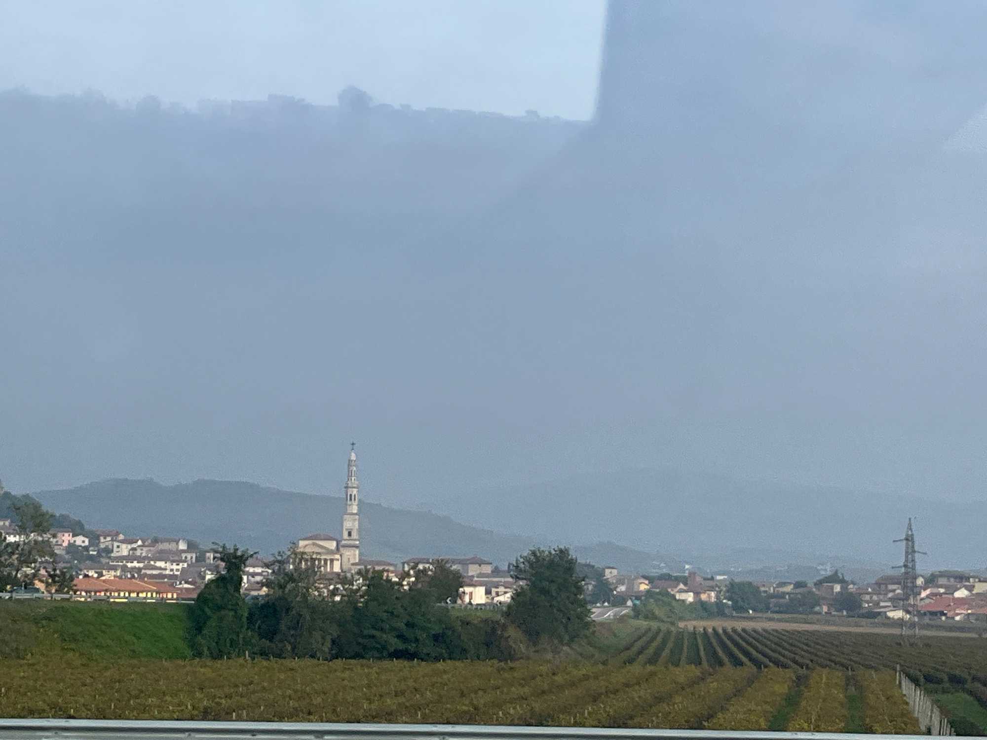 Une fois de plus, un bon petit déjeuner pour notre dernière nuit à cet hôtel et nous avons filé. Nous avons franchi une distance totale de 180 km aujourd’hui. Au départ nous avons longé la plaine du fleuve Pô où la corculation est intense mais …en sens inverse, puis nous avons traversé la région de Soave. Ça vous dit quelque chose? Hey oui, le sépage d’un vin blanc du même nom. Au loin, de la route, on voie son vieux château militaire sur la colline avec ses remparts qui suivent la colline jusqu’en bas, dans le secteur historique de la ville. Puis, on frôle le village de Montebello (bien que la signification en français de son nom ne soit pas à la hauteur de son nom italien soit « Montagne de la guerre »). Viens ensuite la signalisation pour Vicenze qui possède aussi un magnifique centre historique paraît-il et de superbes villas. Cette ville serait également reconnue pour son or. Jusqu’à Venise, on délaisse complètement les montagnes pour la plaine. Presque rendue à Padova (Padoue), Alex nous signale que c’est toute une région de thermes. En fait, entre Padoue et Venise notre destination finale, c’est une quarantaine de kilomètres que nous avons parcouru en fin d’après-midi.