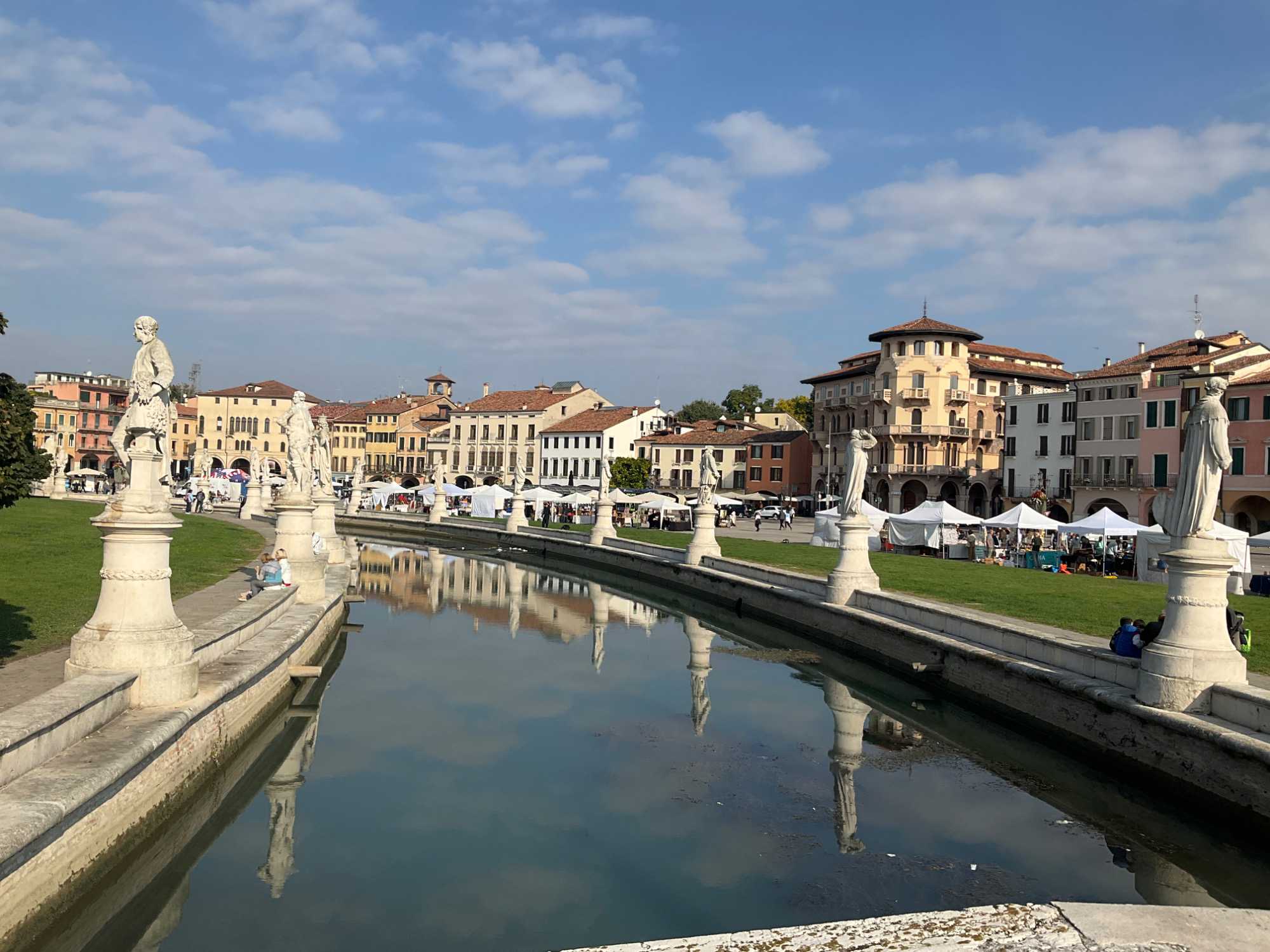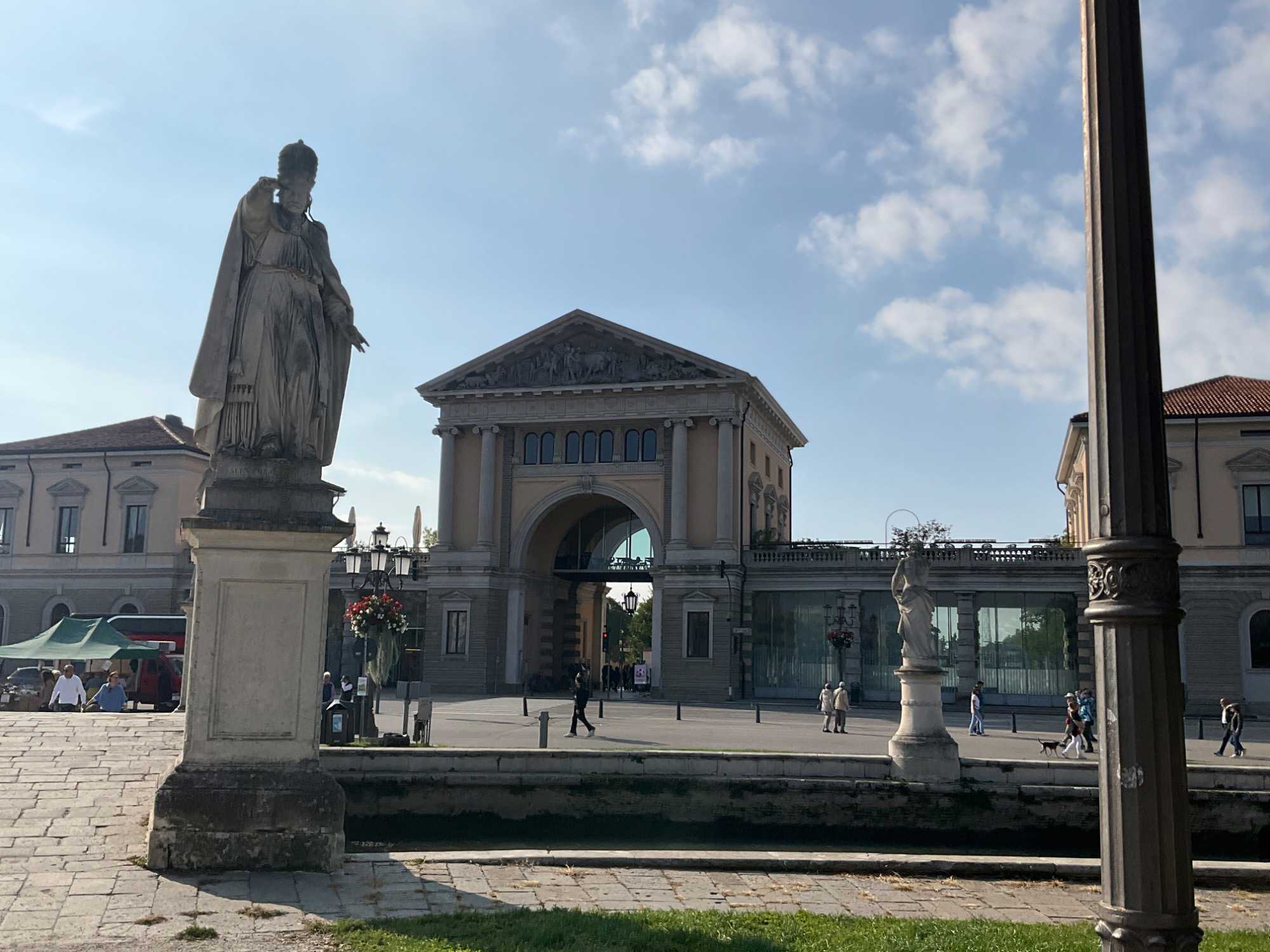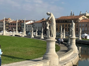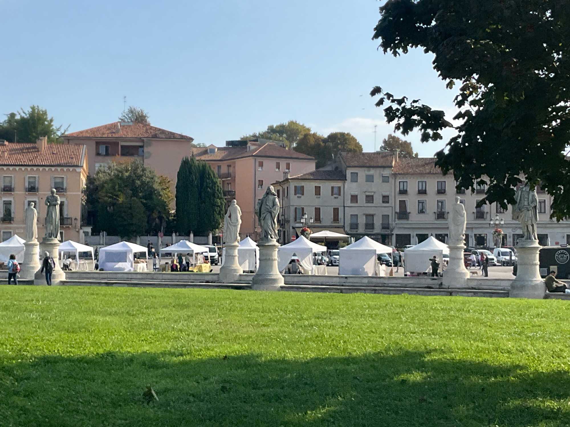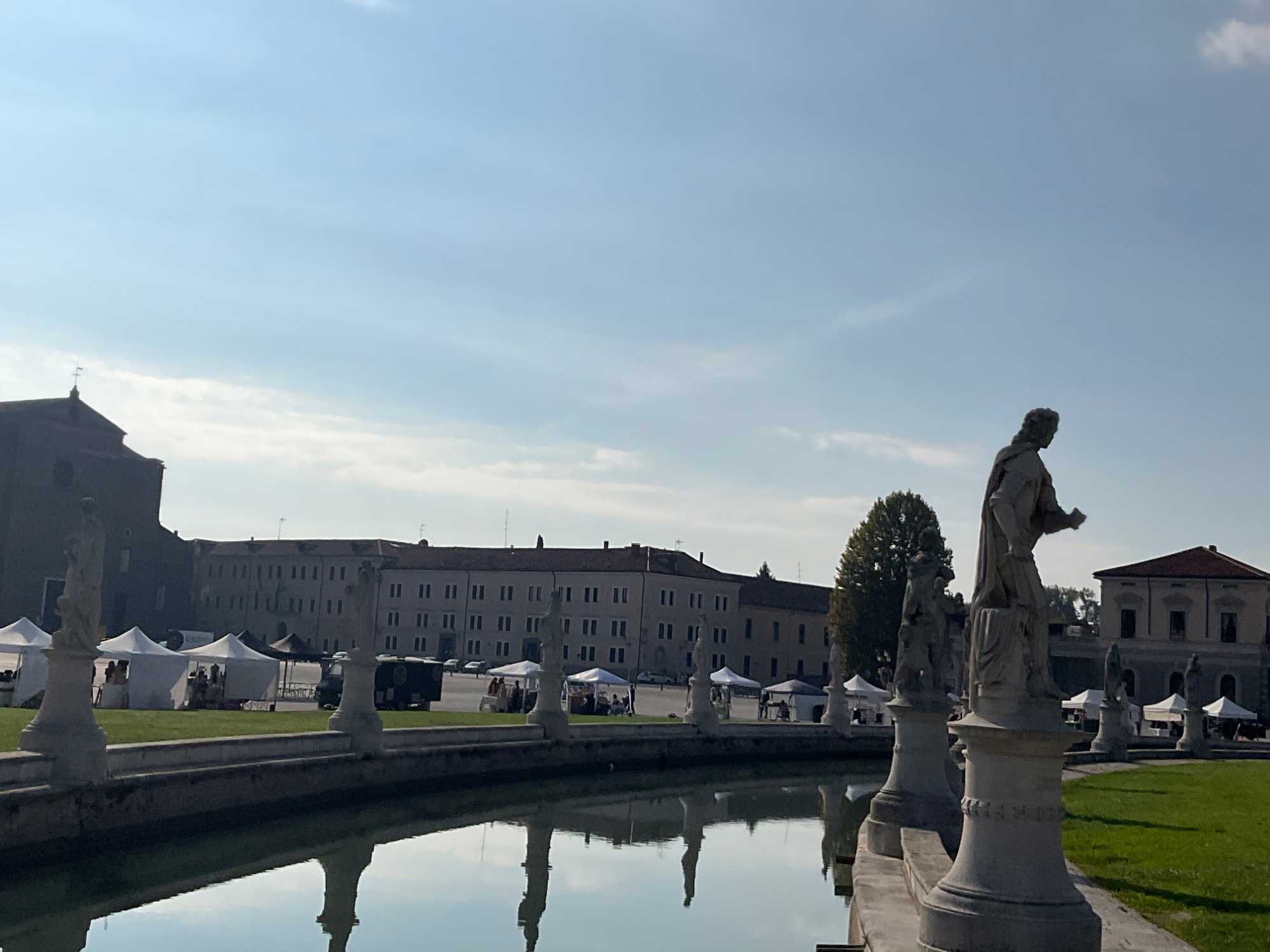 En arrivant et en partant de Padoue, nous sommes passés par le plus grand espace en plein air, la plus grande place d'Italie, et une des plus grandes de toute l’Europe, dans sa partie centrale, cet espace se nomme Prato (signifie couvert d’herbes) della Valle. Ce nom apparaît pour la première fois au XII e siècle. La magnificence pure sur 8.86 hectares de forme elliptiques. Il abrite même une île artificielle, appelée « isola Memmia », entourée de canaux sur les berges où se trouvent 78 statues mais aucune personne vivante ne peut être représentée, et aucun saint ne peut se voir consacrer une statue, de plus, toute personne qui se voie consacrer une statue doit avoir eu un lien avec la ville. On se croirait au Vatican mais sans les saints et …en plein air. Cet espace confirme bien la place de l’art pour cette ville.