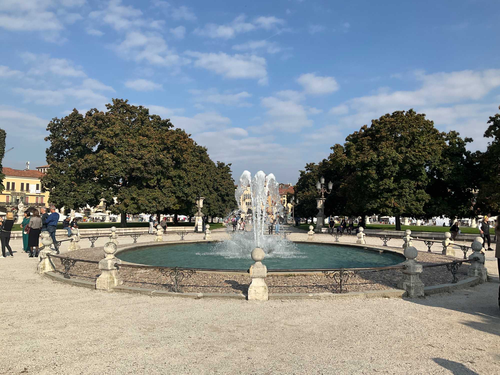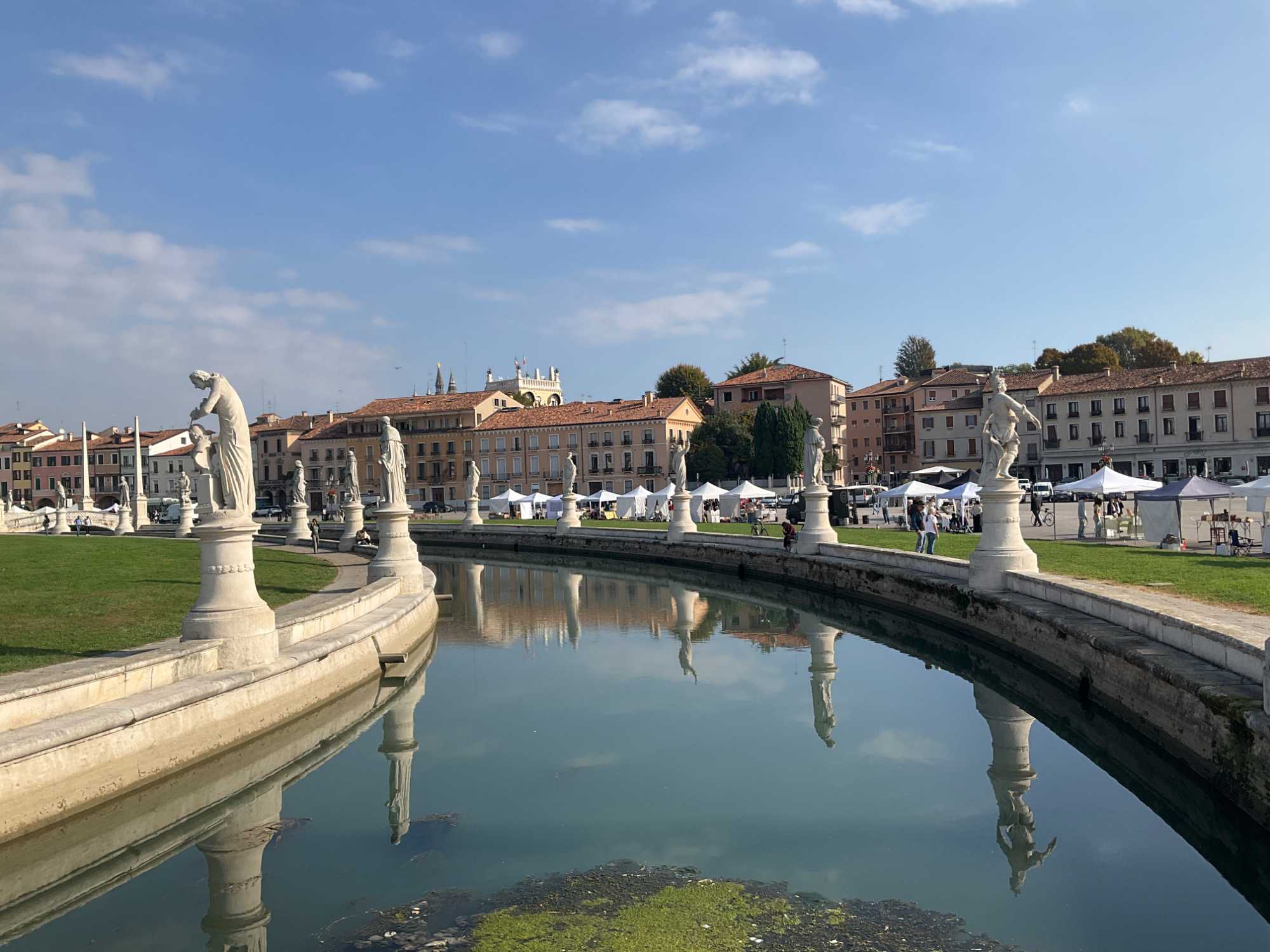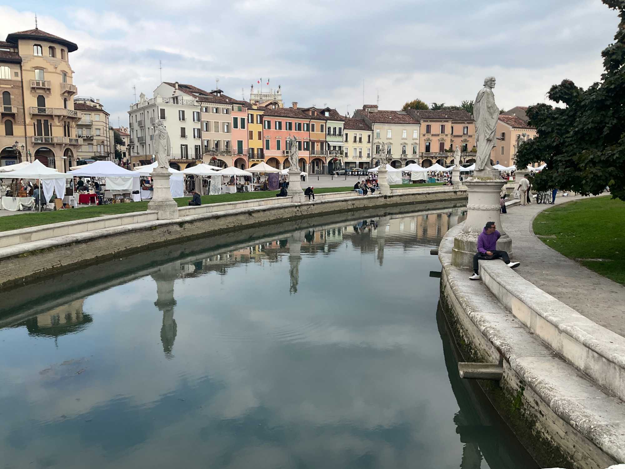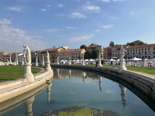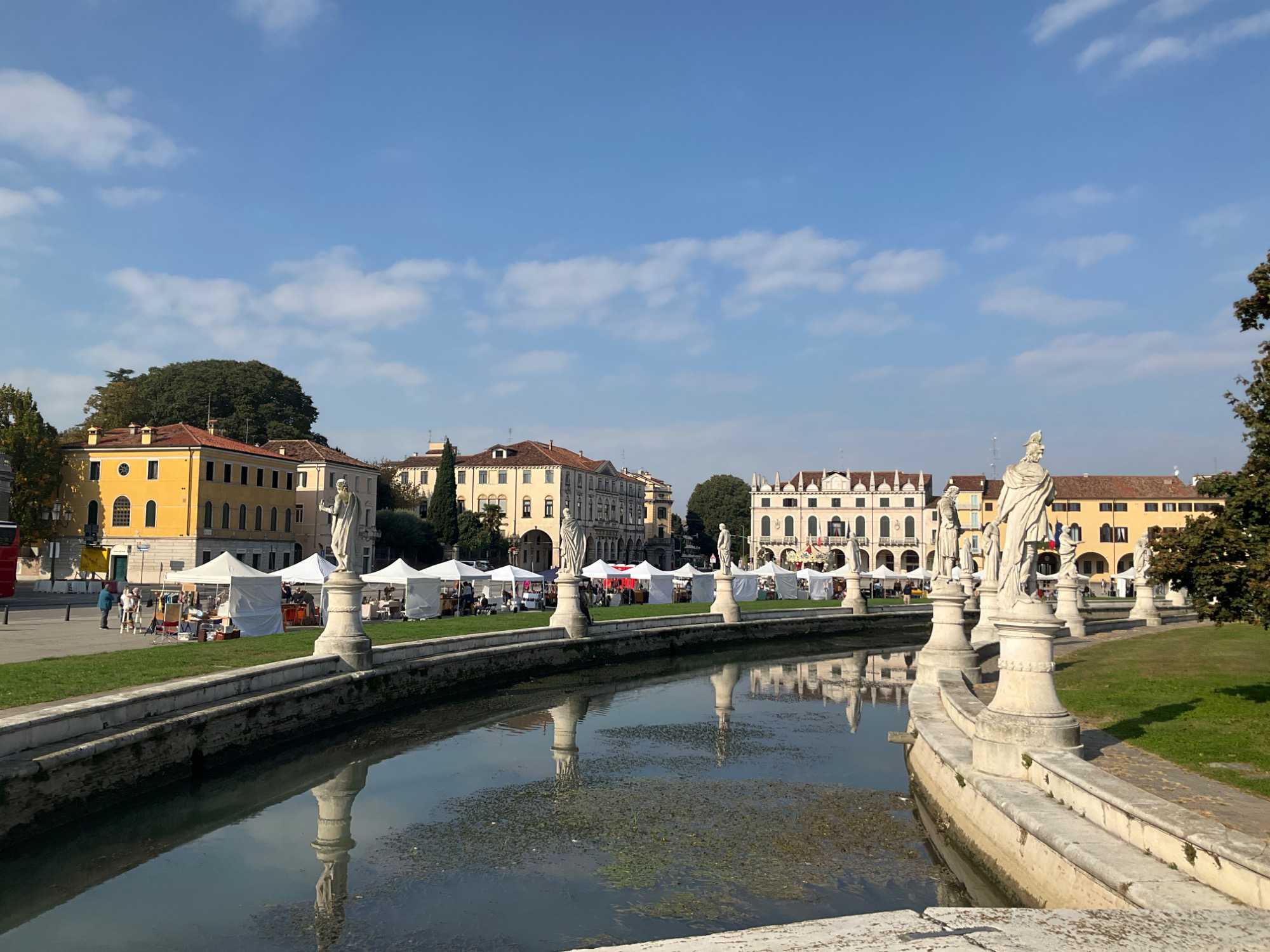 En arrivant et en partant de Padoue, nous sommes passés par le plus grand espace en plein air, la plus grande place d'Italie, et une des plus grandes de toute l’Europe, dans sa partie centrale, cet espace se nomme Prato (signifie couvert d’herbes) della Valle. Ce nom apparaît pour la première fois au XII e siècle. La magnificence pure sur 8.86 hectares de forme elliptiques. Il abrite même une île artificielle, appelée « isola Memmia », entourée de canaux sur les berges où se trouvent 78 statues mais aucune personne vivante ne peut être représentée, et aucun saint ne peut se voir consacrer une statue, de plus, toute personne qui se voie consacrer une statue doit avoir eu un lien avec la ville. On se croirait au Vatican mais sans les saints et …en plein air. Cet espace confirme bien la place de l’art pour cette ville.