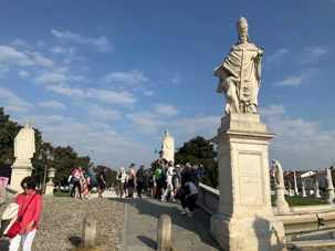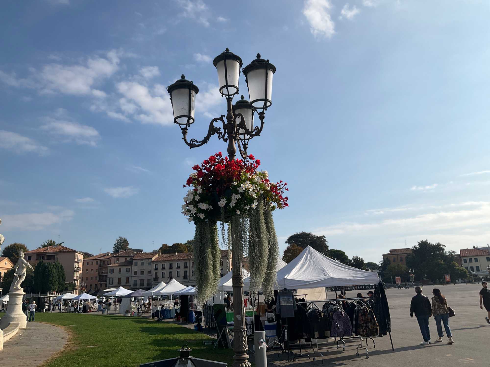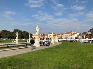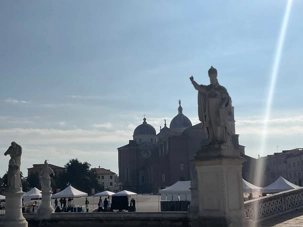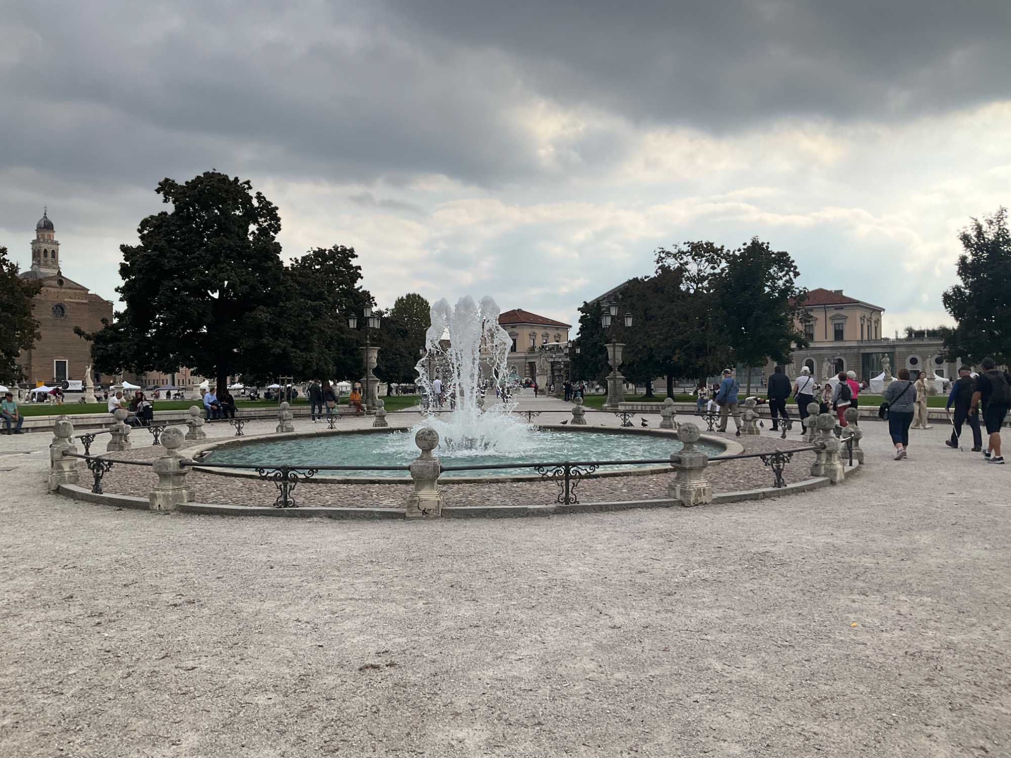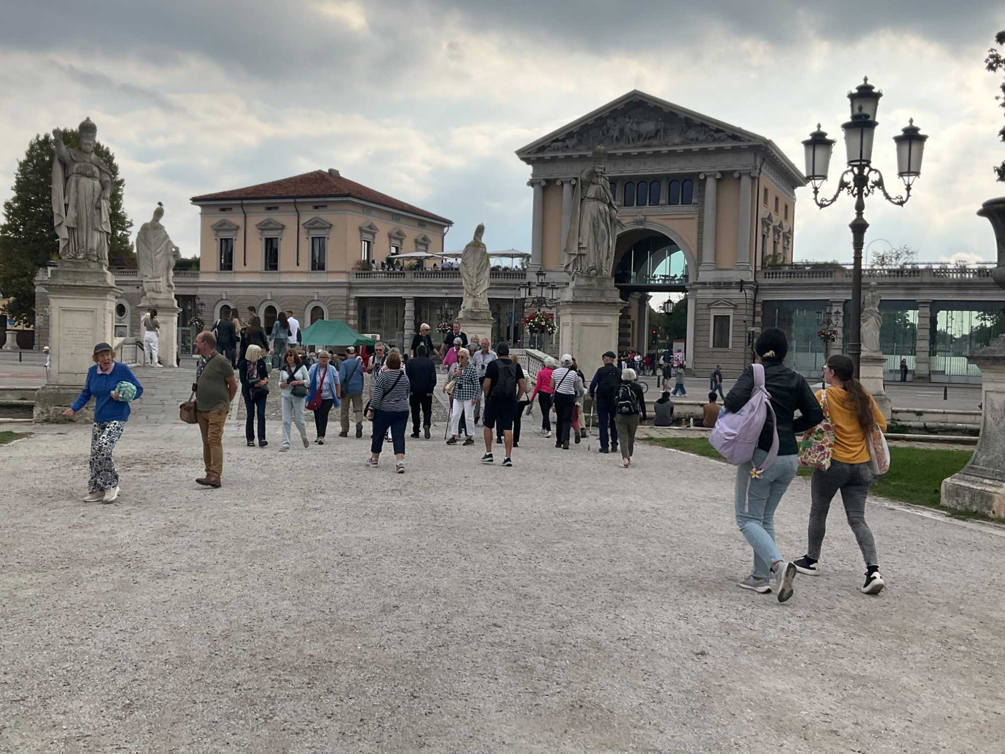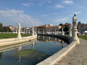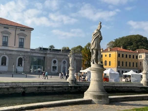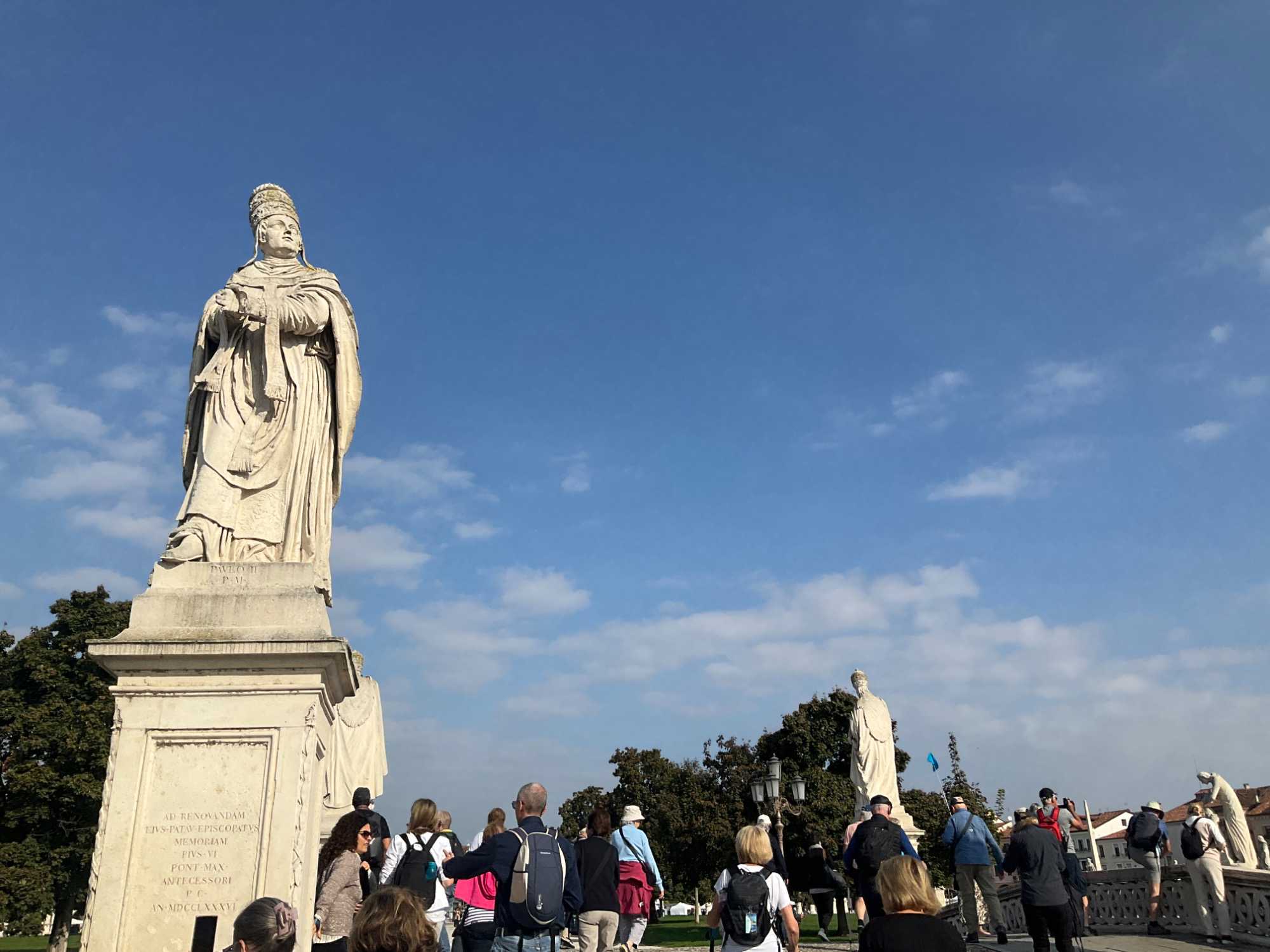En arrivant et en partant de Padoue, nous sommes passés par le plus grand espace en plein air, la plus grande place d'Italie, et une des plus grandes de toute l’Europe, dans sa partie centrale, cet espace se nomme Prato (signifie couvert d’herbes) della Valle. Ce nom apparaît pour la première fois au XII e siècle. La magnificence pure sur 8.86 hectares de forme elliptiques. Il abrite même une île artificielle, appelée « isola Memmia », entourée de canaux sur les berges où se trouvent 78 statues mais aucune personne vivante ne peut être représentée, et aucun saint ne peut se voir consacrer une statue, de plus, toute personne qui se voie consacrer une statue doit avoir eu un lien avec la ville. On se croirait au Vatican mais sans les saints et …en plein air. Cet espace confirme bien la place de l’art pour cette ville.