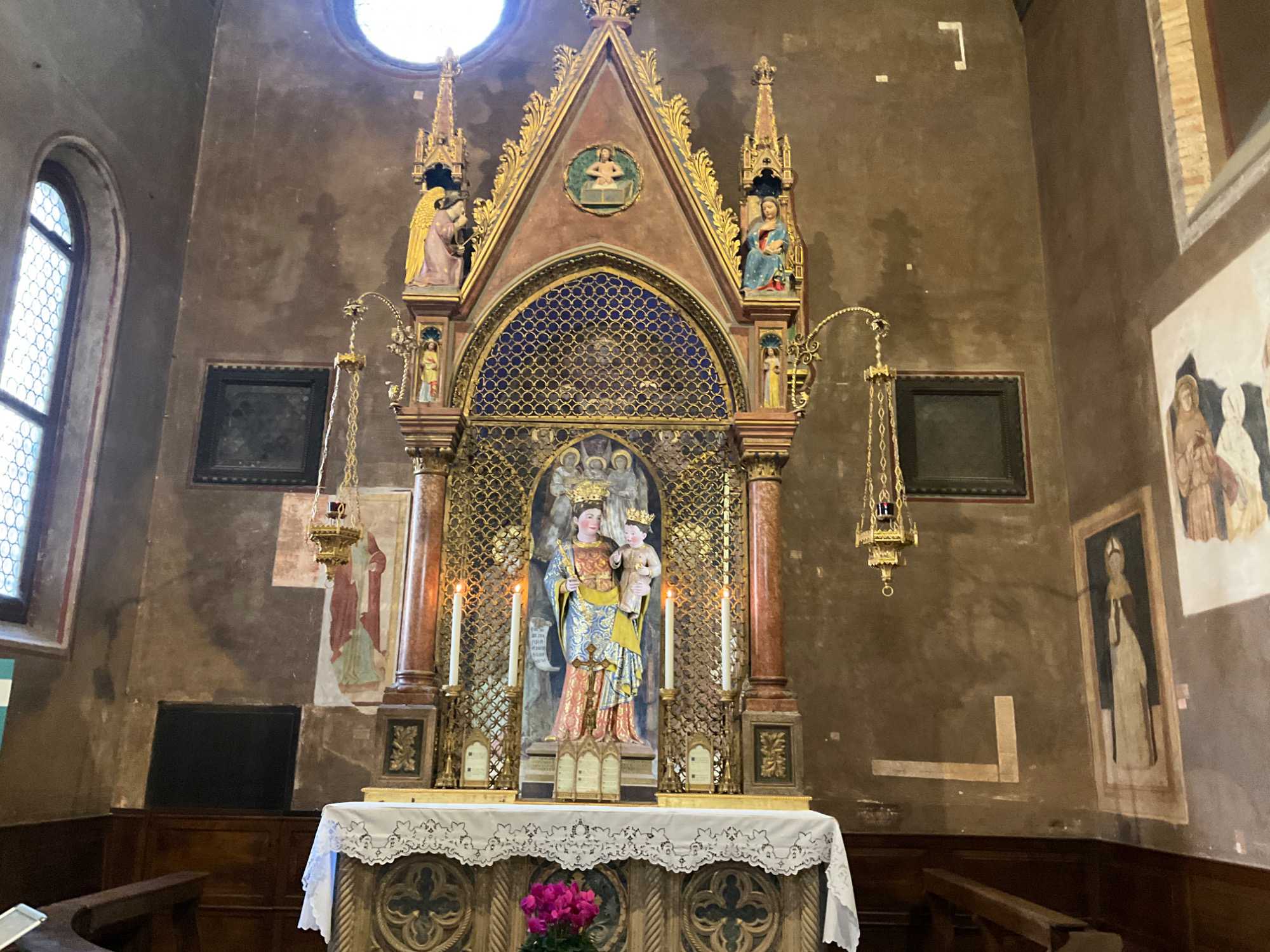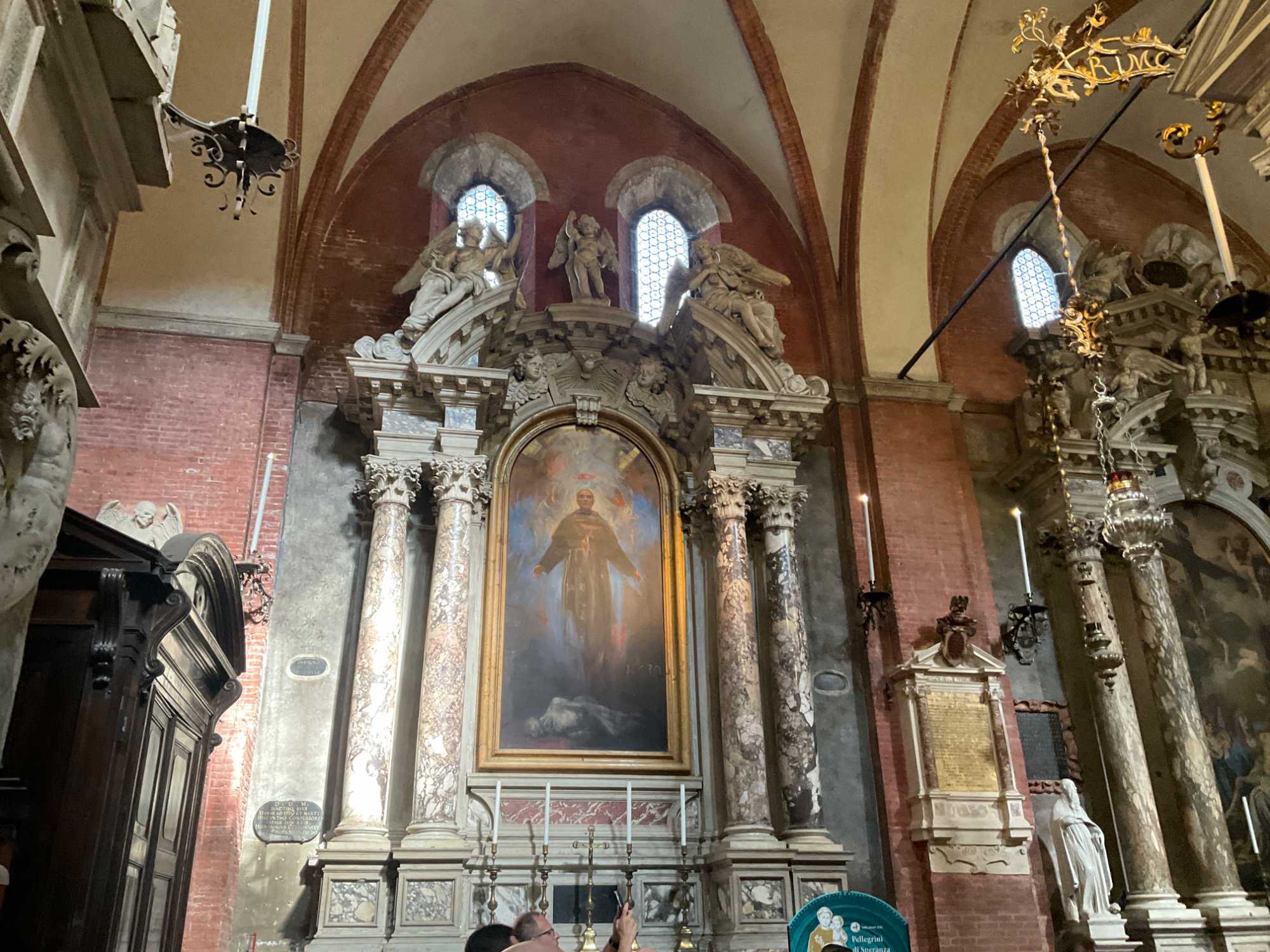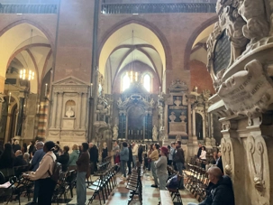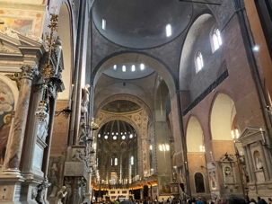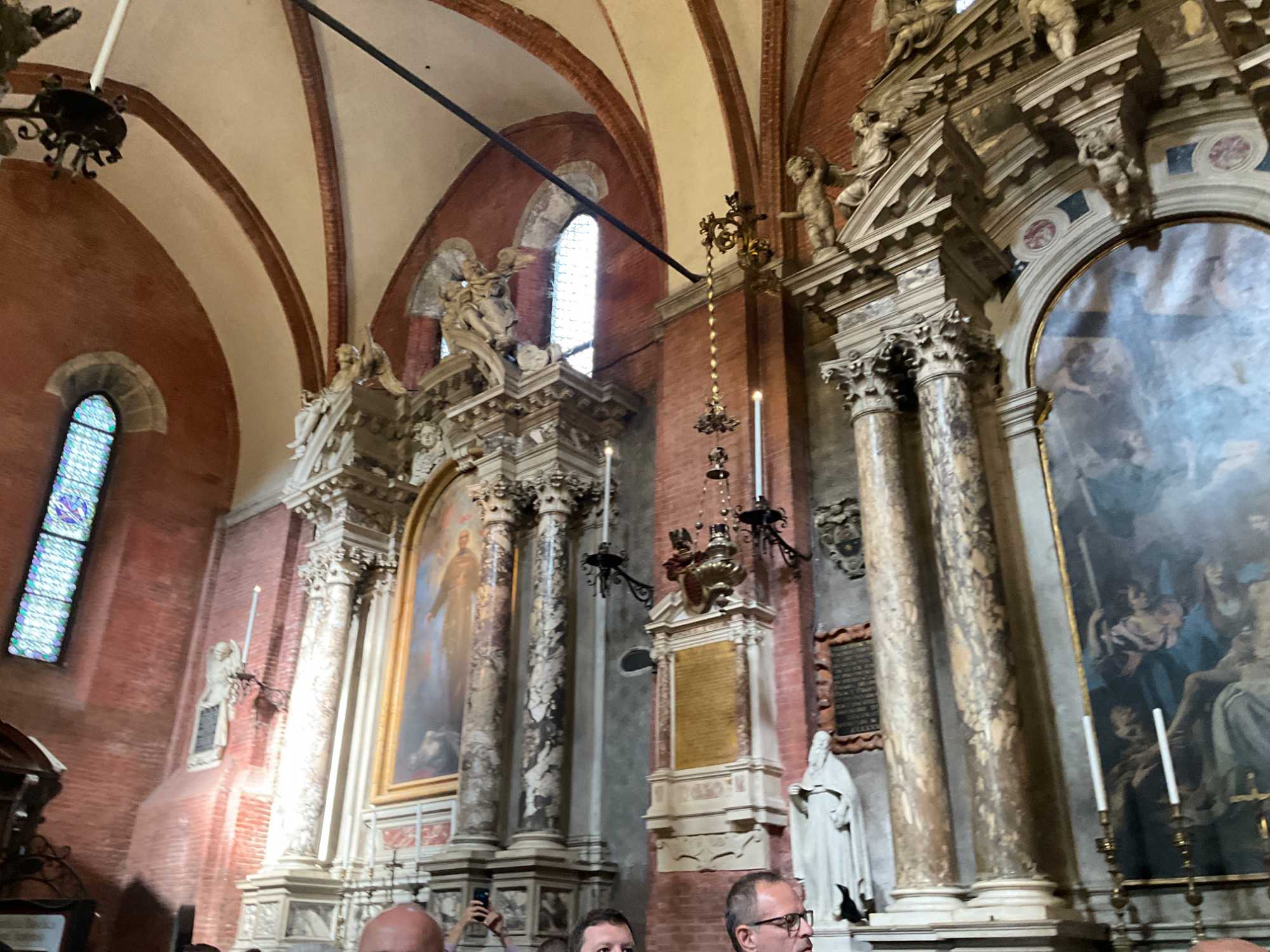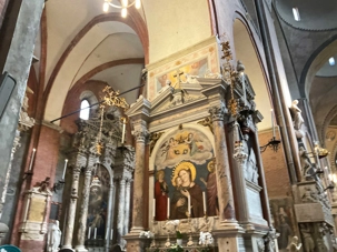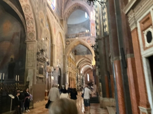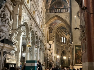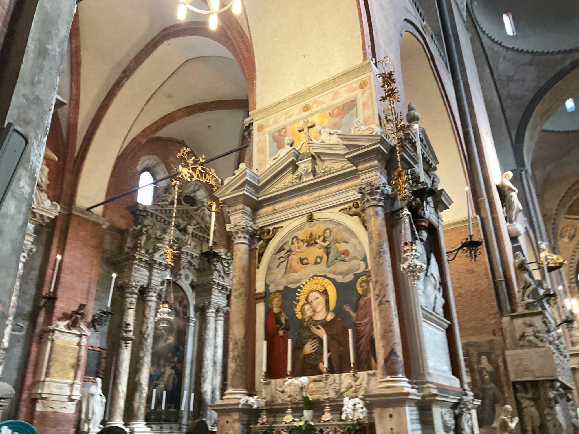 Comment passé à Padoue sans se rendre visiter… la basilique de Saint- Antoine de Padoue! Mais qui était-il cet Antoine? On le disait frère franciscain portugais du XIIIe siècle et docteur de l'Église. En y jetant un œil, on apprend que la basilique figure comme deuxième plus grande église de la ville et la plus visitée...mais n’ose pas portée le titre de cathédrale, qui revient au Dôme de Padoue. La statue de Saint-Antoine au-dessus du portail est … une copie. Le corps de Saint-Antoine fut déposé en 1231, dans la petite église « Sainte Marie Mère de Dieu », incorporée à la basilique en chapelle de la Vierge Noire. Un an après la mort de Saint-Antoine de Padoue, en 1231, on commença sa construction et se continua jusqu'en 1310. Alors, lorsque nous ferons nos demandes pour objets perdus à l’avenir, on aura cette église en tête! Vous dire l’immensité et la richesse de cette basilique serait minimisé l’importance de cette basilique. Les tableaux, l’autel, les fresques, les statues, tout respire le recueillement. Notre église préféré du voyage. Ah oui, lors de notre passage (un dimanche), la basilique débordait de fidèles, des plus petits aux plus grands. Une autre différence avec les perrons d’églises plus souvent vides chez nous.