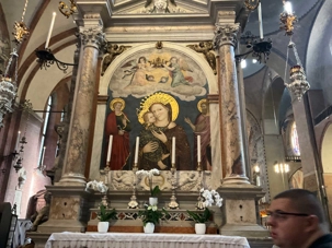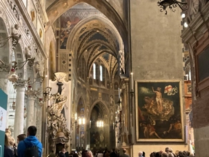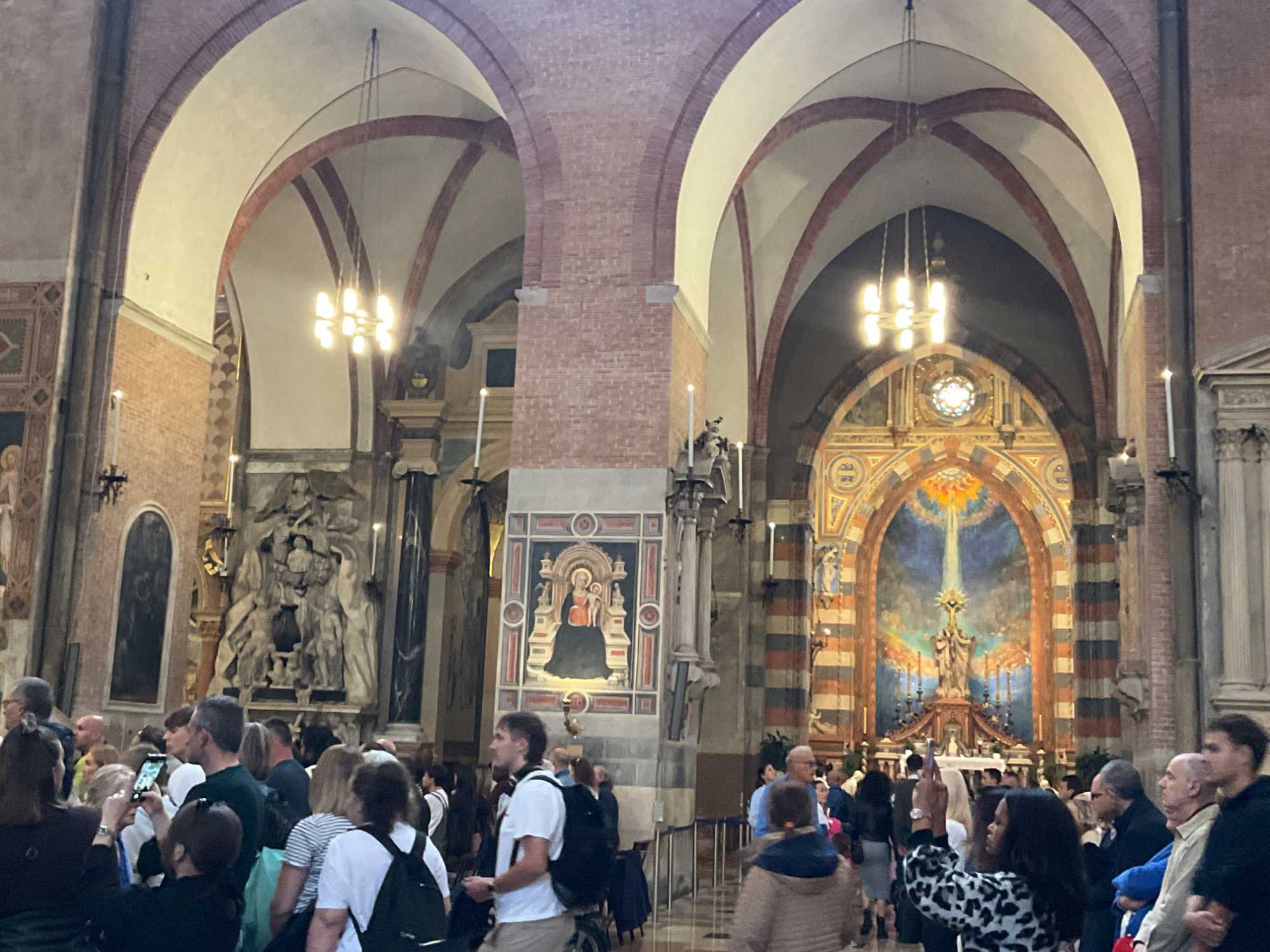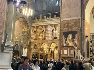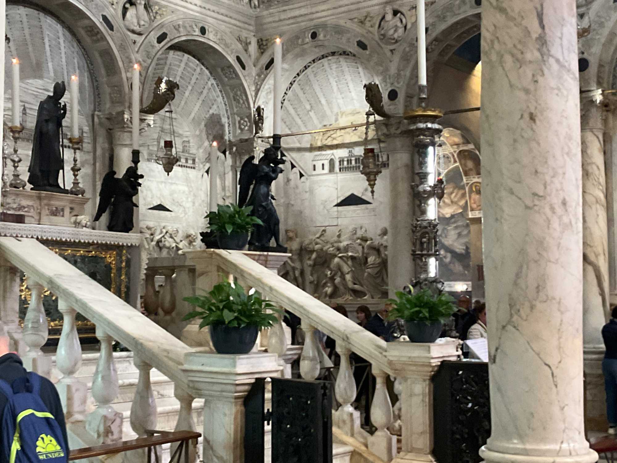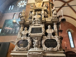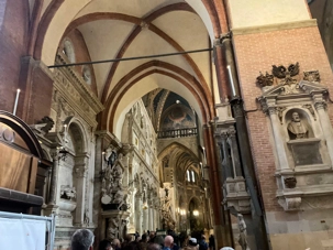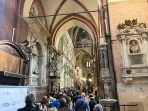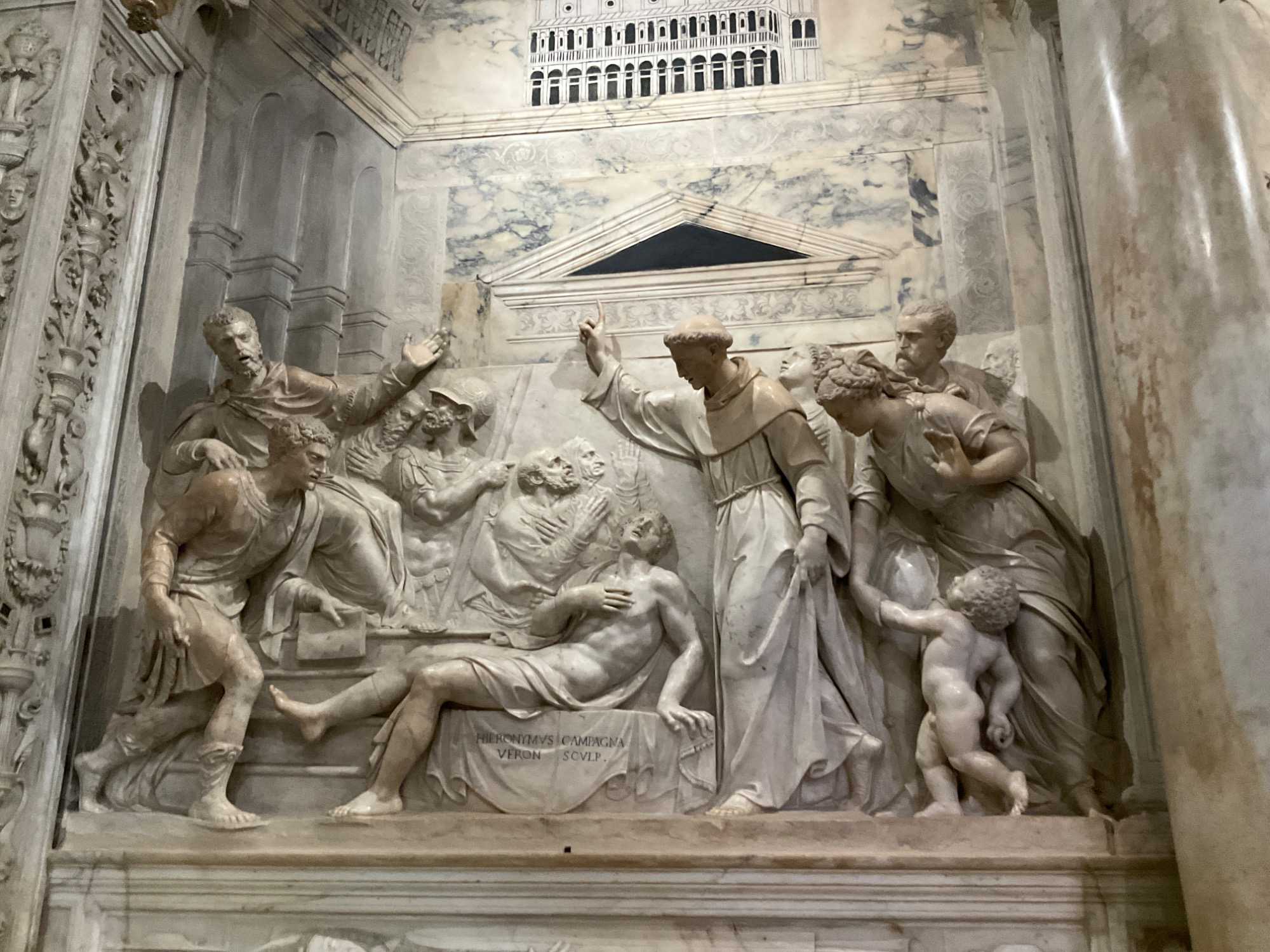 Comment passé à Padoue sans se rendre visiter… la basilique de Saint- Antoine de Padoue! Mais qui était-il cet Antoine? On le disait frère franciscain portugais du XIIIe siècle et docteur de l'Église. En y jetant un œil, on apprend que la basilique figure comme deuxième plus grande église de la ville et la plus visitée...mais n’ose pas portée le titre de cathédrale, qui revient au Dôme de Padoue. La statue de Saint-Antoine au-dessus du portail est … une copie. Le corps de Saint-Antoine fut déposé en 1231, dans la petite église « Sainte Marie Mère de Dieu », incorporée à la basilique en chapelle de la Vierge Noire. Un an après la mort de Saint-Antoine de Padoue, en 1231, on commença sa construction et se continua jusqu'en 1310. Alors, lorsque nous ferons nos demandes pour objets perdus à l’avenir, on aura cette église en tête! Vous dire l’immensité et la richesse de cette basilique serait minimisé l’importance de cette basilique. Les tableaux, l’autel, les fresques, les statues, tout respire le recueillement. Notre église préféré du voyage. Ah oui, lors de notre passage (un dimanche), la basilique débordait de fidèles, des plus petits aux plus grands. Une autre différence avec les perrons d’églises plus souvent vides chez nous.