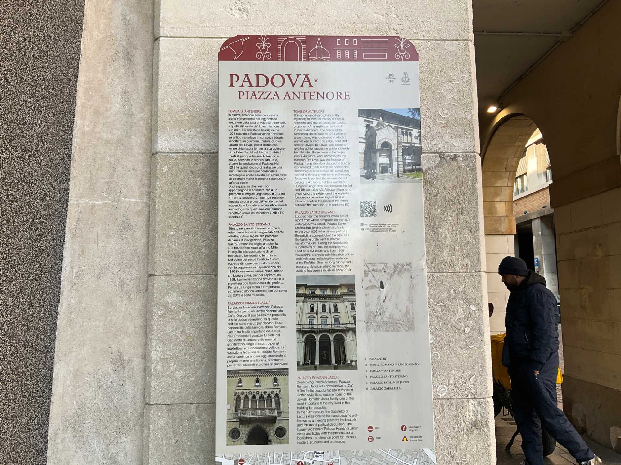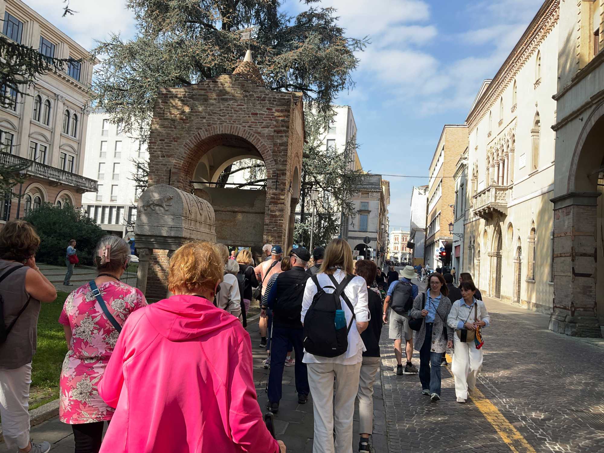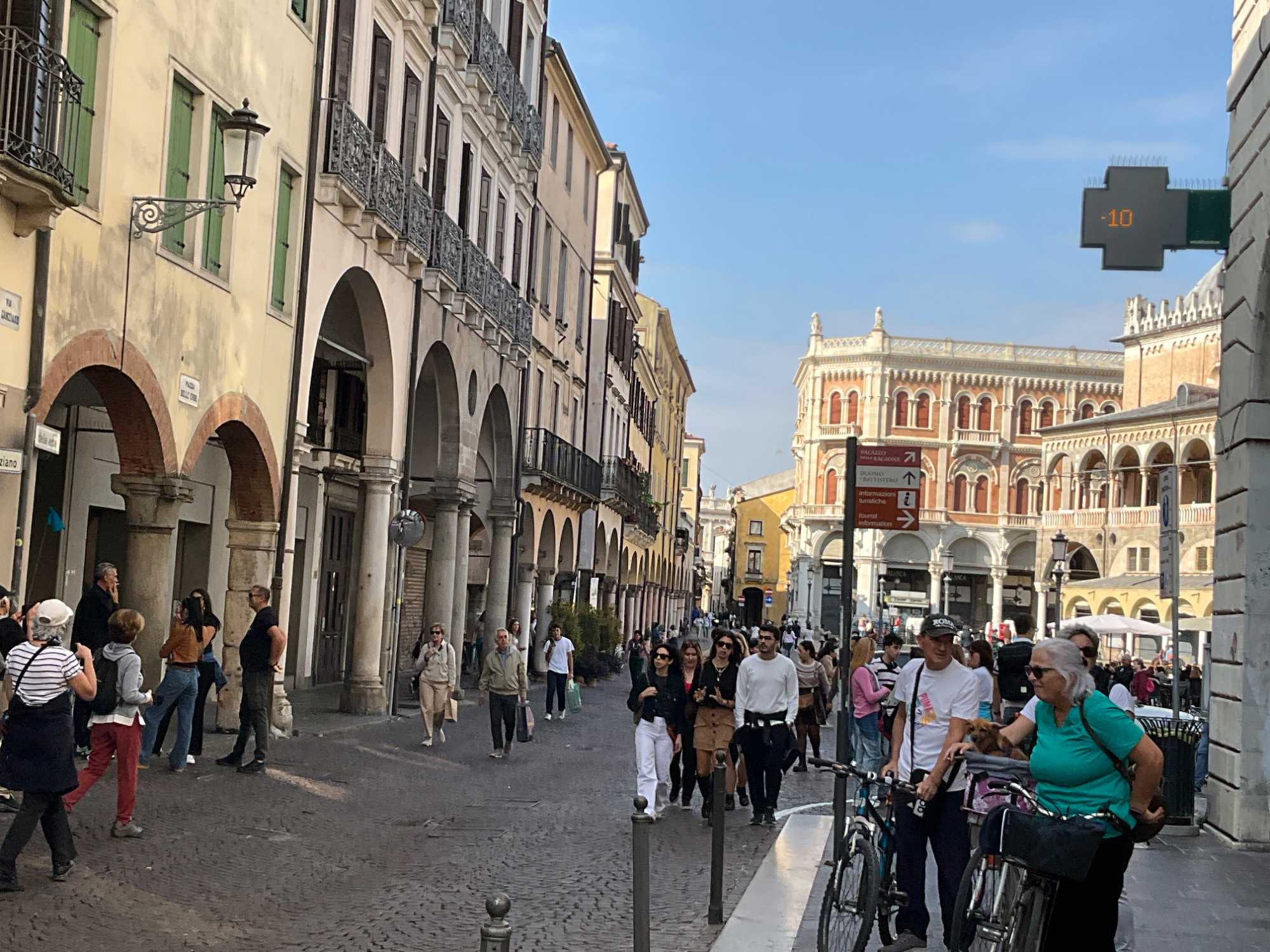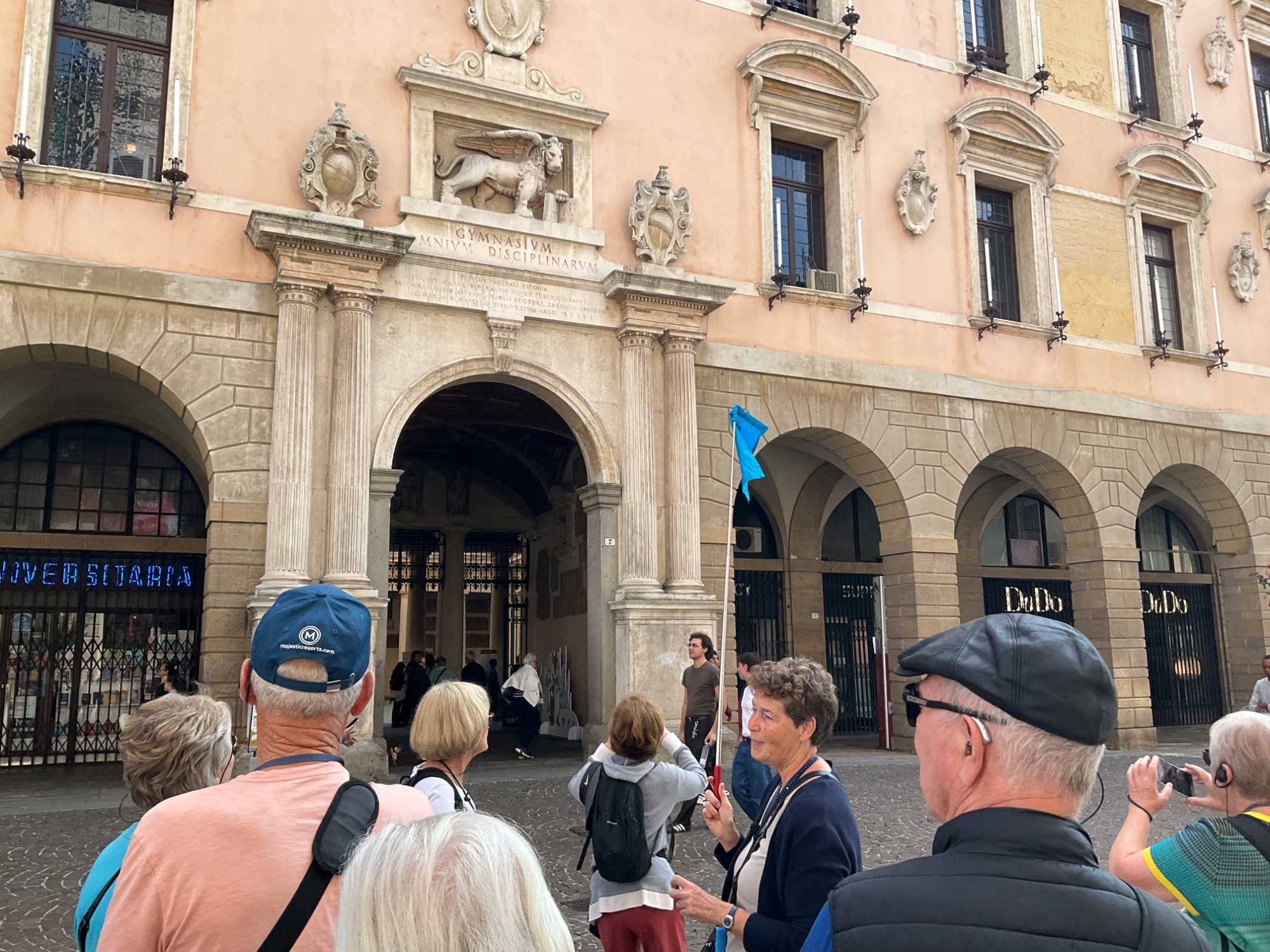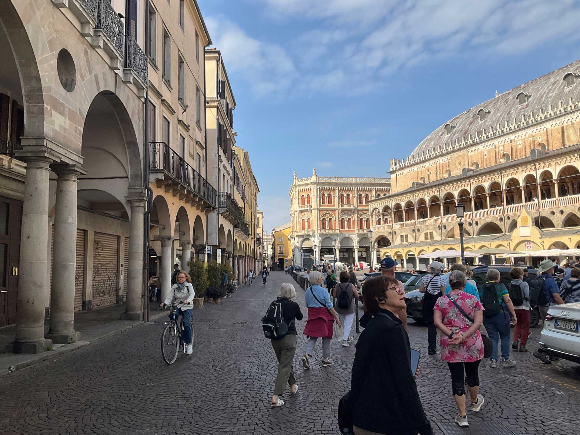 Arrivés au centre-ville notre rencontrons notre guide locale Claudia. Cette dernière nous mets tout de suite au parfum de sa ville. Nichée au cœur de la Vénétie, en Italie, Padoue est une ville riche en histoire et en patrimoine culturel. Fondée dans l’Antiquité, les origines de Padoue remontent à l’ère préromaine, ce qui en fait l’une des plus anciennes villes d’Italie du Nord. La légende veut que Padoue ait été fondée vers 1183 avant J.-C. par Antenor, un héros de la guerre de Troie qui s’était réfugié dans la région. Quant à Saint-Antoine de Padoue (1195-1231), à qui cette ville doit son nom, il était plutôt originaire de … Lisbonne au Portugal.