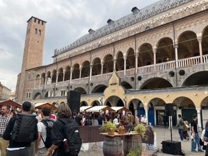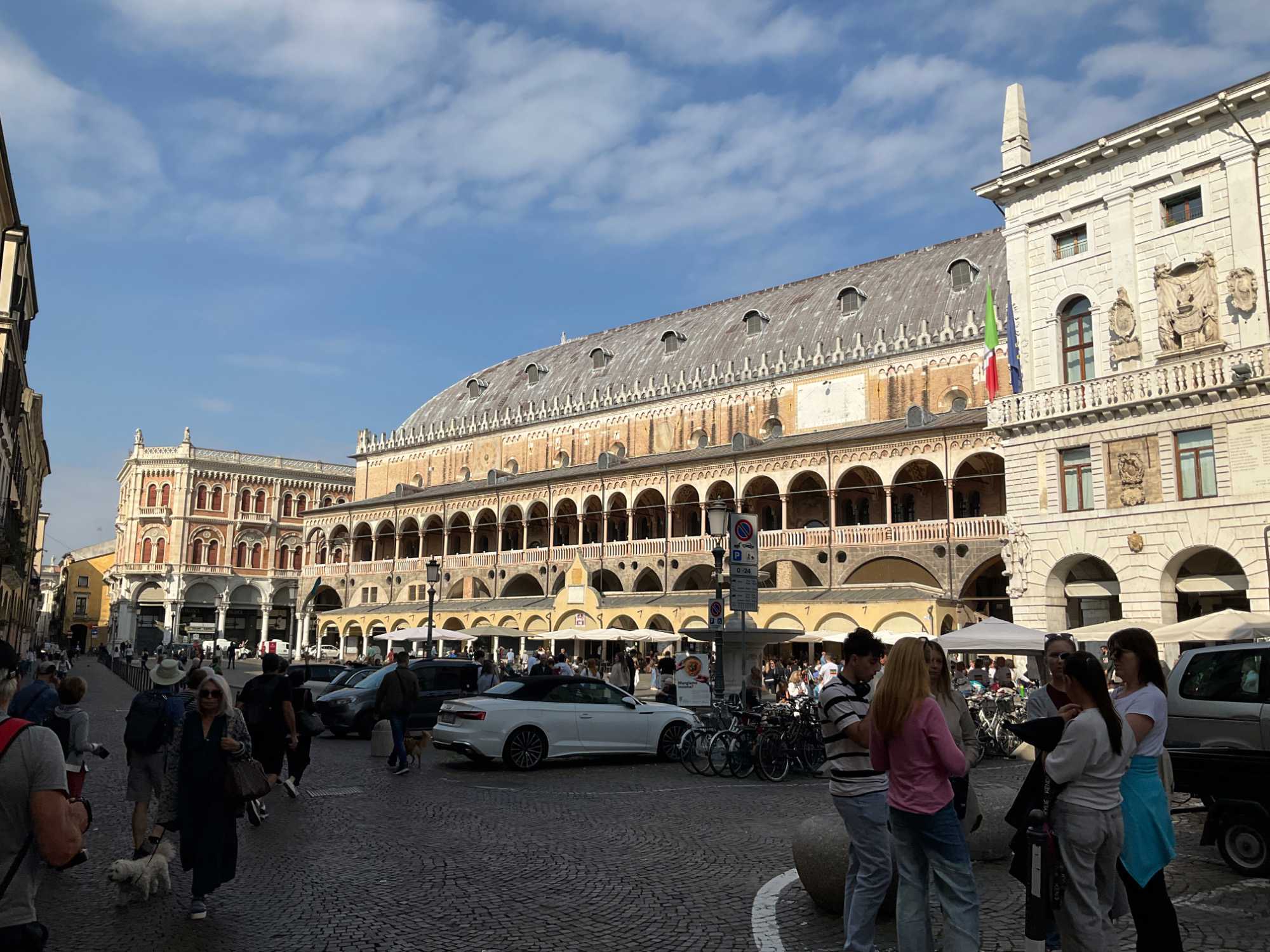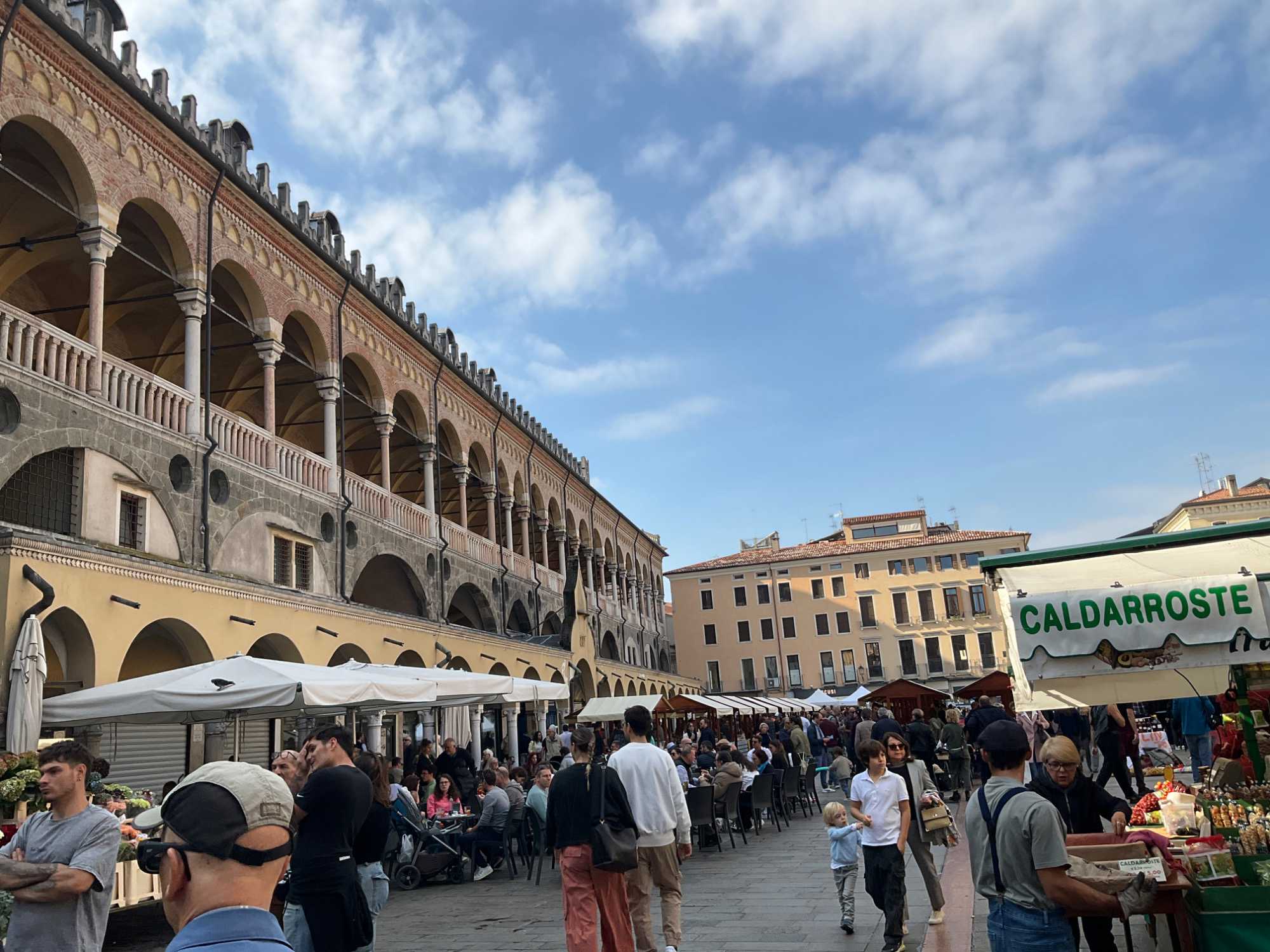 Au cours de notre journée, nous avons apprécié la Piazza delle Erbe ( et oui comme celle de Vérone) qui est l'une des nombreuses places du centre historique de Padoue et qui fut pendant des siècles, le centre commercial de la ville, tout près de l'imposant Palazzo della Ragione qui est à son tour imposant. Notre guide mentionne que l’architecture actuelle date des Xe et XIe siècles. Avec la construction du Palazzo della Ragione au début du XIIIe siècle, des zones ont été attribuées à des types de marchandises spécifiques, comme à Florence. Dans la salle par exemple, se trouvaient les vendeurs de tissus et de fourrures. Au pied des escaliers qui entouraient le bâtiment se trouvaient les auvents pour le fer (Scala del Feri, à l'est) et le vin (Scala del Vin, à l'ouest), ainsi que les vendeurs de céréales et de cuir. Ce « palais de la Raison » construit en 1218, est l'ancien siège de l'administration et des tribunaux de la ville. Il a été surélevé en 1306. Aujourd’hui, le palais sépare les deux grandes places aux Herbes et aux Fruits (piazza delle Erbe, piazza dei Frutti), où se rassemblent les commerçants de la région.