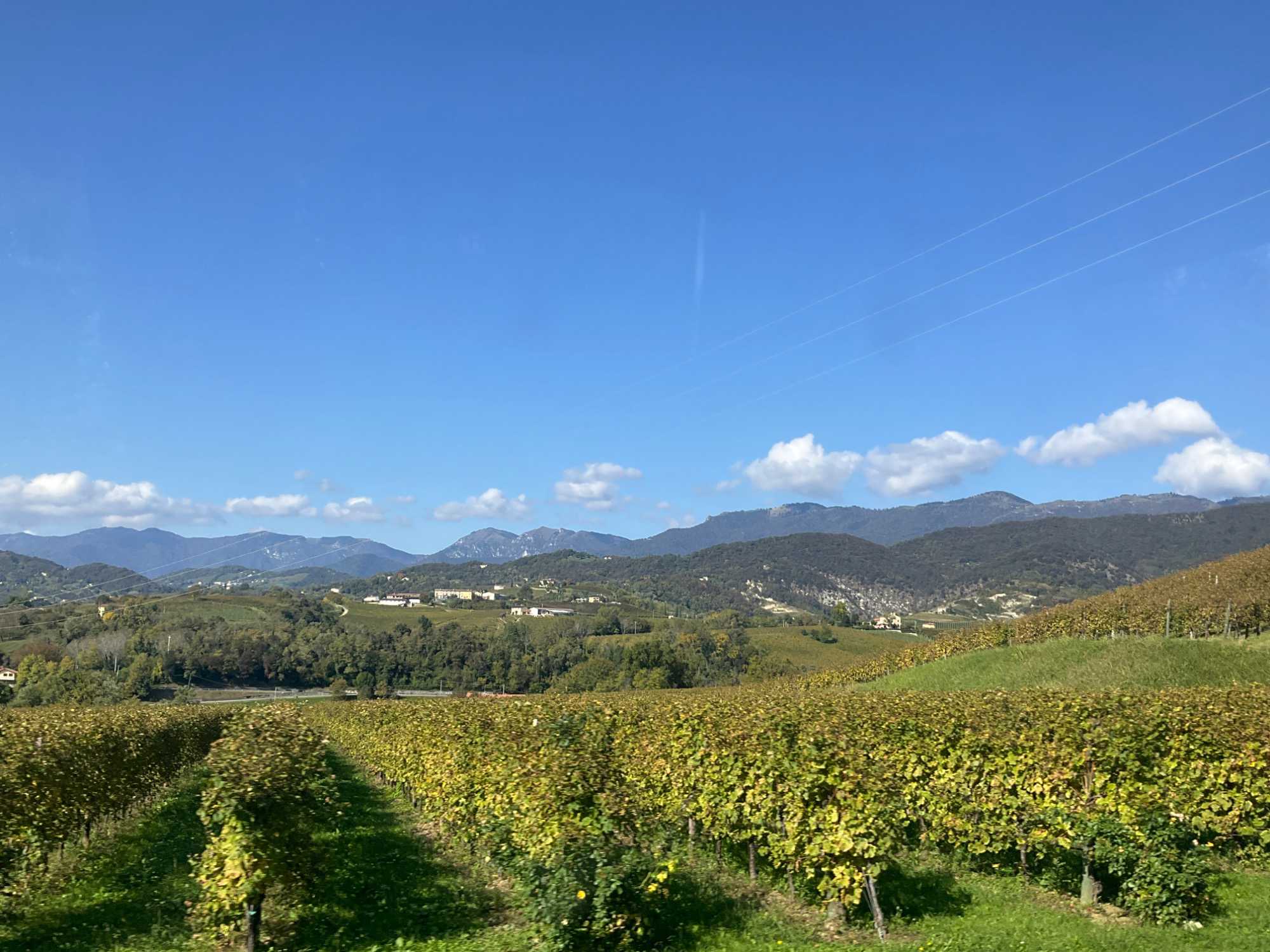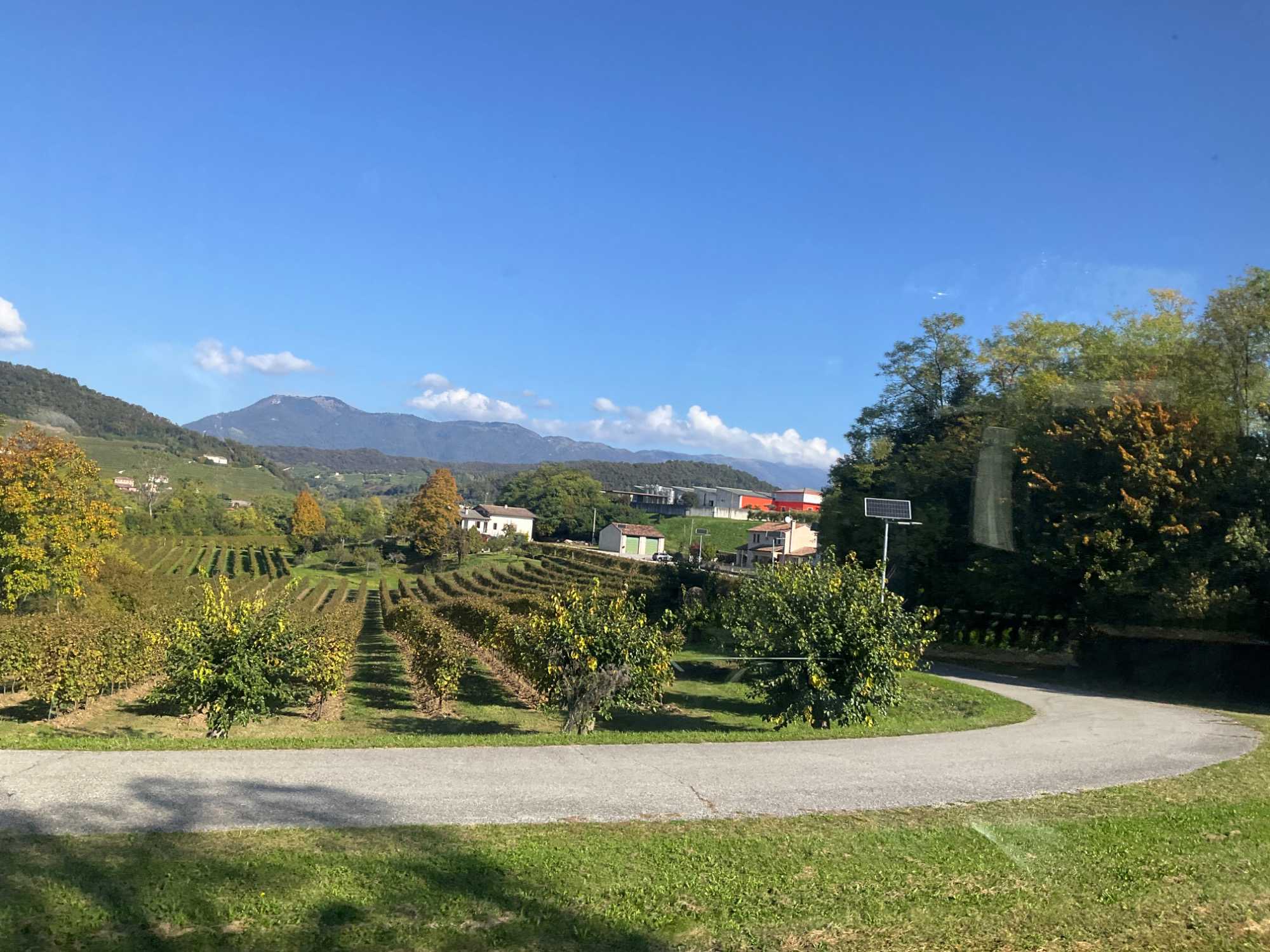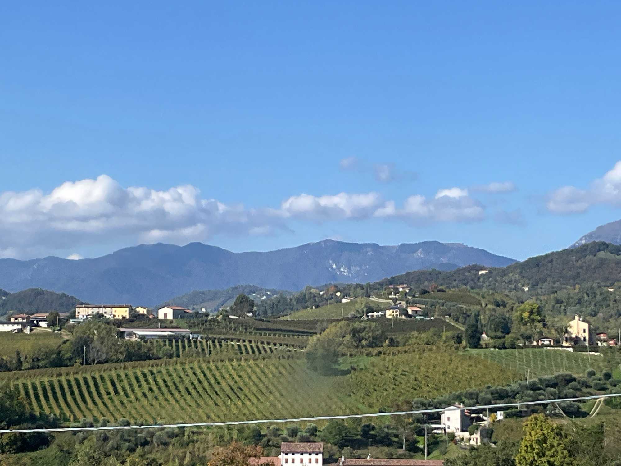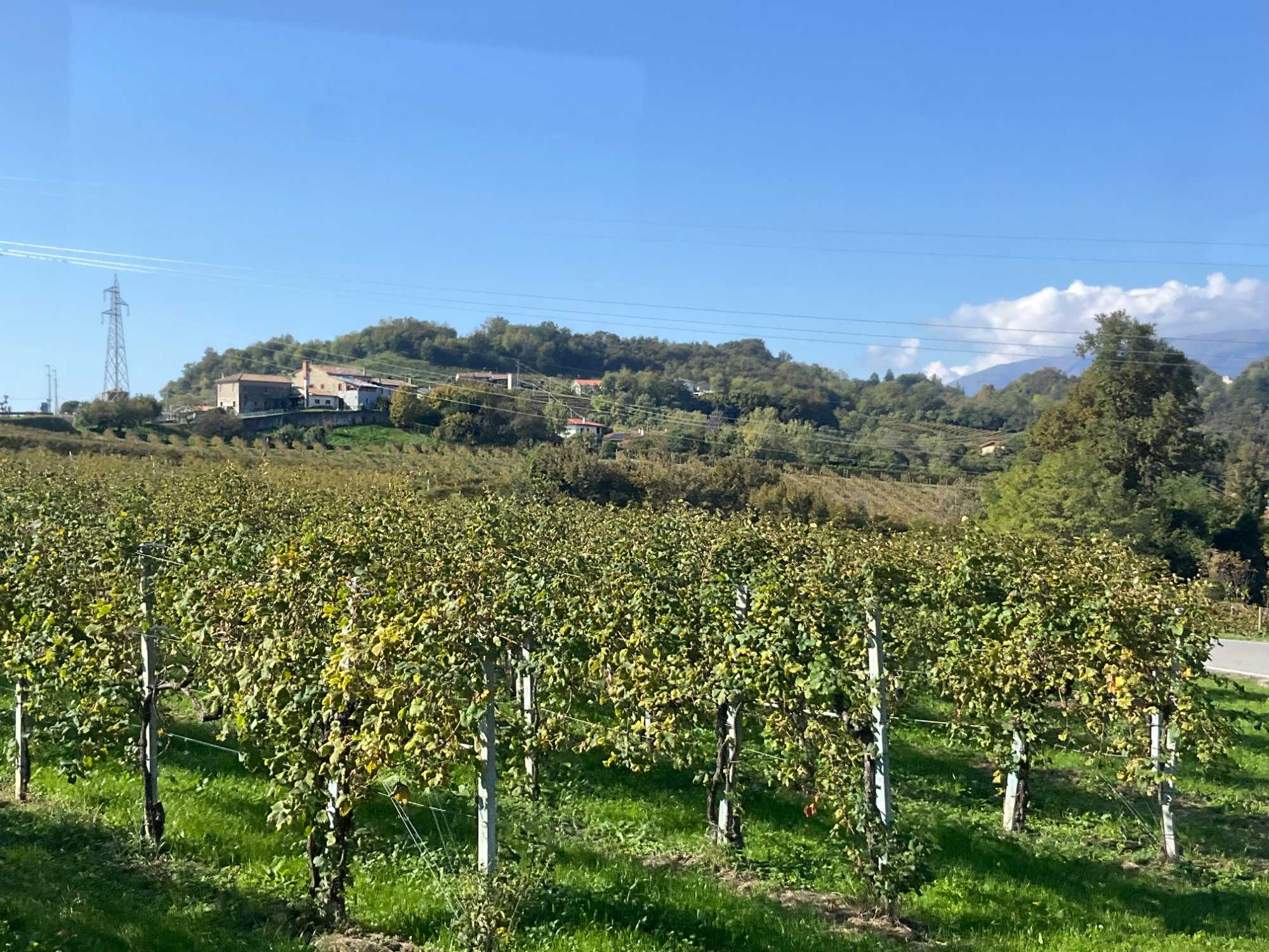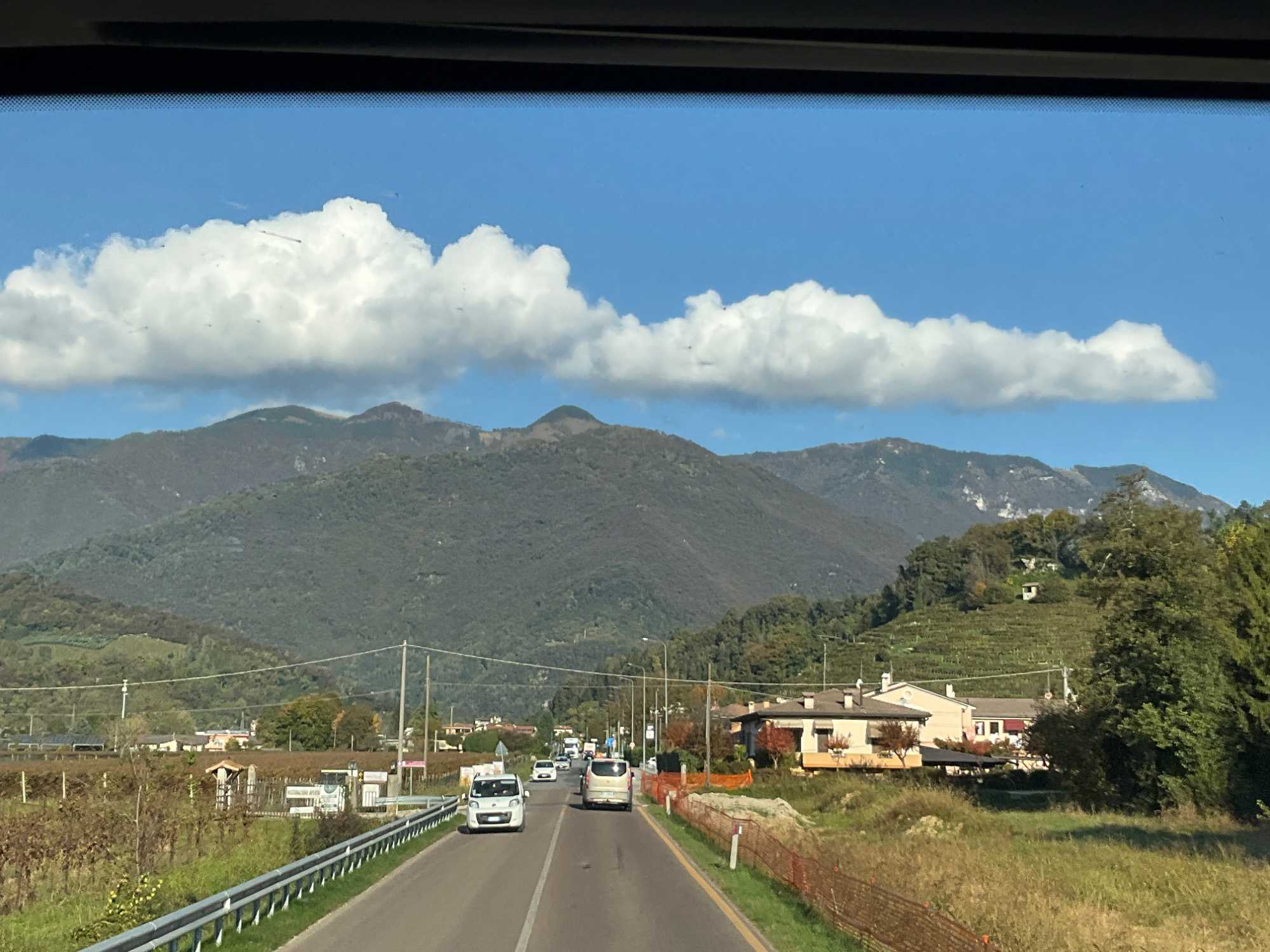 En passant par Spresiano, nous sommes dans les Pré Alpes mais déjà on voie apparaître les collines. C’est ici, entre la plaine et les Alpes, que le terrain favorise les vignes pour le sépage appelé Glera, maître suprême du Prosecco. D’ailleurs c’est également ici qu’on voie notre première affiche « Conigliano », l’un des deux villages entre lesquels se situent officiellement les Collines du Prosecco.