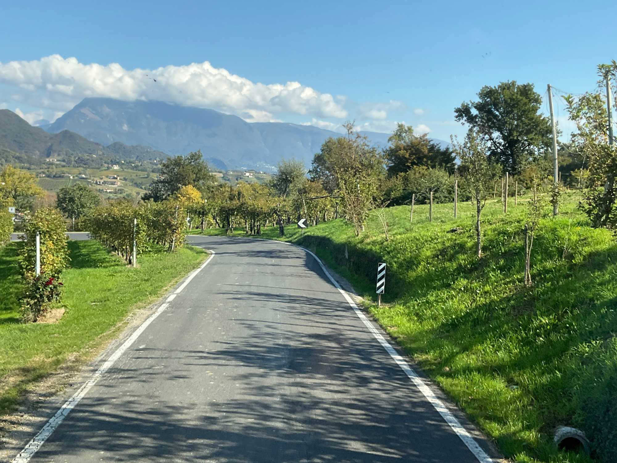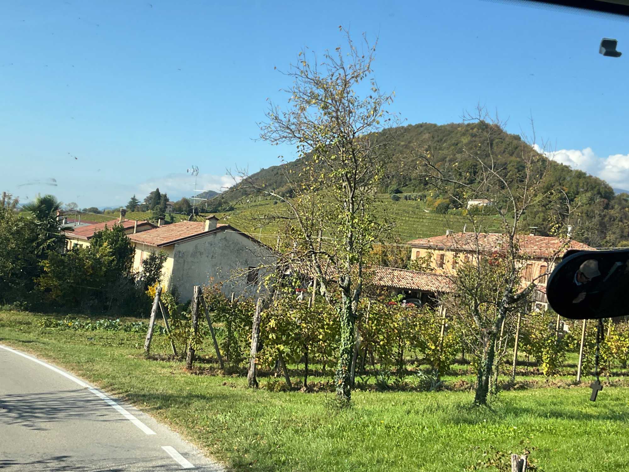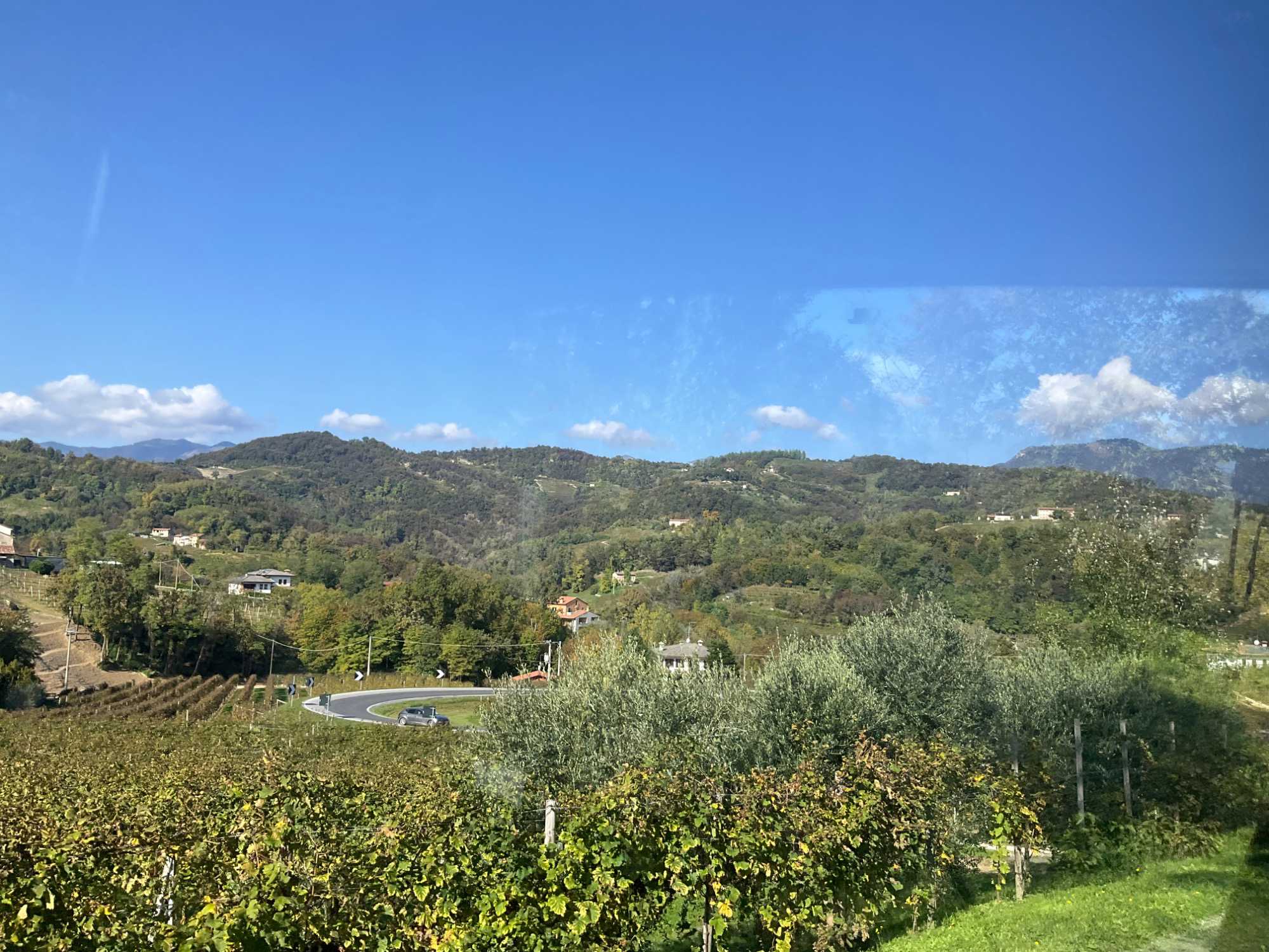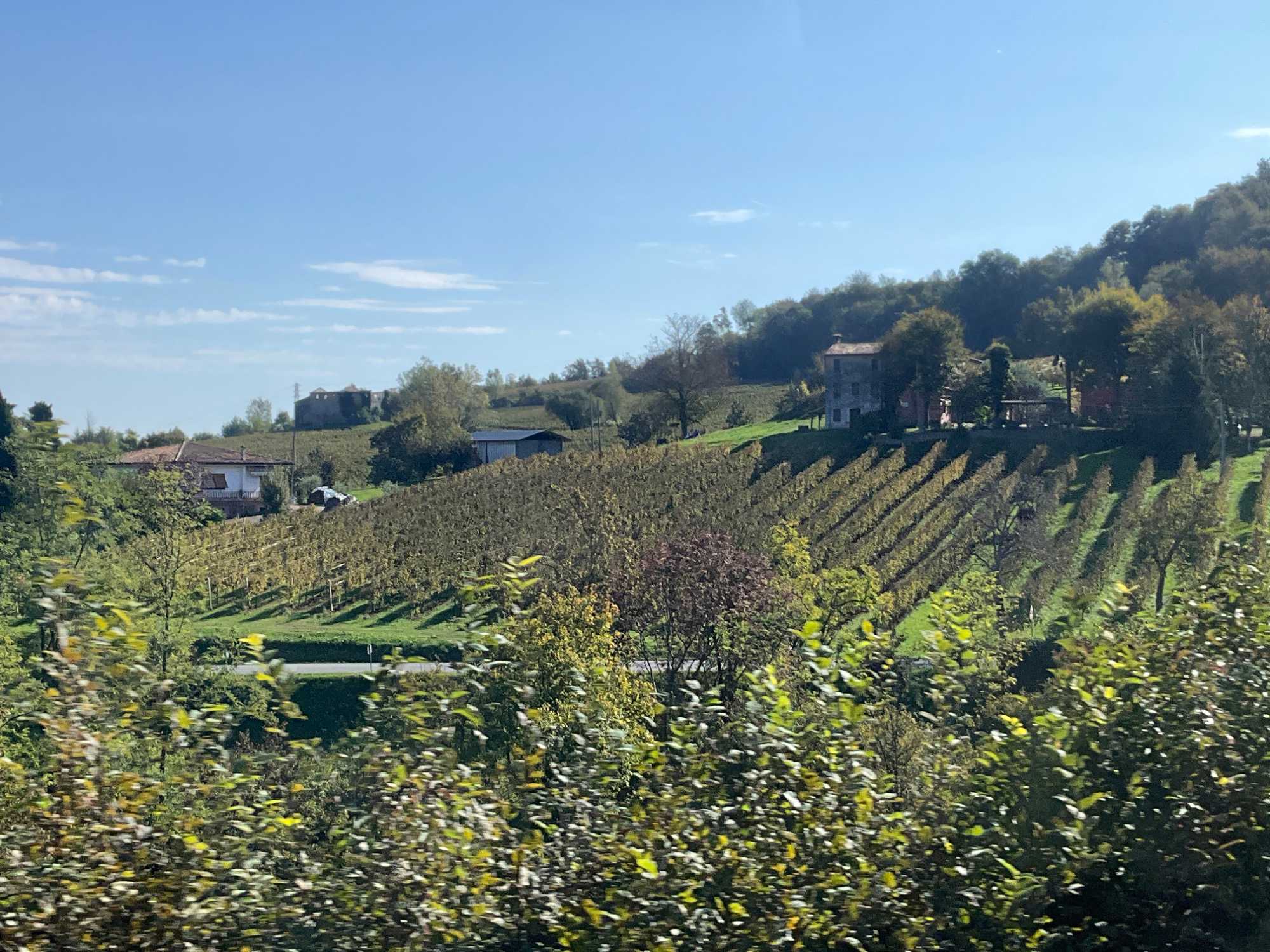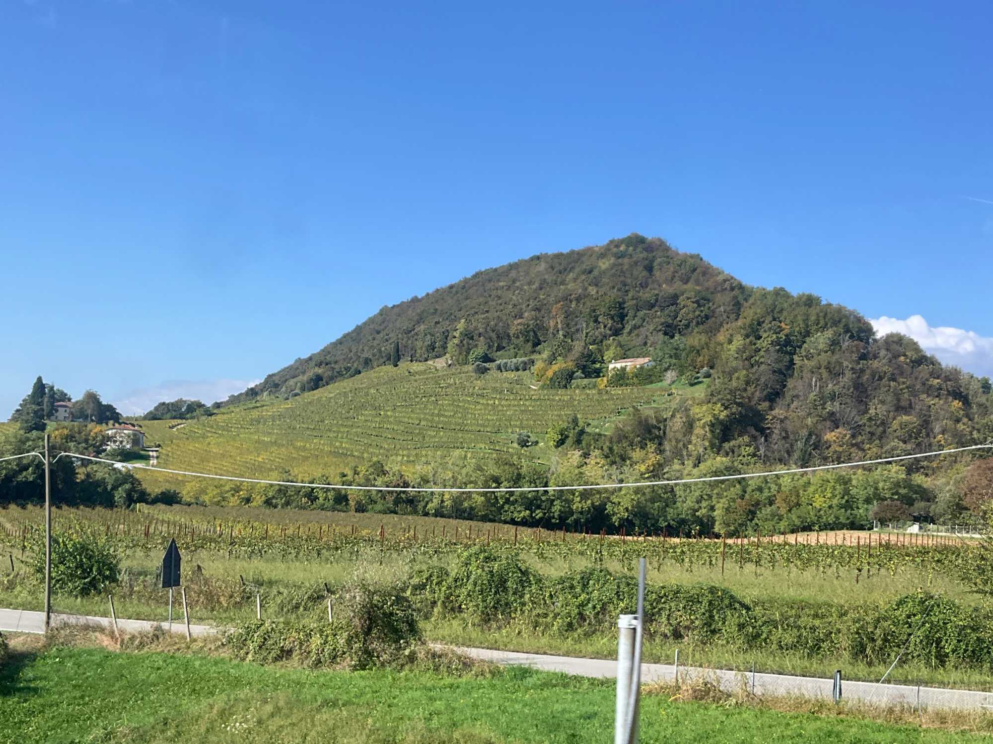 En passant par Spresiano, nous sommes dans les Pré Alpes mais déjà on voie apparaître les collines. C’est ici, entre la plaine et les Alpes, que le terrain favorise les vignes pour le sépage appelé Glera, maître suprême du Prosecco. D’ailleurs c’est également ici qu’on voie notre première affiche « Conigliano », l’un des deux villages entre lesquels se situent officiellement les Collines du Prosecco.