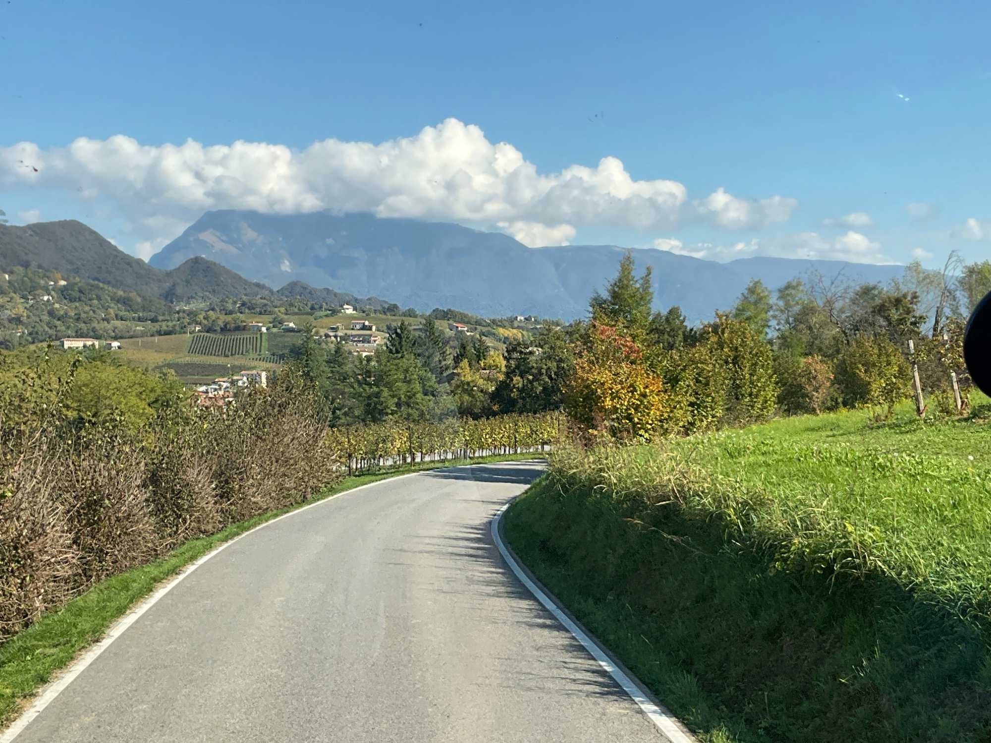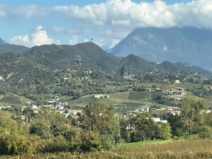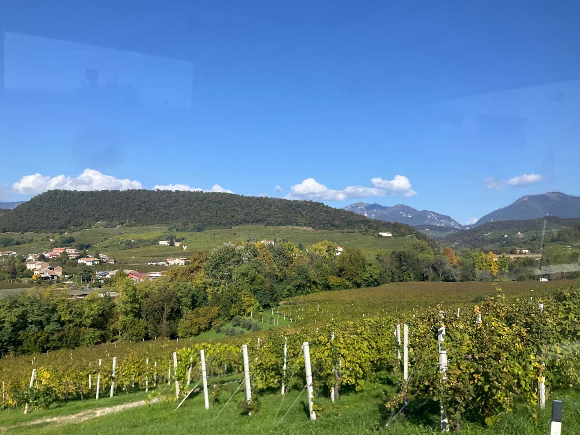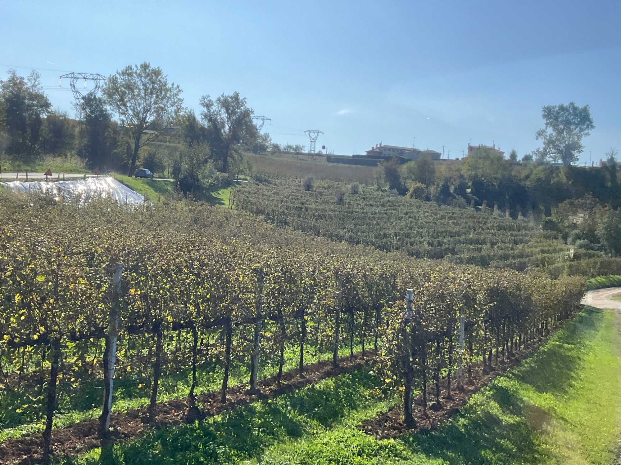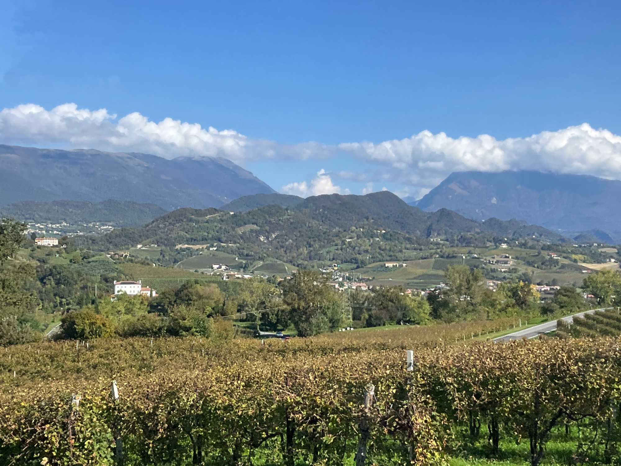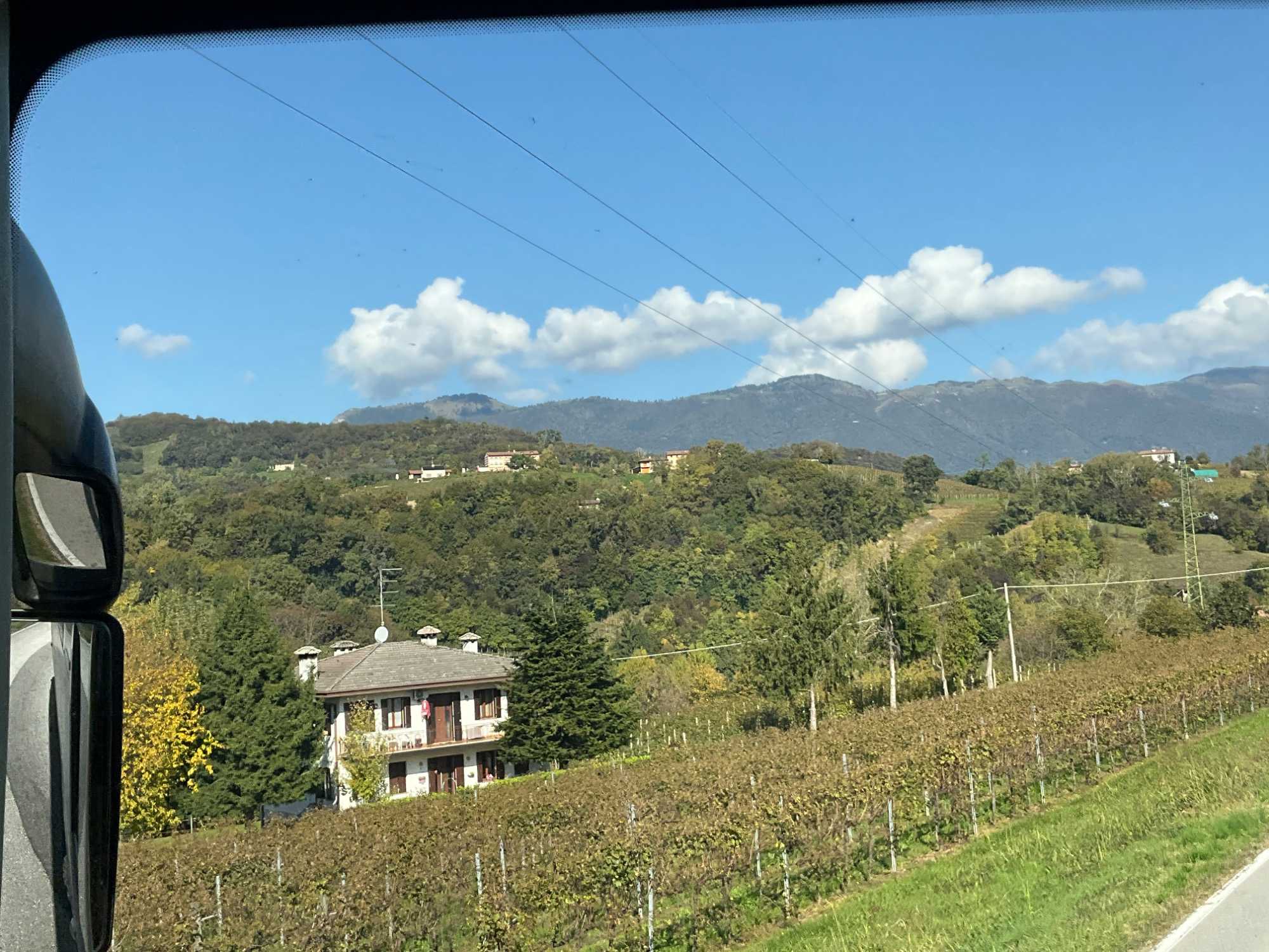 En passant par Spresiano, nous sommes dans les Pré Alpes mais déjà on voie apparaître les collines. C’est ici, entre la plaine et les Alpes, que le terrain favorise les vignes pour le sépage appelé Glera, maître suprême du Prosecco. D’ailleurs c’est également ici qu’on voie notre première affiche « Conigliano », l’un des deux villages entre lesquels se situent officiellement les Collines du Prosecco.
